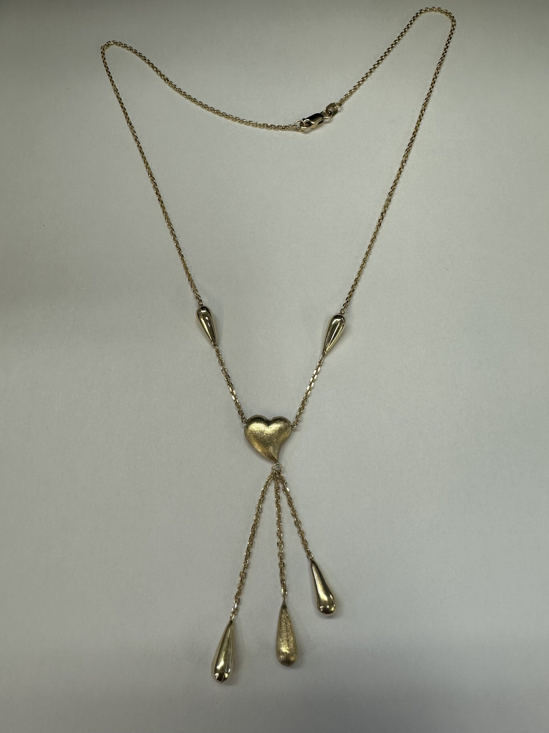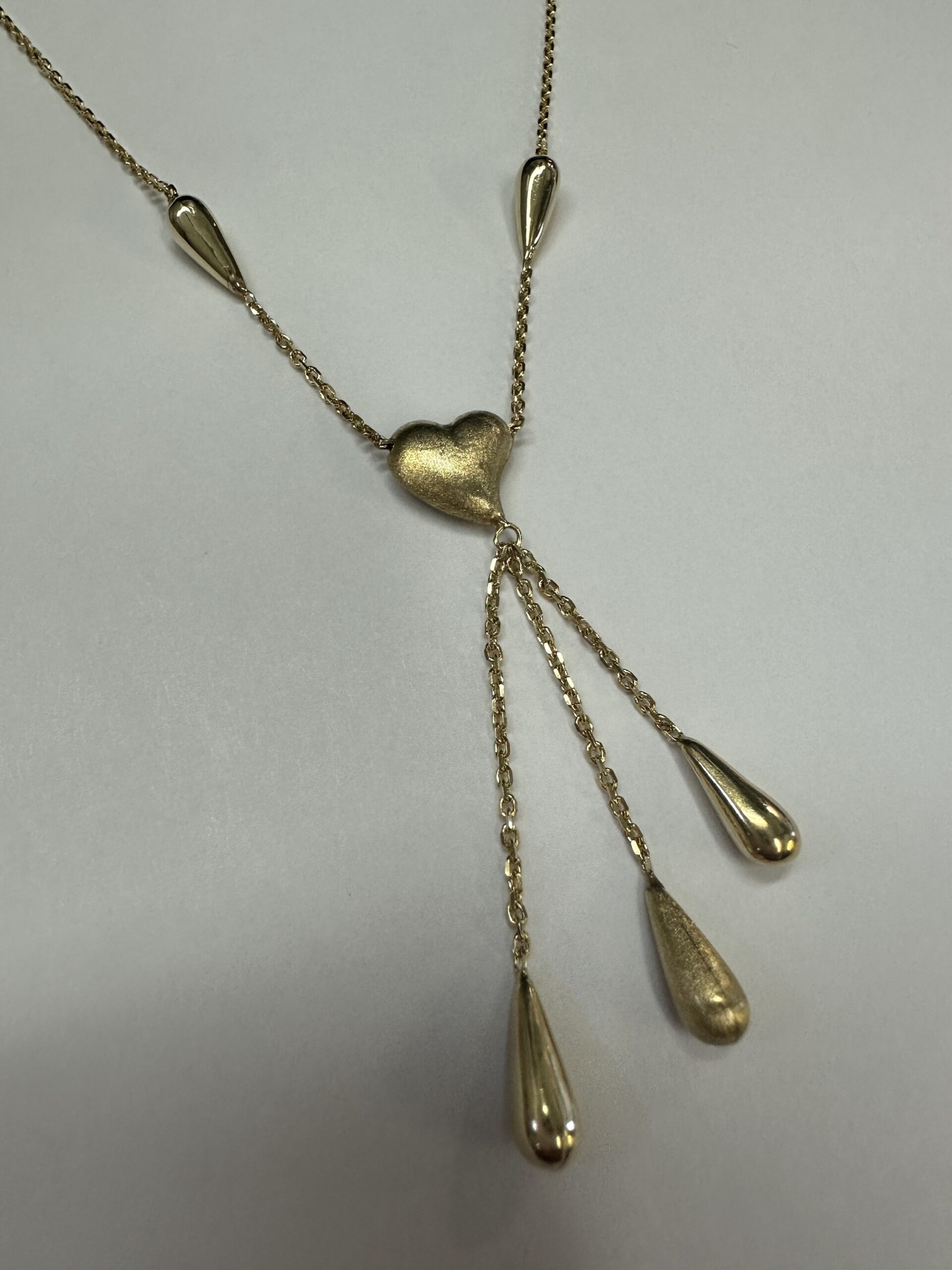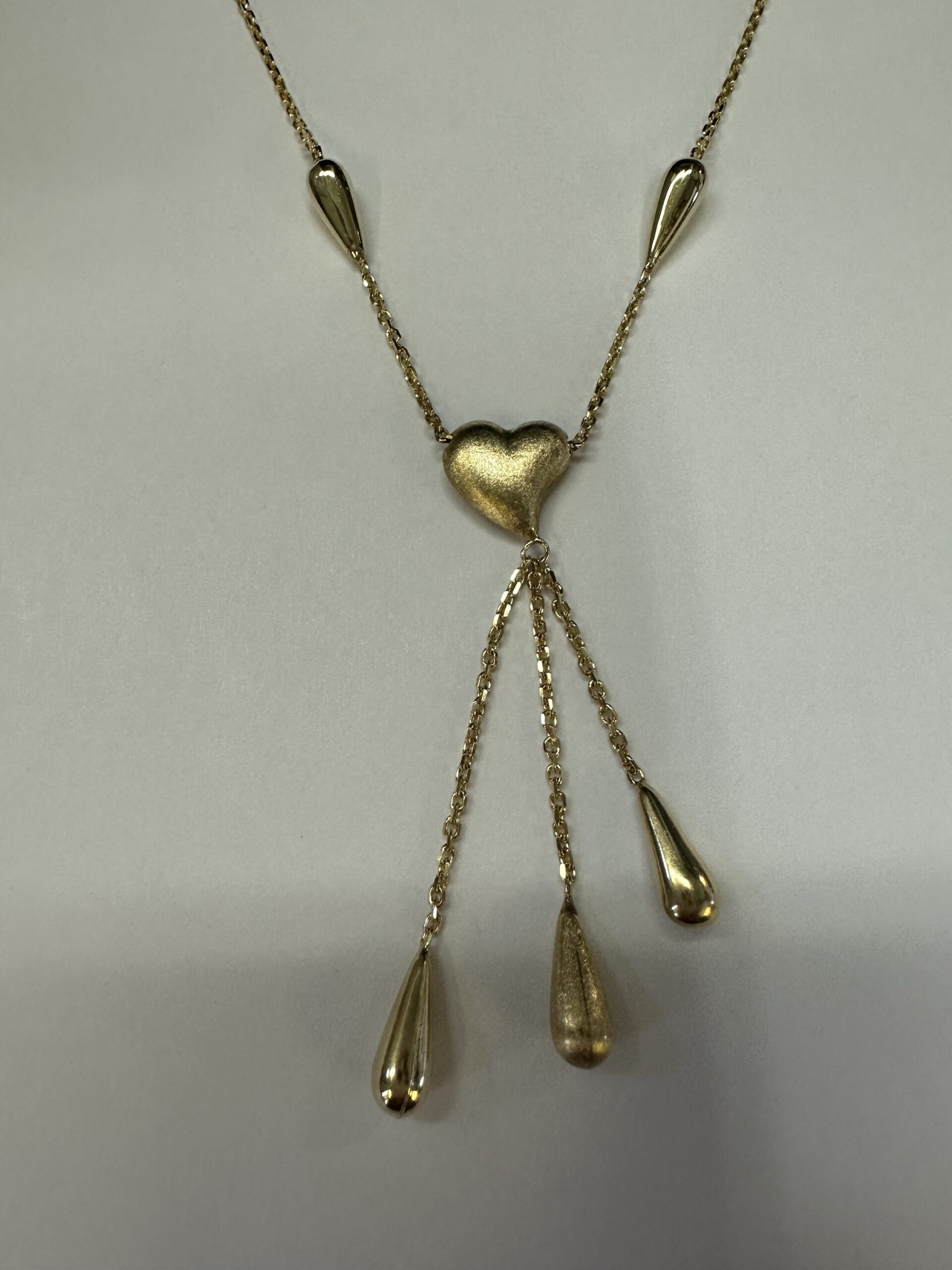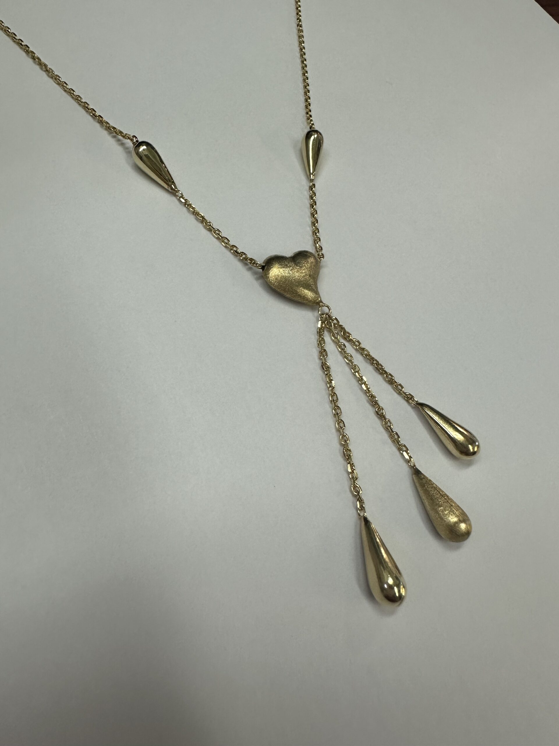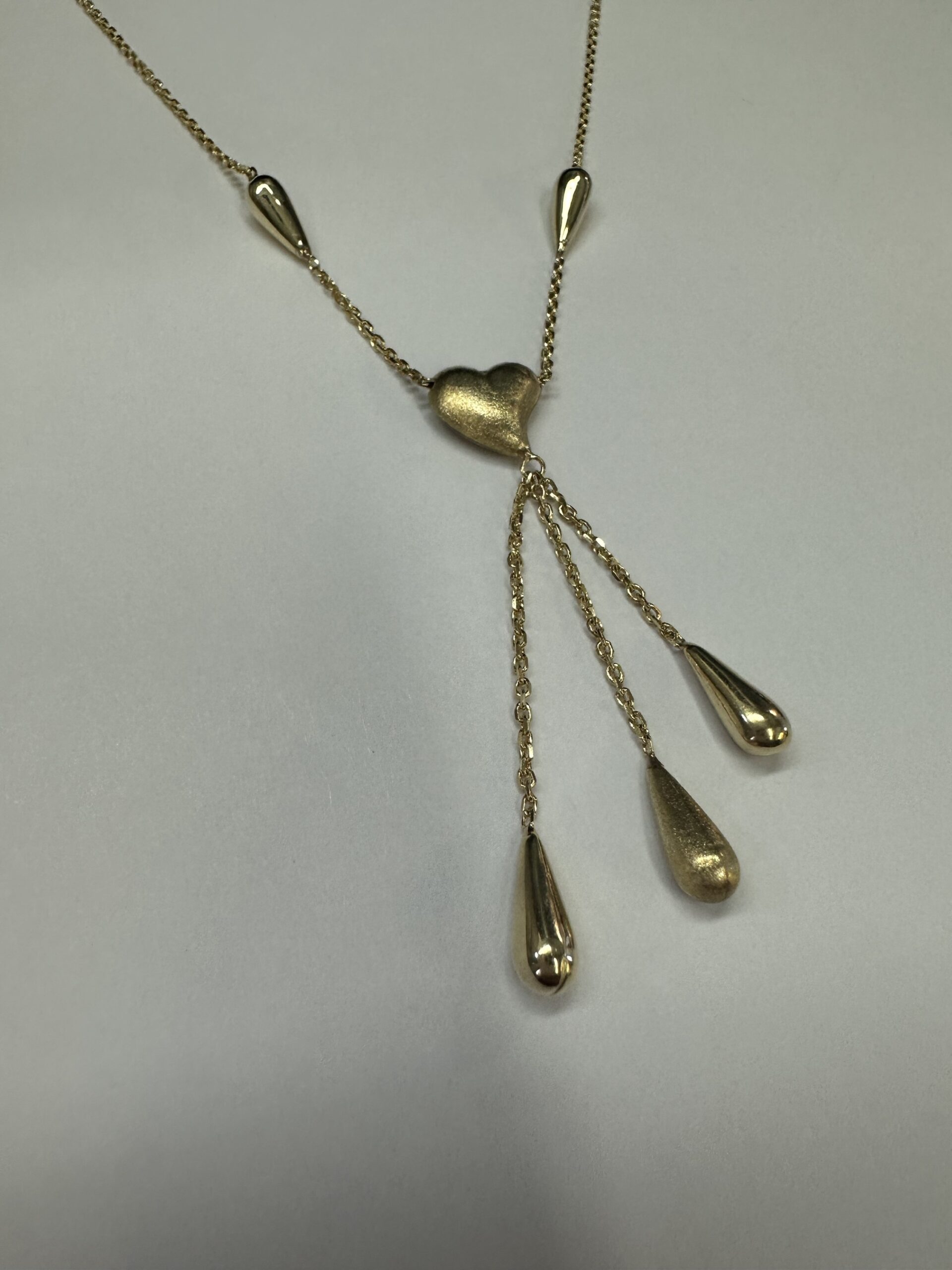 One-of-a-kind 10k yellow gold 17” long lariat pendant of a teardrop & heart motif. The longest dangle measures 2” in length, and this piece has an entire weight of 4.4 grams.