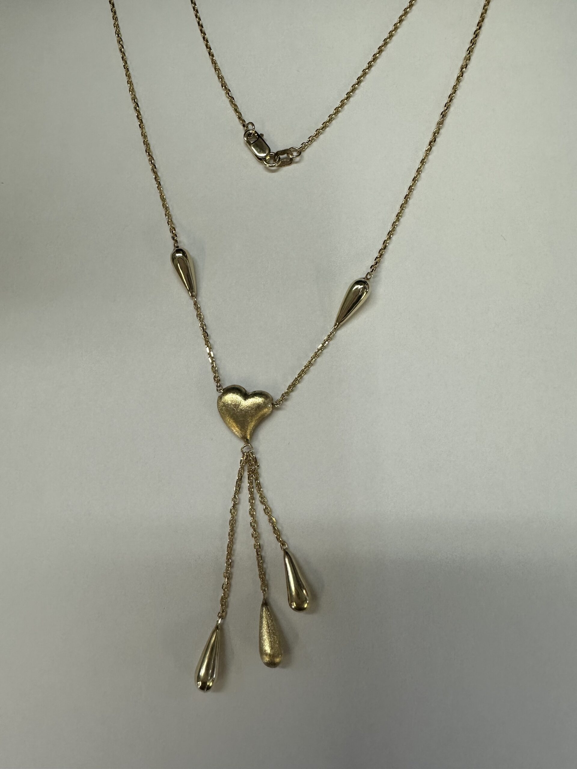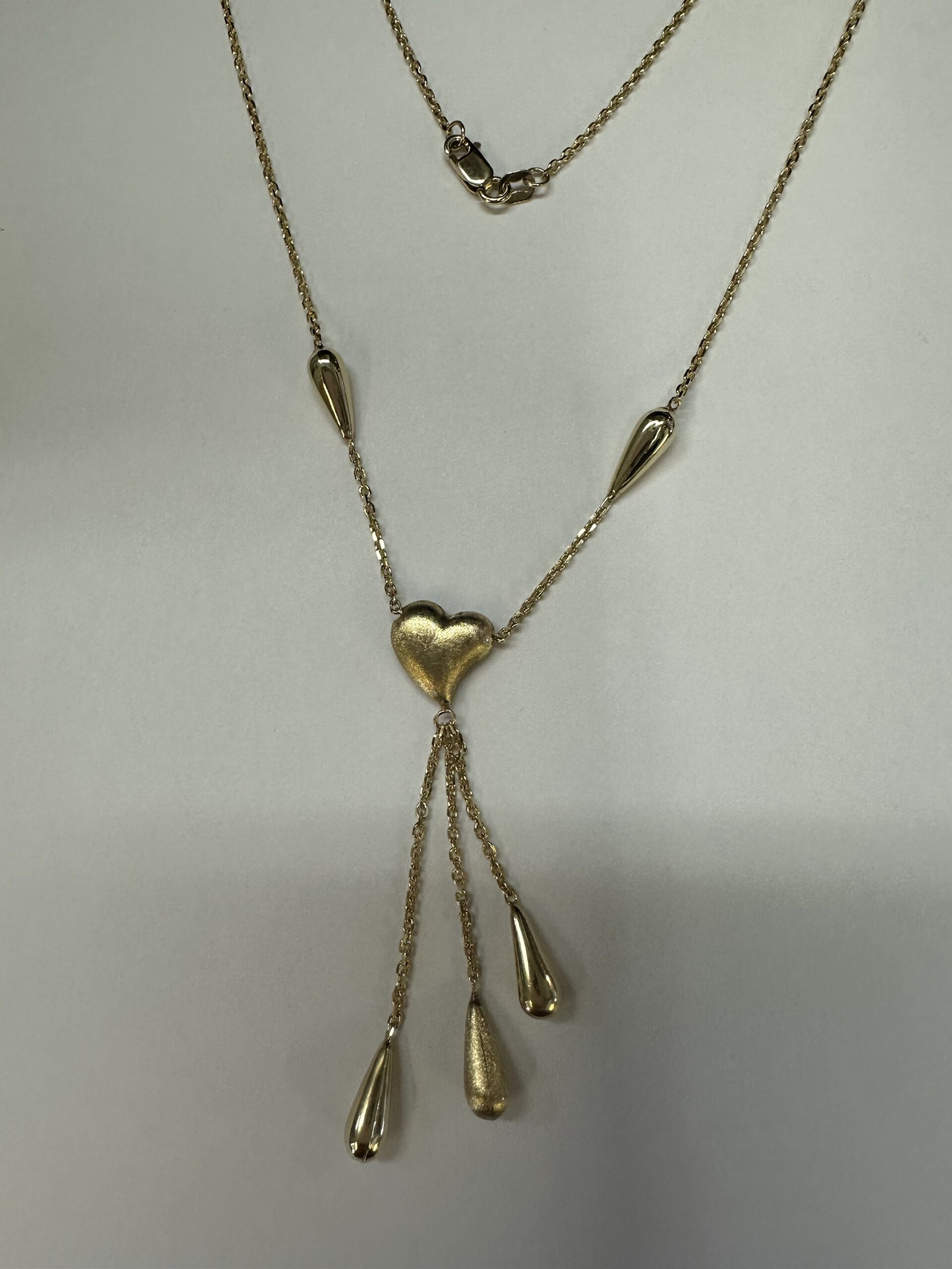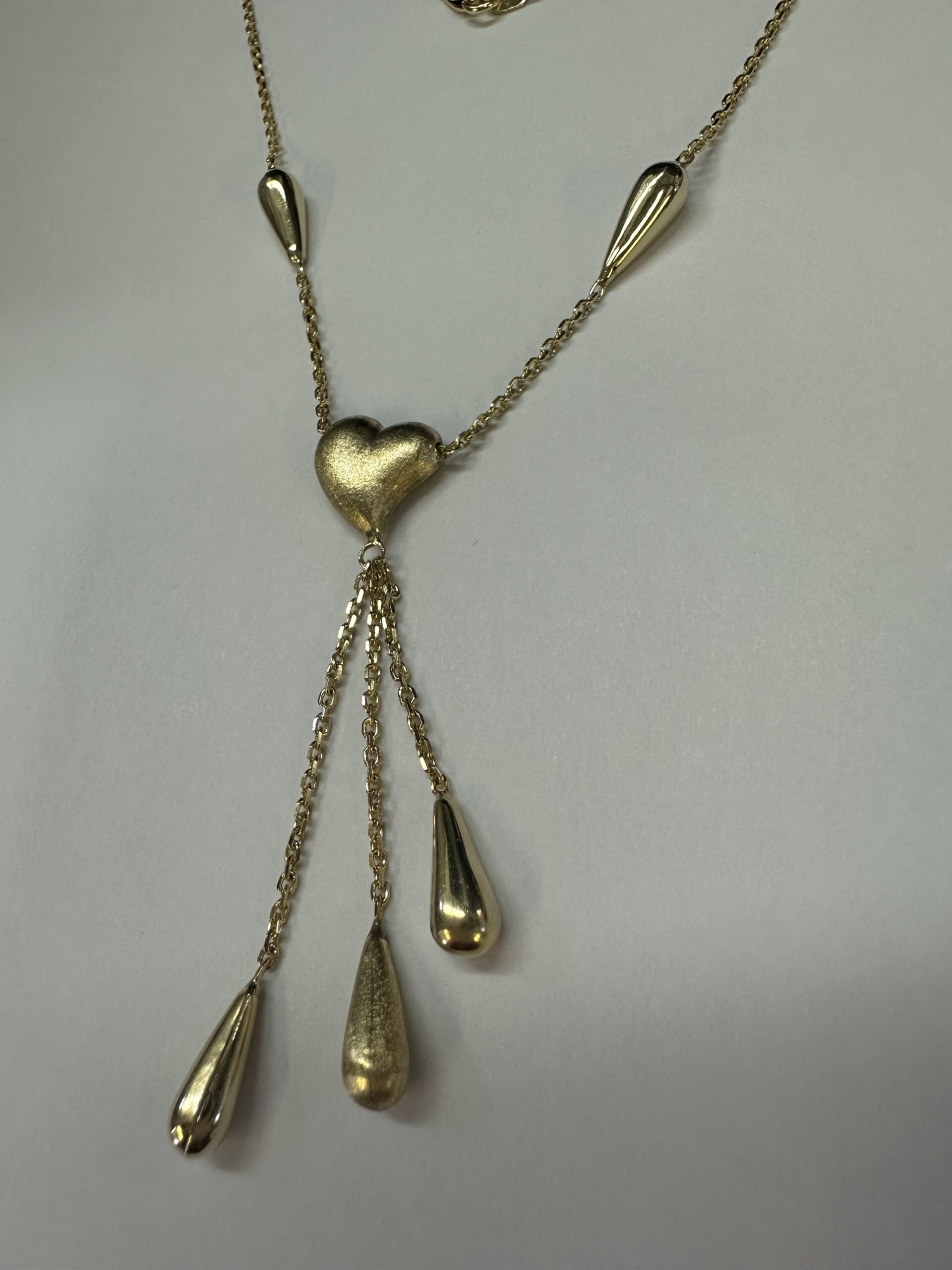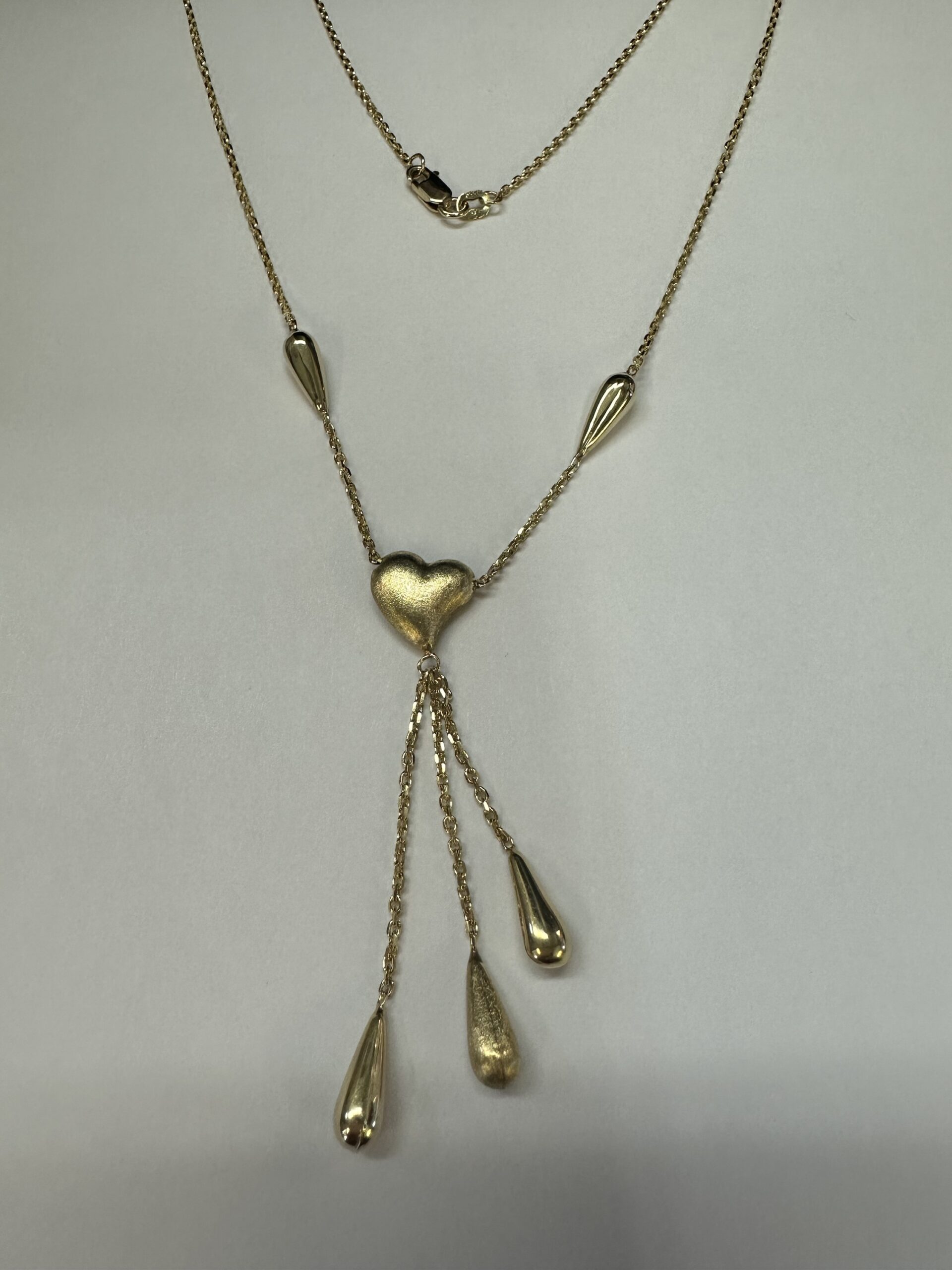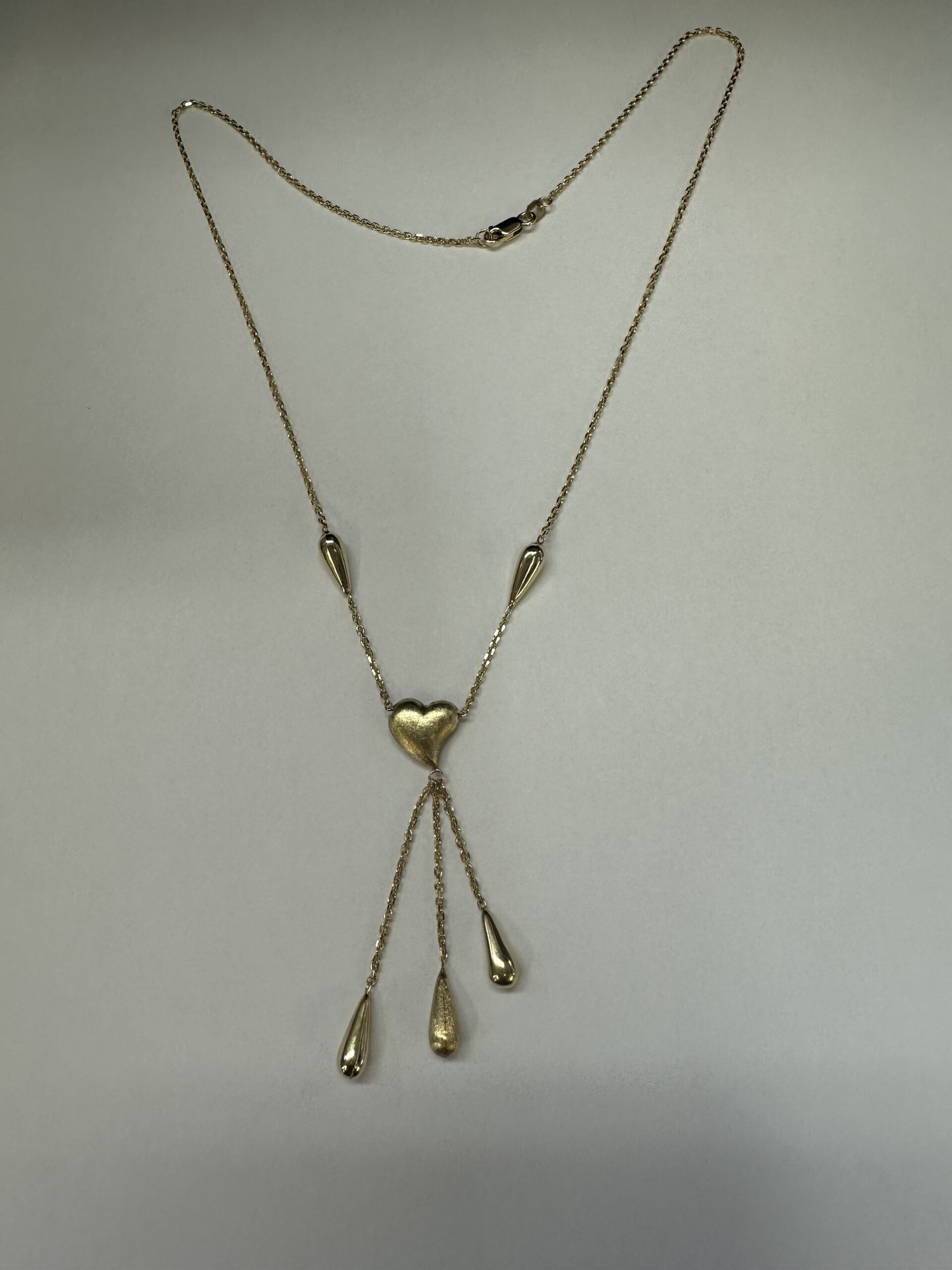 One-of-a-kind 10k yellow gold 17” long lariat pendant of a teardrop & heart motif. The longest dangle measures 2” in length, and this piece has an entire weight of 4.4 grams.