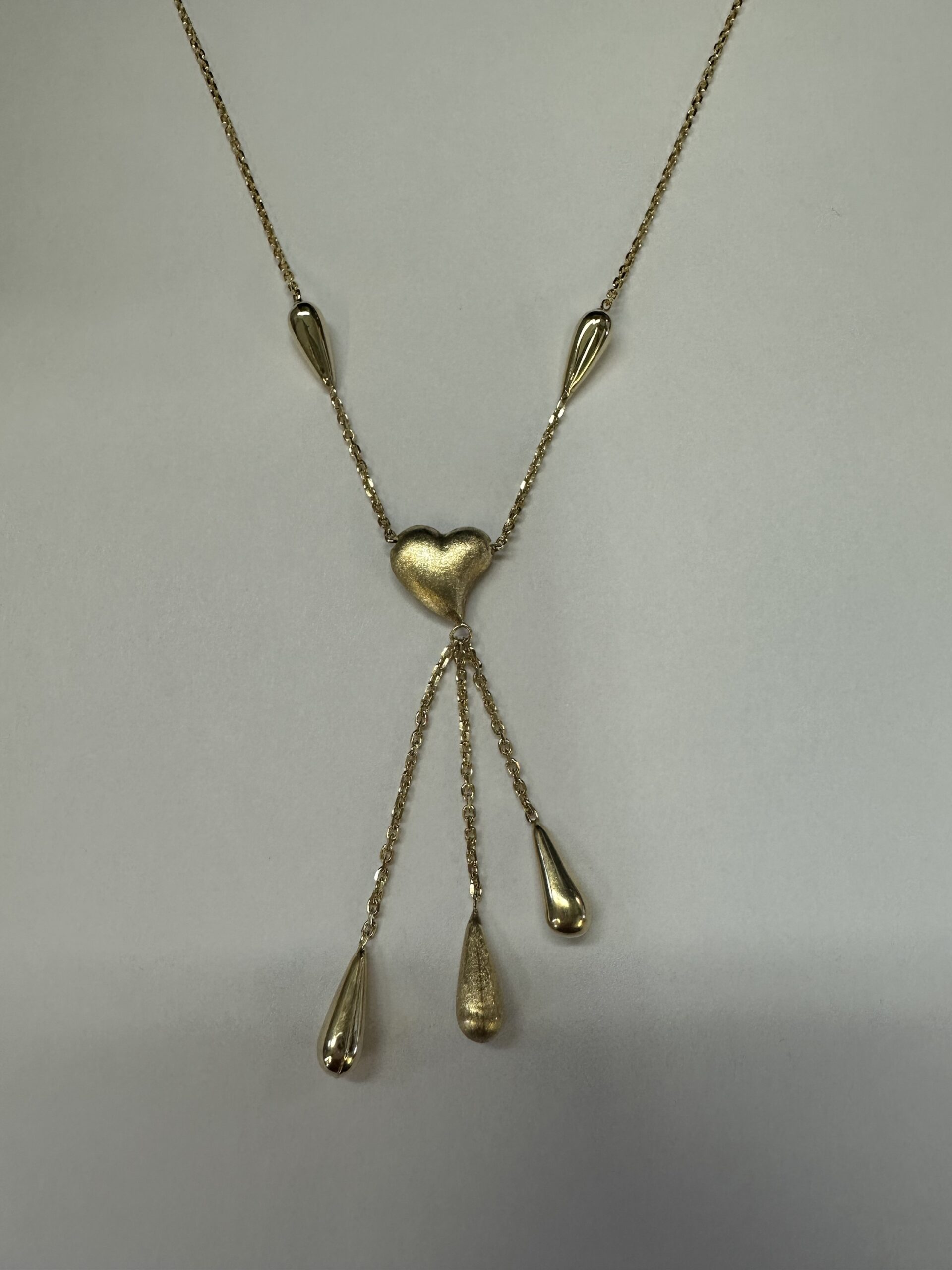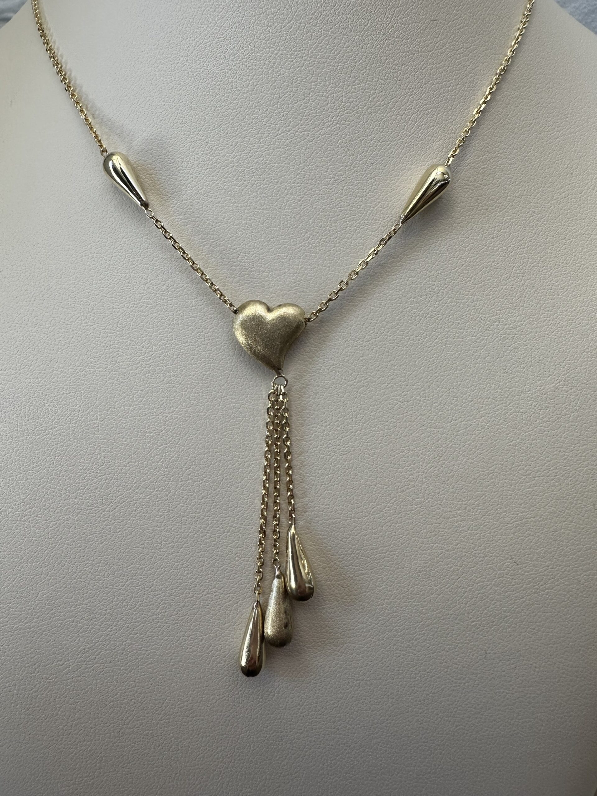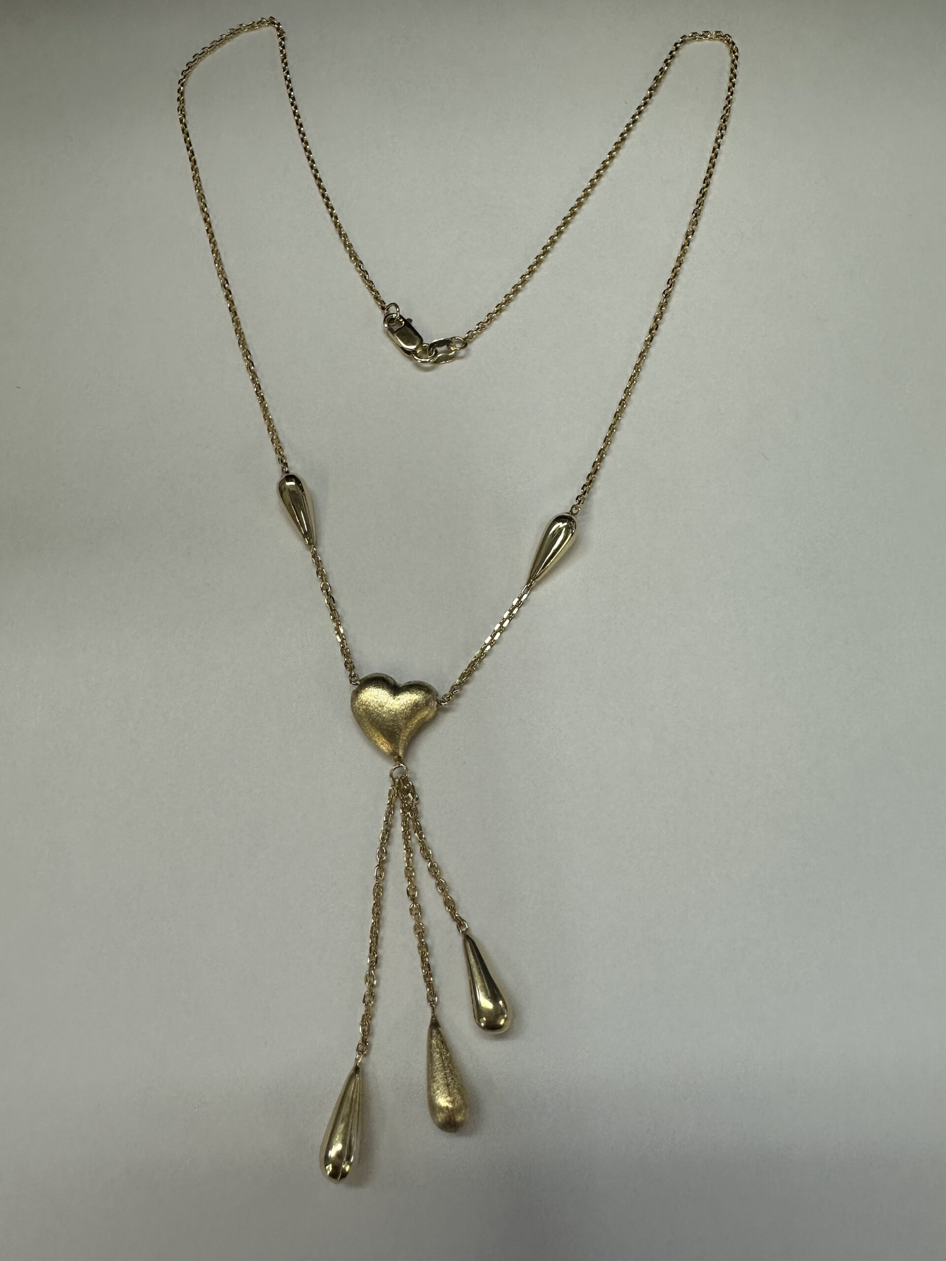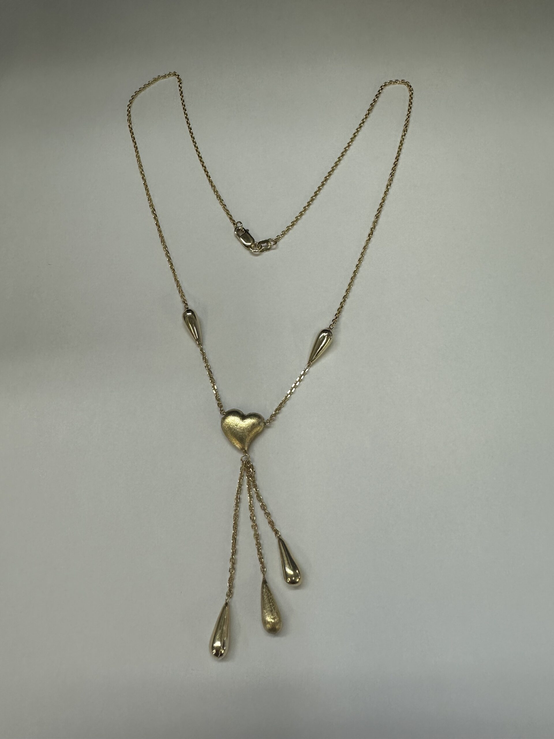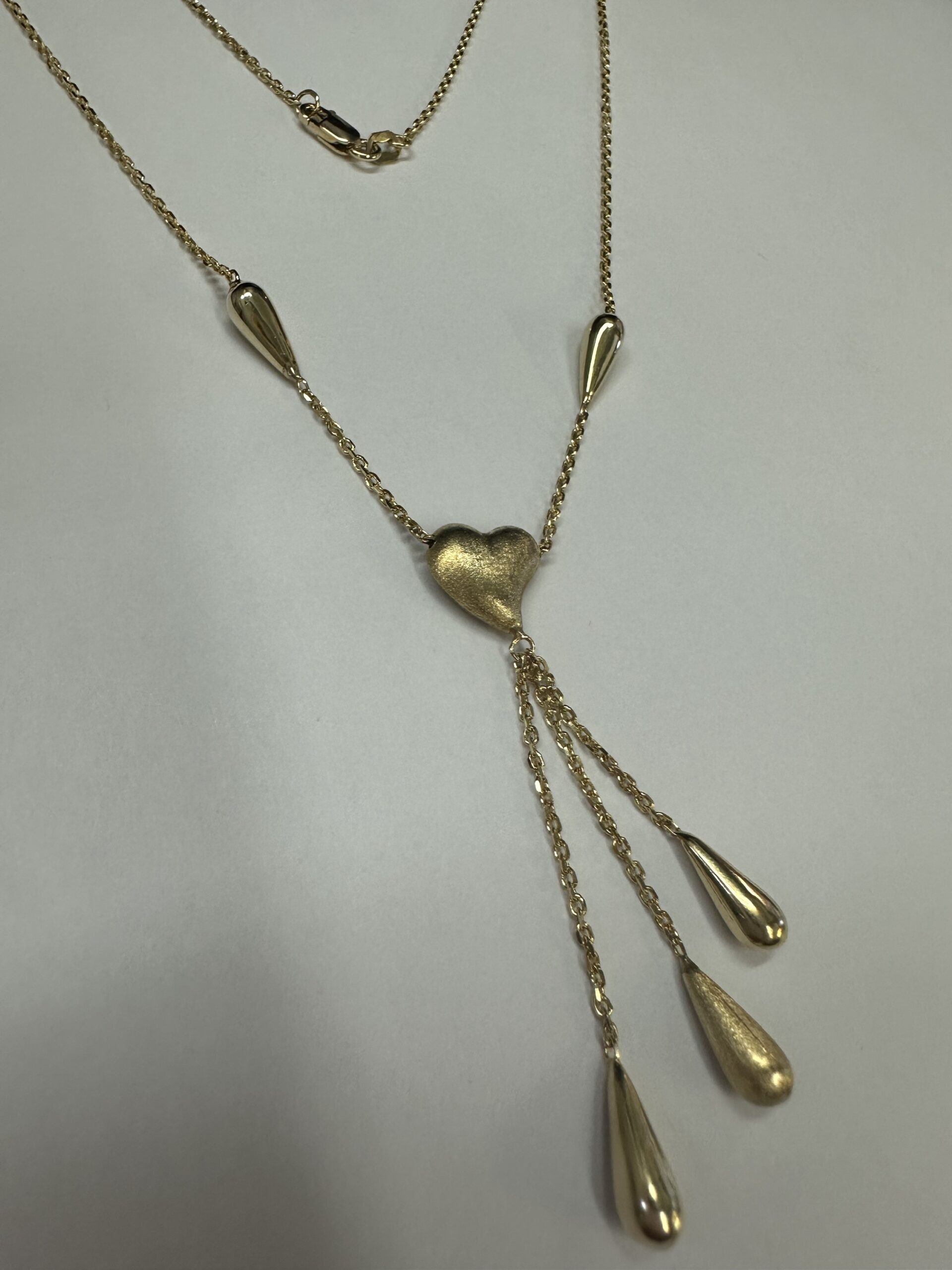 One-of-a-kind 10k yellow gold 17” long lariat pendant of a teardrop & heart motif. The longest dangle measures 2” in length, and this piece has an entire weight of 4.4 grams.