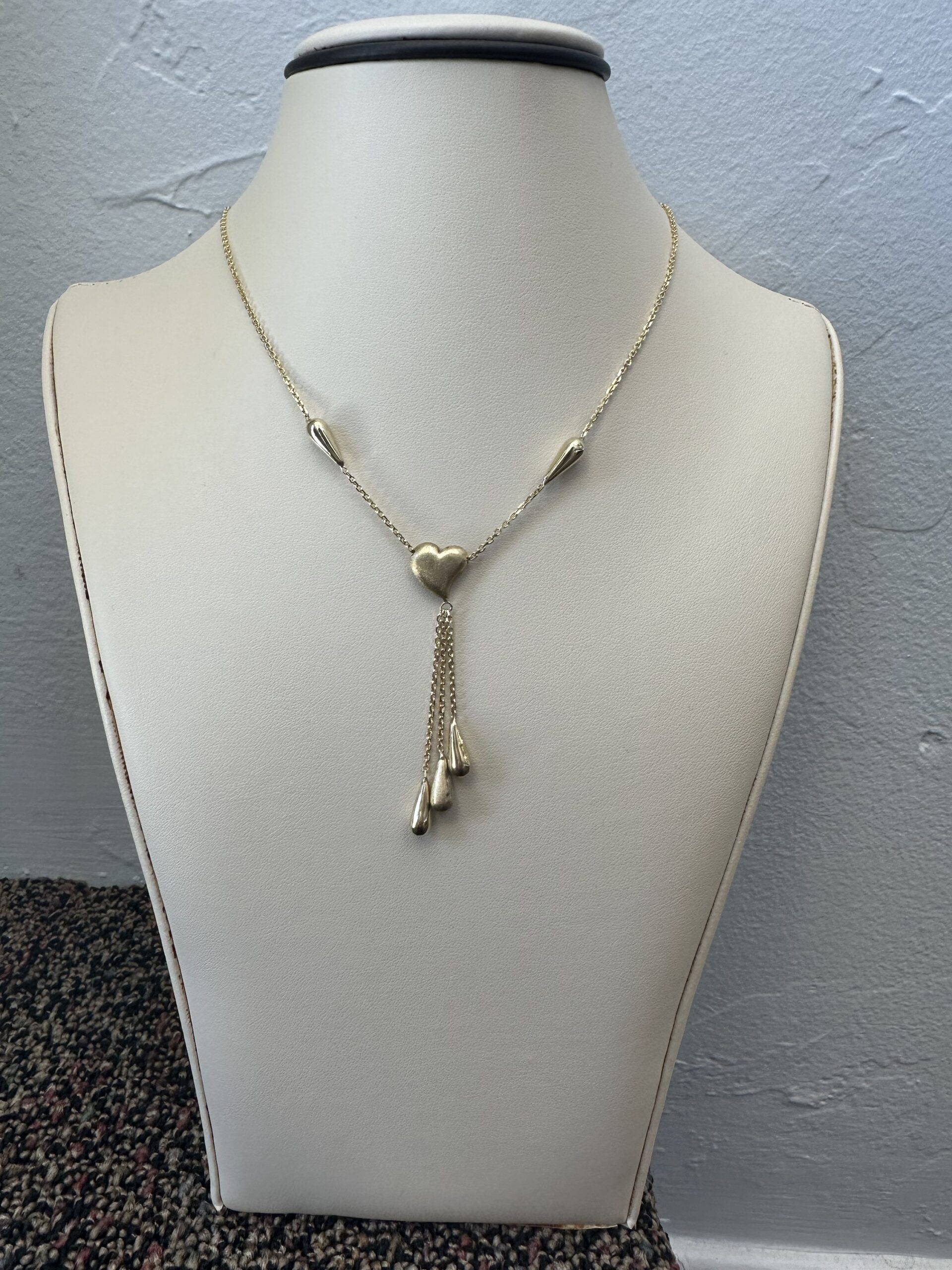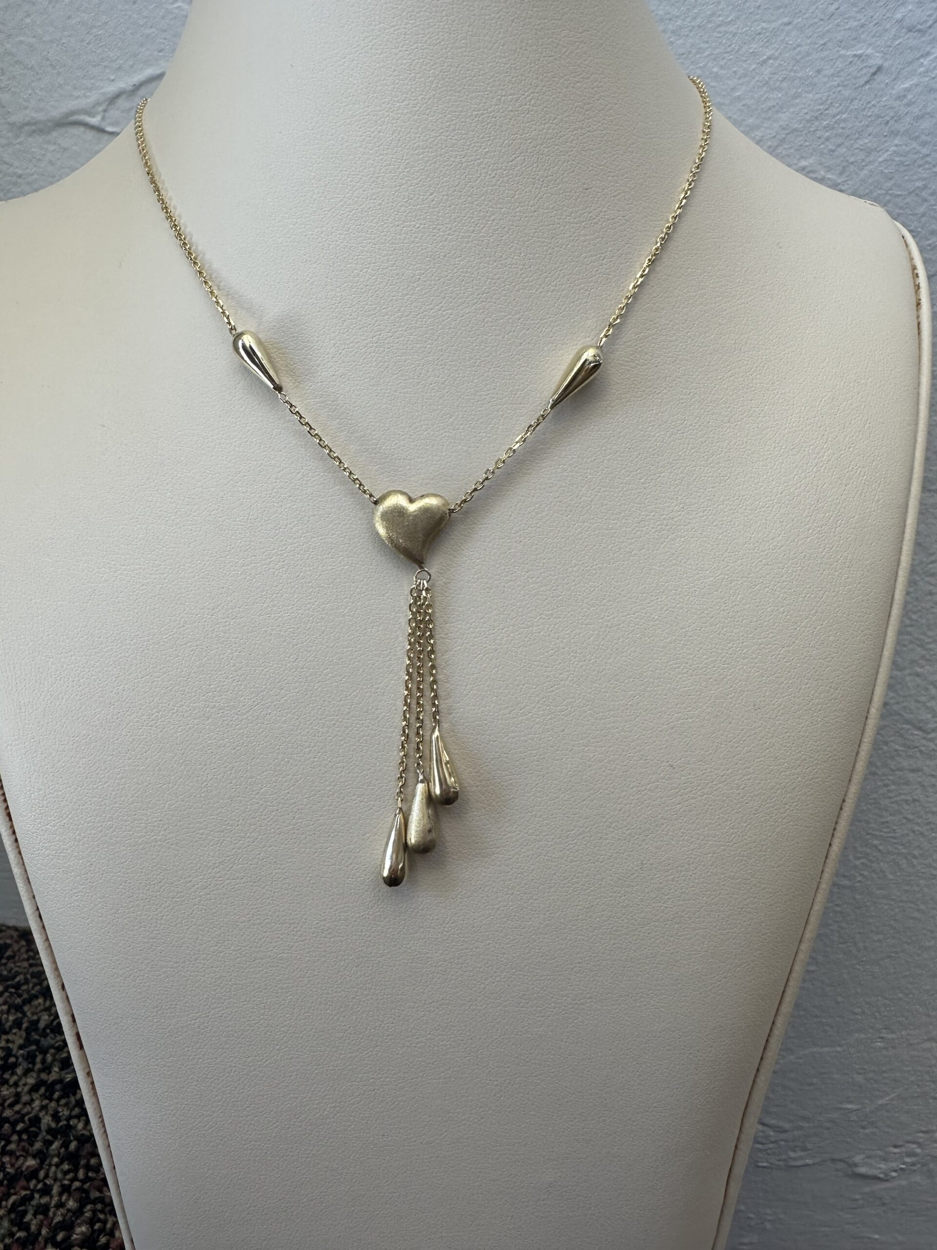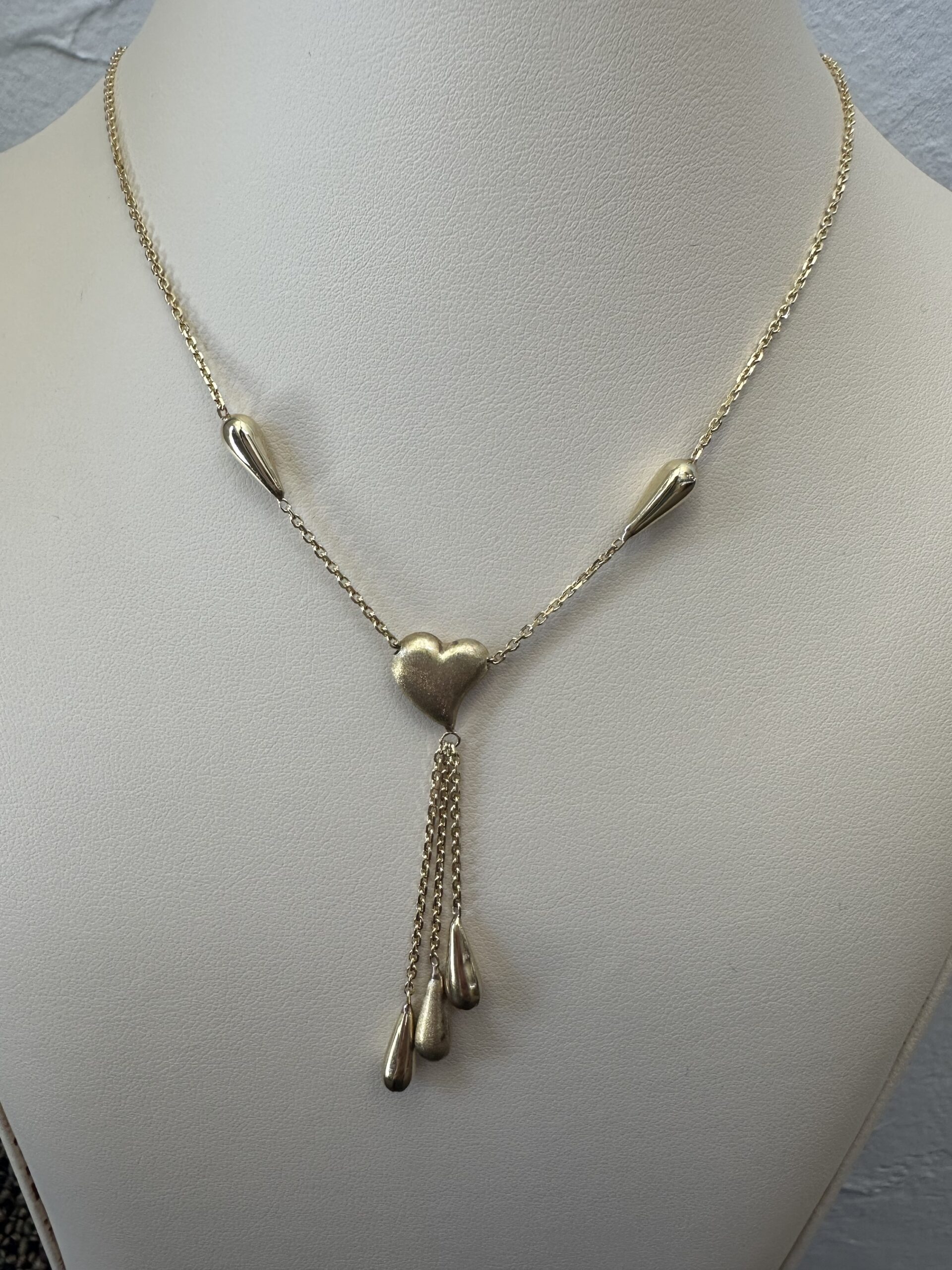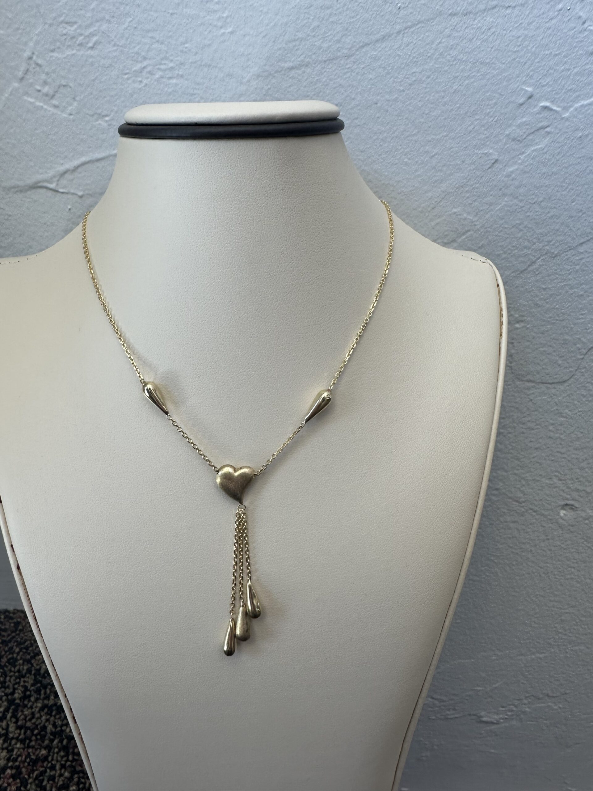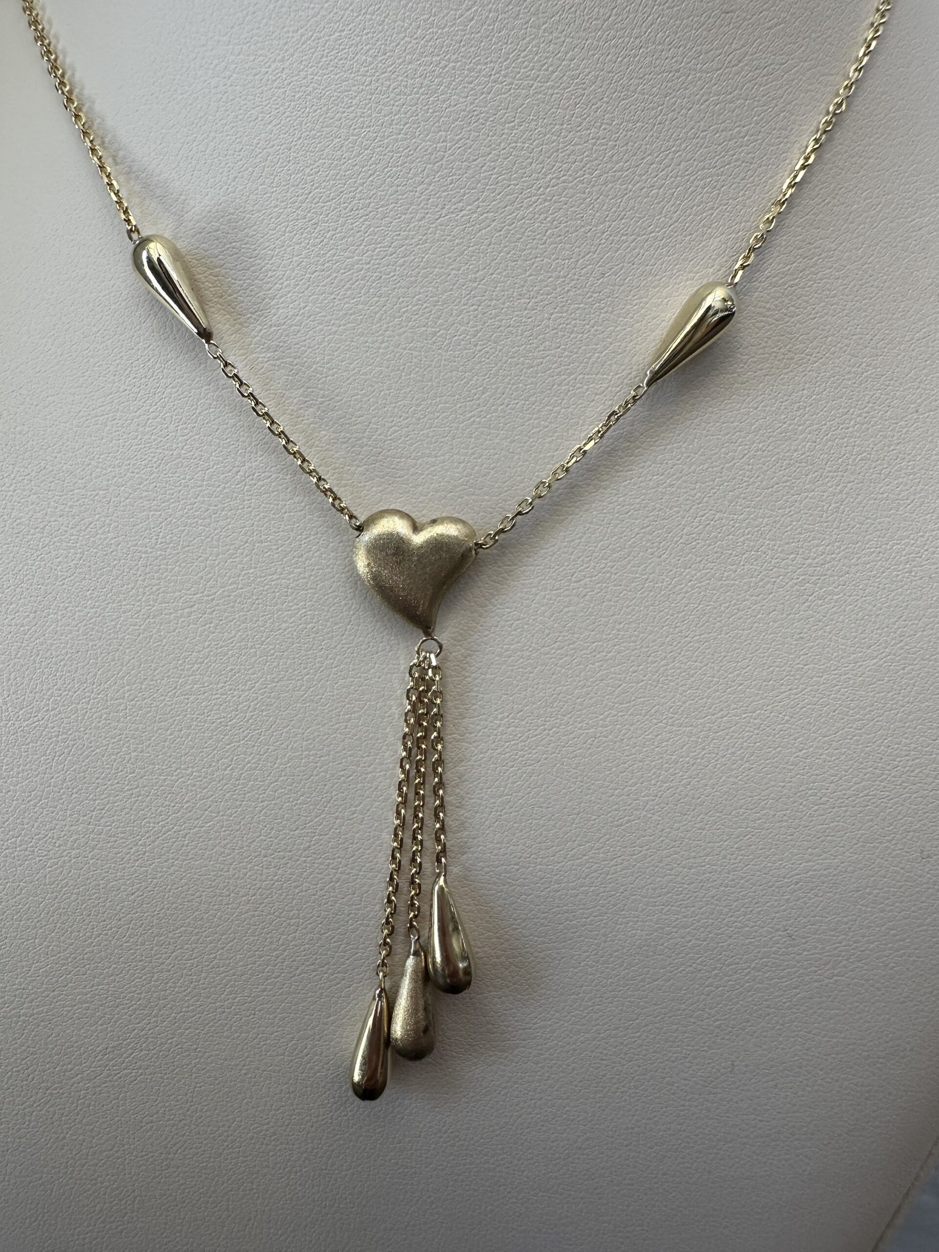 One-of-a-kind 10k yellow gold 17” long lariat pendant of a teardrop & heart motif. The longest dangle measures 2” in length, and this piece has an entire weight of 4.4 grams.