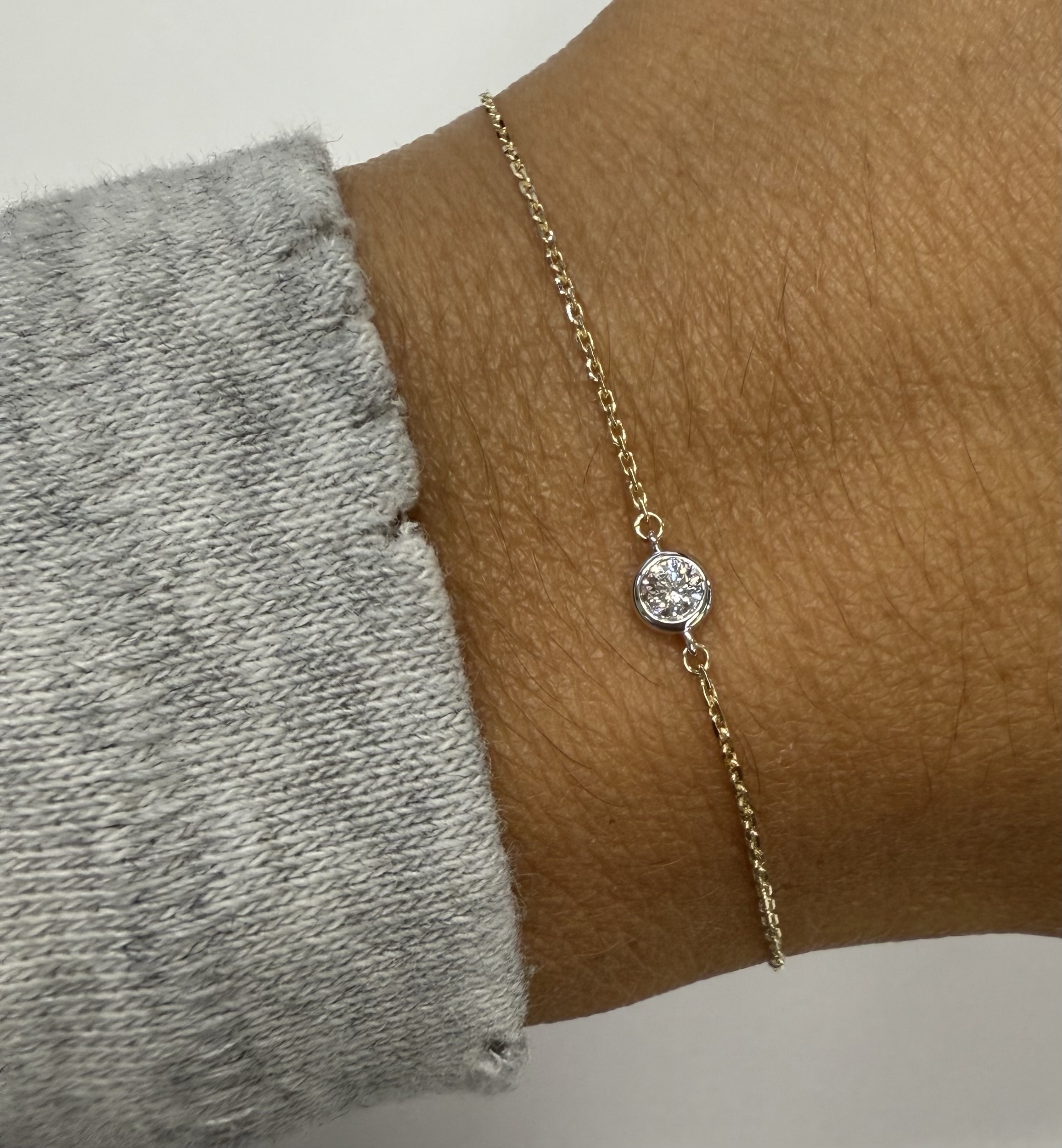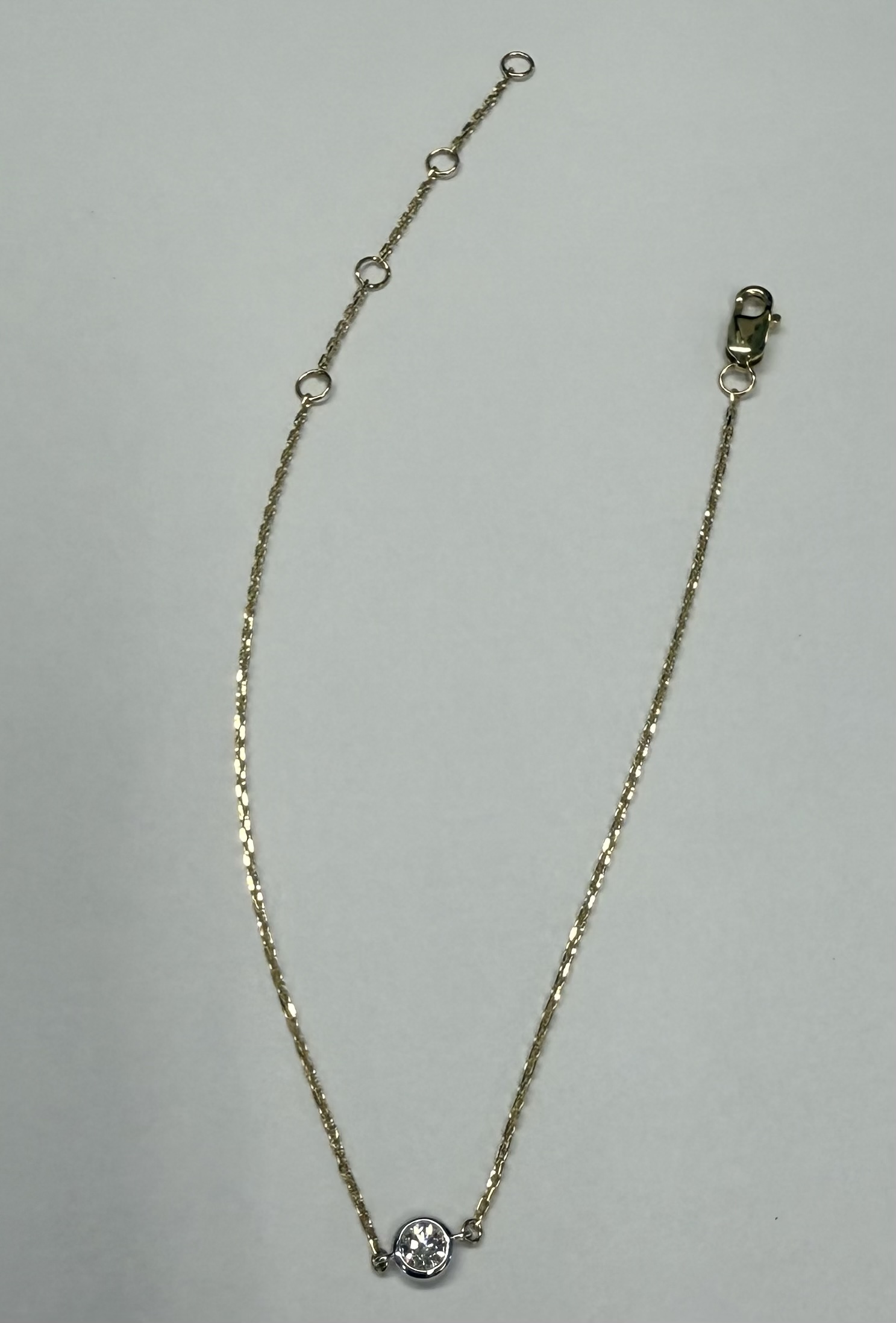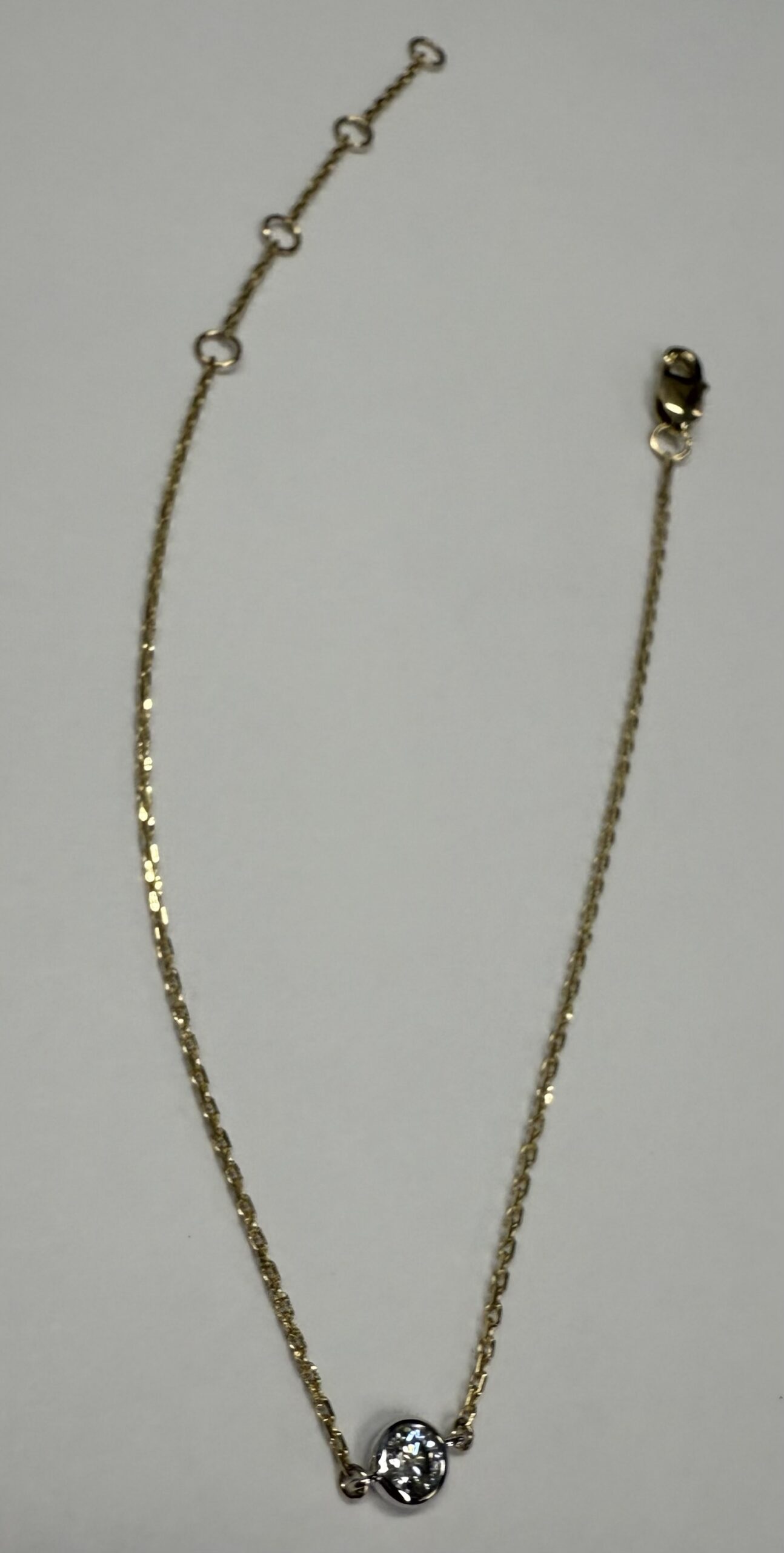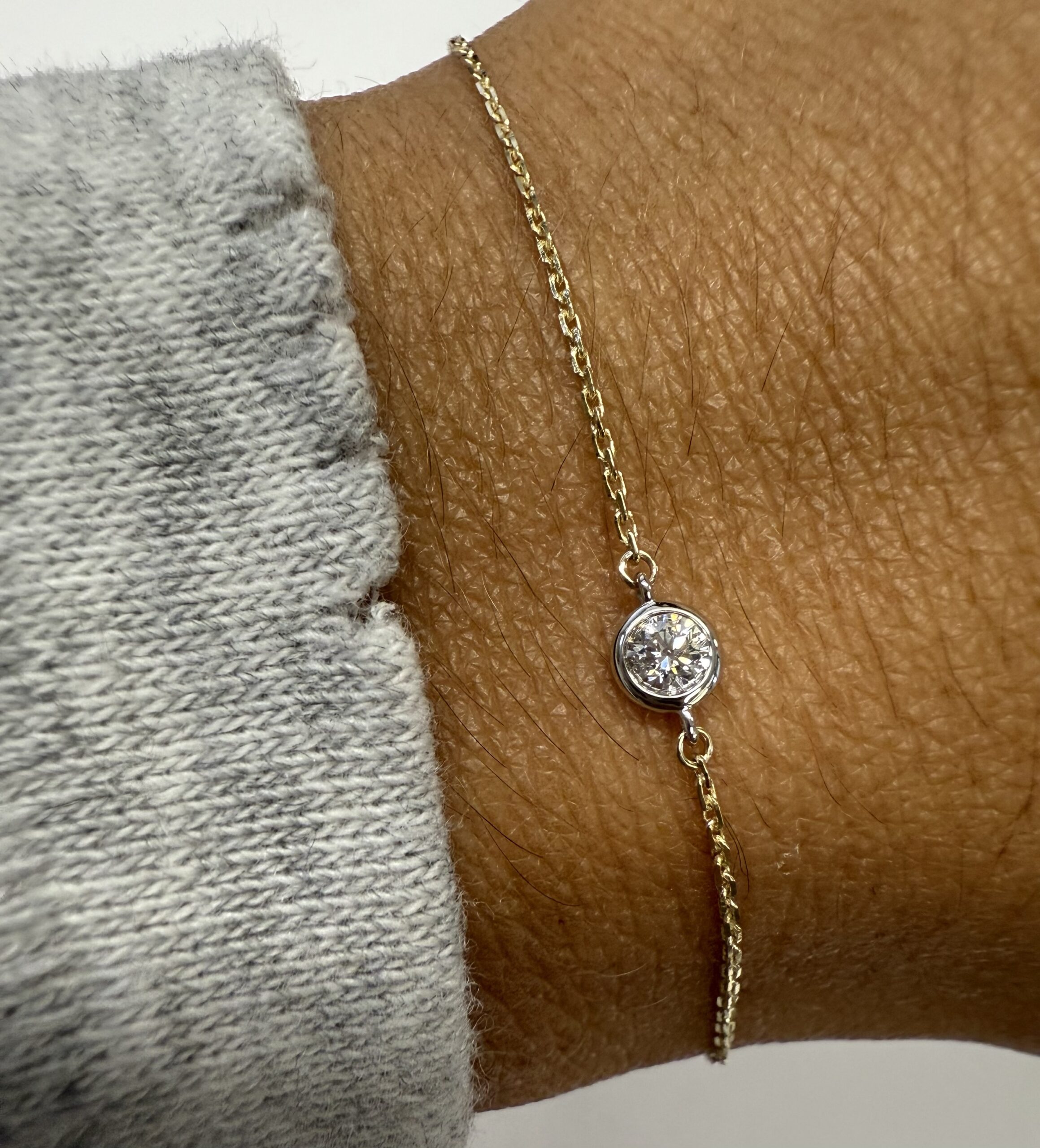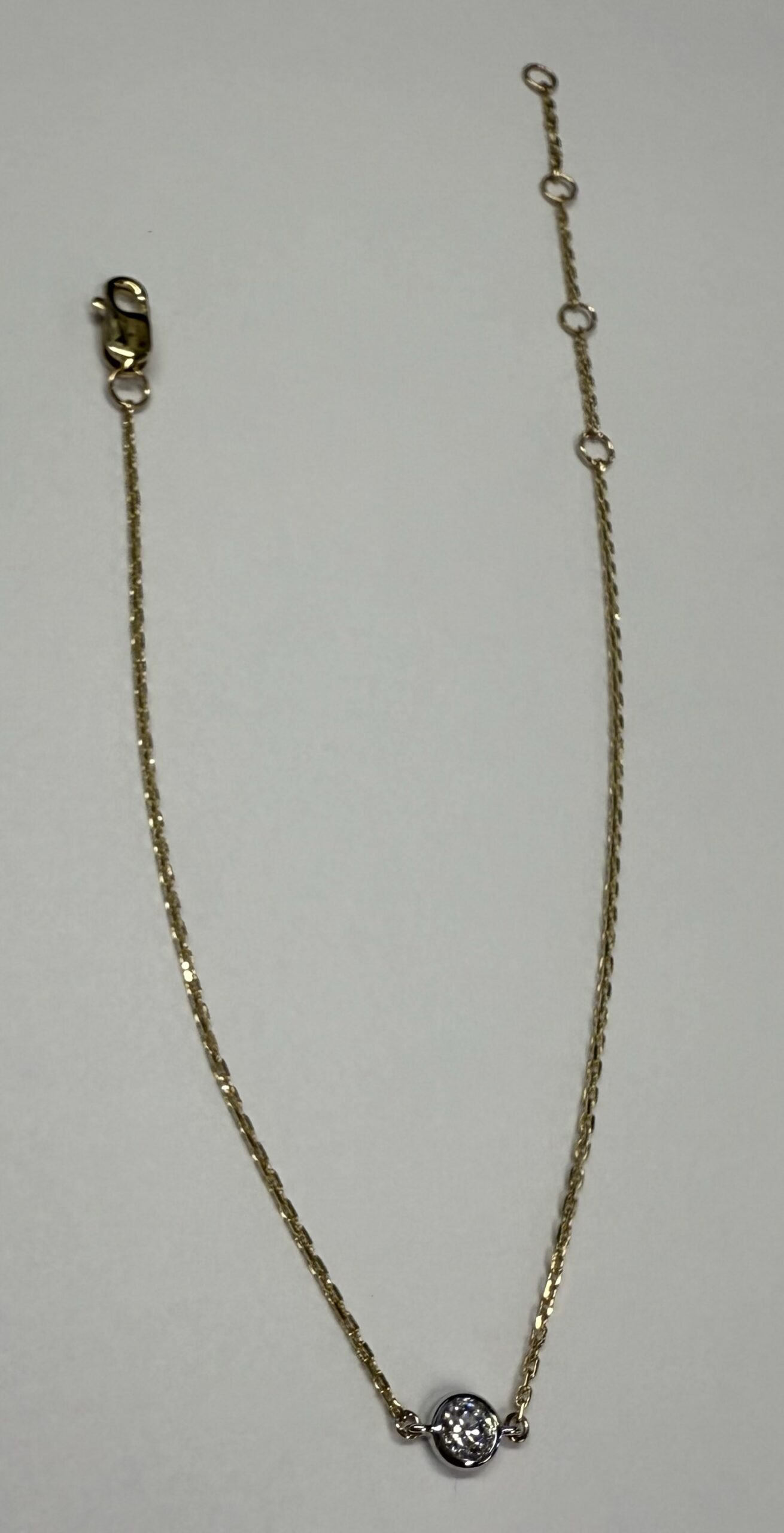 14k 2tone genuine .10 cttw Round Brilliant Cut diamond bezel set bracelet. The diamond has a door grade of H, and a clarity grade of SI1. This bracelet is adjustable 6-7.5″ in length, and it has an entire weight of 3.1 grams.