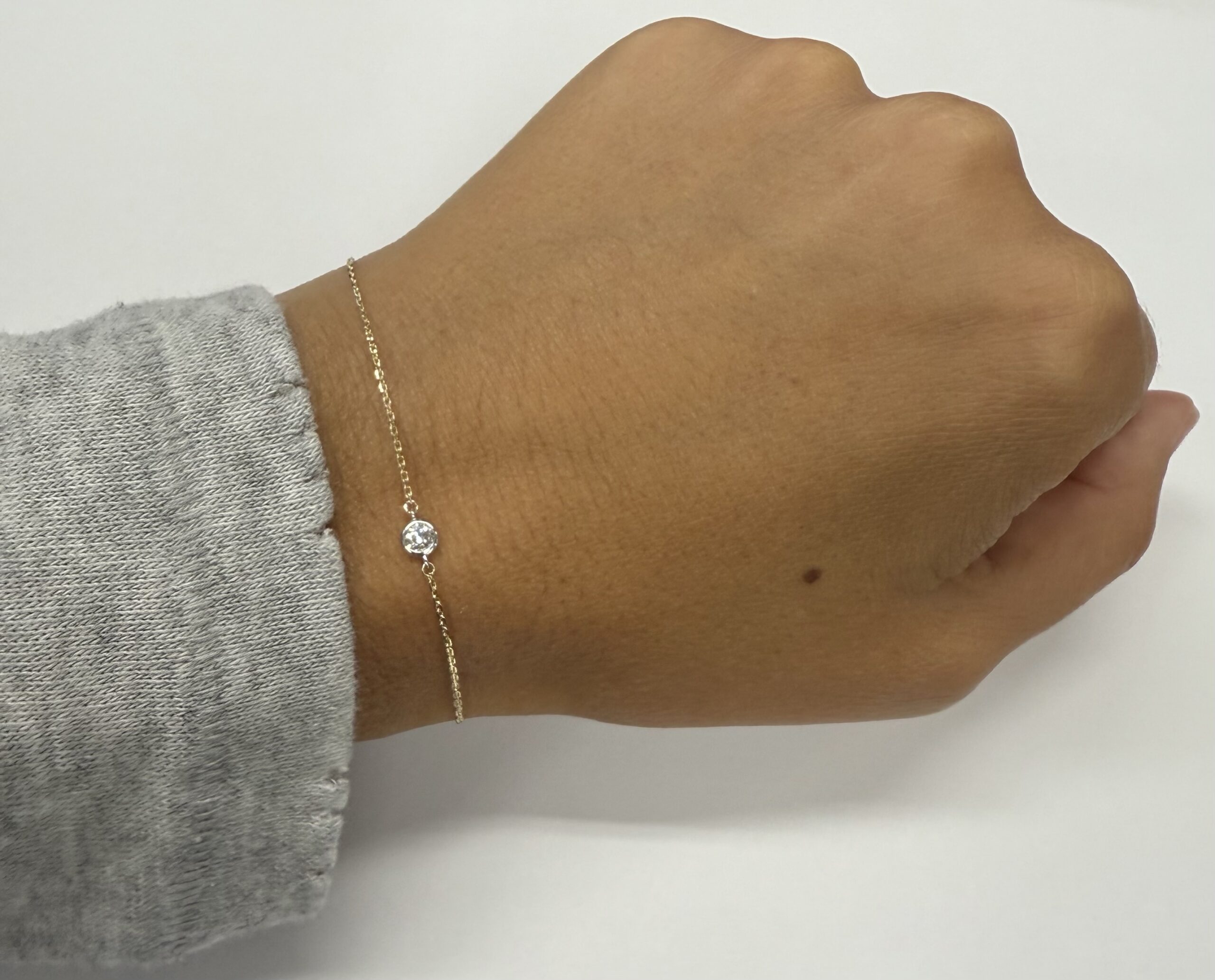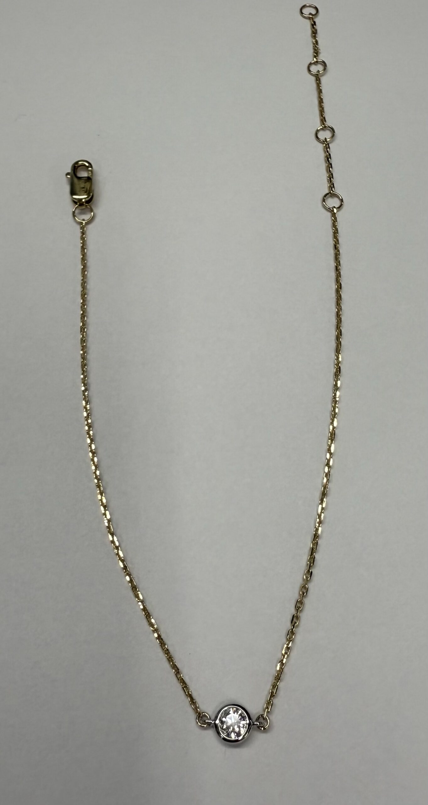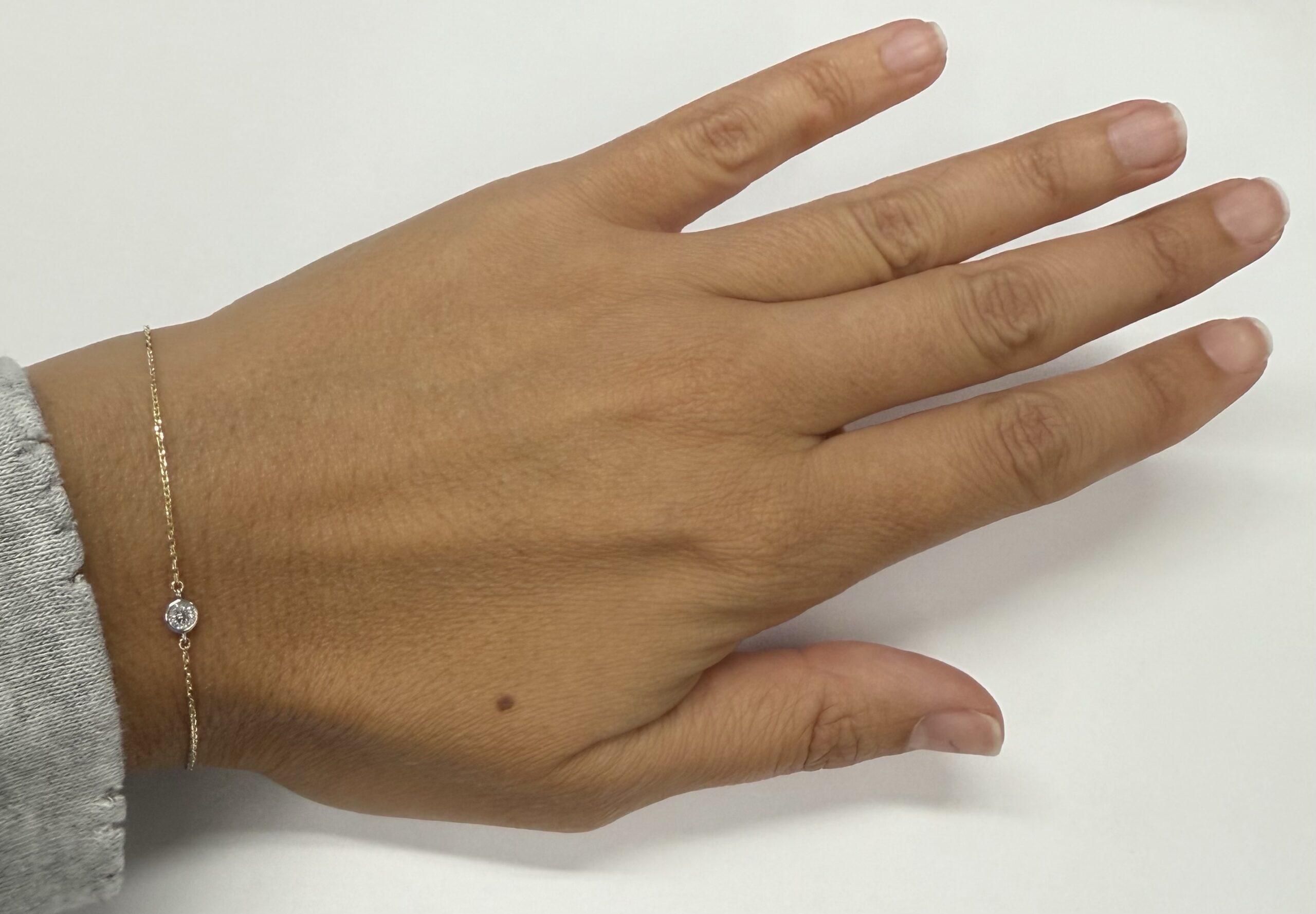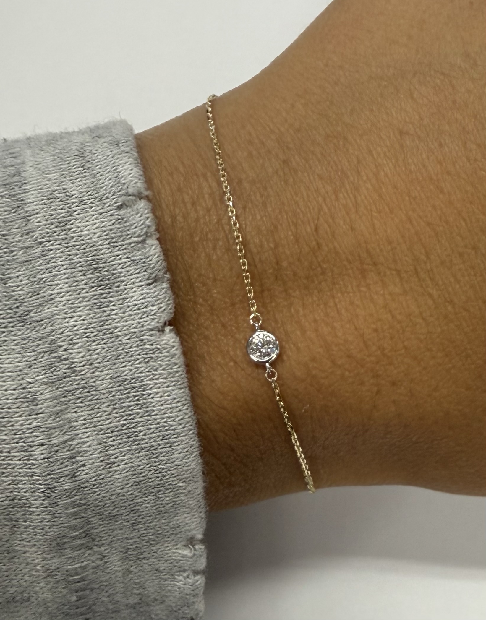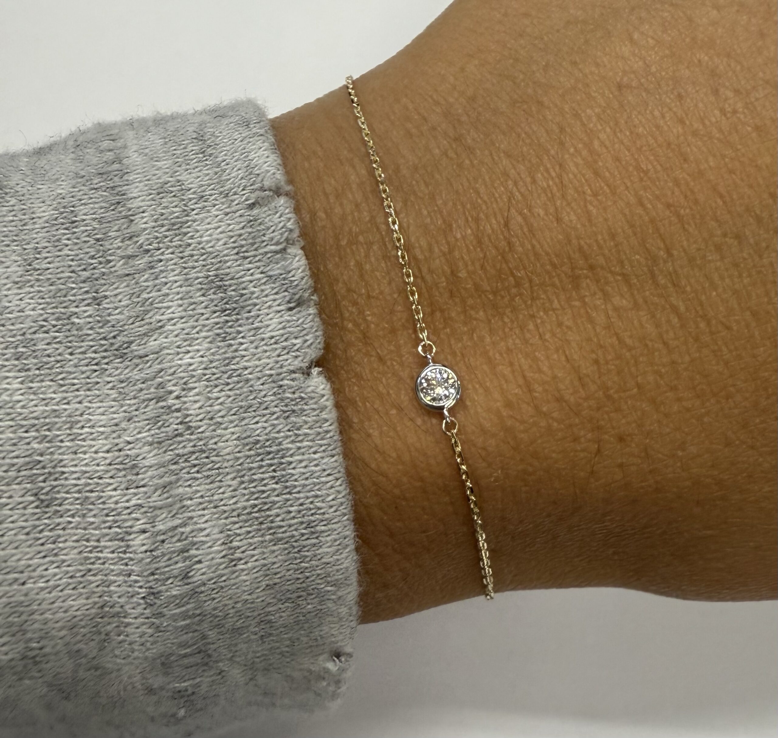 14k 2tone genuine .10 cttw Round Brilliant Cut diamond bezel set bracelet. The diamond has a door grade of H, and a clarity grade of SI1. This bracelet is adjustable 6-7.5″ in length, and it has an entire weight of 3.1 grams.