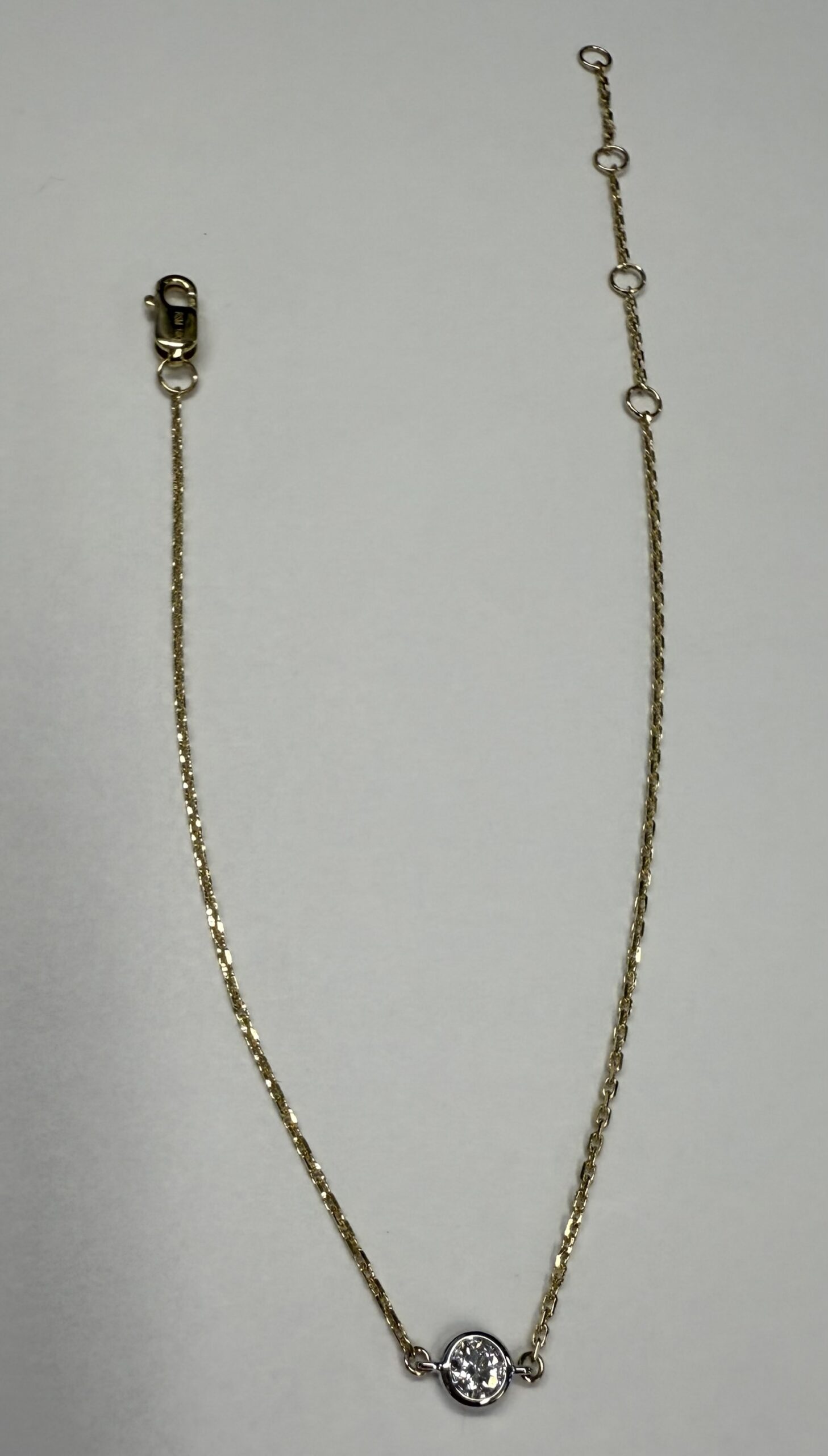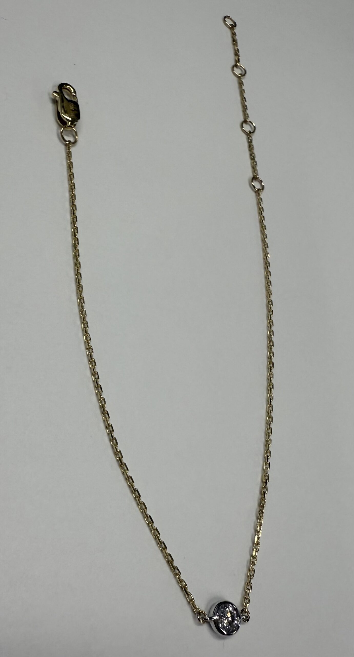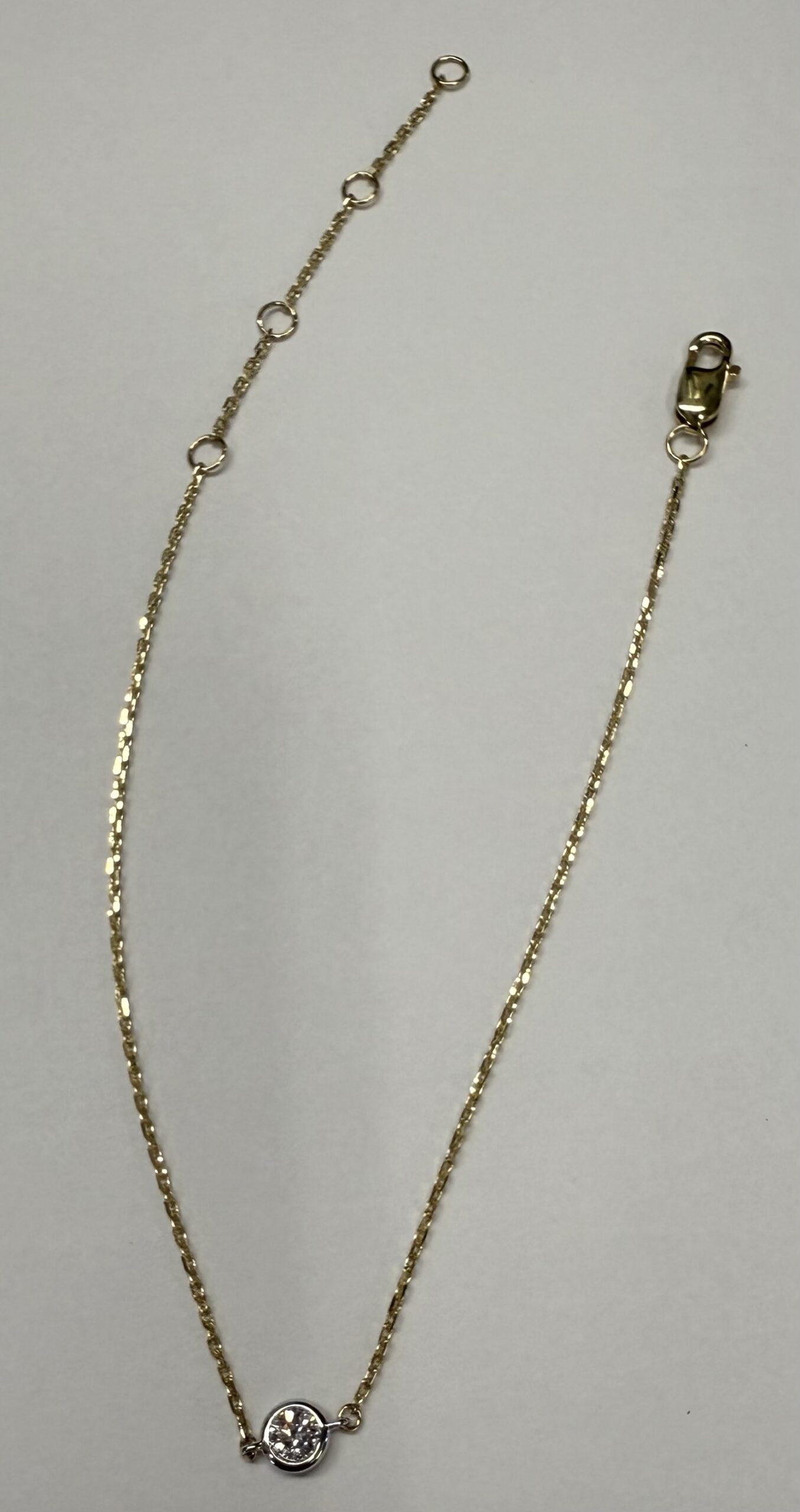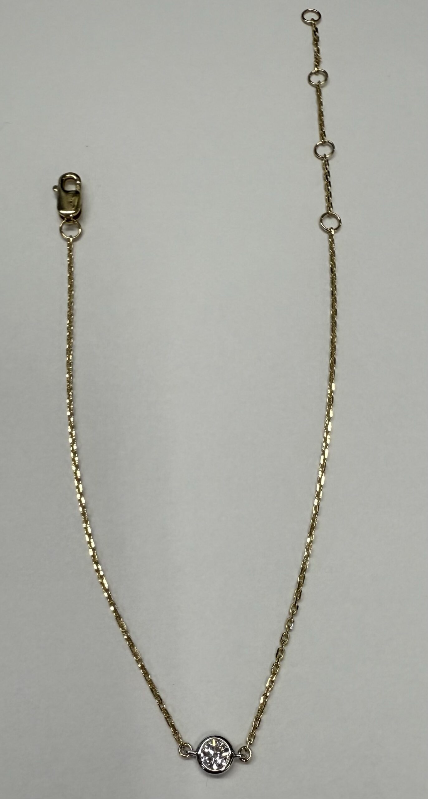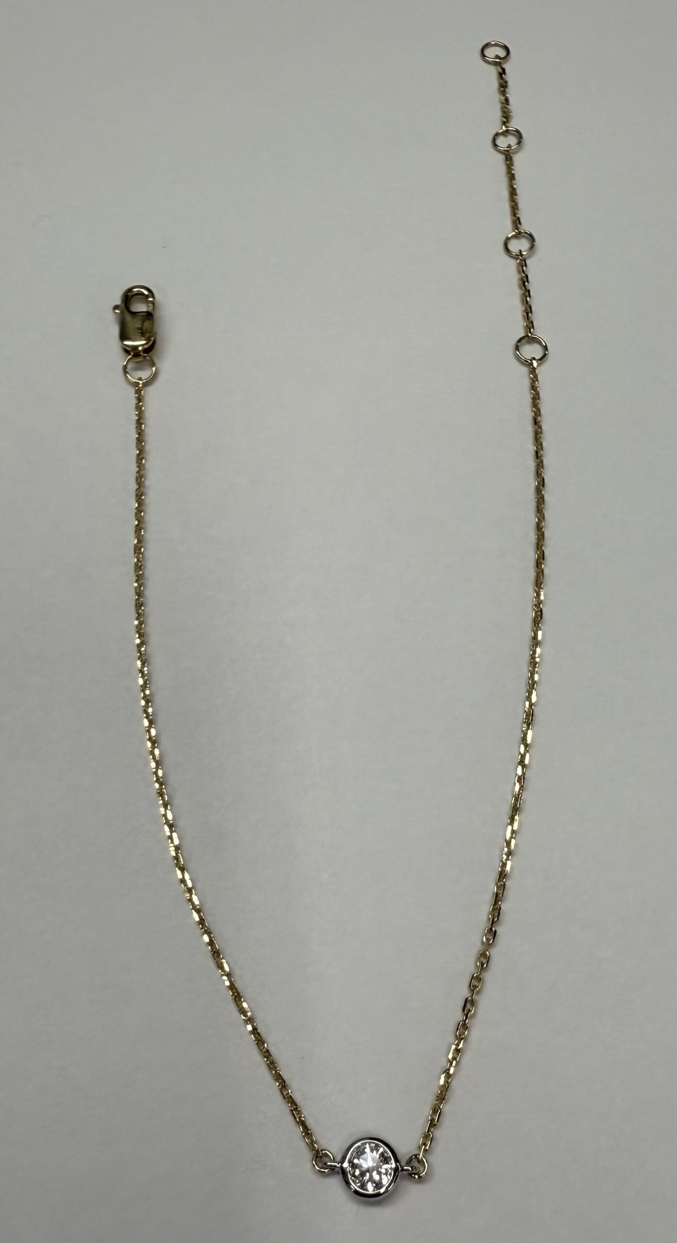14k 2tone genuine .10 cttw Round Brilliant Cut diamond bezel set bracelet. The diamond has a door grade of H, and a clarity grade of SI1. This bracelet is adjustable 6-7.5″ in length, and it has an entire weight of 3.1 grams.