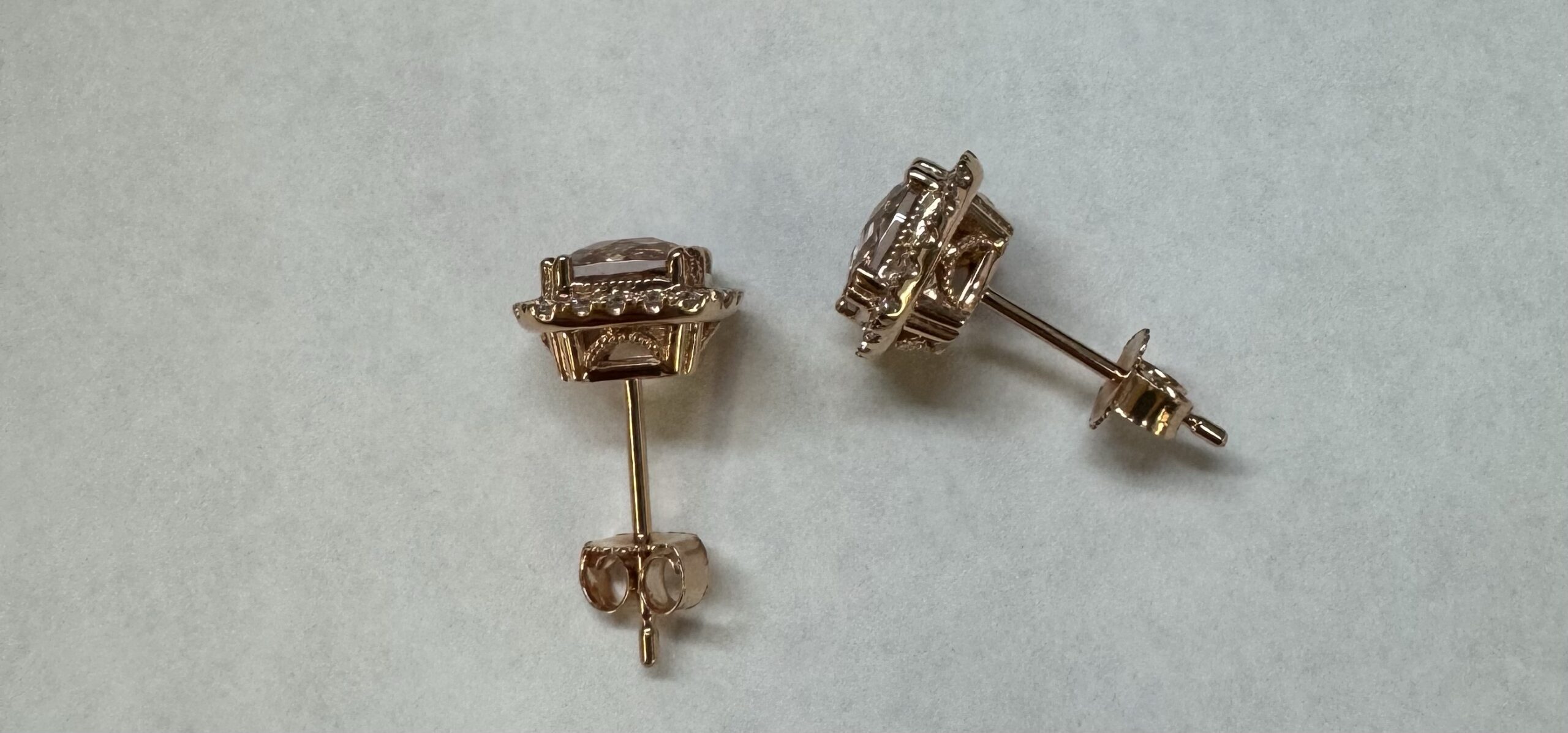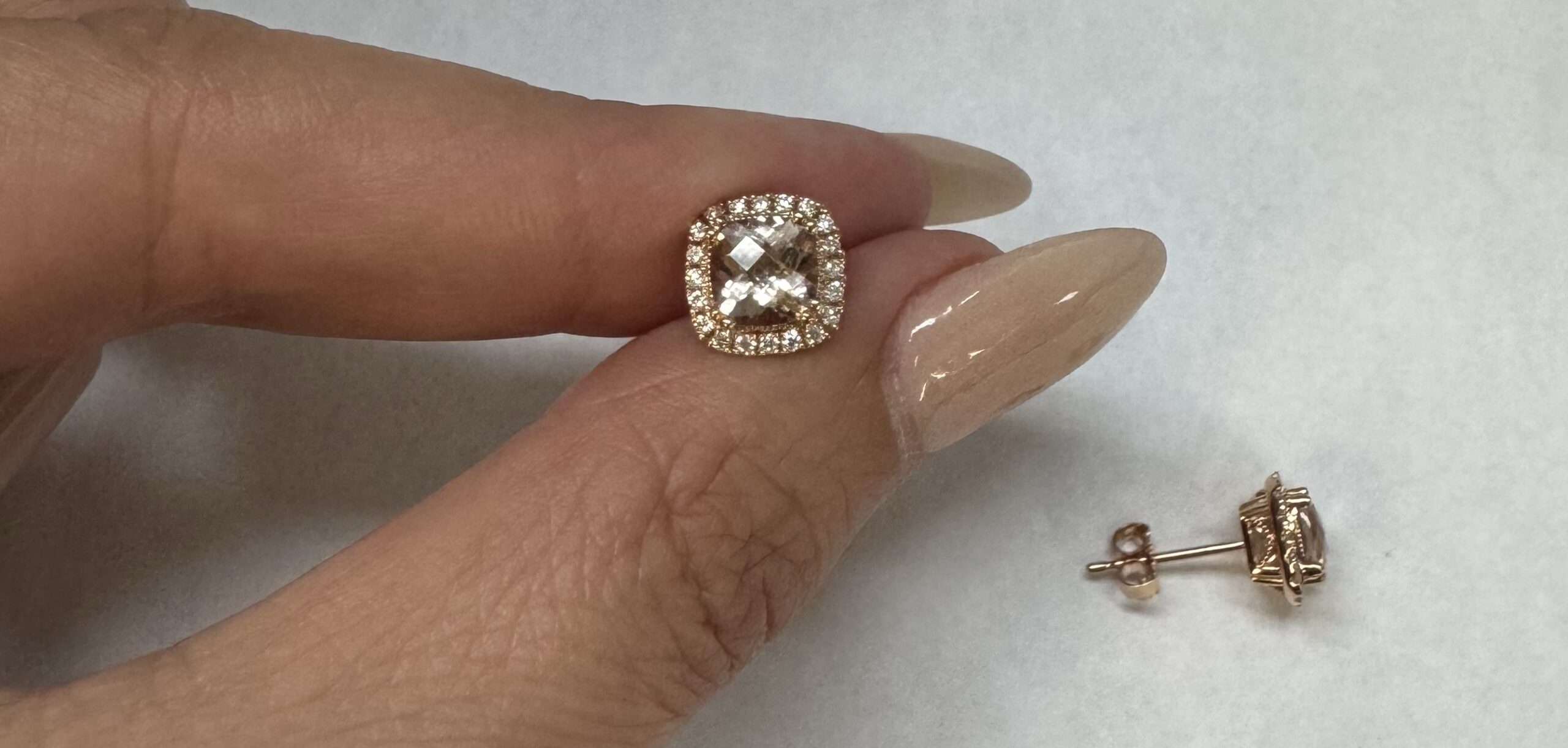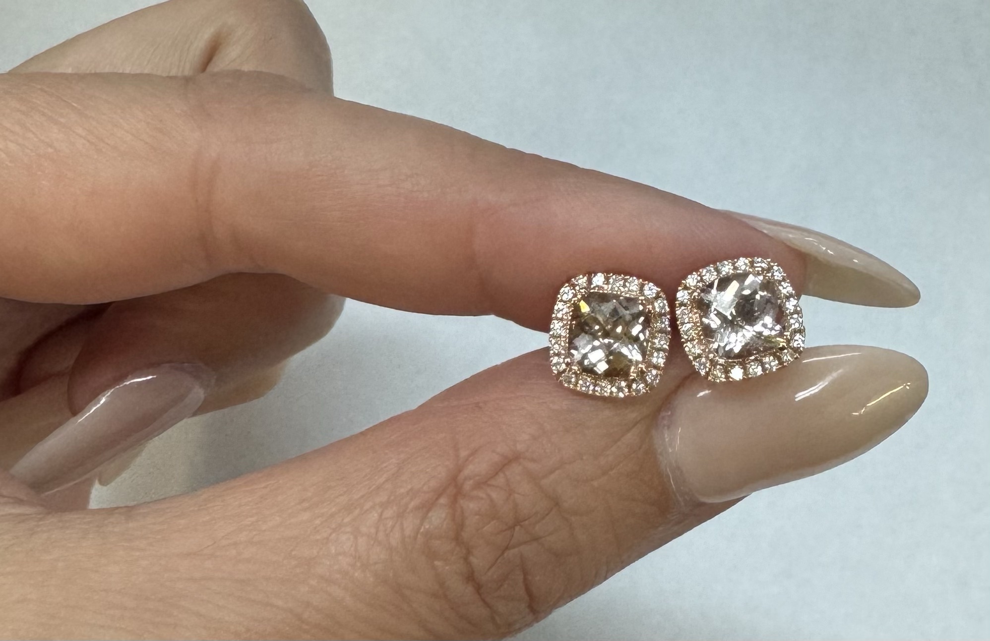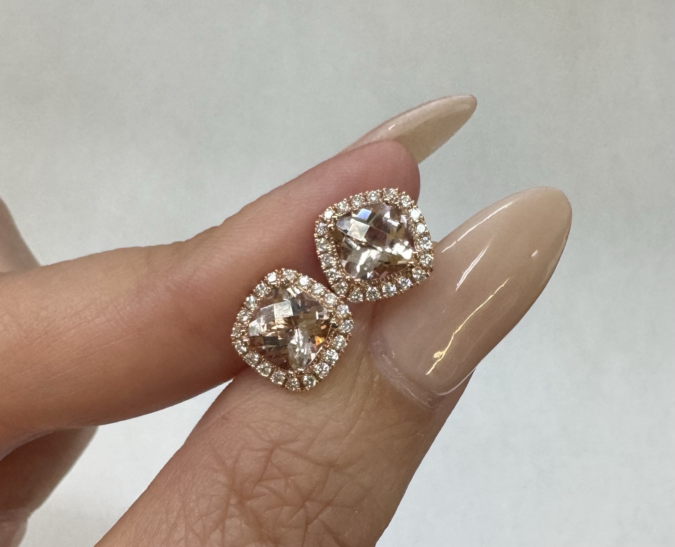 Just in! 14k rose gold genuine 1.75 cttw cushion shaped, Pineapple Cut Morganite & .23 cttw genuine Round Brilliant Cut diamond halo stud and earrings with filigree details. These diamonds average G-H in color and SI1 in clarity. These earrings have an entire weight of 2.2 grams.