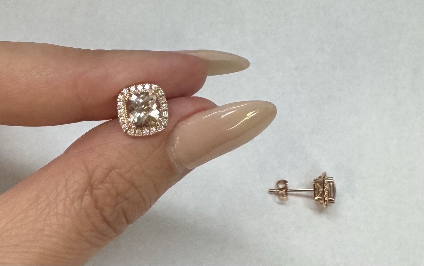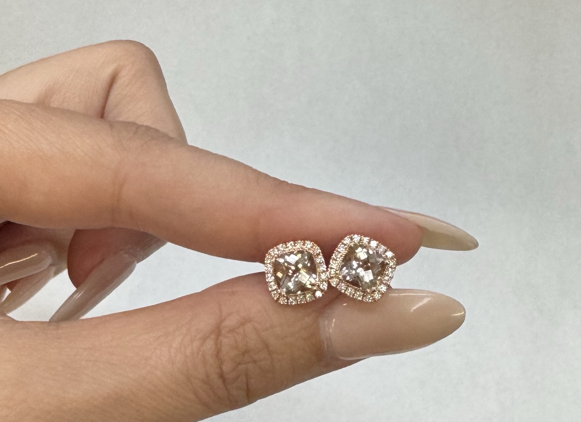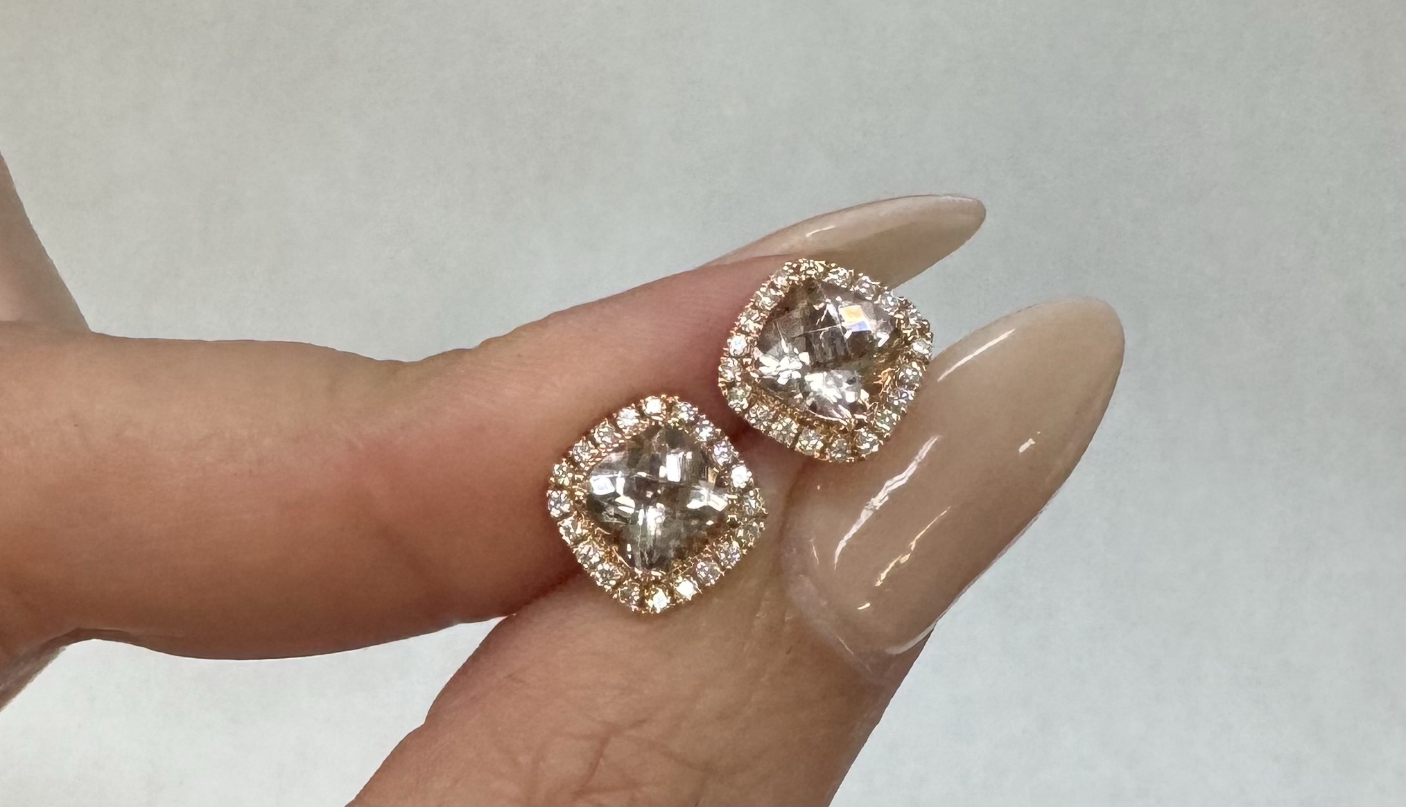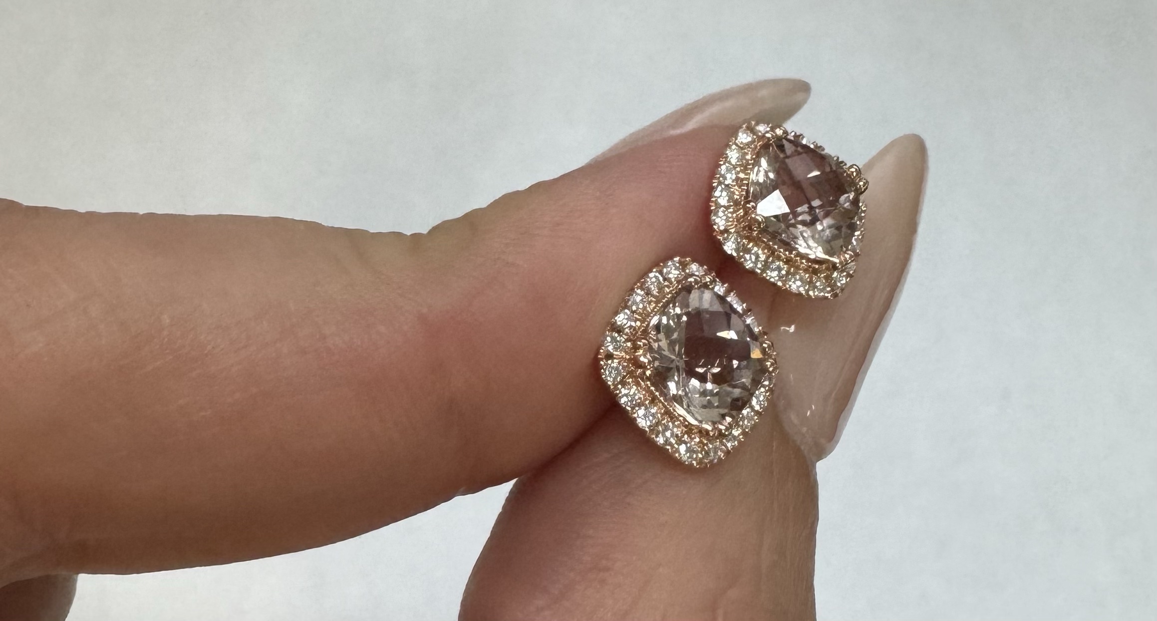 Just in! 14k rose gold genuine 1.75 cttw cushion shaped, Pineapple Cut Morganite & .23 cttw genuine Round Brilliant Cut diamond halo stud and earrings with filigree details. These diamonds average G-H in color and SI1 in clarity. These earrings have an entire weight of 2.2 grams.