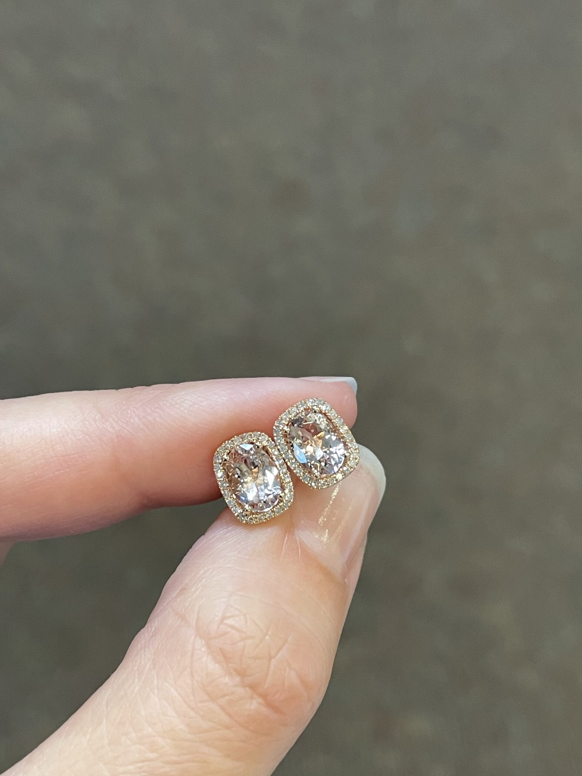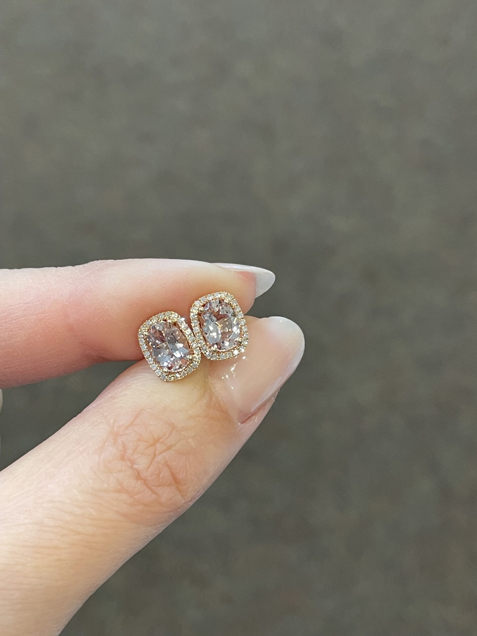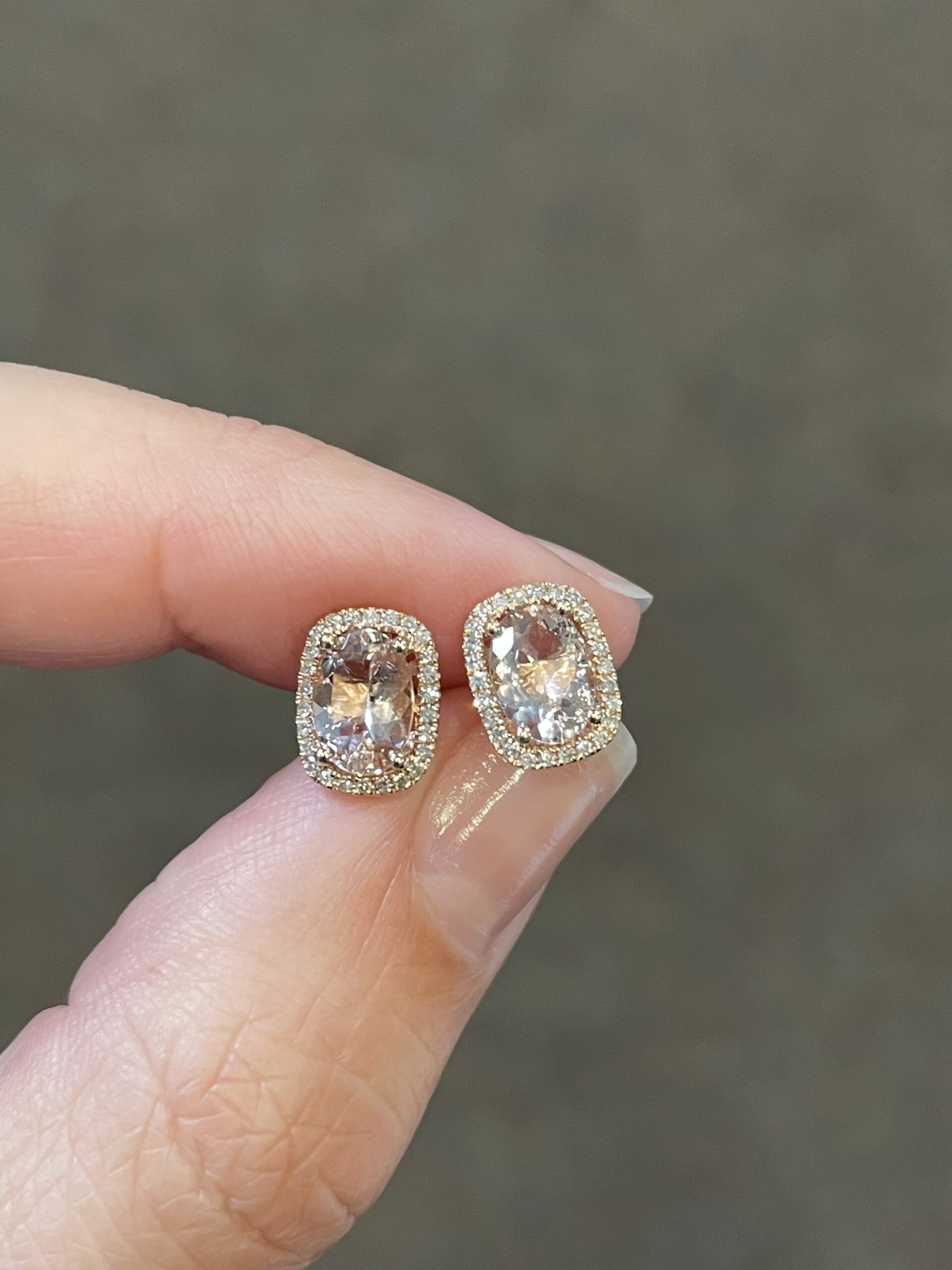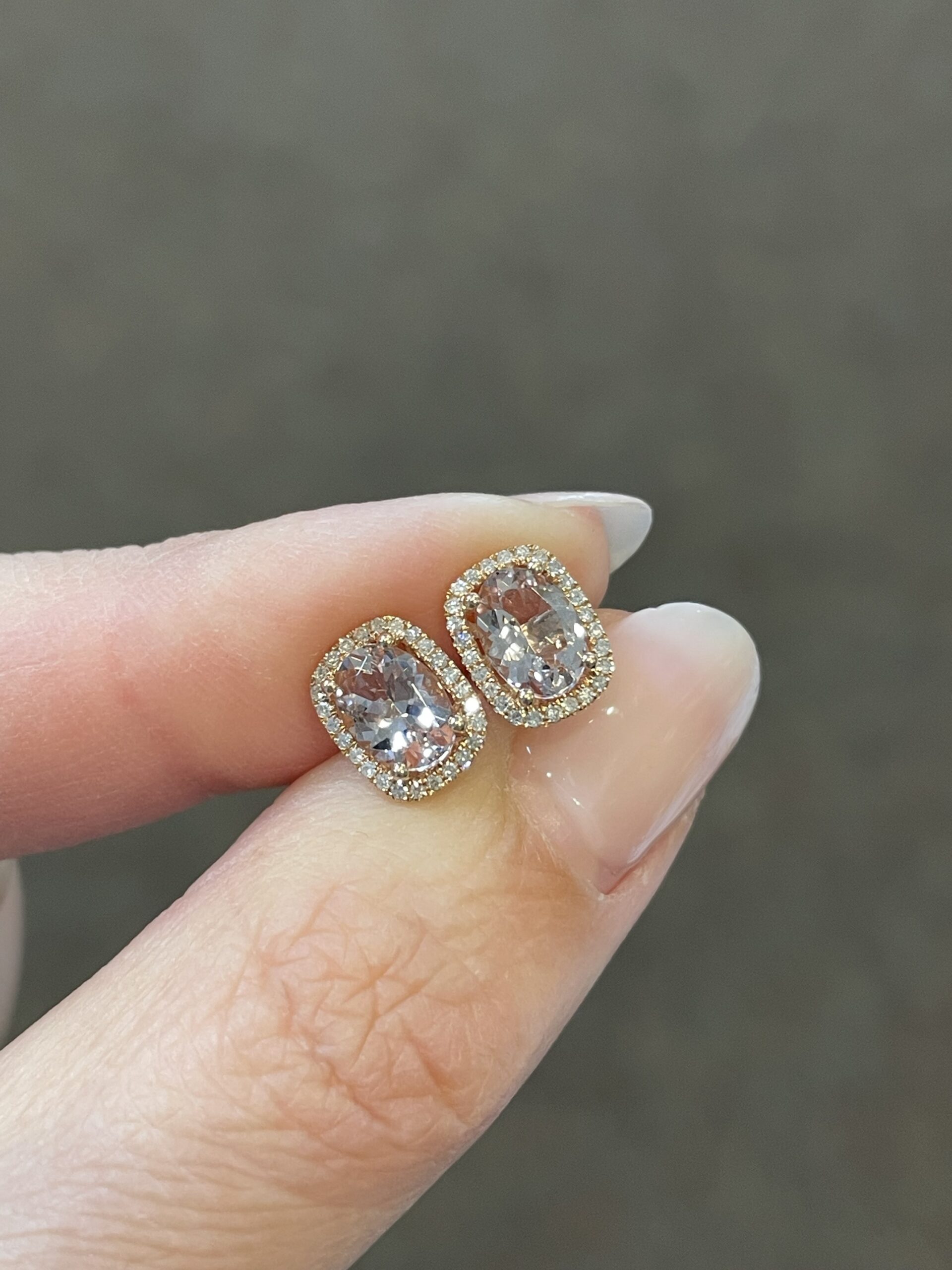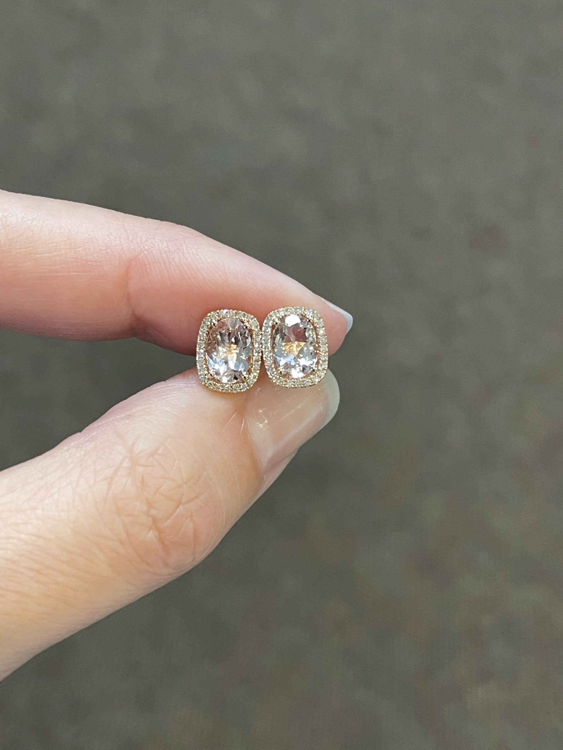 14k rose gold genuine cushion cut, faceted, 1.31 Cttw Morganite & .13 Cttw genuine Round Brilliant Cut diamond halo stud earrings. These diamonds average H-I in color and SI in clarity.