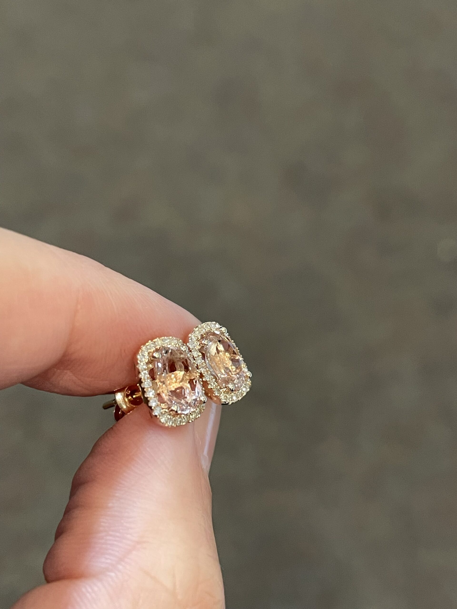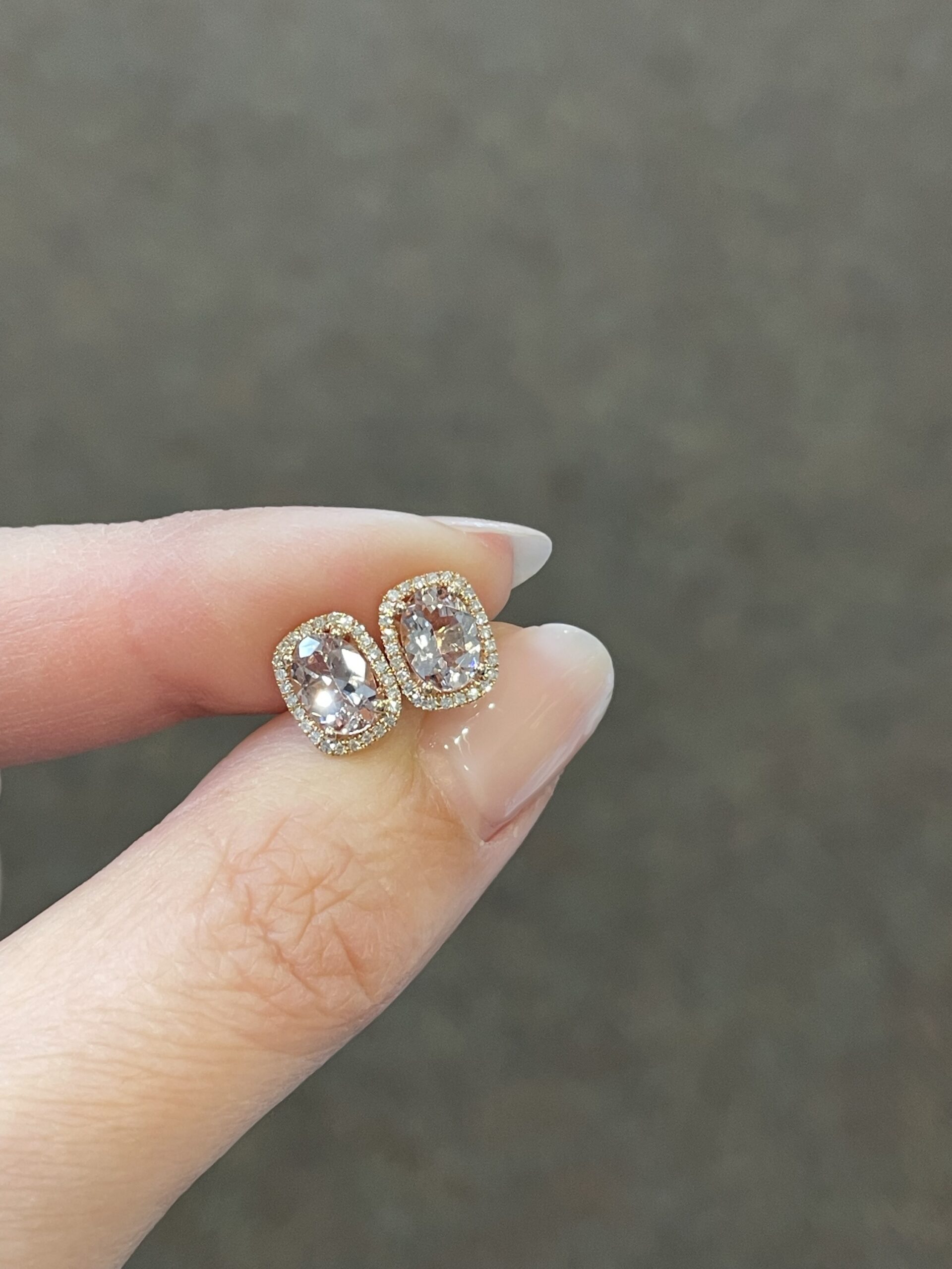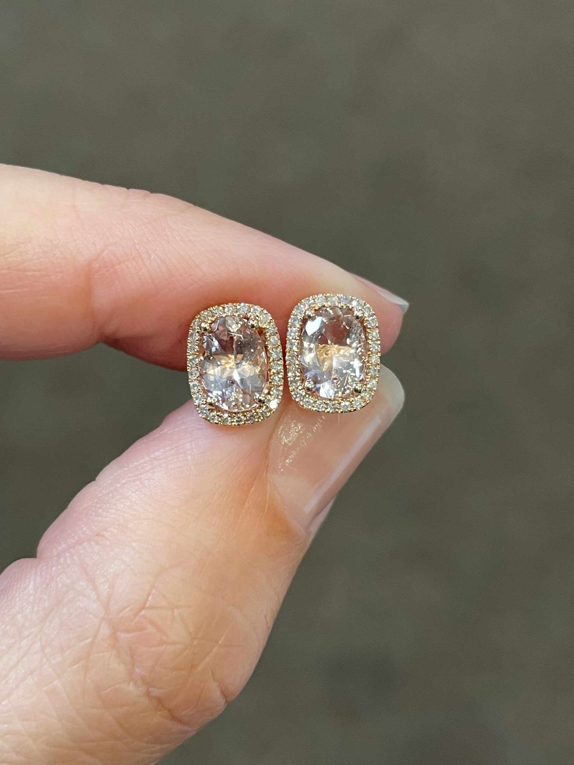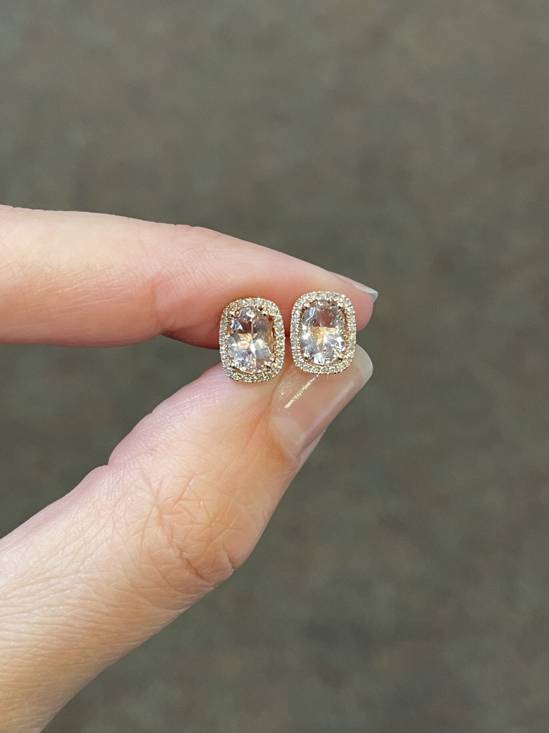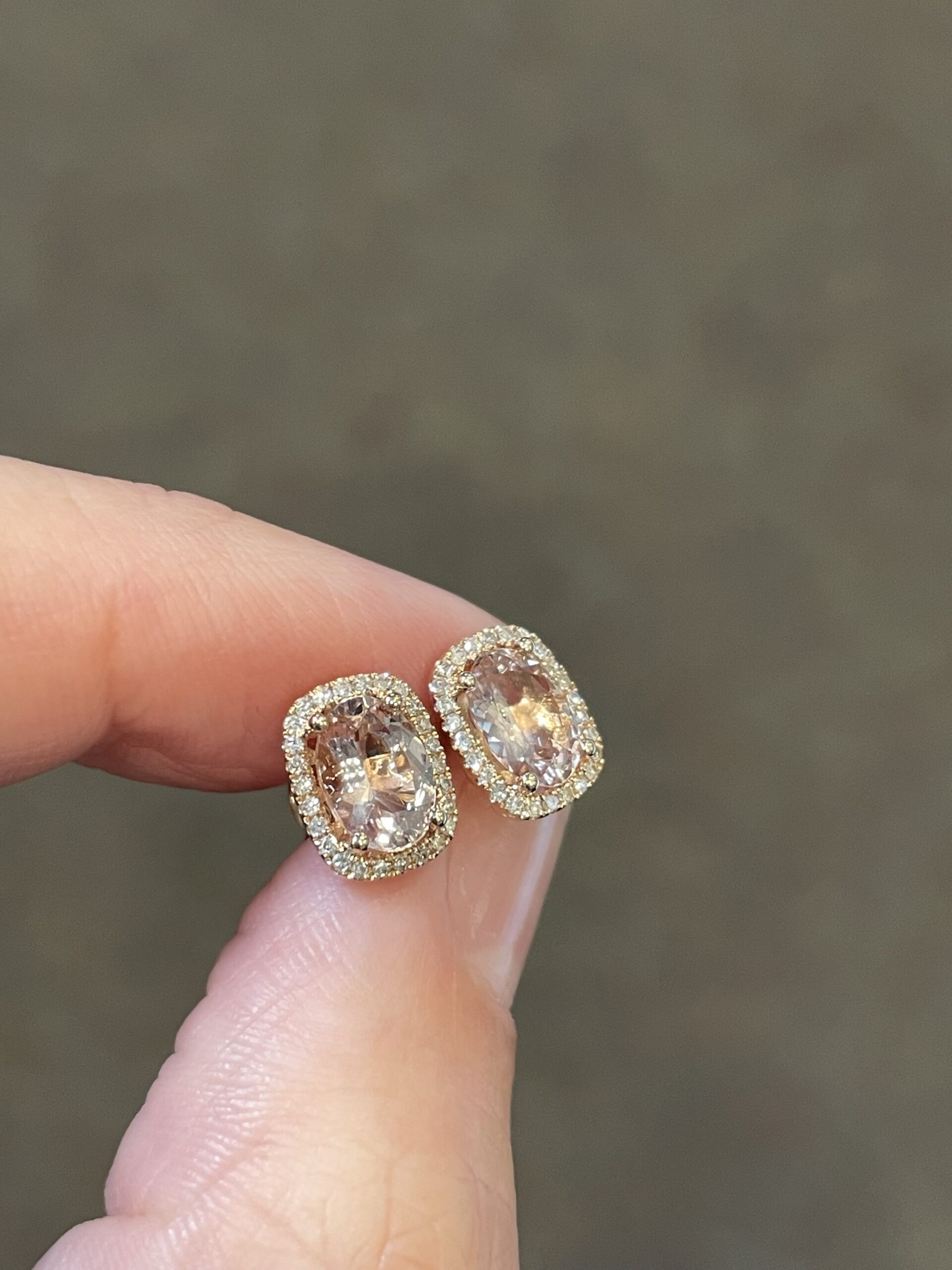14k rose gold genuine cushion cut, faceted, 1.31 Cttw Morganite & .13 Cttw genuine Round Brilliant Cut diamond halo stud earrings. These diamonds average H-I in color and SI in clarity.