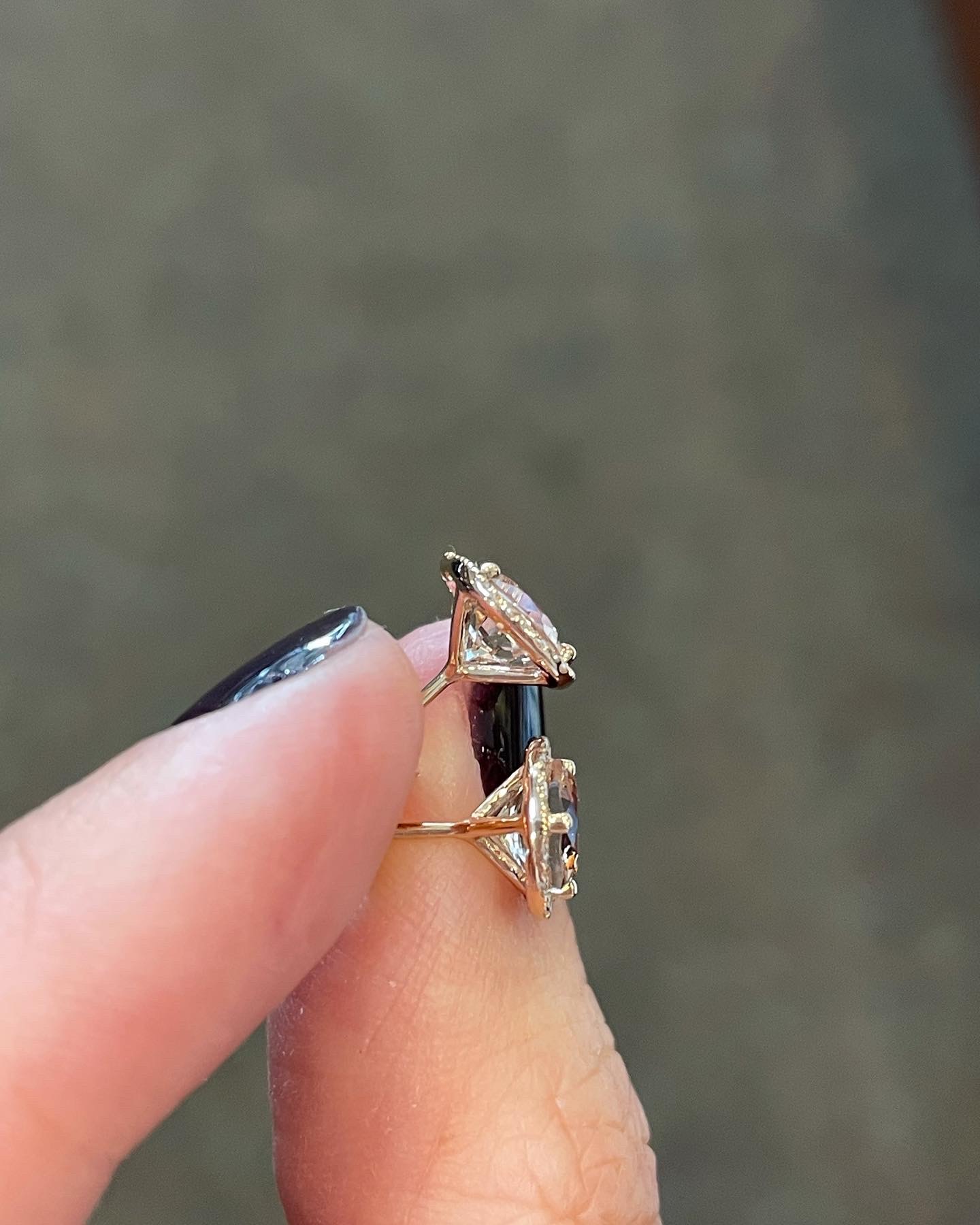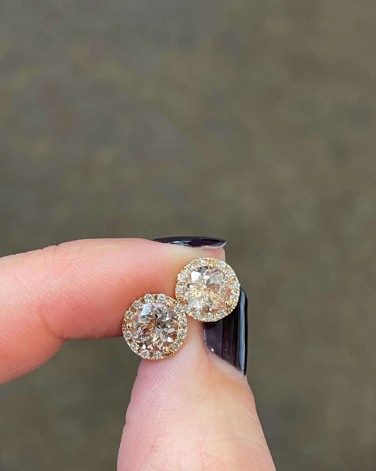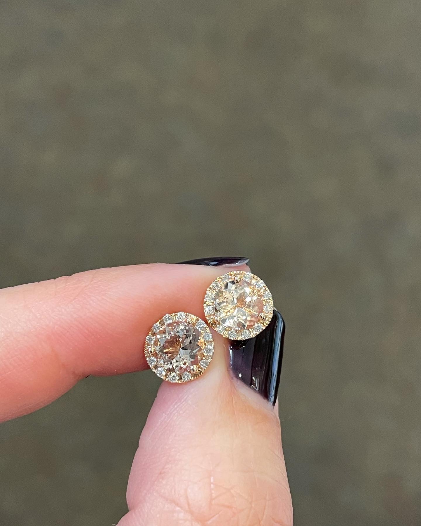 14k rose gold round, faceted, genuine 1.40 Cttw genuine Morganite & .16 Cttw genuine Round Brilliant Cut diamond halo stud earrings. These diamonds average H-I in color and SI in clarity.