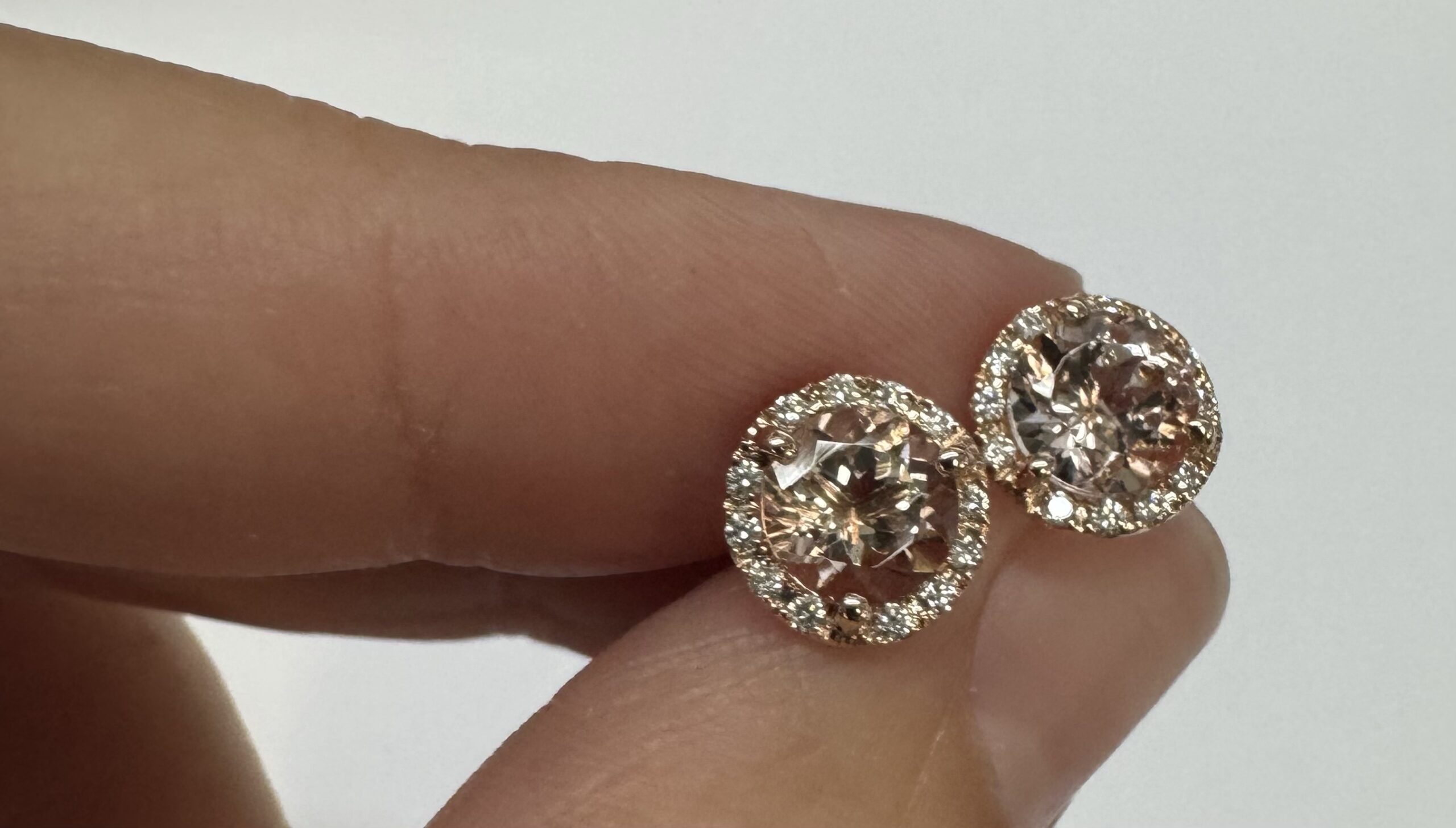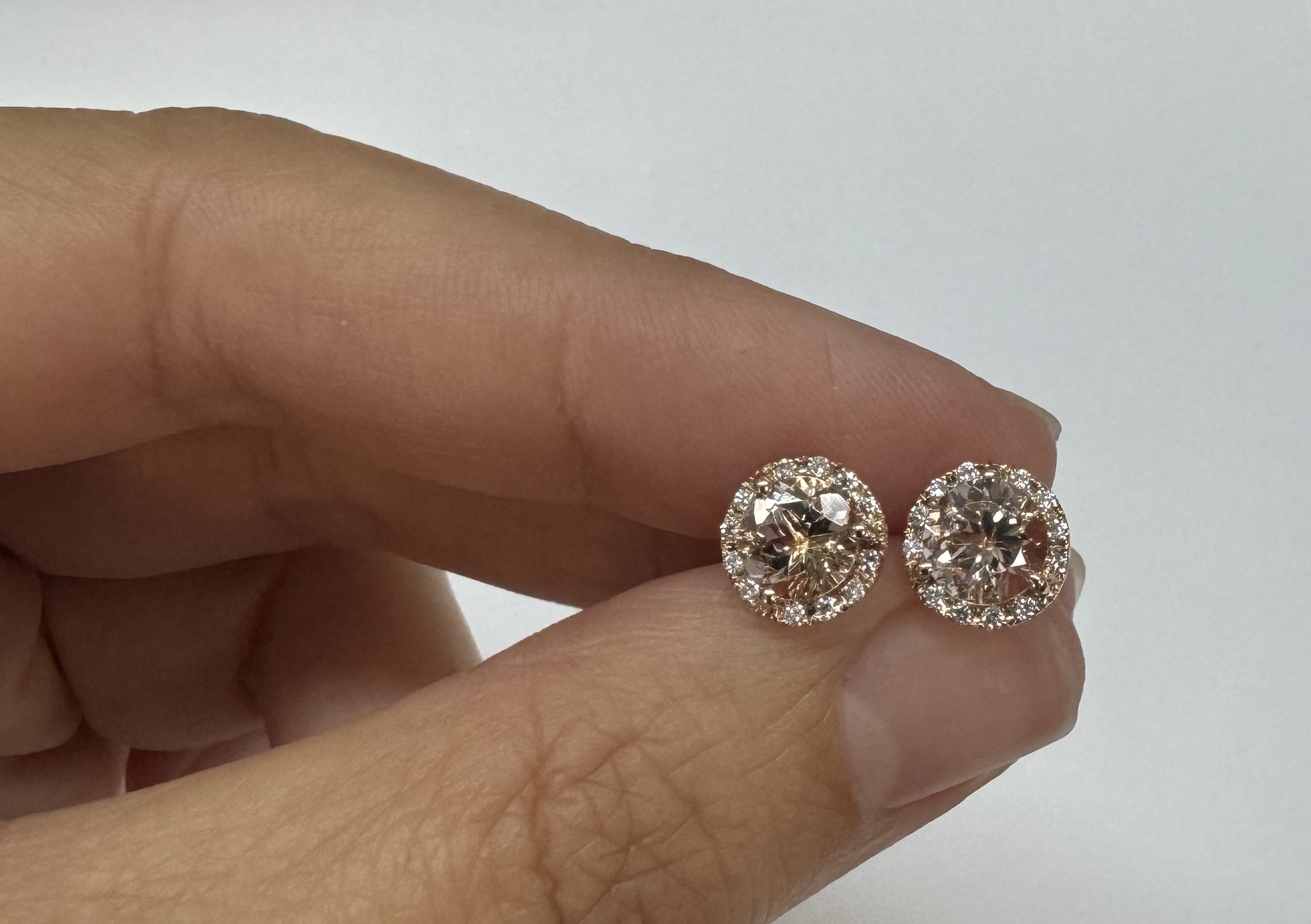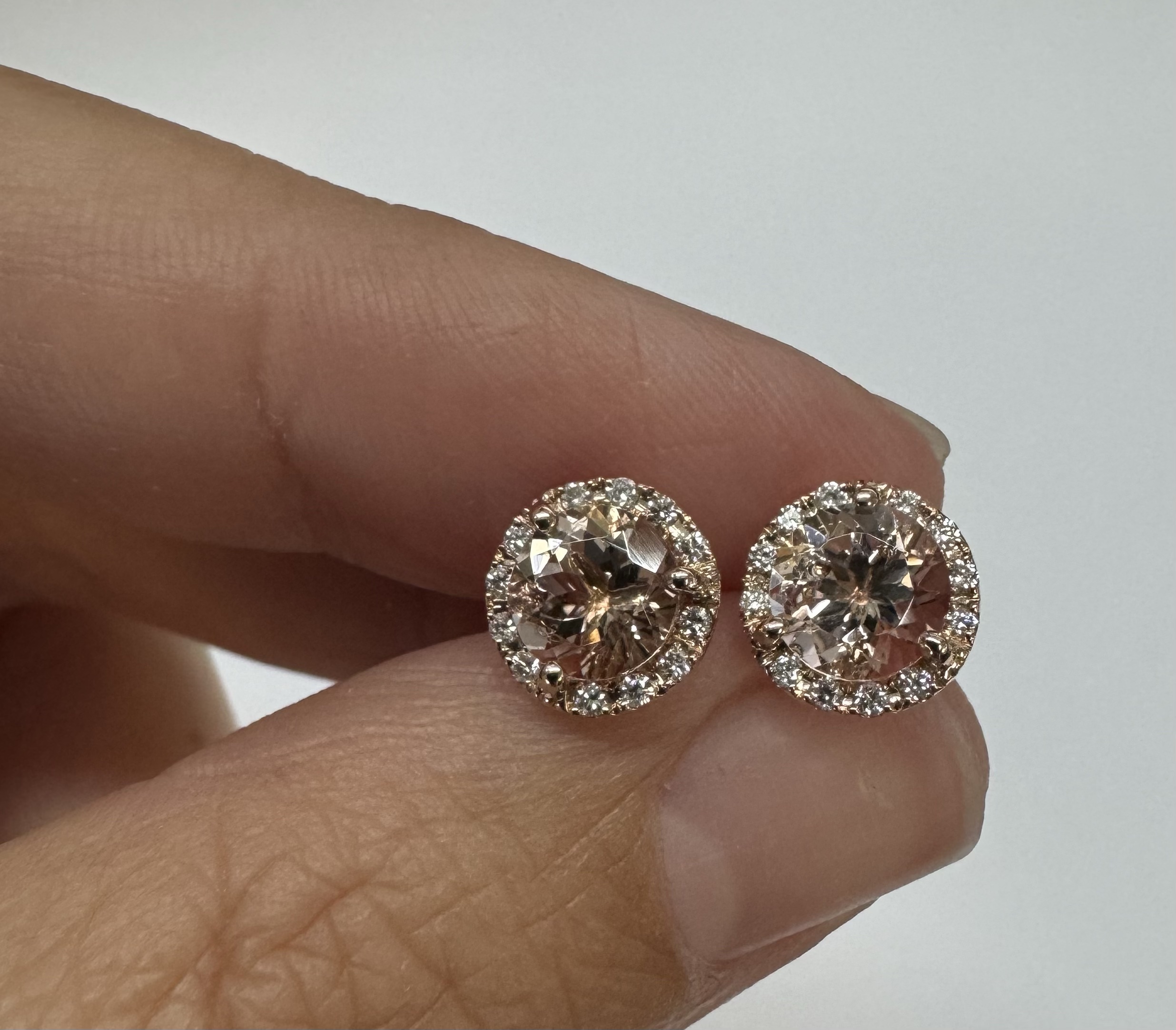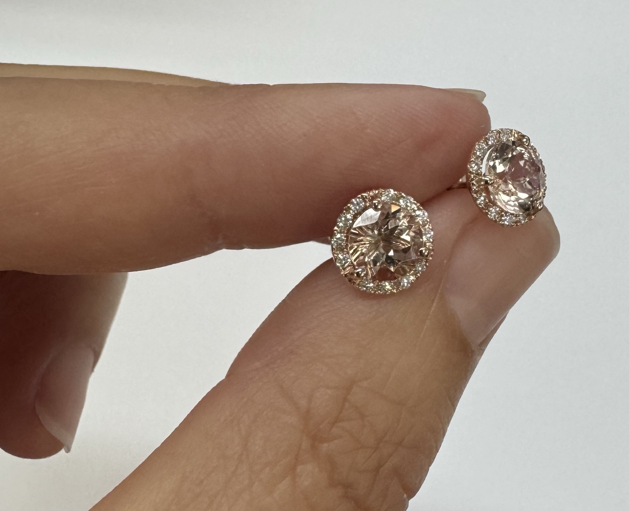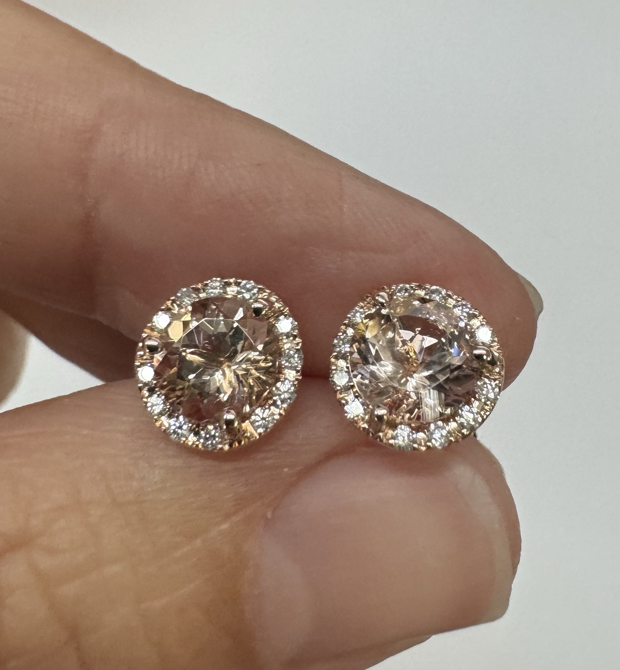 14k rose gold genuine round, faceted 1.58 cttw Morganite & .14 cttw genuine Round Brilliant Cut diamond halo stud earrings. These diamonds average G-H in color, and SI1 in clarity. These earrings have an entire weight of 1.4 grams.