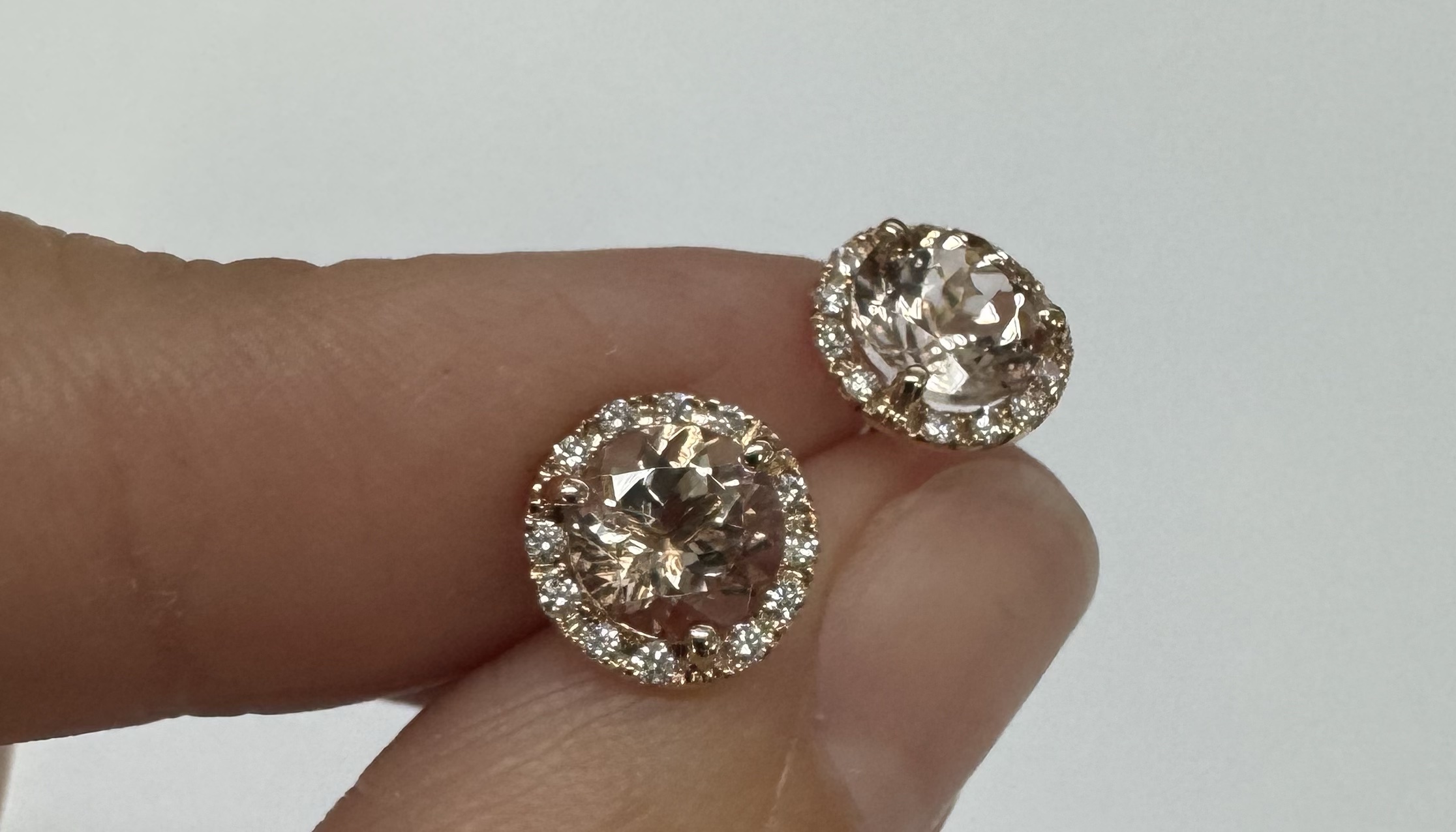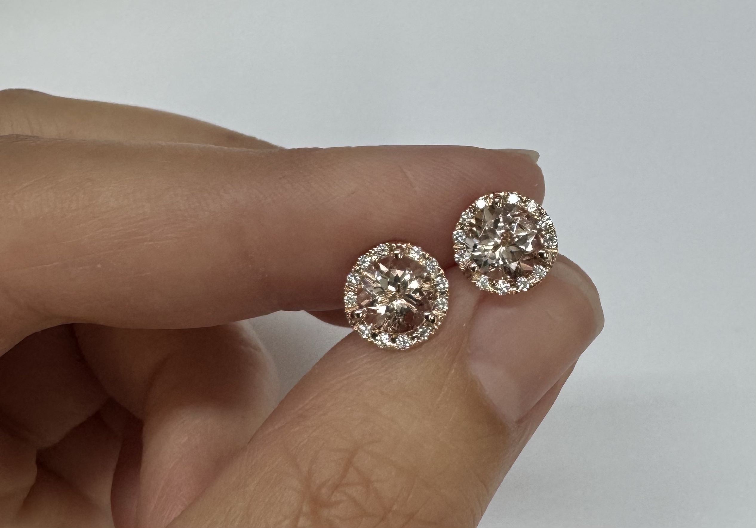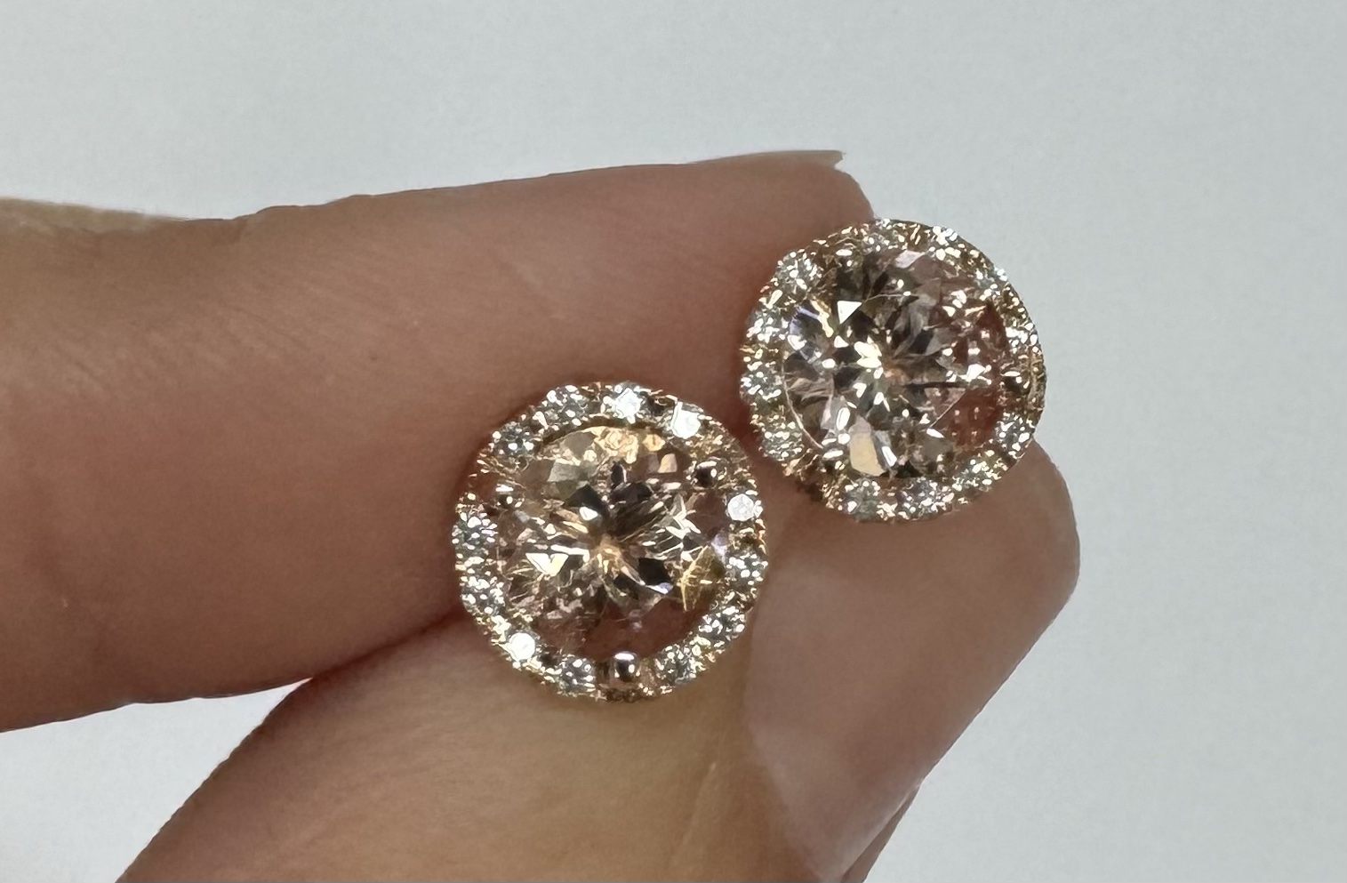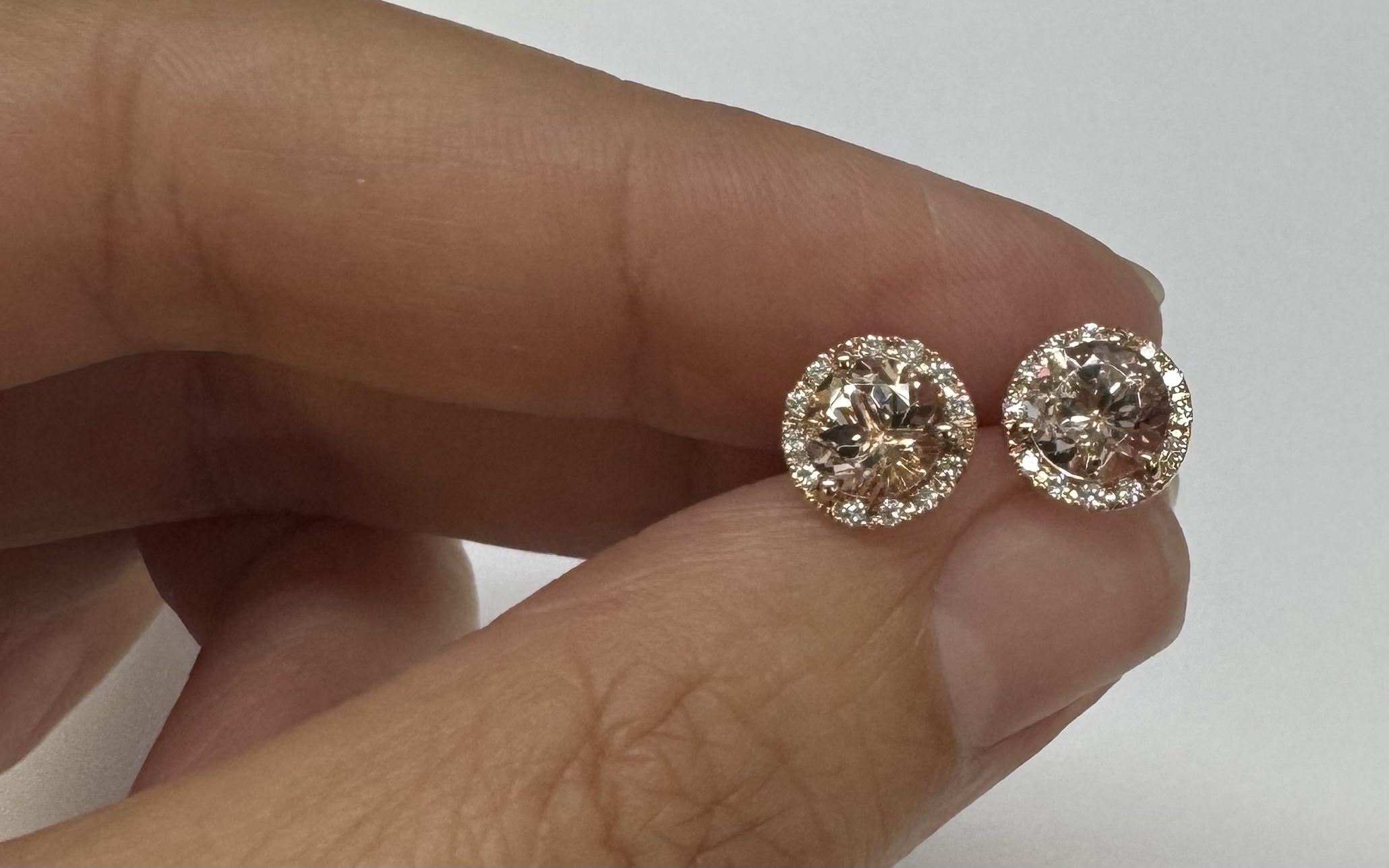 14k rose gold genuine round, faceted 1.58 cttw Morganite & .14 cttw genuine Round Brilliant Cut diamond halo stud earrings. These diamonds average G-H in color, and SI1 in clarity. These earrings have an entire weight of 1.4 grams.