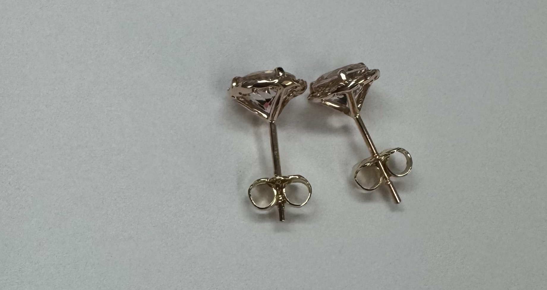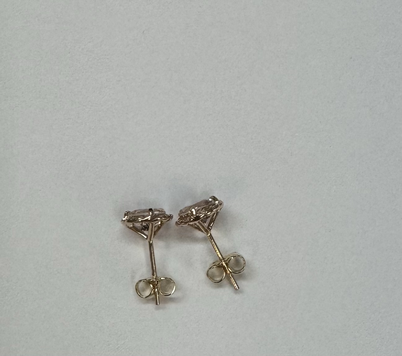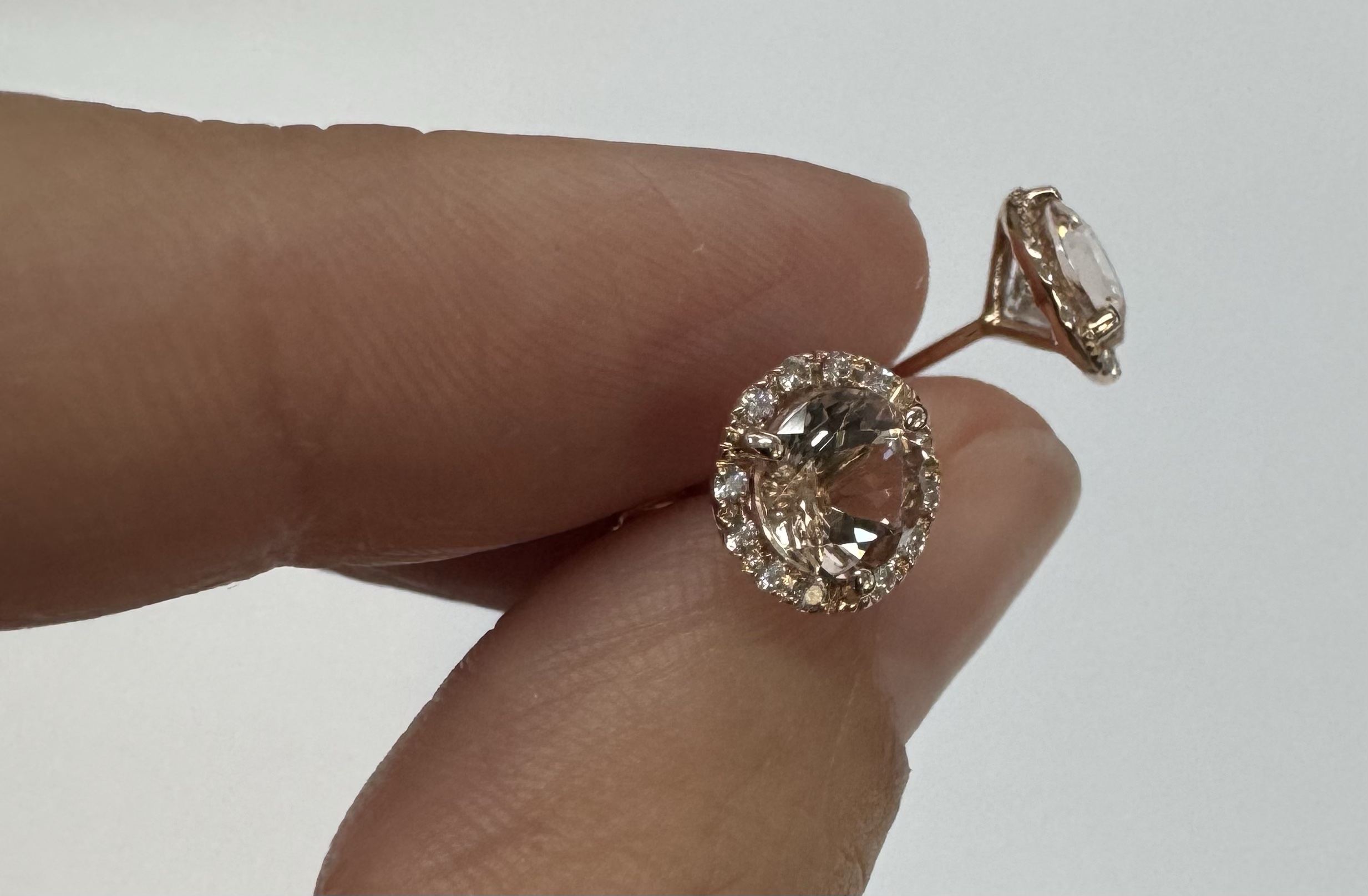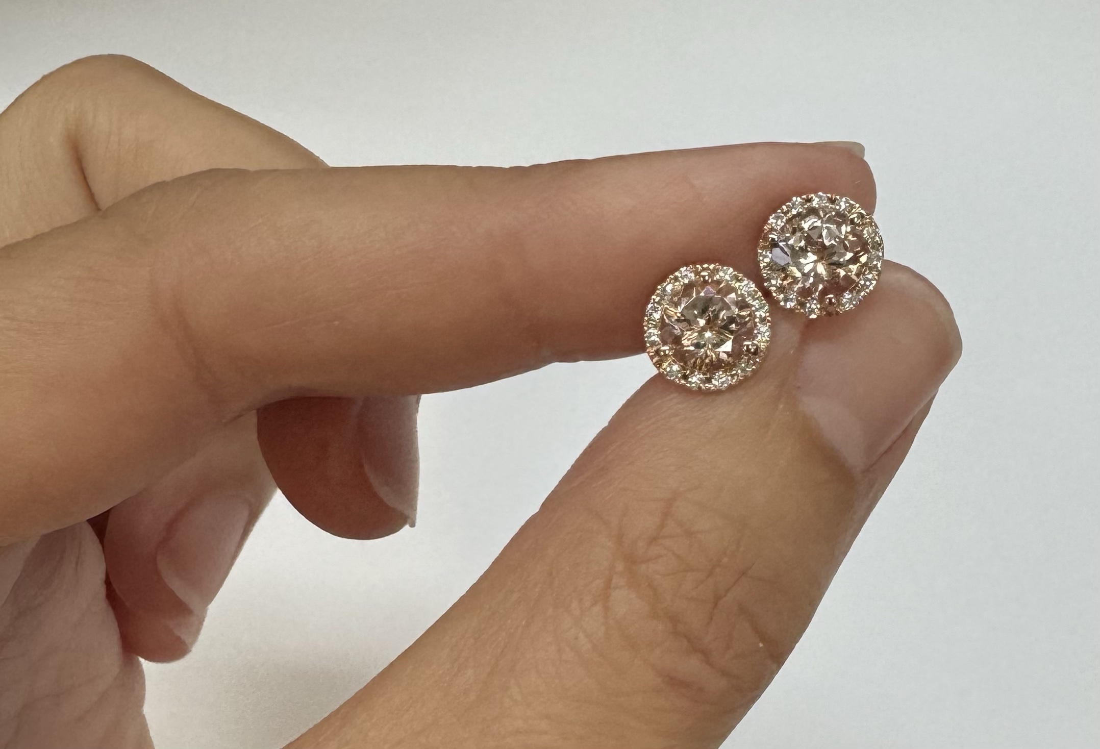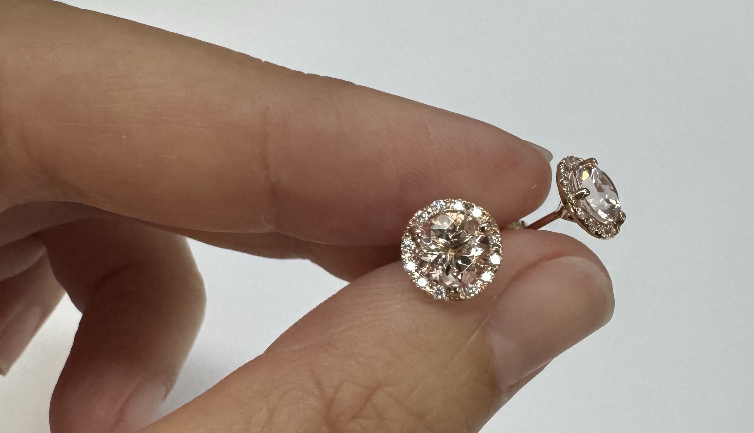14k rose gold genuine round, faceted 1.58 cttw Morganite & .14 cttw genuine Round Brilliant Cut diamond halo stud earrings. These diamonds average G-H in color, and SI1 in clarity. These earrings have an entire weight of 1.4 grams.