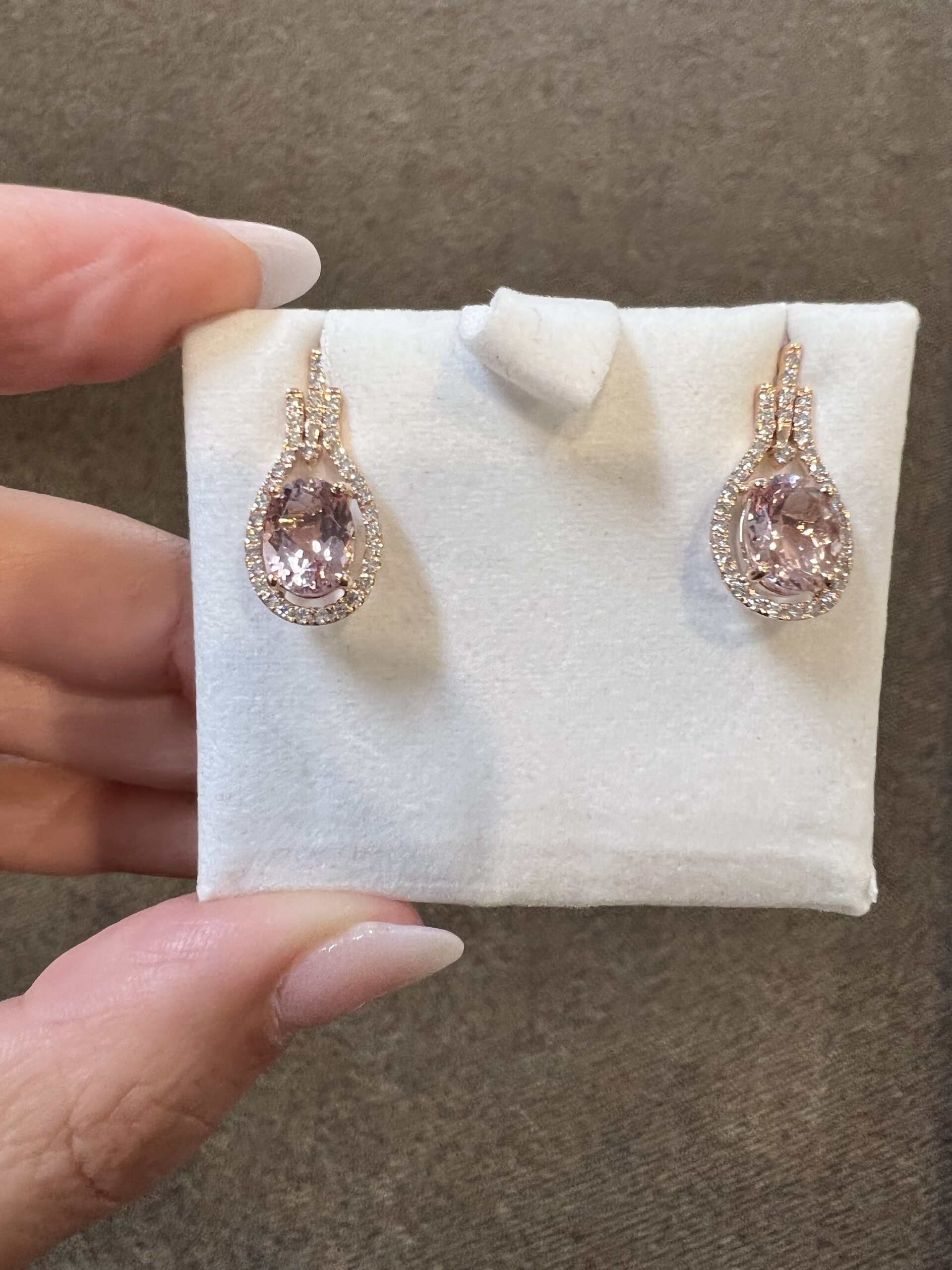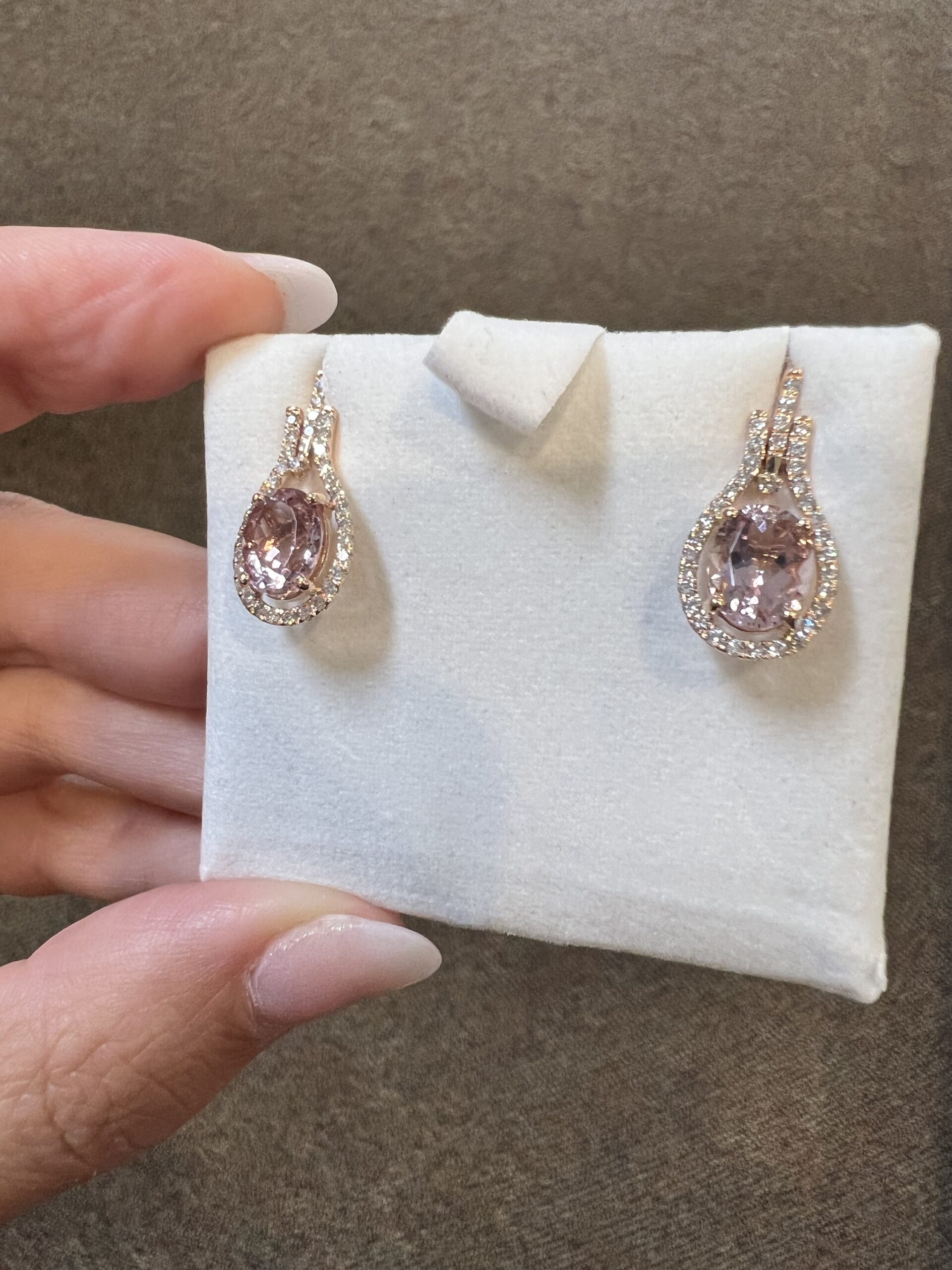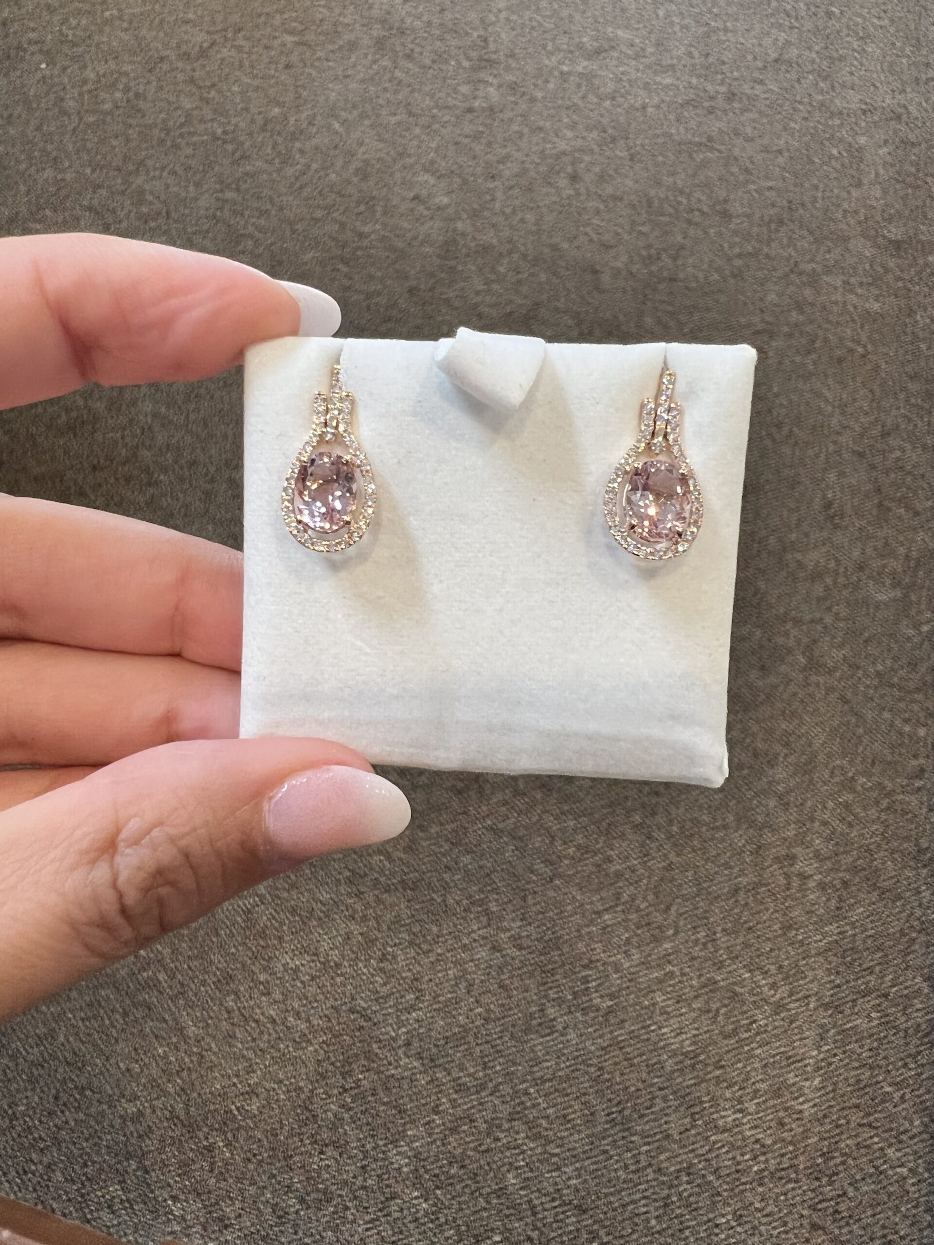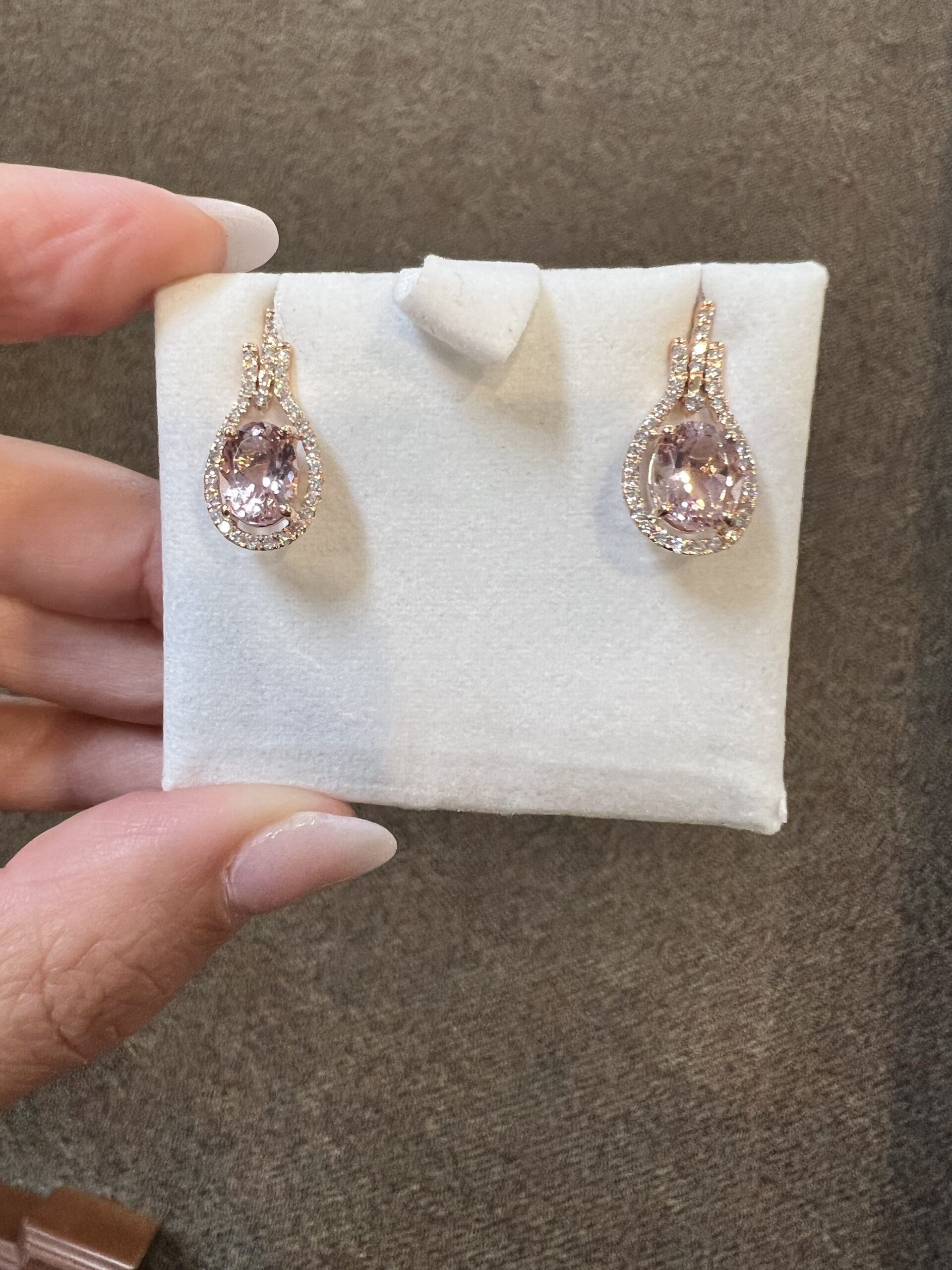 14k rose gold genuine oval shaped, faceted 2.70 Cttw Morganite & genuine .43 Cttw Round Brilliant Cut diamond halo dangle stud earrings. These diamonds average G-H in color and SI2 in clarity. These gemstones are all nicely proportioned and well finished. These earrings have an entire weight of 3.6 grams.