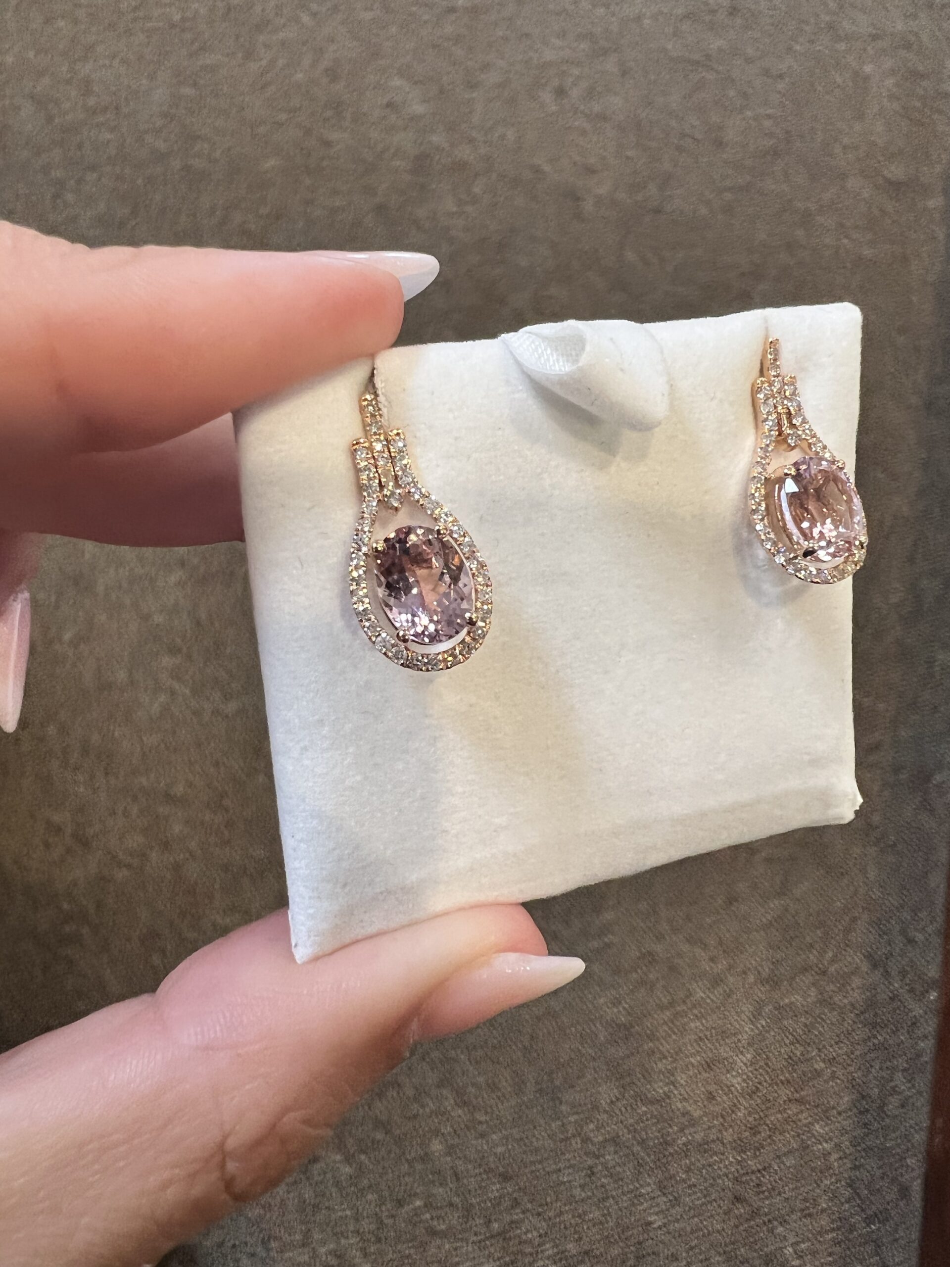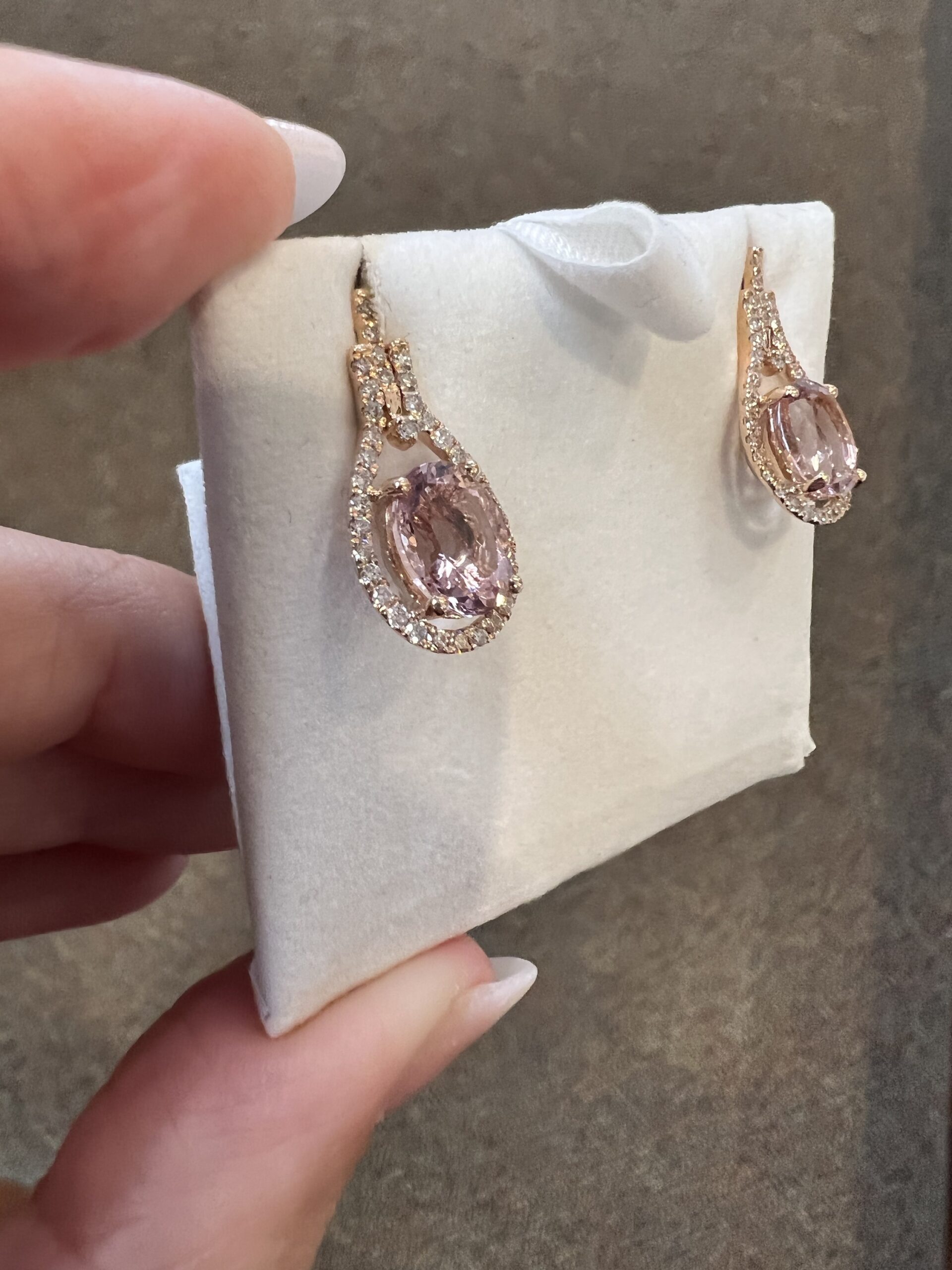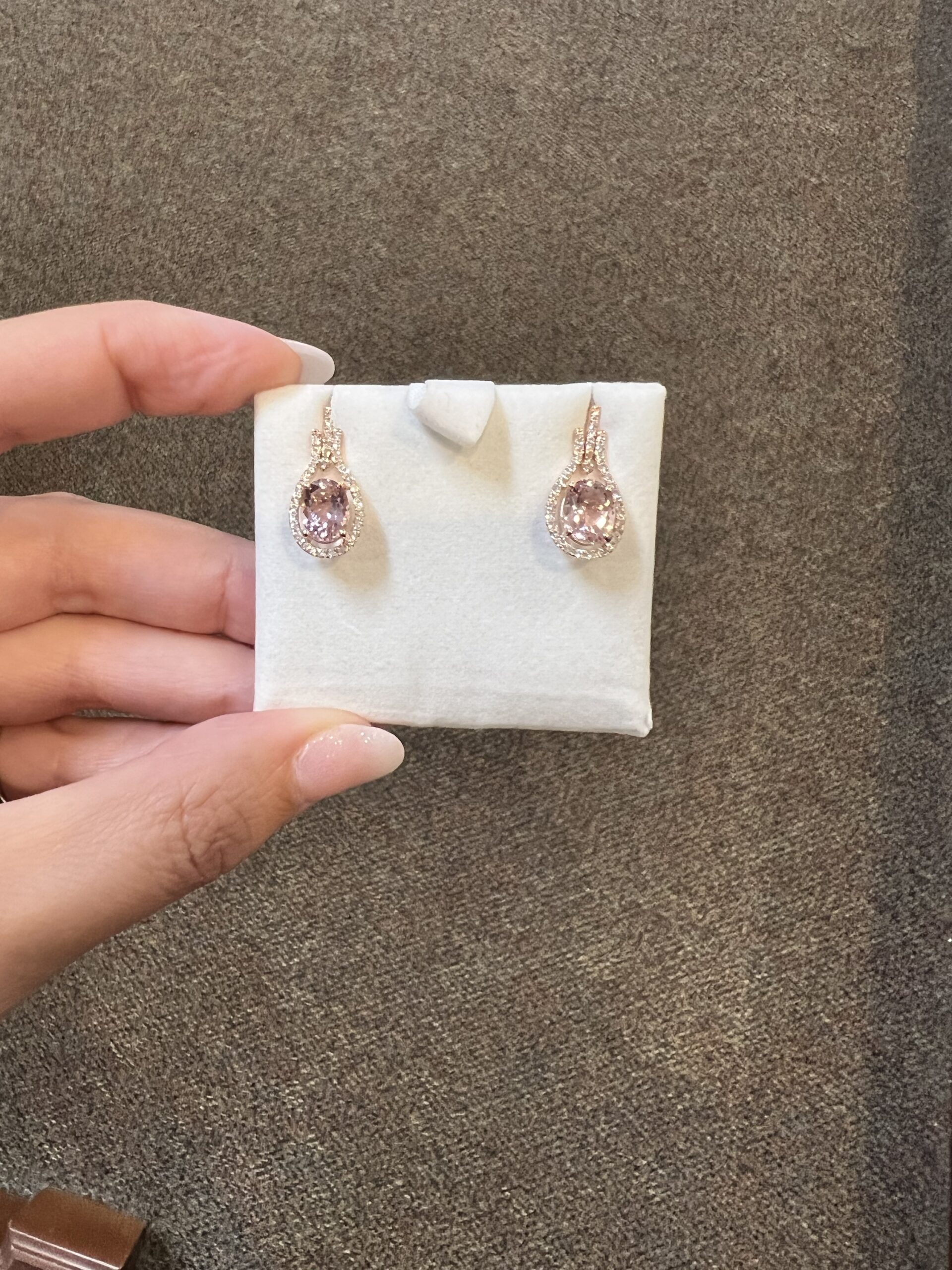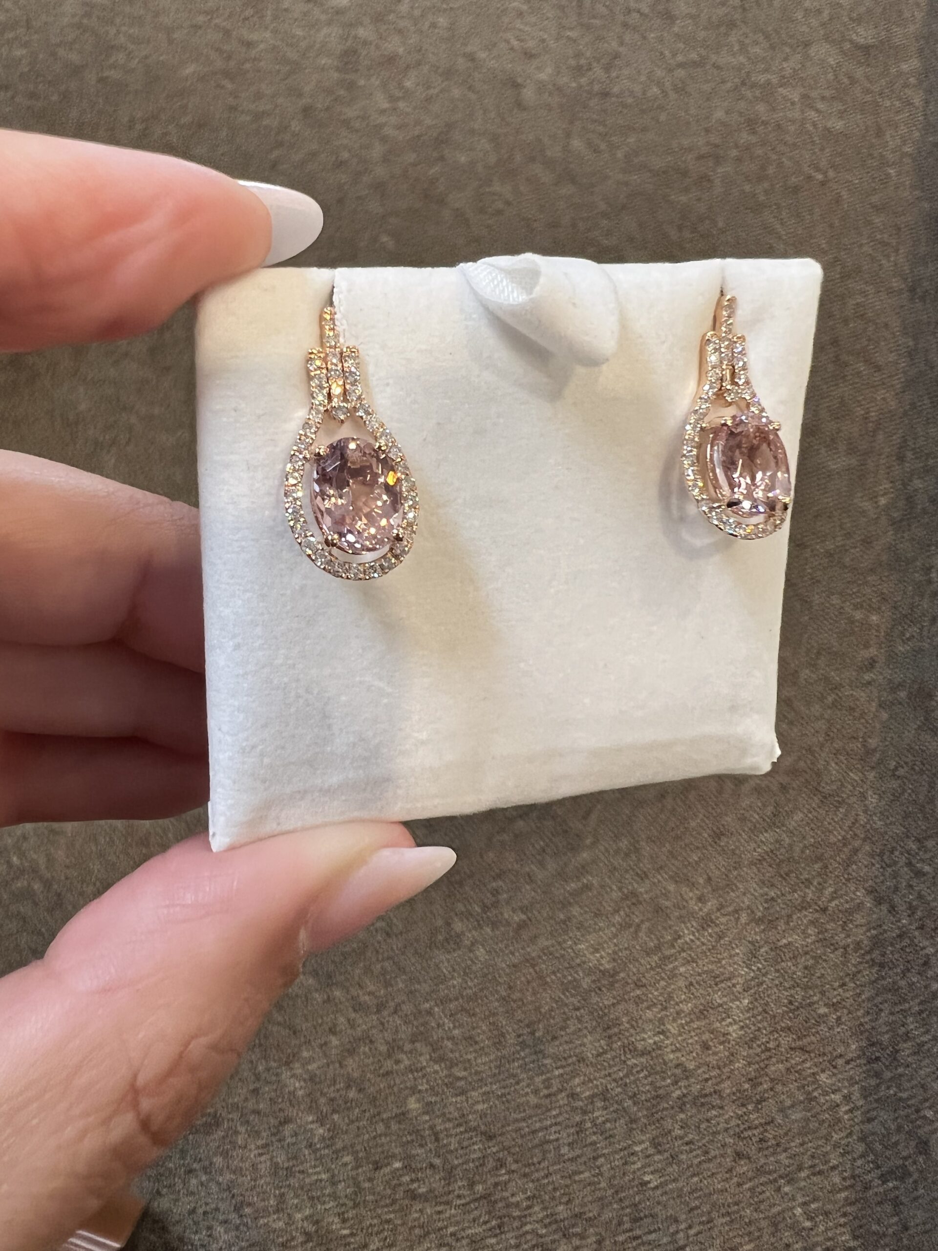 14k rose gold genuine oval shaped, faceted 2.70 Cttw Morganite & genuine .43 Cttw Round Brilliant Cut diamond halo dangle stud earrings. These diamonds average G-H in color and SI2 in clarity. These gemstones are all nicely proportioned and well finished. These earrings have an entire weight of 3.6 grams.