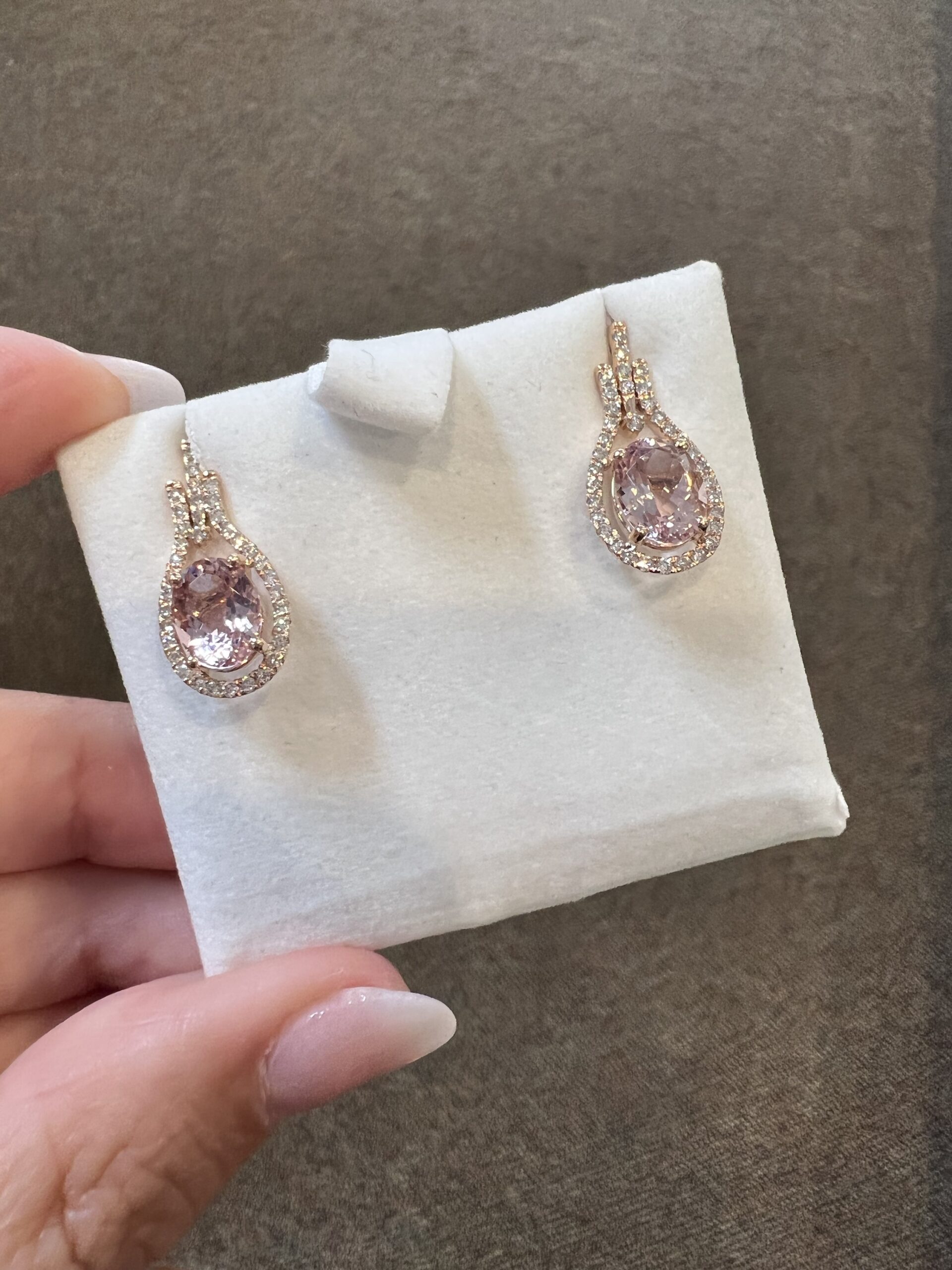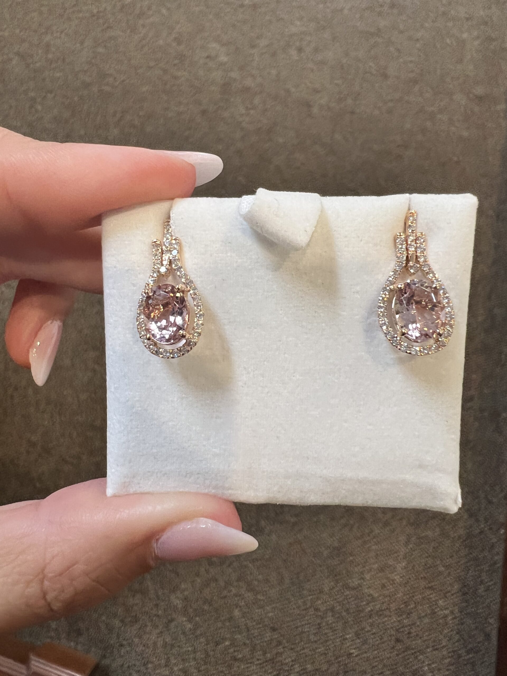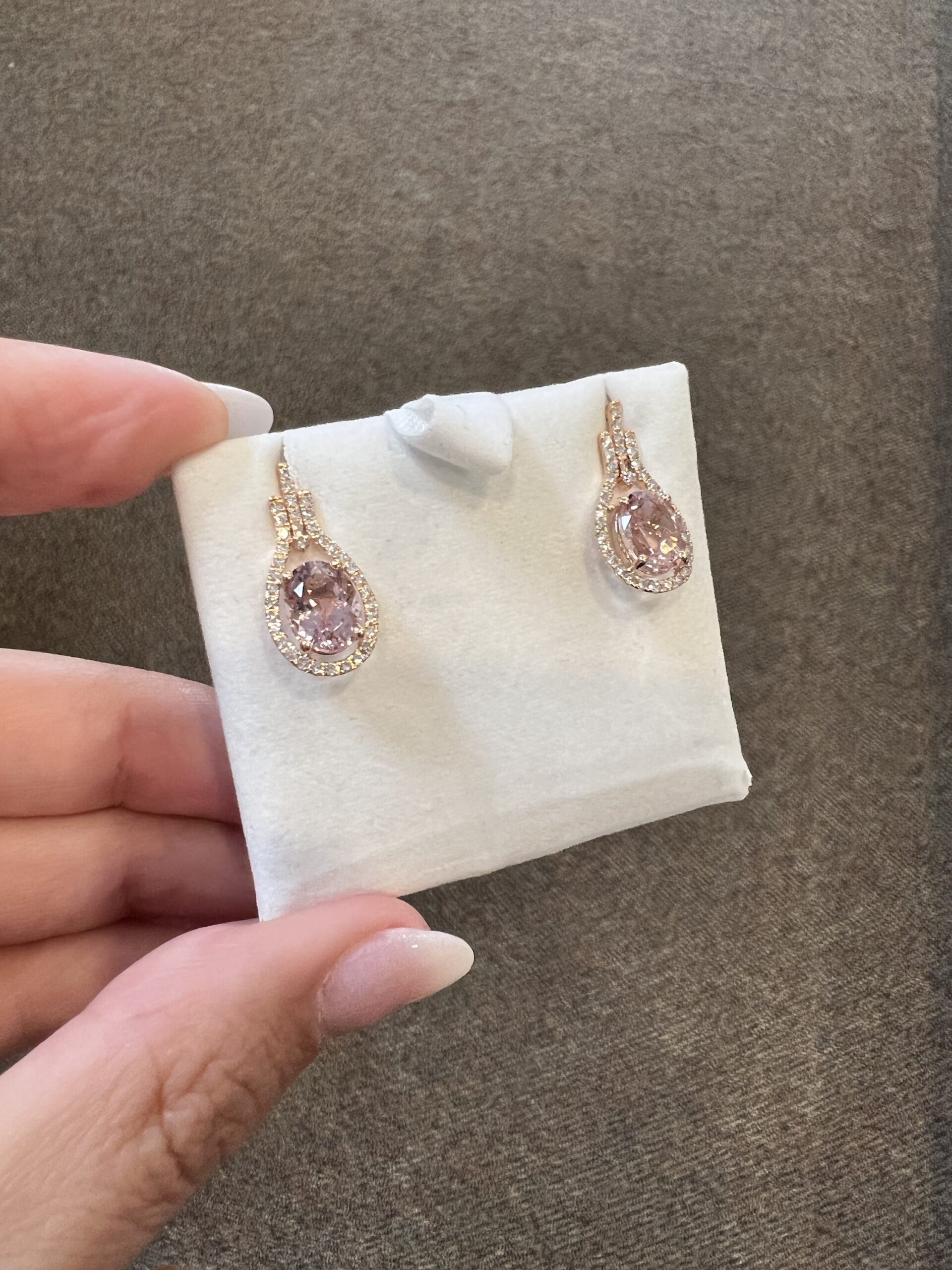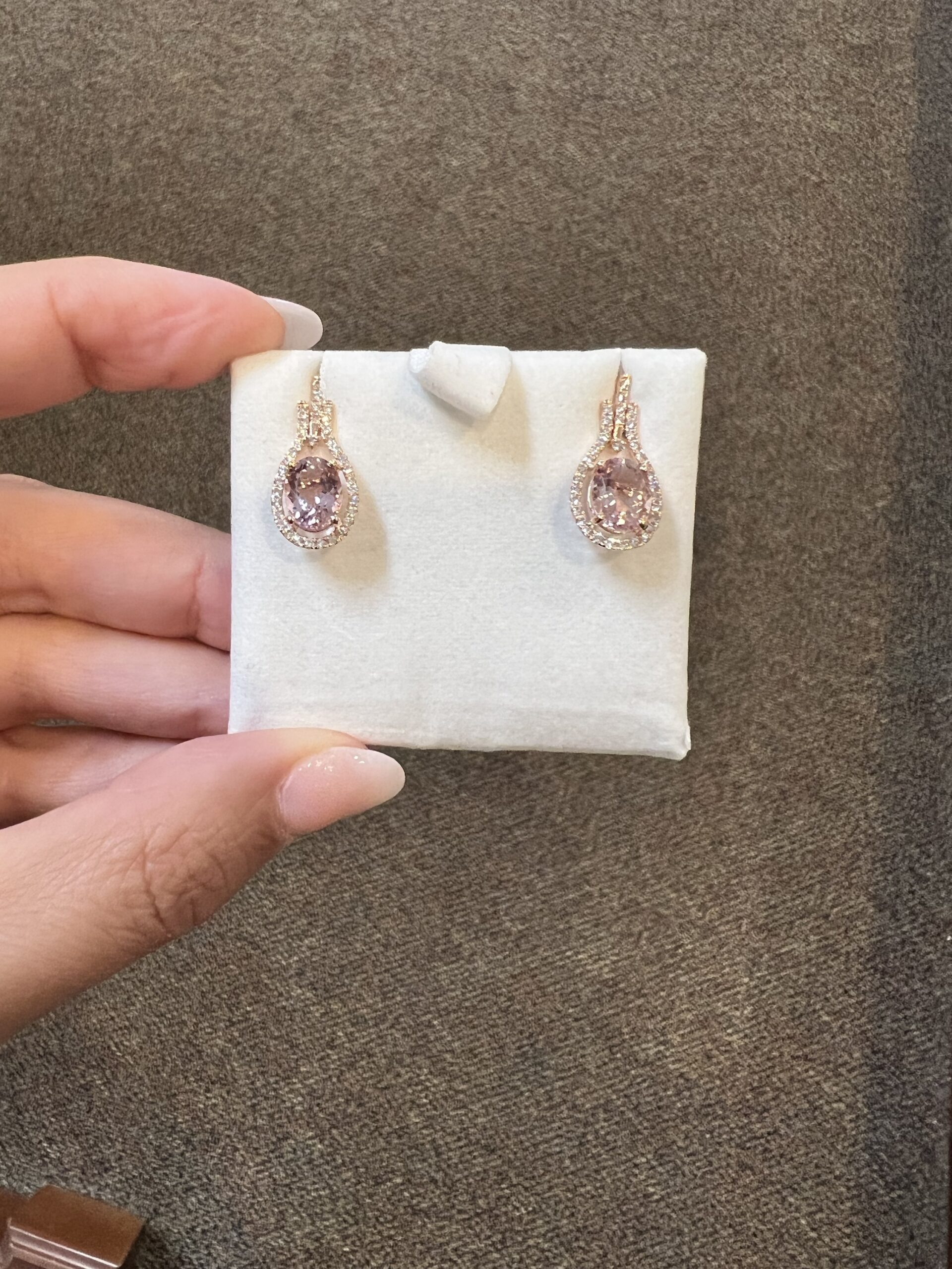 14k rose gold genuine oval shaped, faceted 2.70 Cttw Morganite & genuine .43 Cttw Round Brilliant Cut diamond halo dangle stud earrings. These diamonds average G-H in color and SI2 in clarity. These gemstones are all nicely proportioned and well finished. These earrings have an entire weight of 3.6 grams.