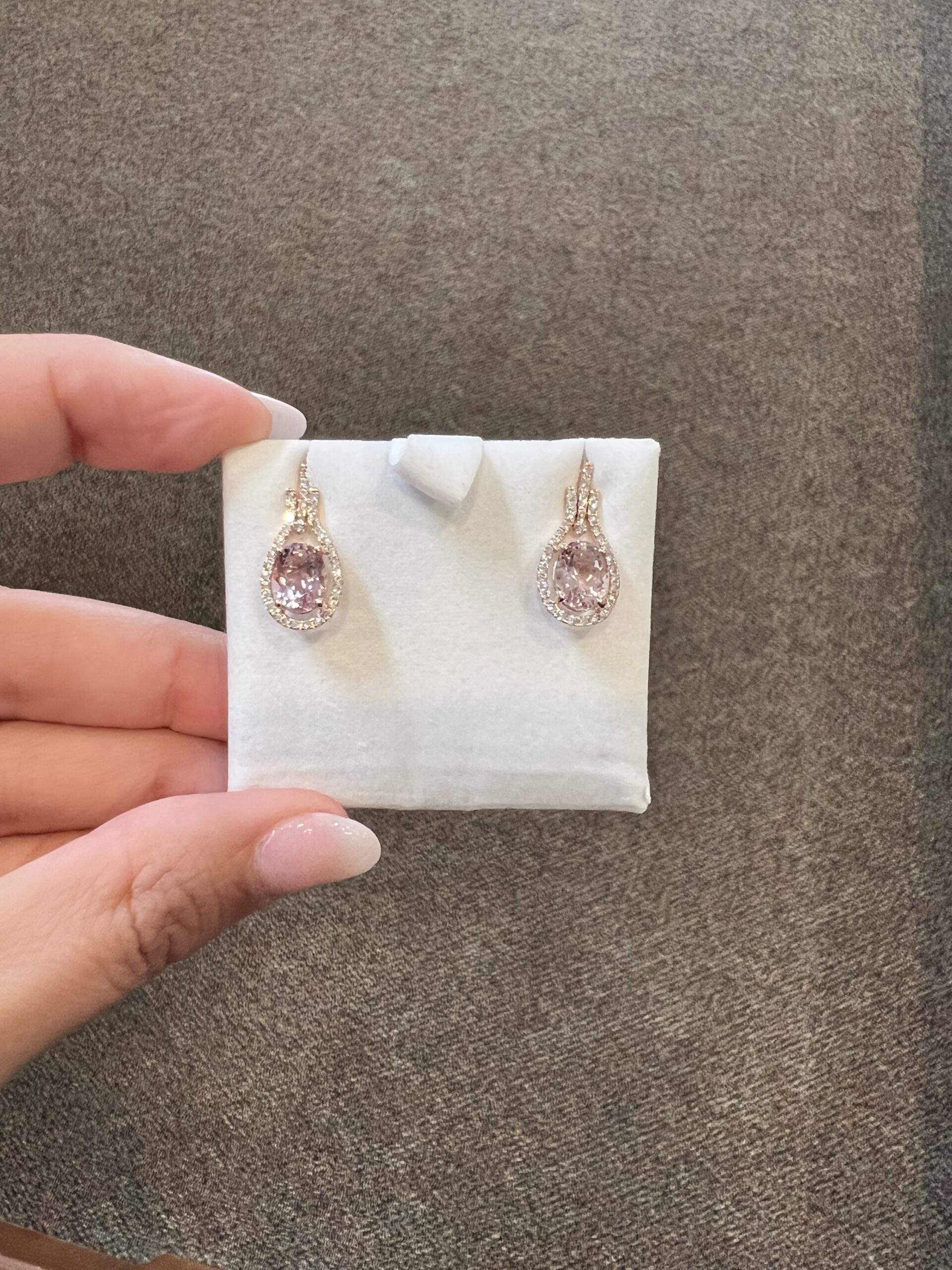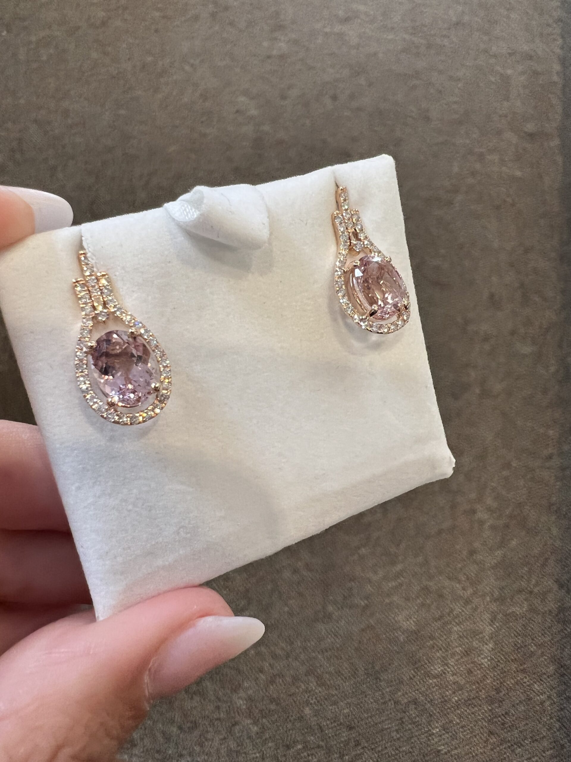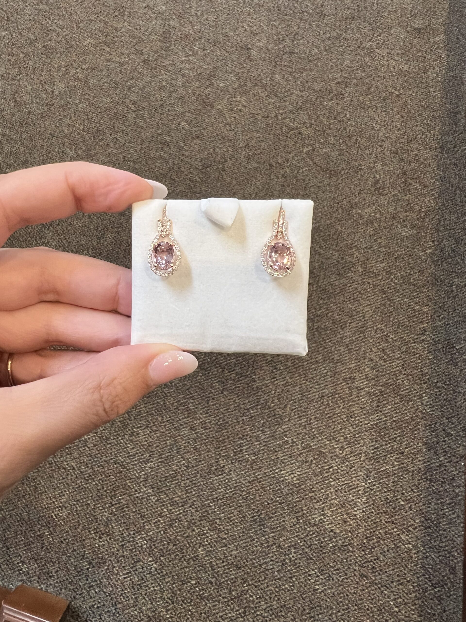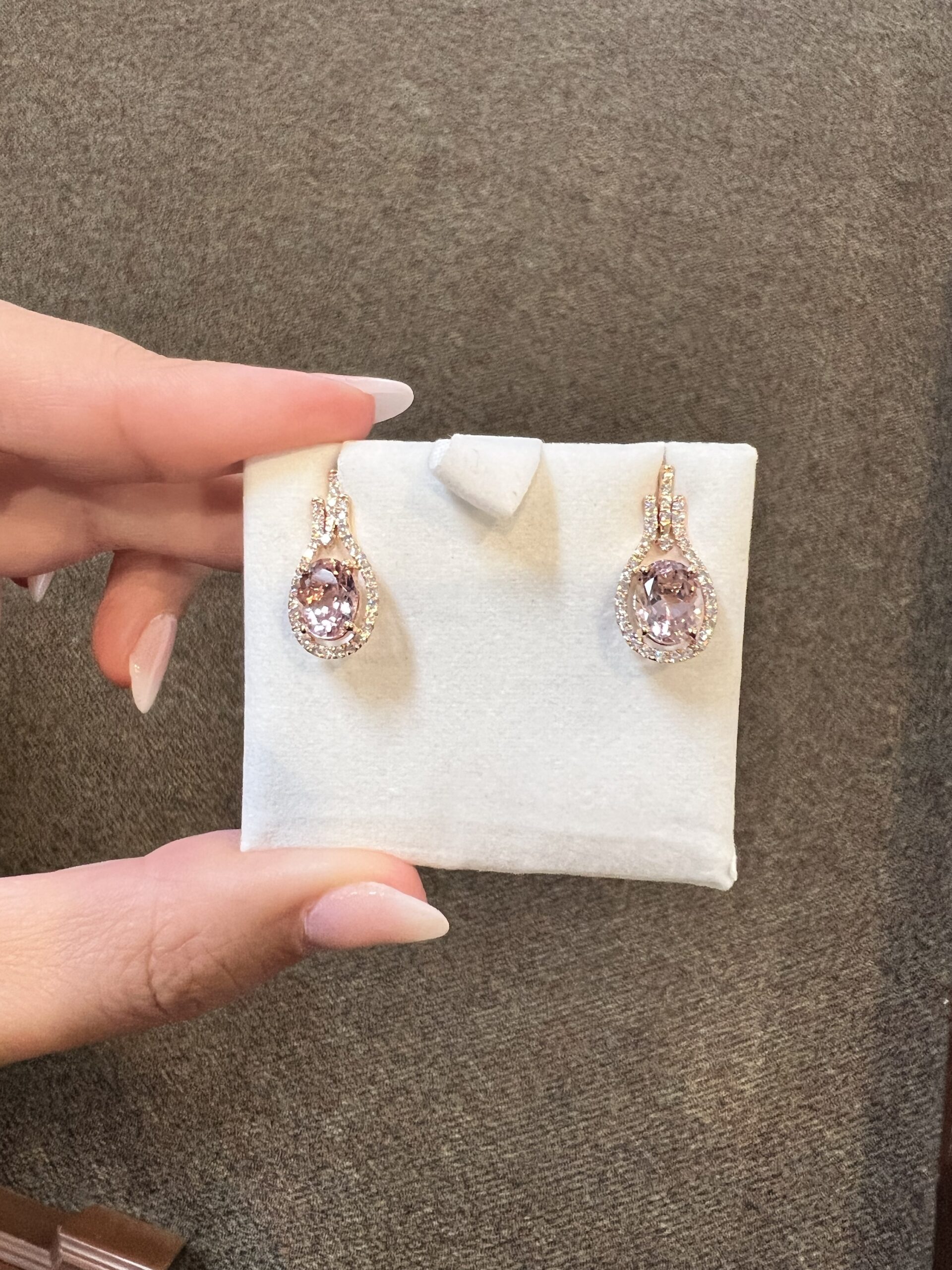 14k rose gold genuine oval shaped, faceted 2.70 Cttw Morganite & genuine .43 Cttw Round Brilliant Cut diamond halo dangle stud earrings. These diamonds average G-H in color and SI2 in clarity. These gemstones are all nicely proportioned and well finished. These earrings have an entire weight of 3.6 grams.