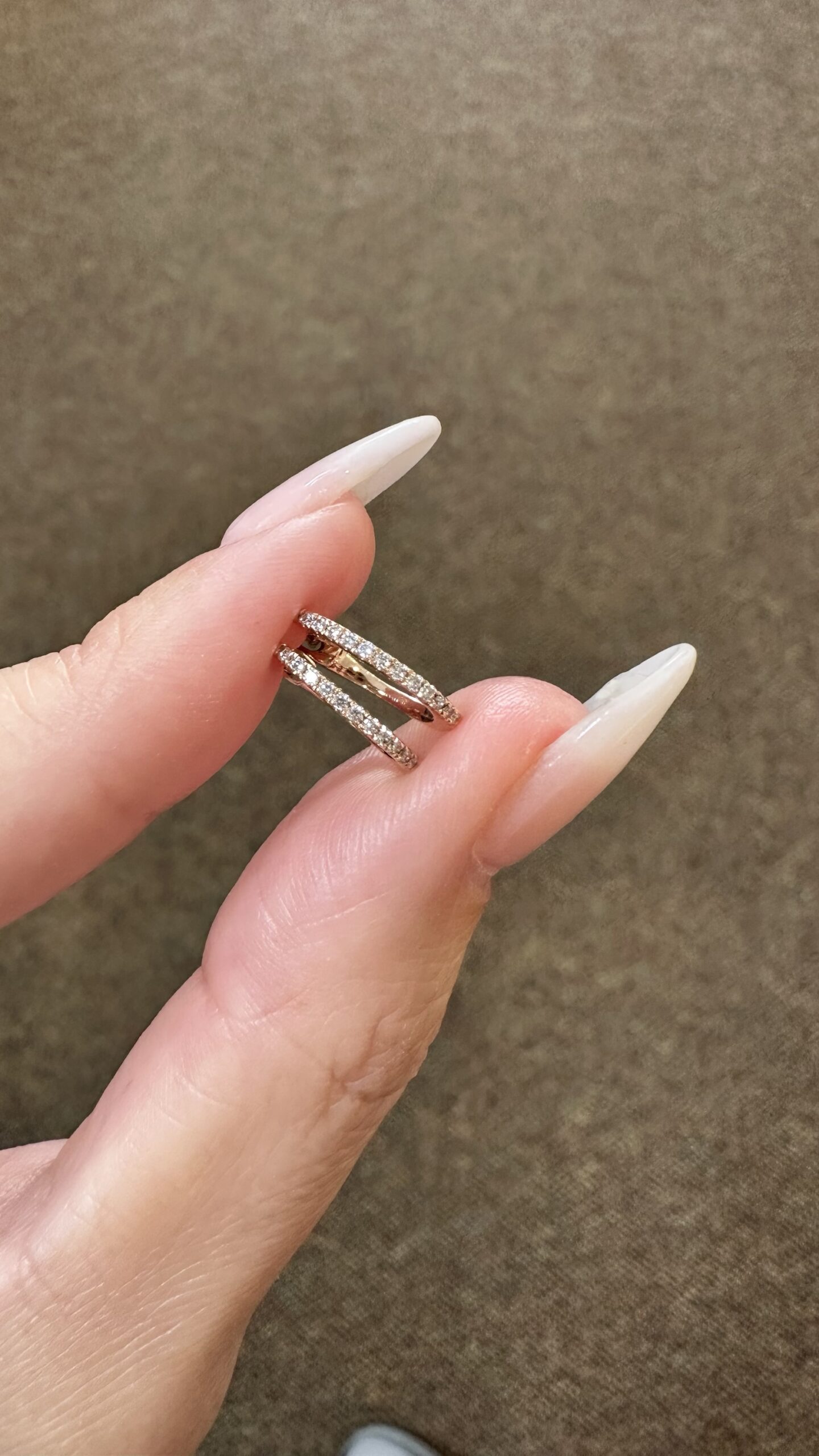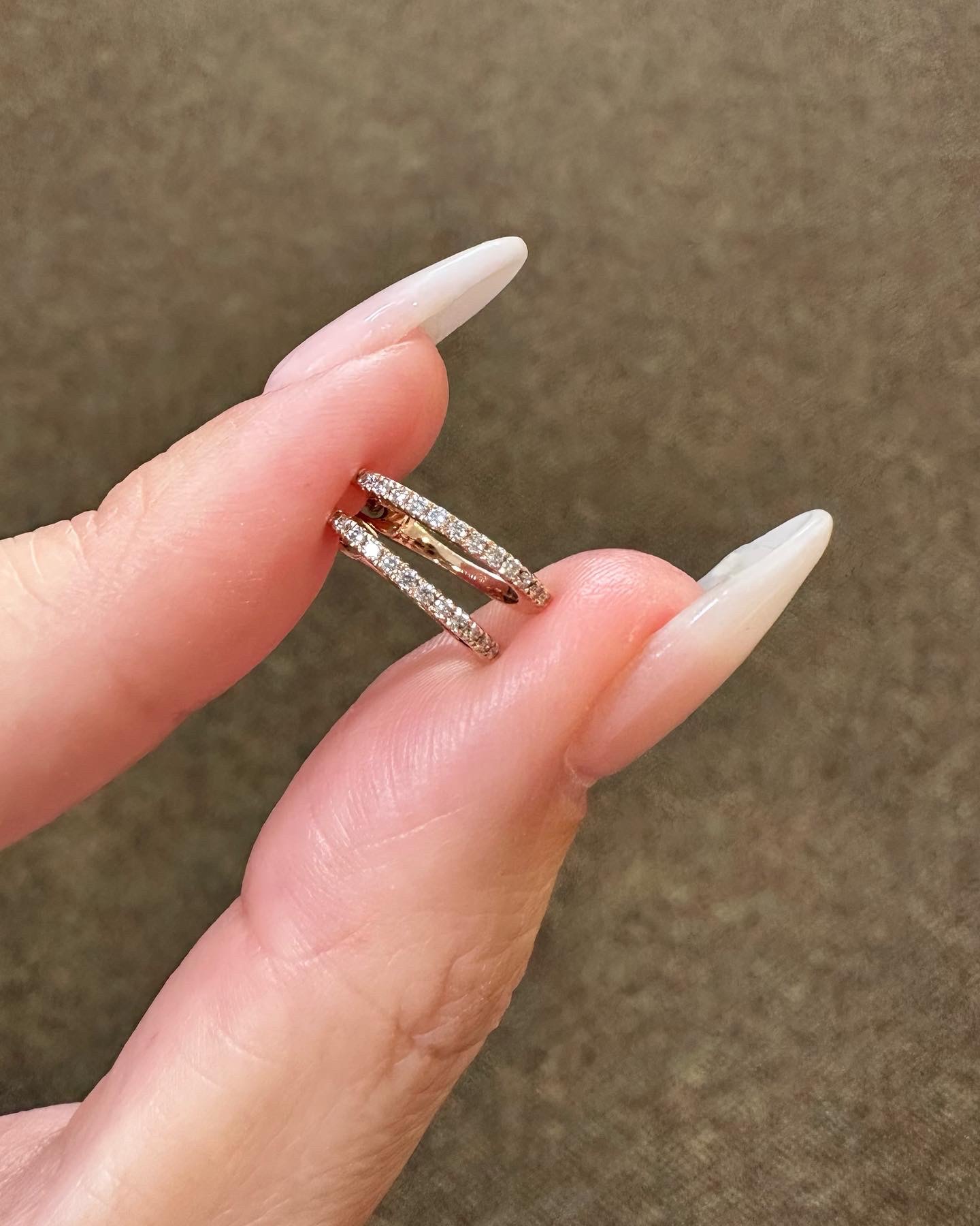 14k rose gold genuine .09 genuine Round Brilliant Cut diamond huggy hoops. These diamonds average G-H in color and SI in clarity. These earrings have an entire weight of 1.4 grams. These earrings measure 1.5 x 12 mm in size.