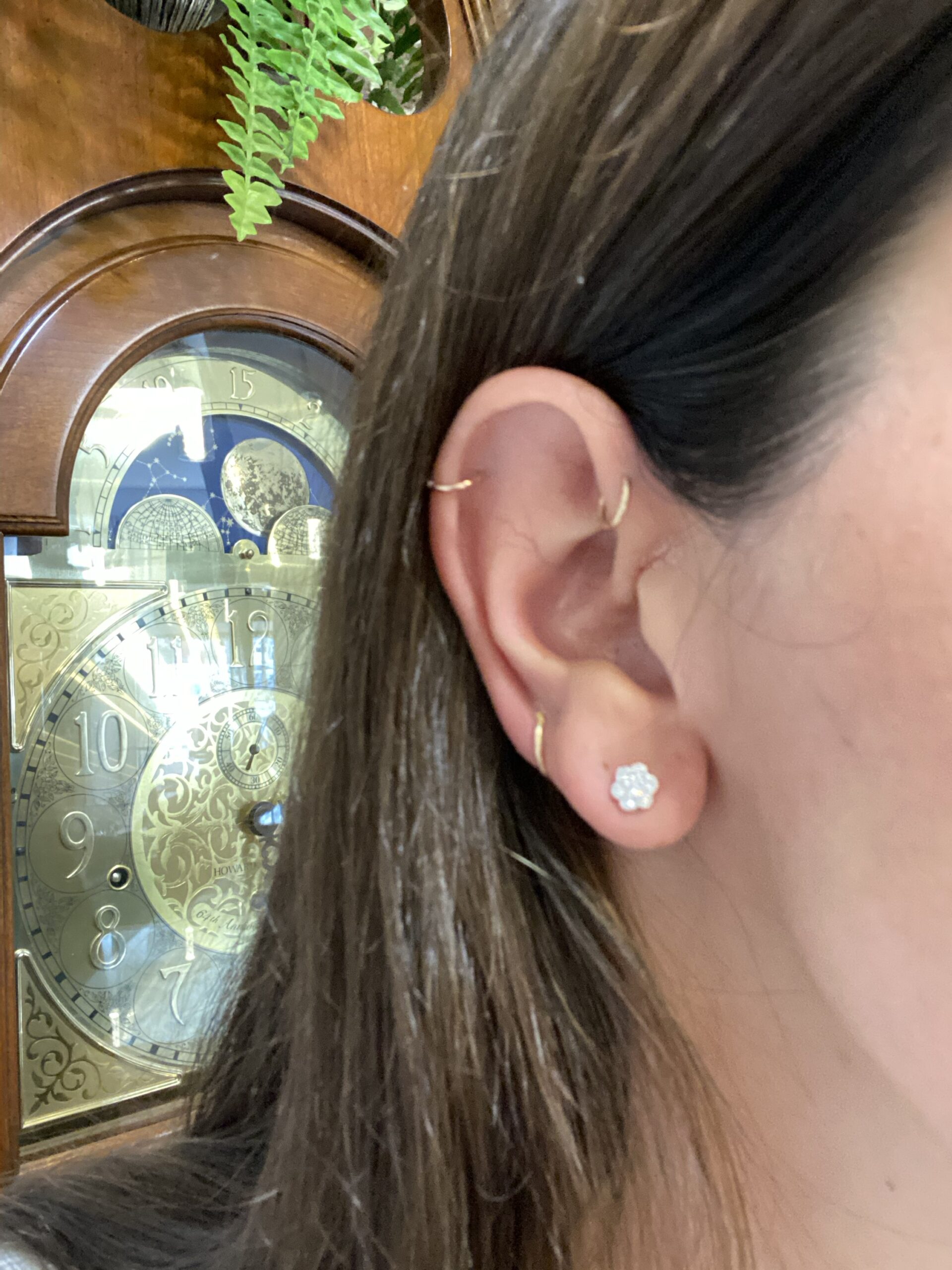 14k white gold genuine 1/4 cttw Round Brilliant Cut diamond flower cluster 6 mm stud earrings. These earrings have an entire weight of 1.3 grams. The diamonds are enhanced with mill grain borders.