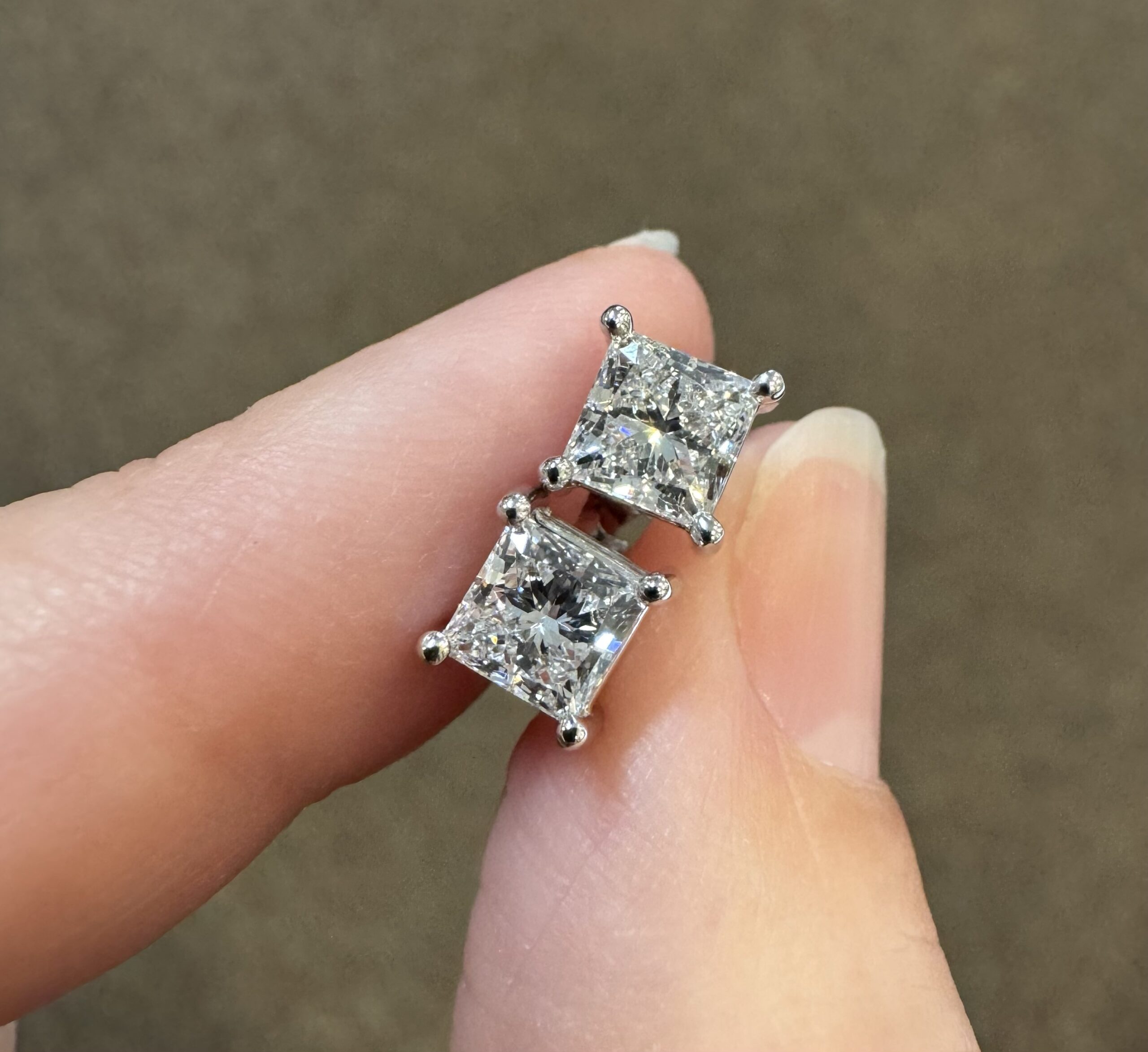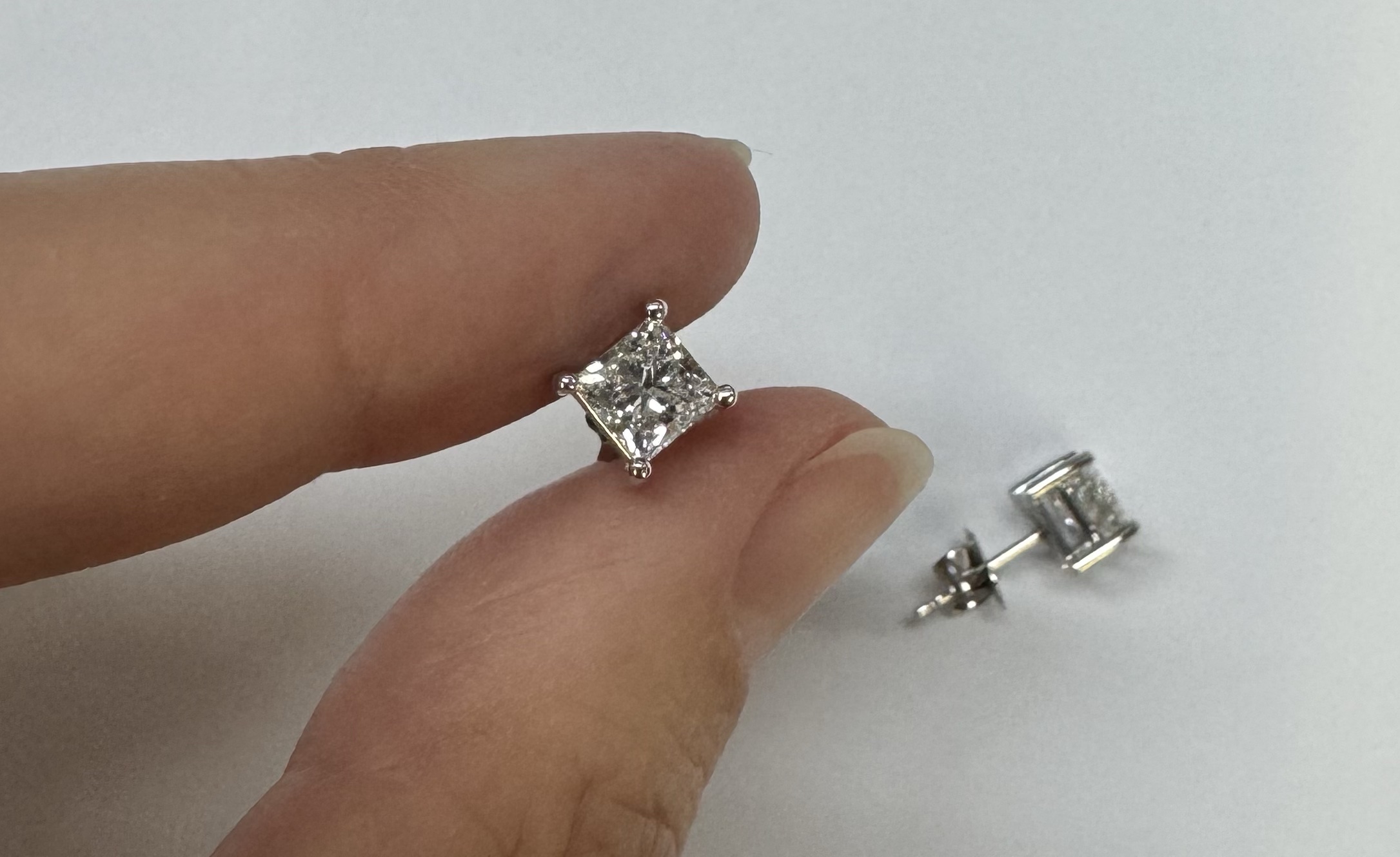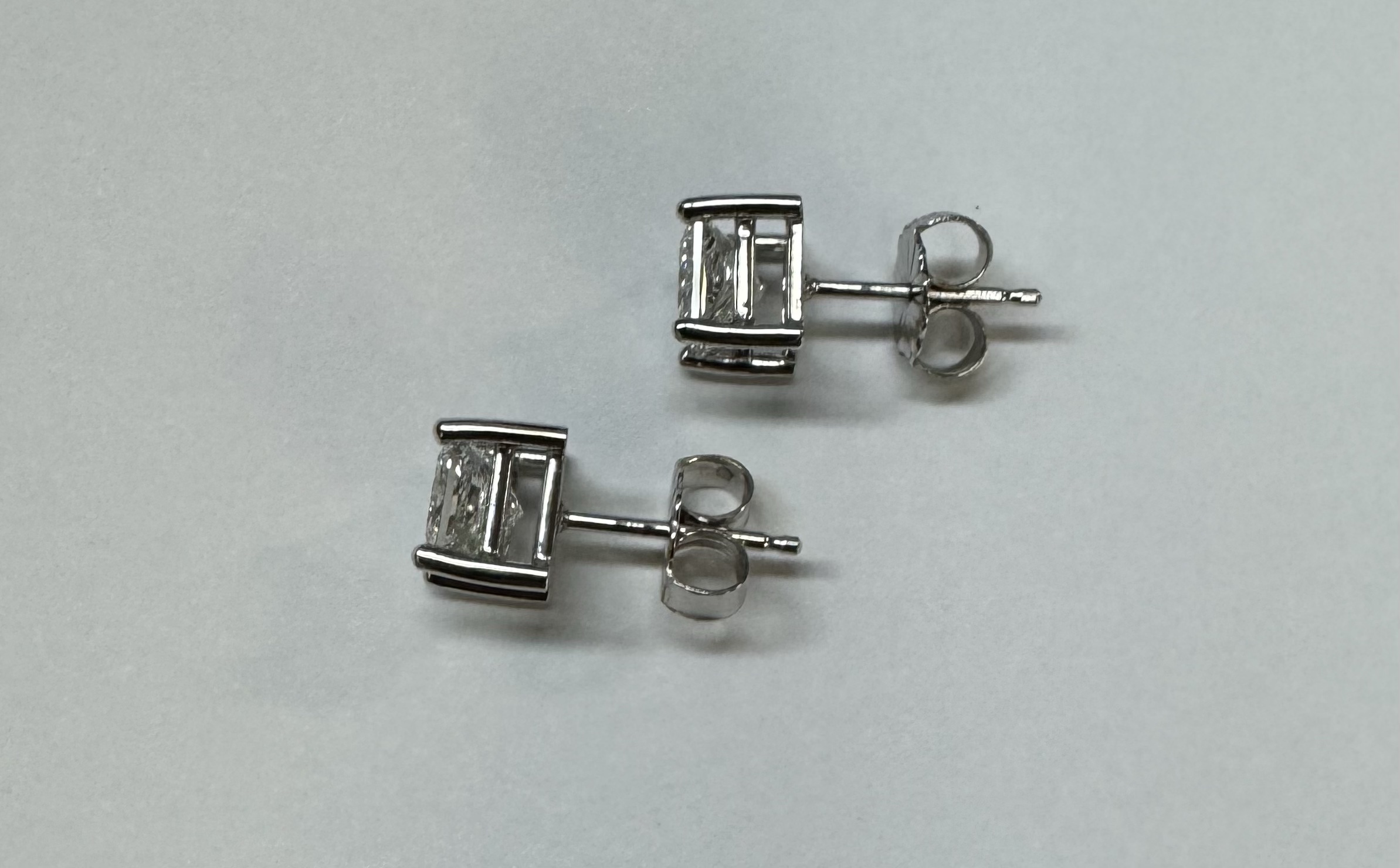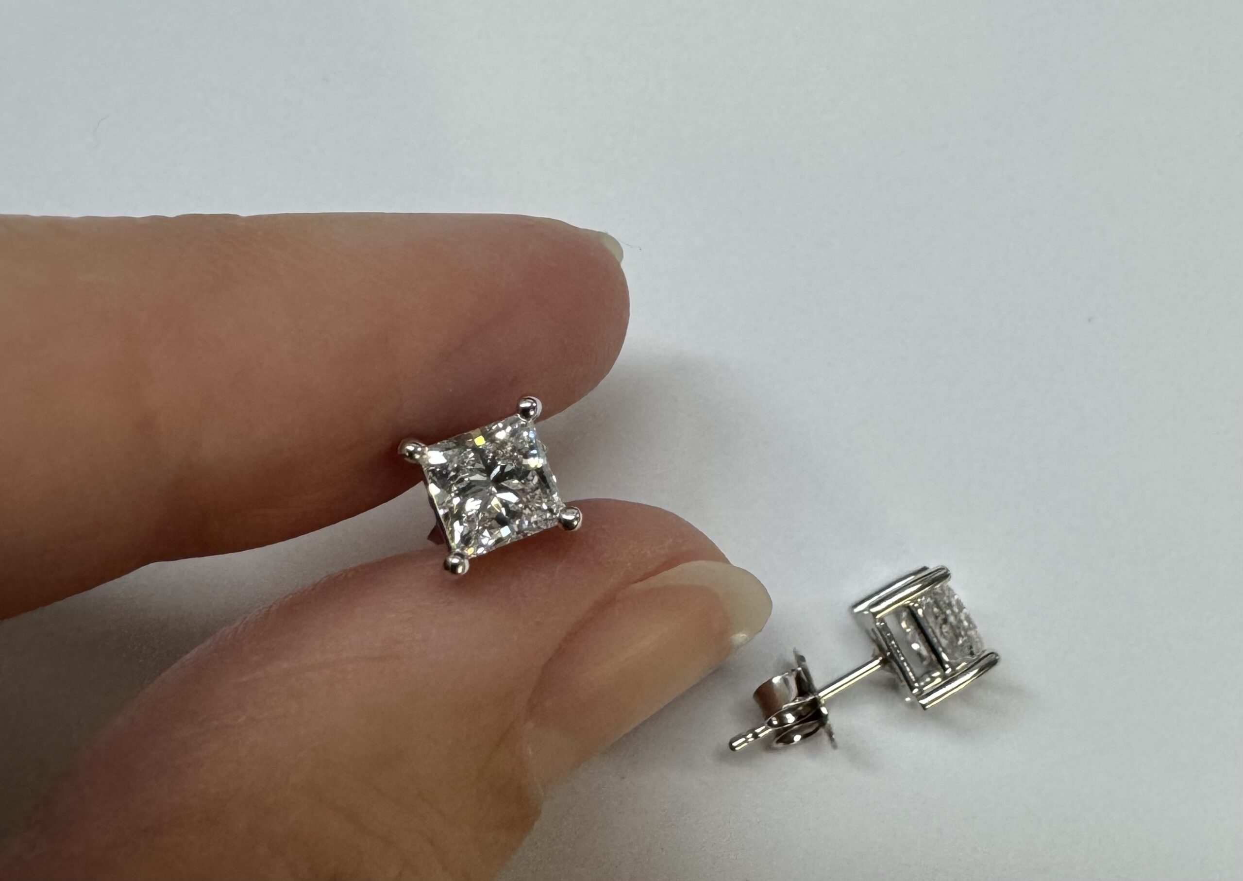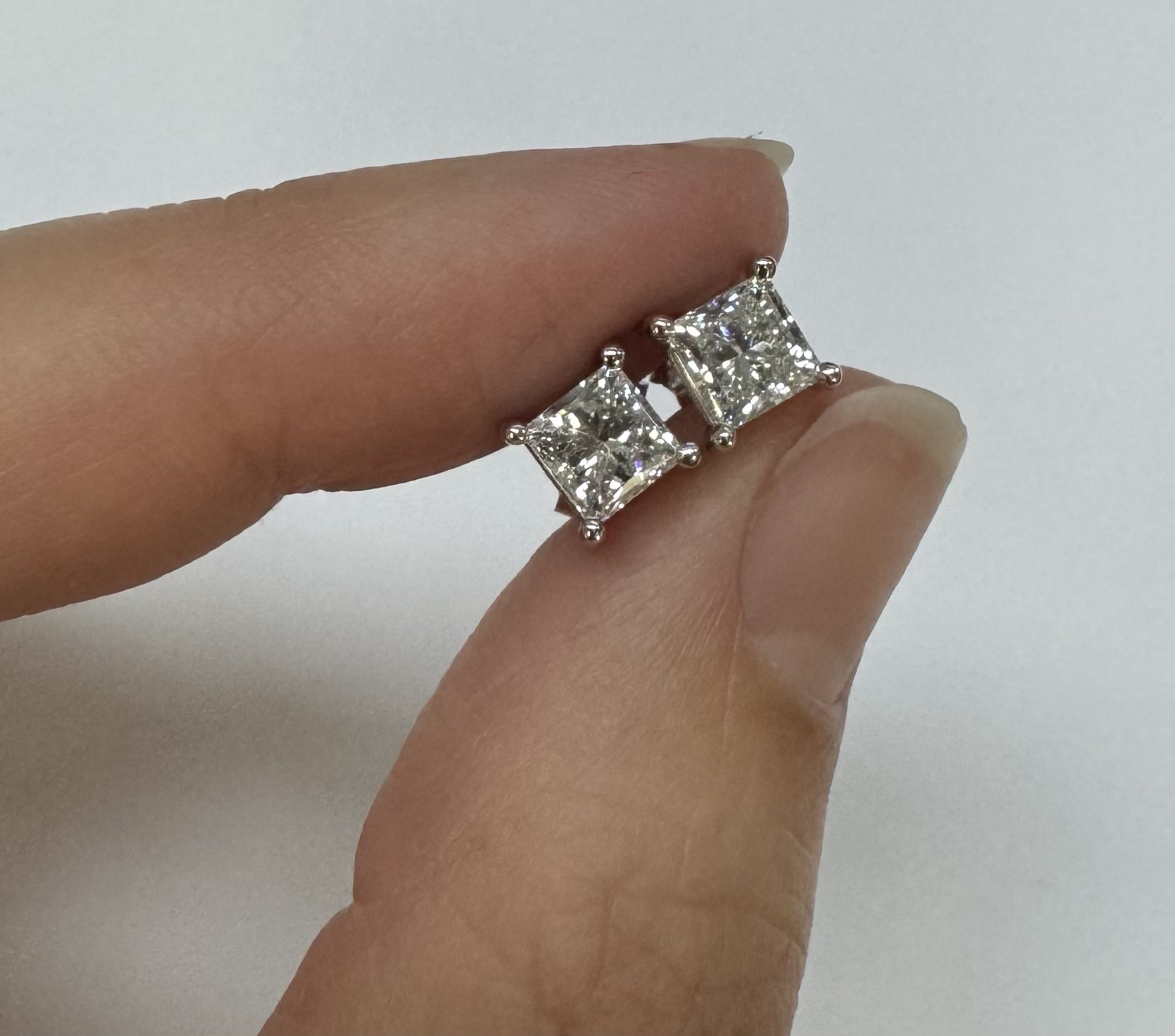 14k white gold genuine 1.50 cttw Lab Grown Princess Cut Diamond 4 prong basket set stud earrings. These diamonds have F color, VS clarity, and are very nicely proportioned and finished. These earrings have an entire weight of 1.5 grams.