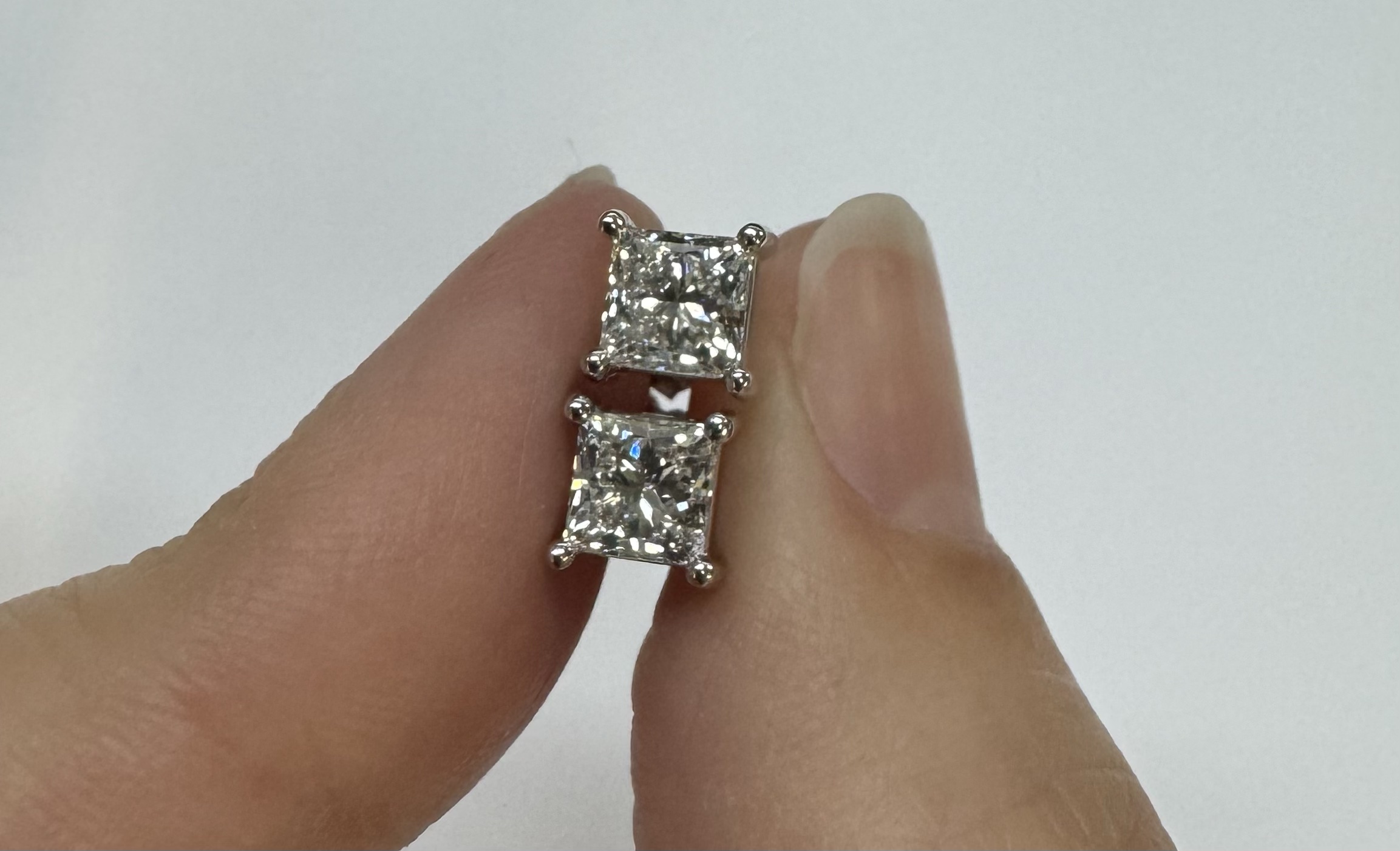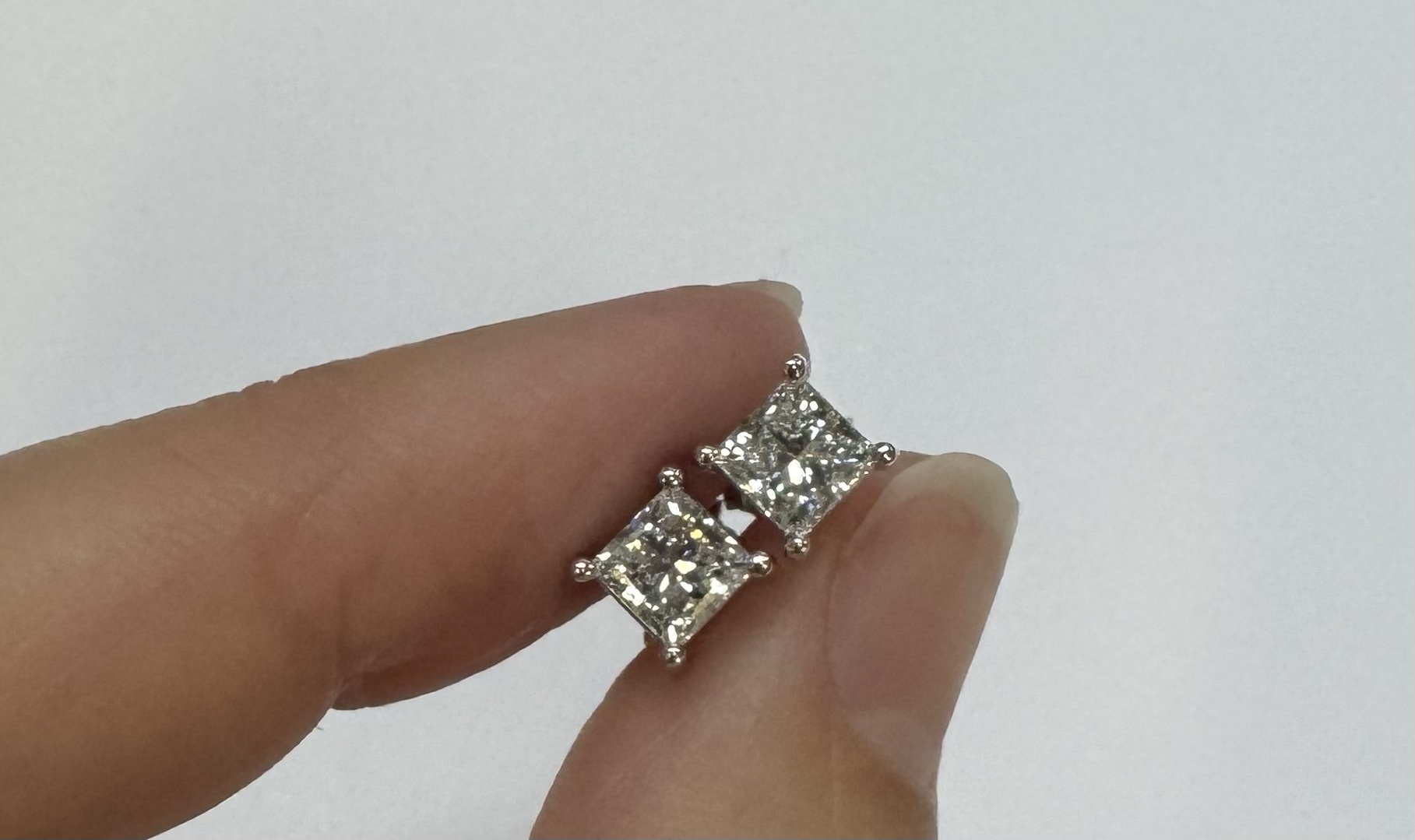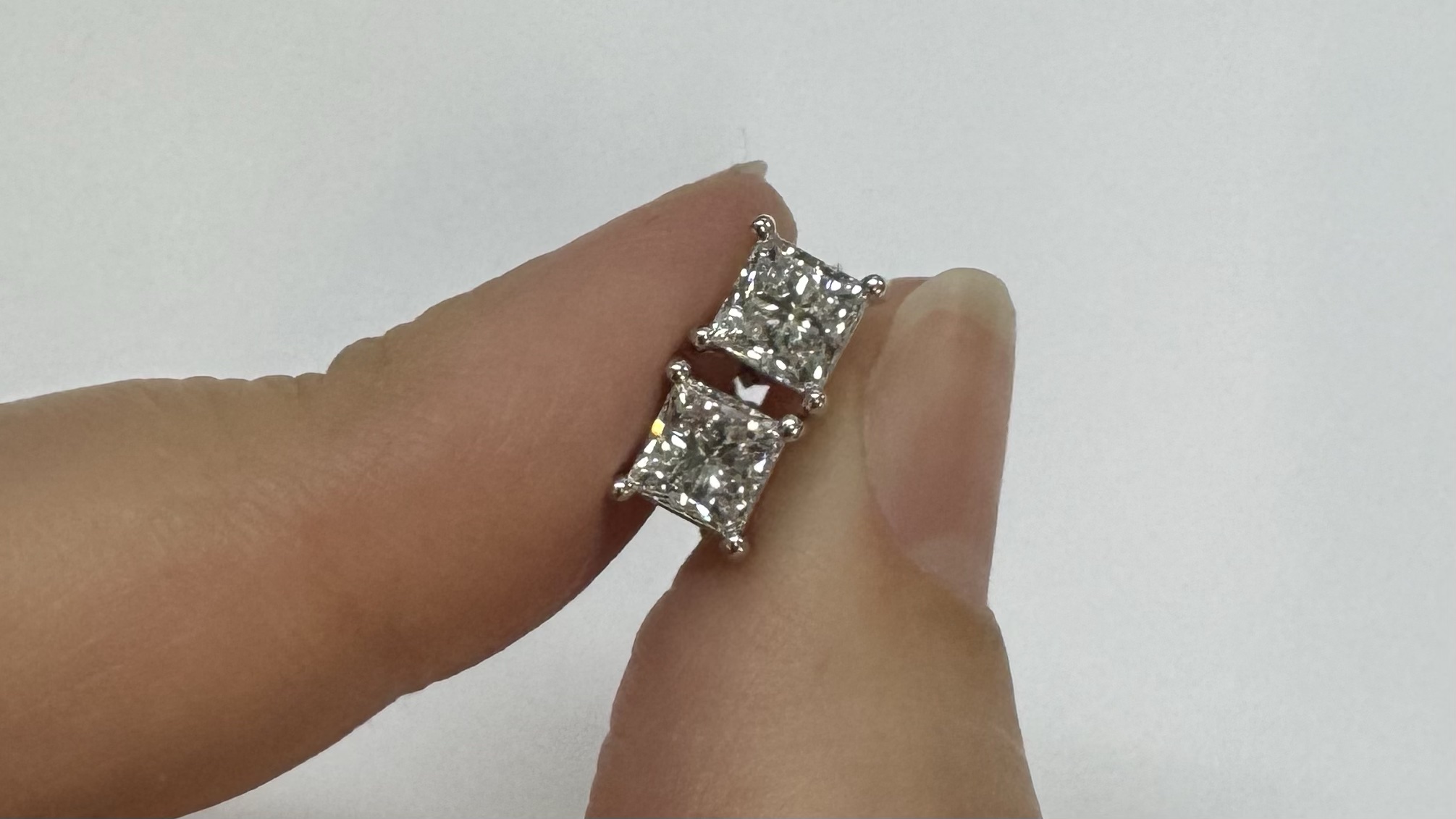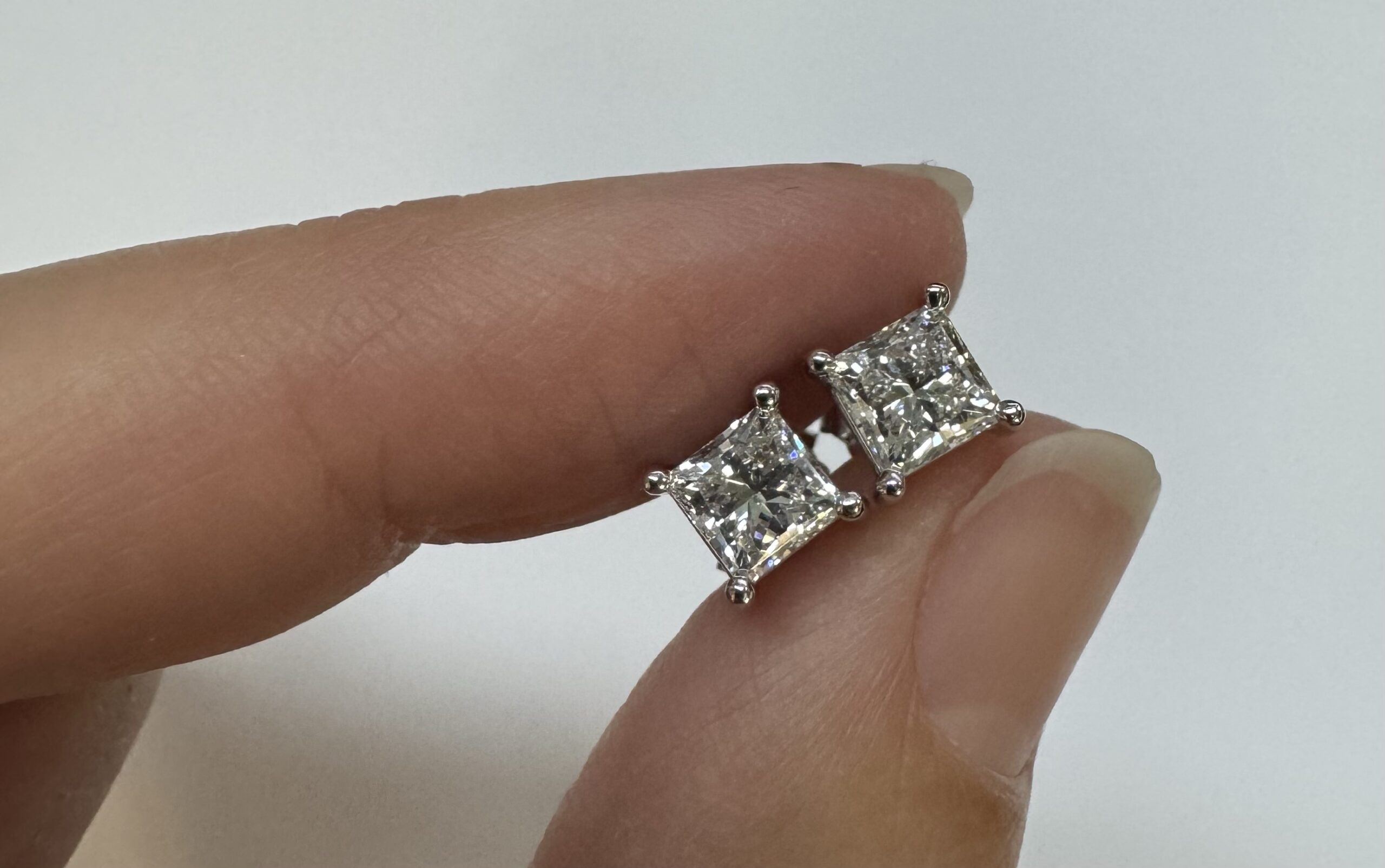 14k white gold genuine 1.50 cttw Lab Grown Princess Cut Diamond 4 prong basket set stud earrings. These diamonds have F color, VS clarity, and are very nicely proportioned and finished. These earrings have an entire weight of 1.5 grams.