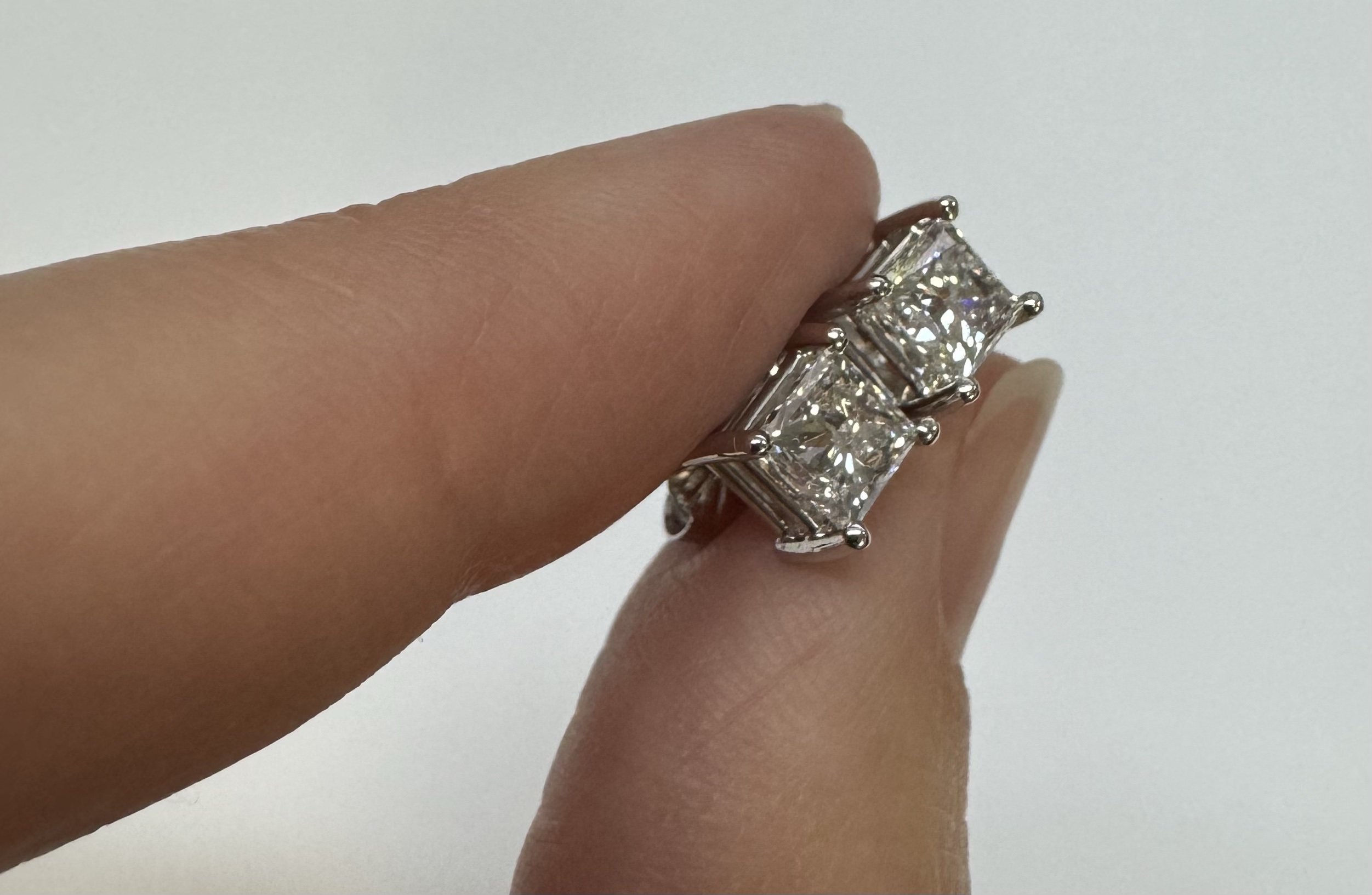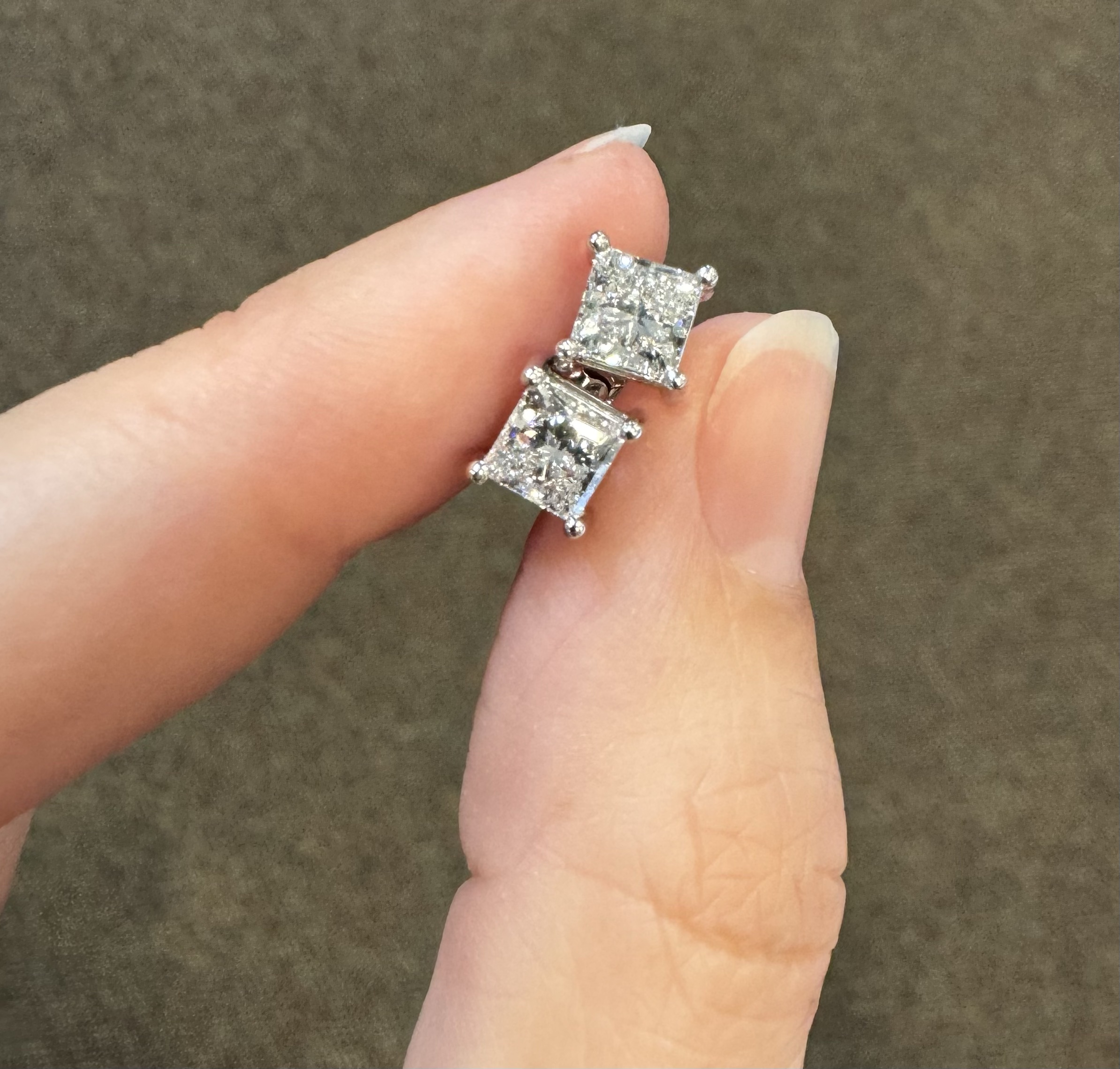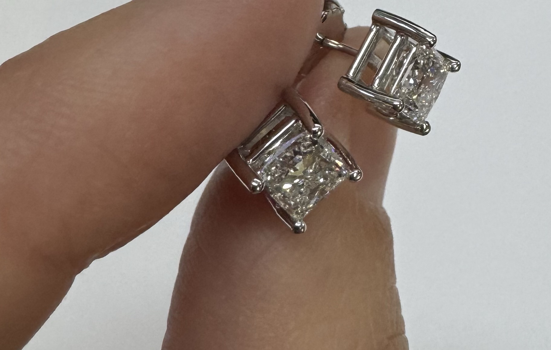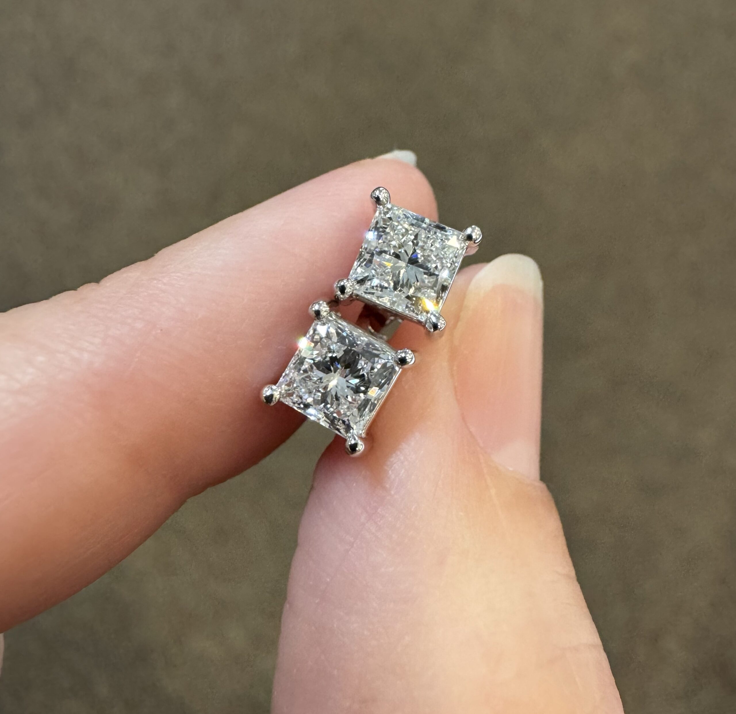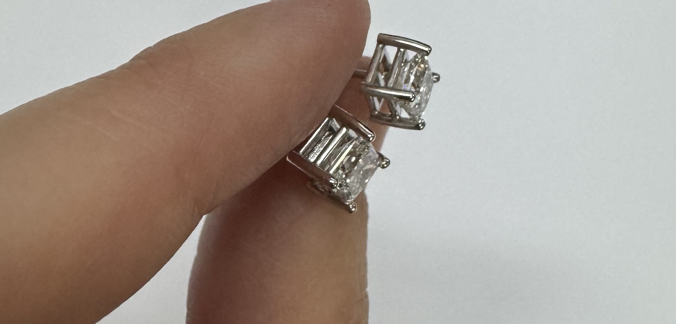 14k white gold genuine 1.50 cttw Lab Grown Princess Cut Diamond 4 prong basket set stud earrings. These diamonds have F color, VS clarity, and are very nicely proportioned and finished. These earrings have an entire weight of 1.5 grams.