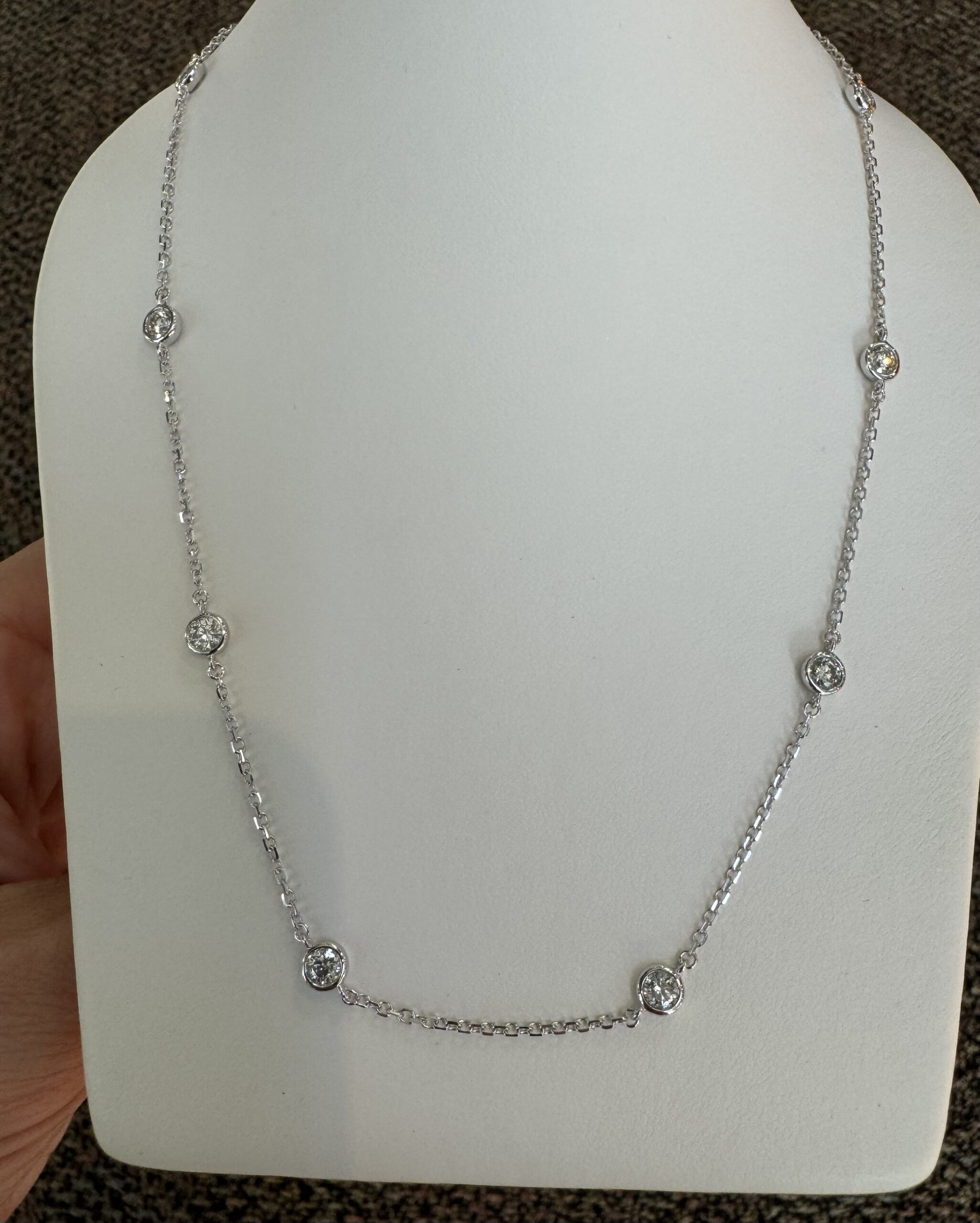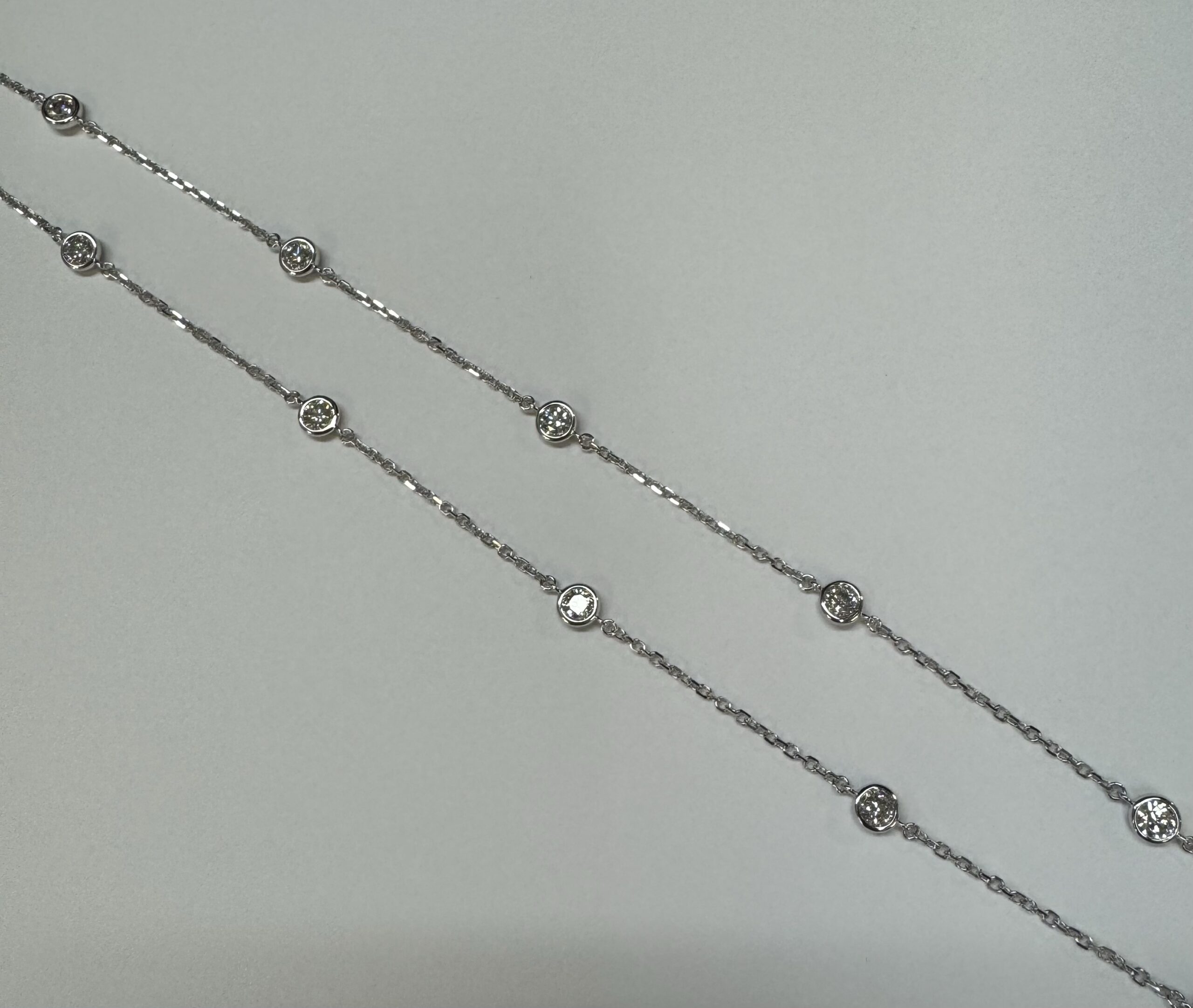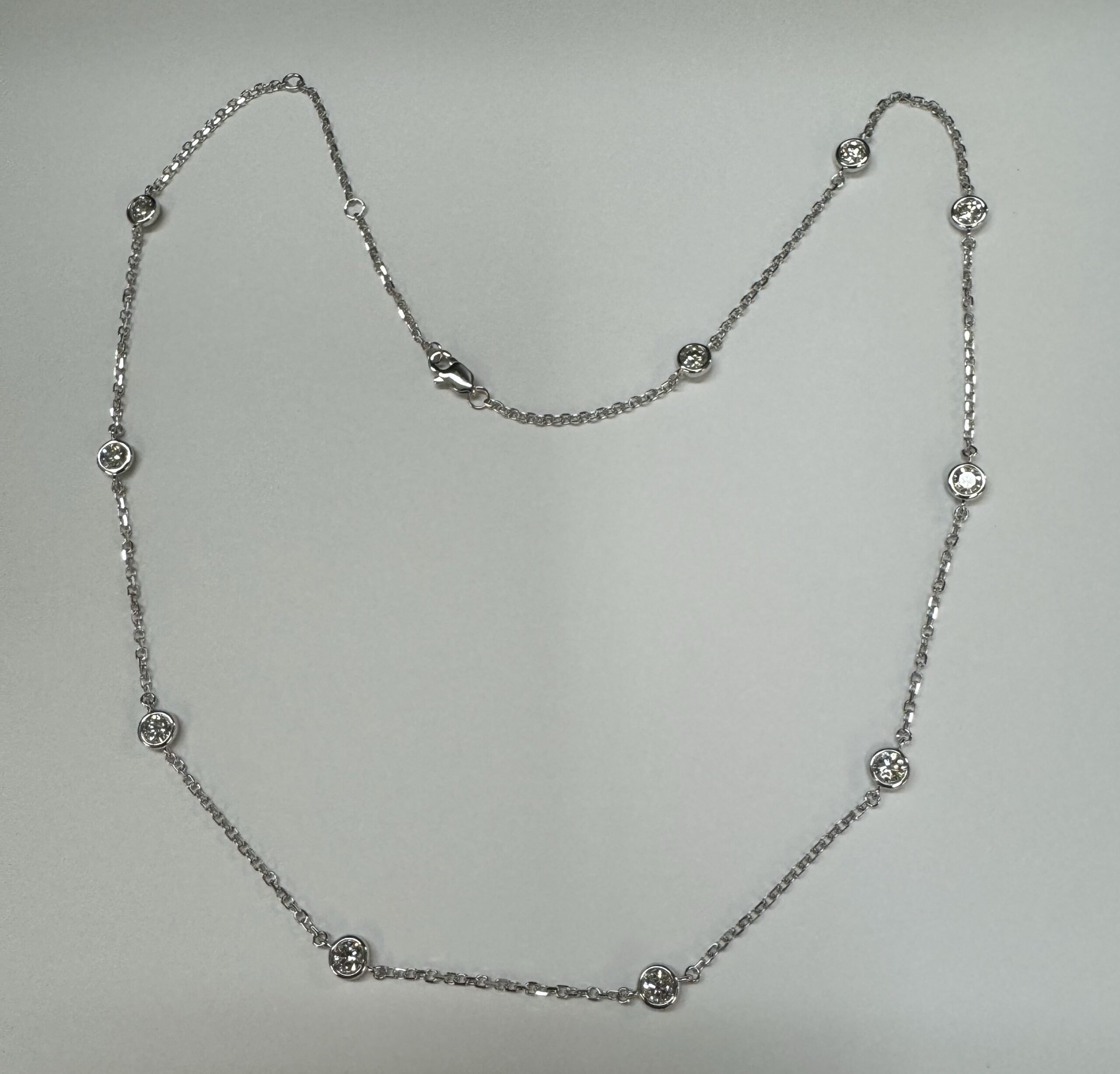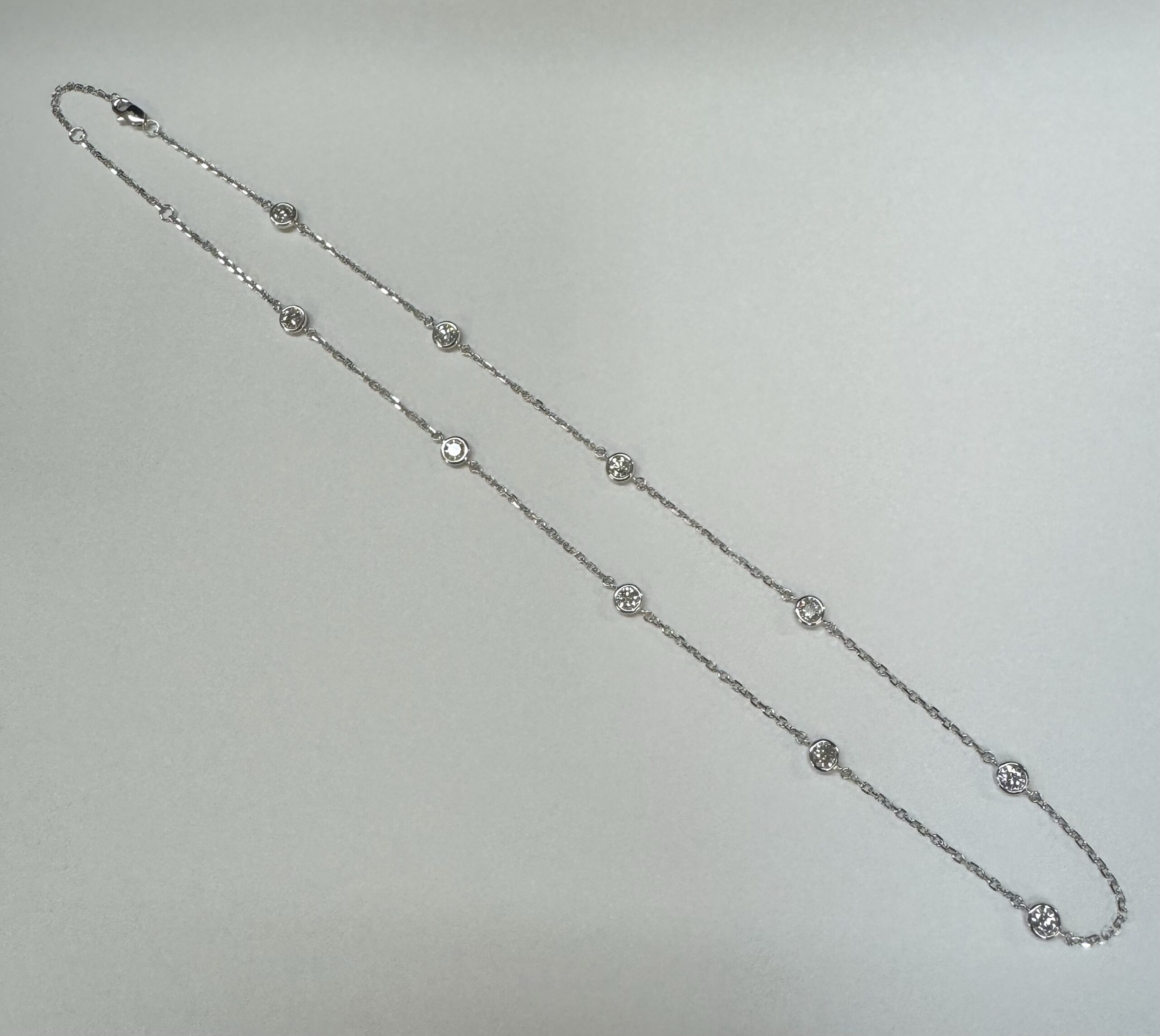14k white gold 10 stone genuine 1.57 cttw Round Brilliant Cut diamond bezel set “by the yard” necklace, adjustable 16-17-18”. These diamonds average G-H in color and SI2 in clarity. This necklace has an entire weight of 4.5 grams. This piece is also available in 14k two tone or 14k yellow gold.