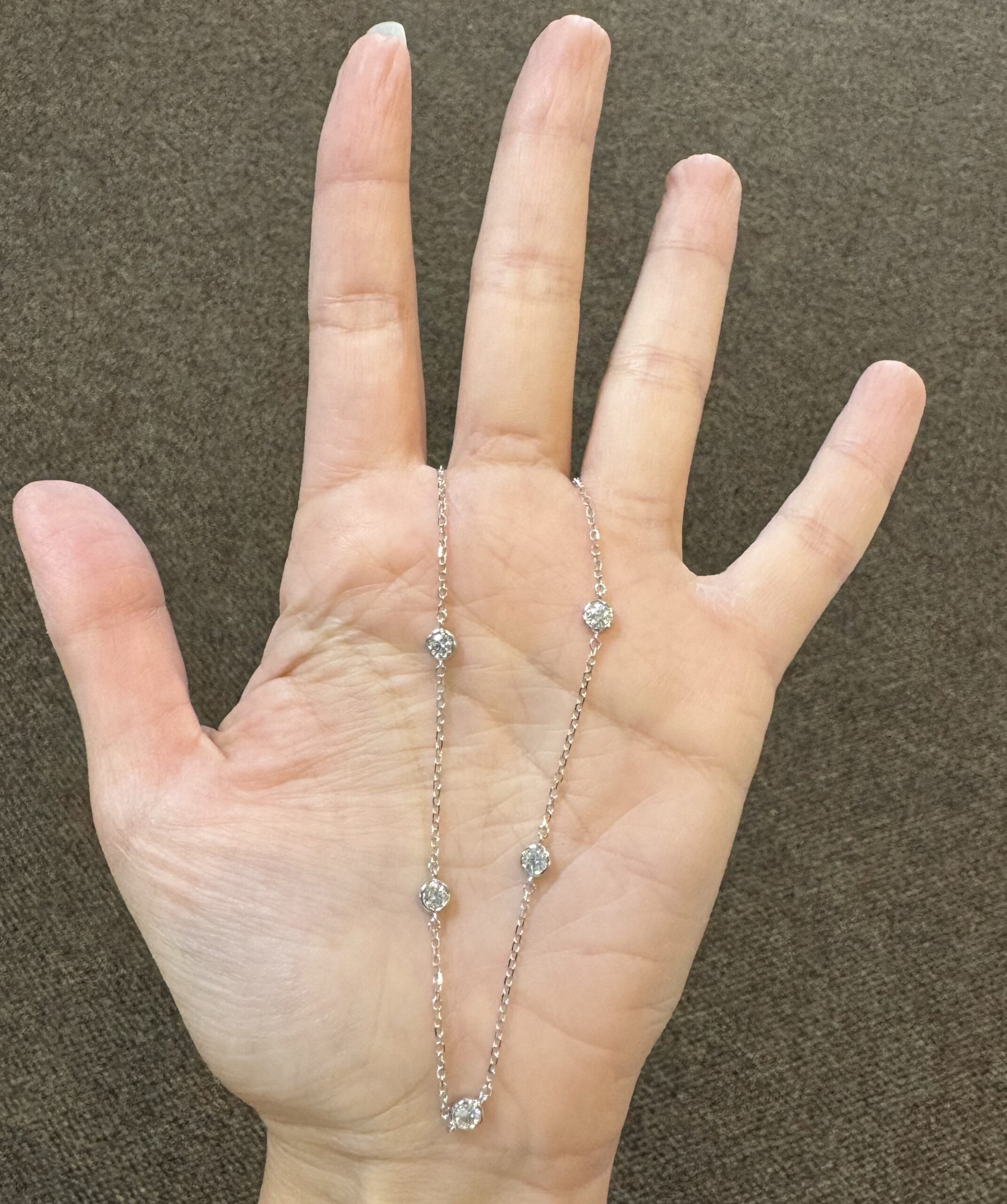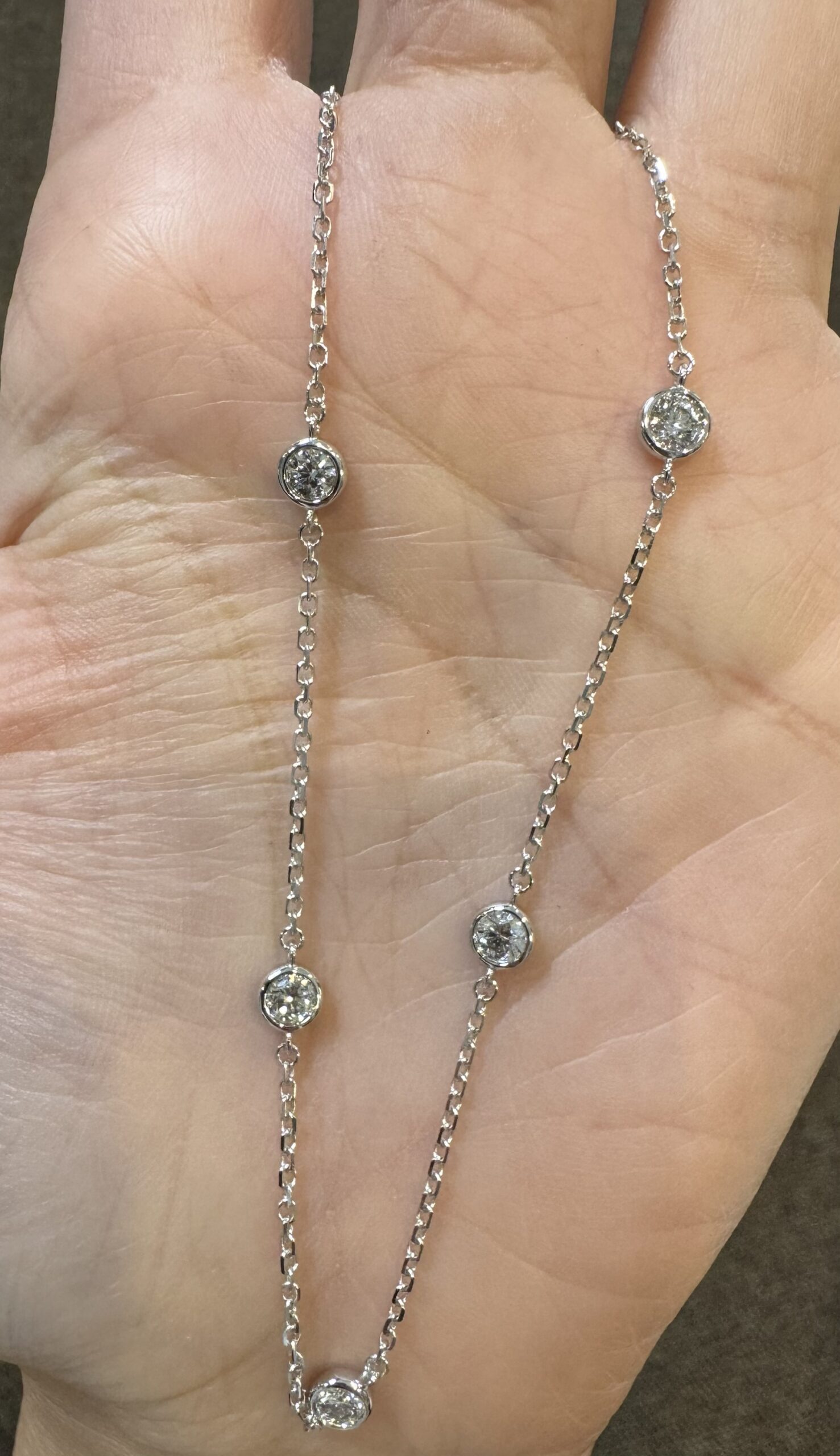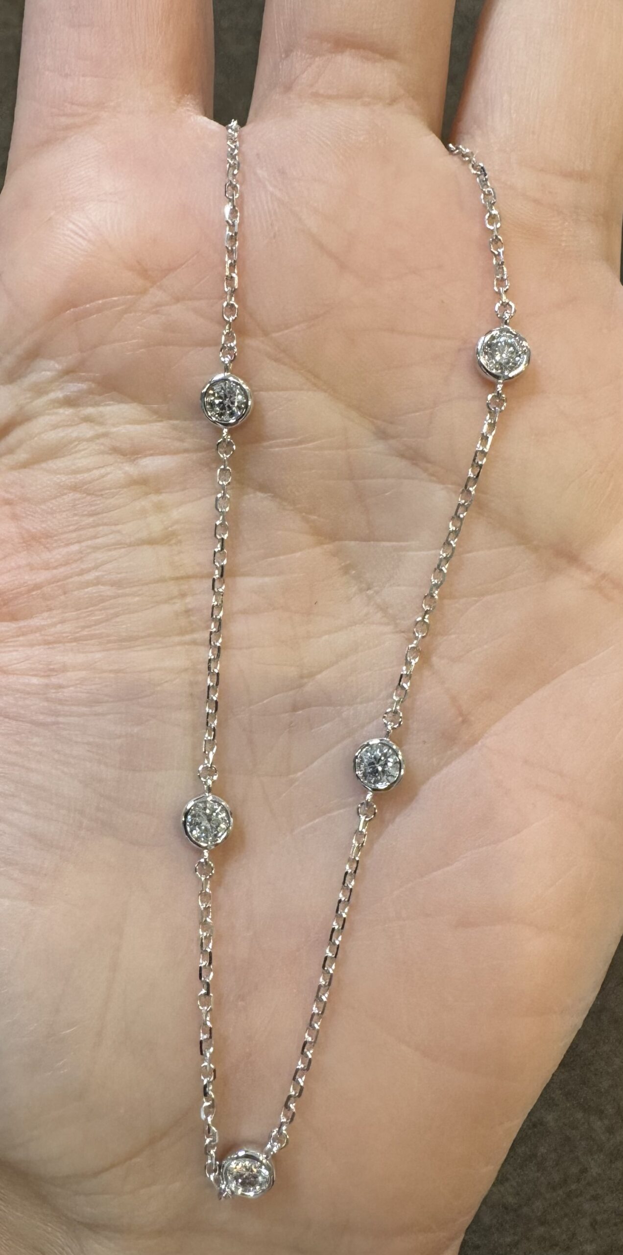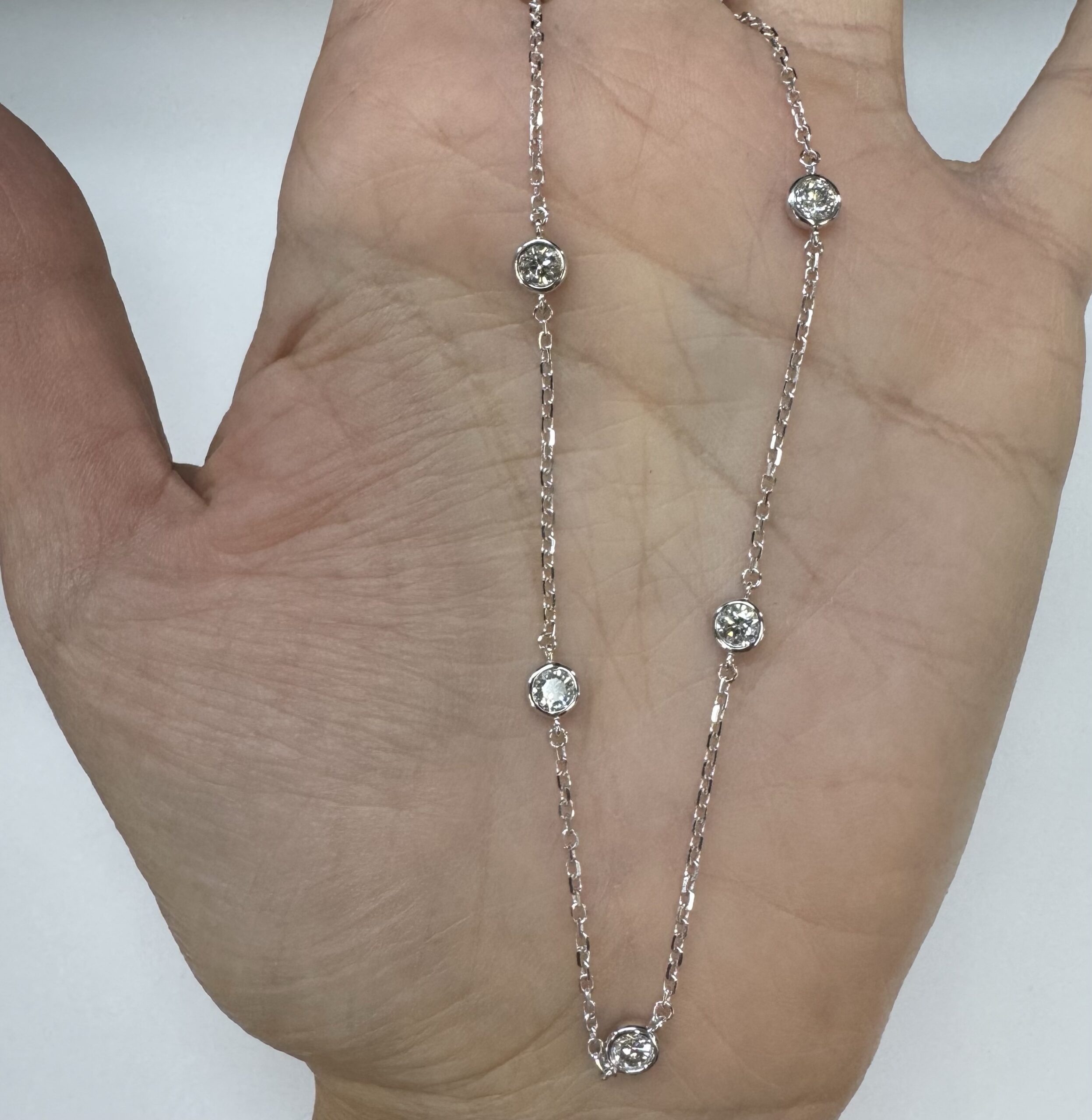 14k white gold 10 stone genuine 1.57 cttw Round Brilliant Cut diamond bezel set “by the yard” necklace, adjustable 16-17-18”. These diamonds average G-H in color and SI2 in clarity. This necklace has an entire weight of 4.5 grams. This piece is also available in 14k two tone or 14k yellow gold.