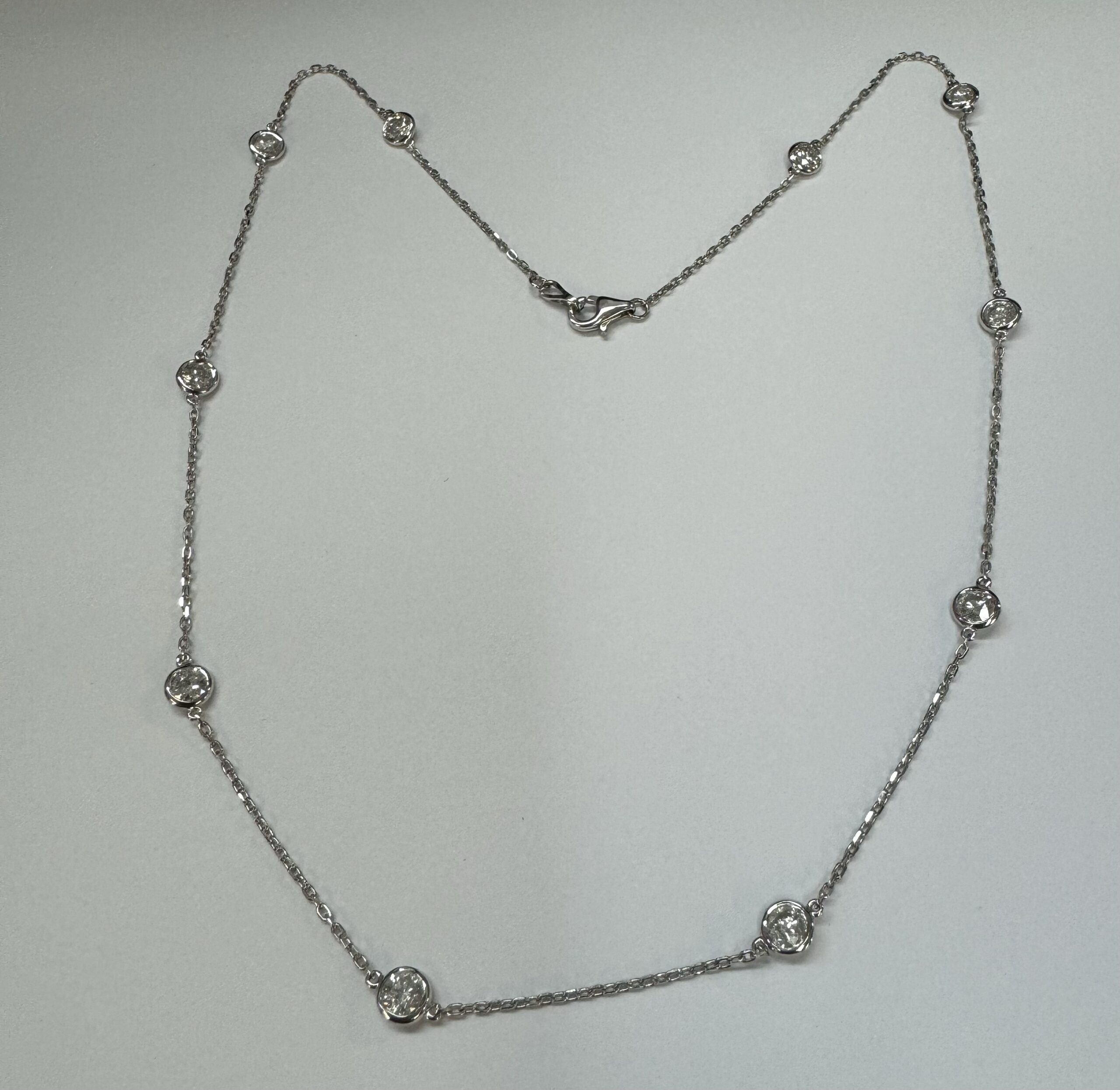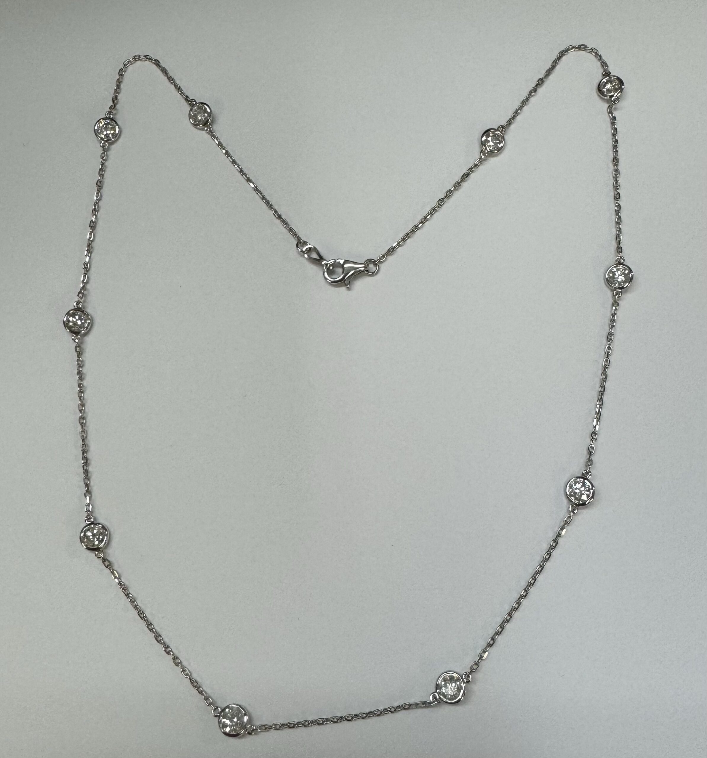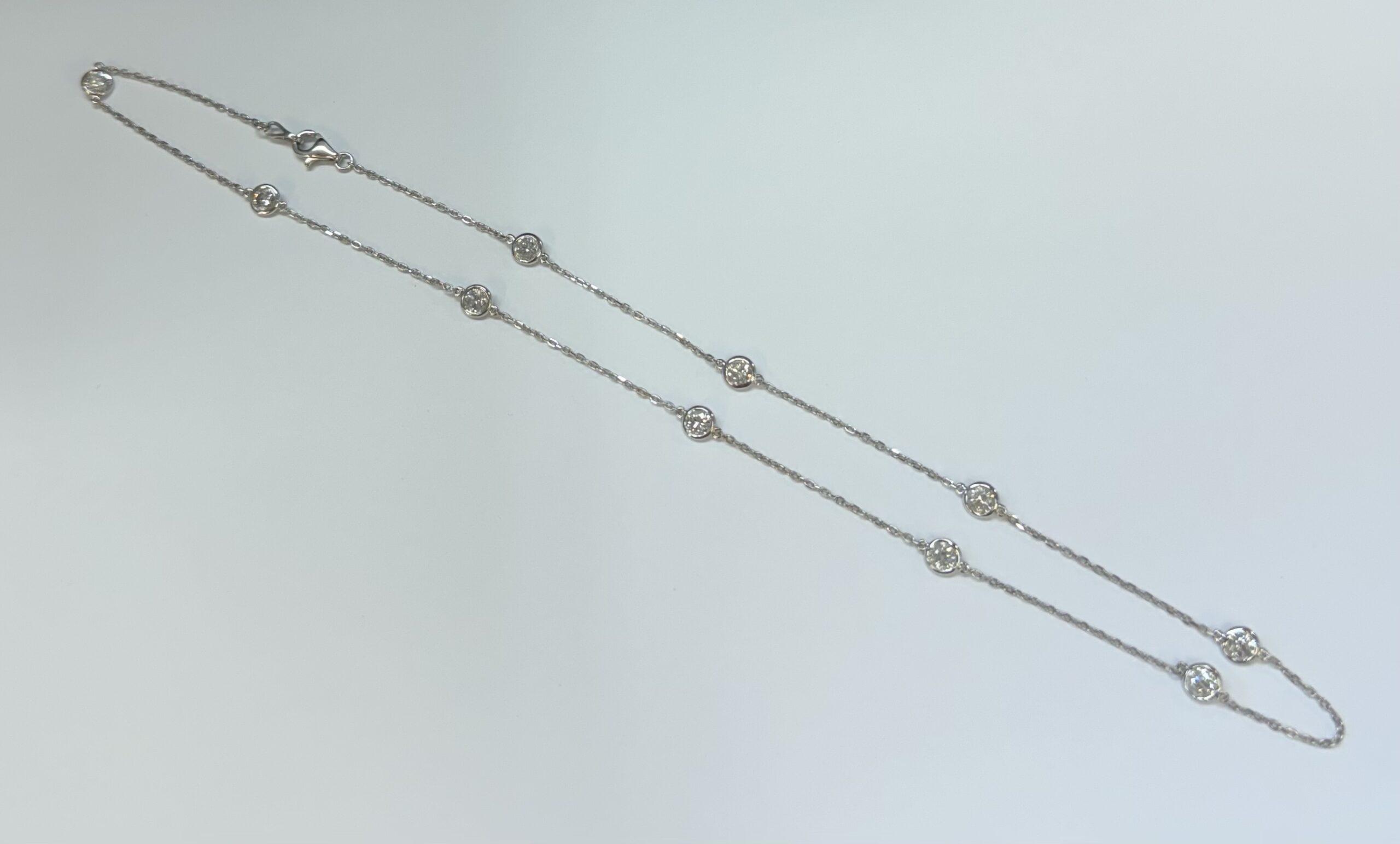 14k white gold 10 stone genuine 2.45 cttw Round Brilliant Cut diamond bezel set “by the yard” necklace. These diamonds average H in color, and I1 in clarity. This necklace measures 18″ in length, and it has an entire weight of 4.4 grams.