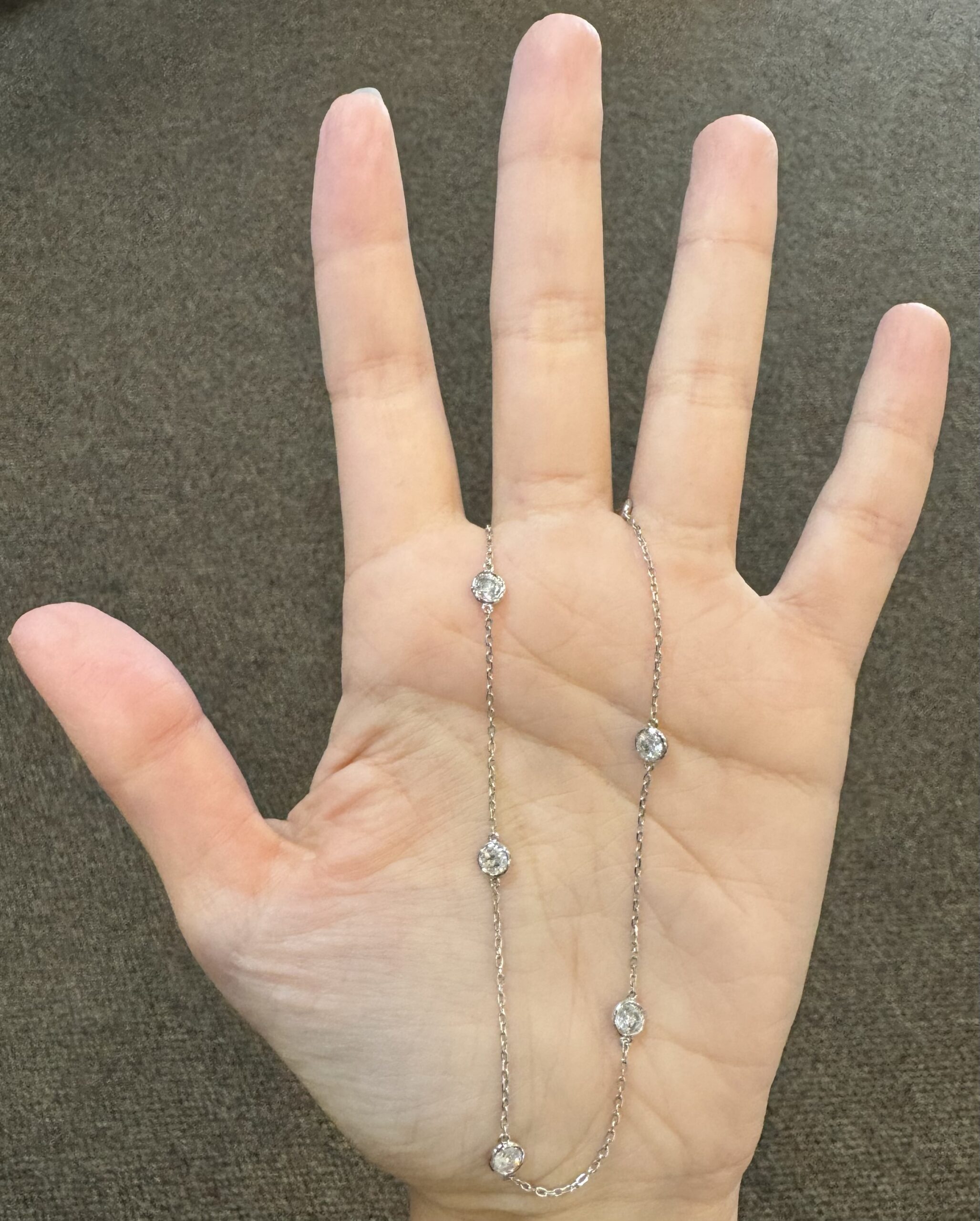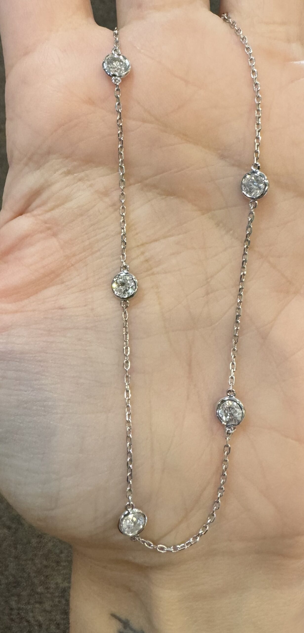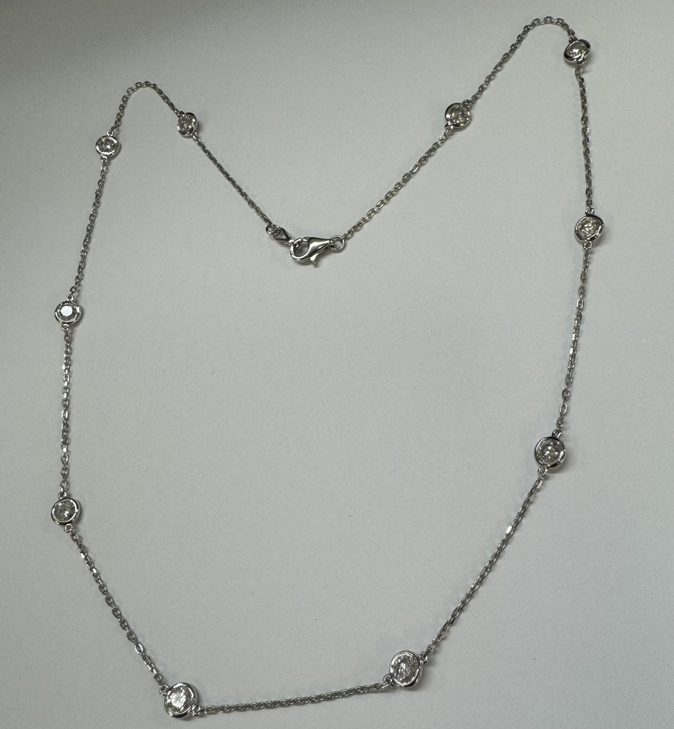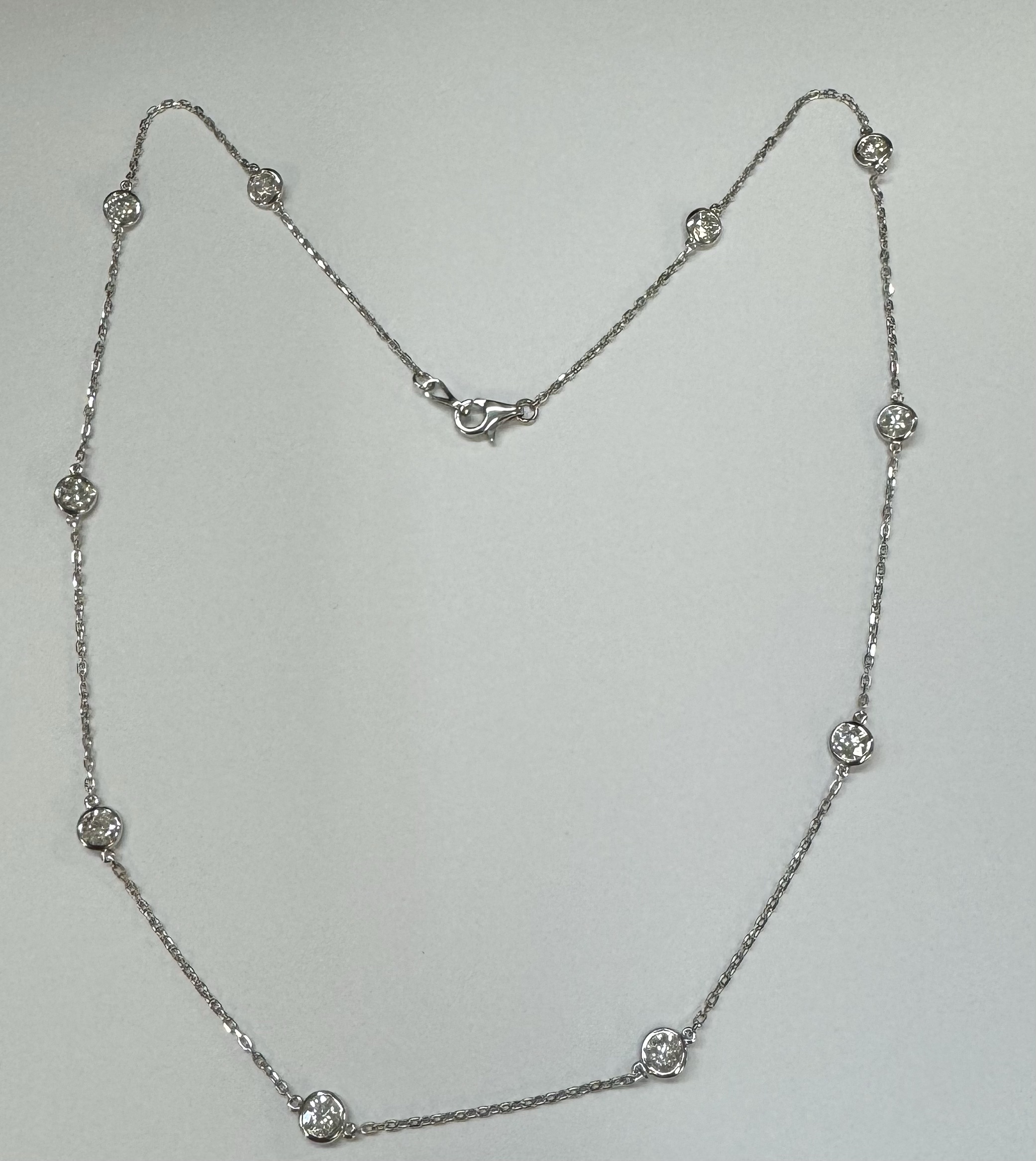 14k white gold 10 stone genuine 2.45 cttw Round Brilliant Cut diamond bezel set “by the yard” necklace. These diamonds average H in color, and I1 in clarity. This necklace measures 18″ in length, and it has an entire weight of 4.4 grams.