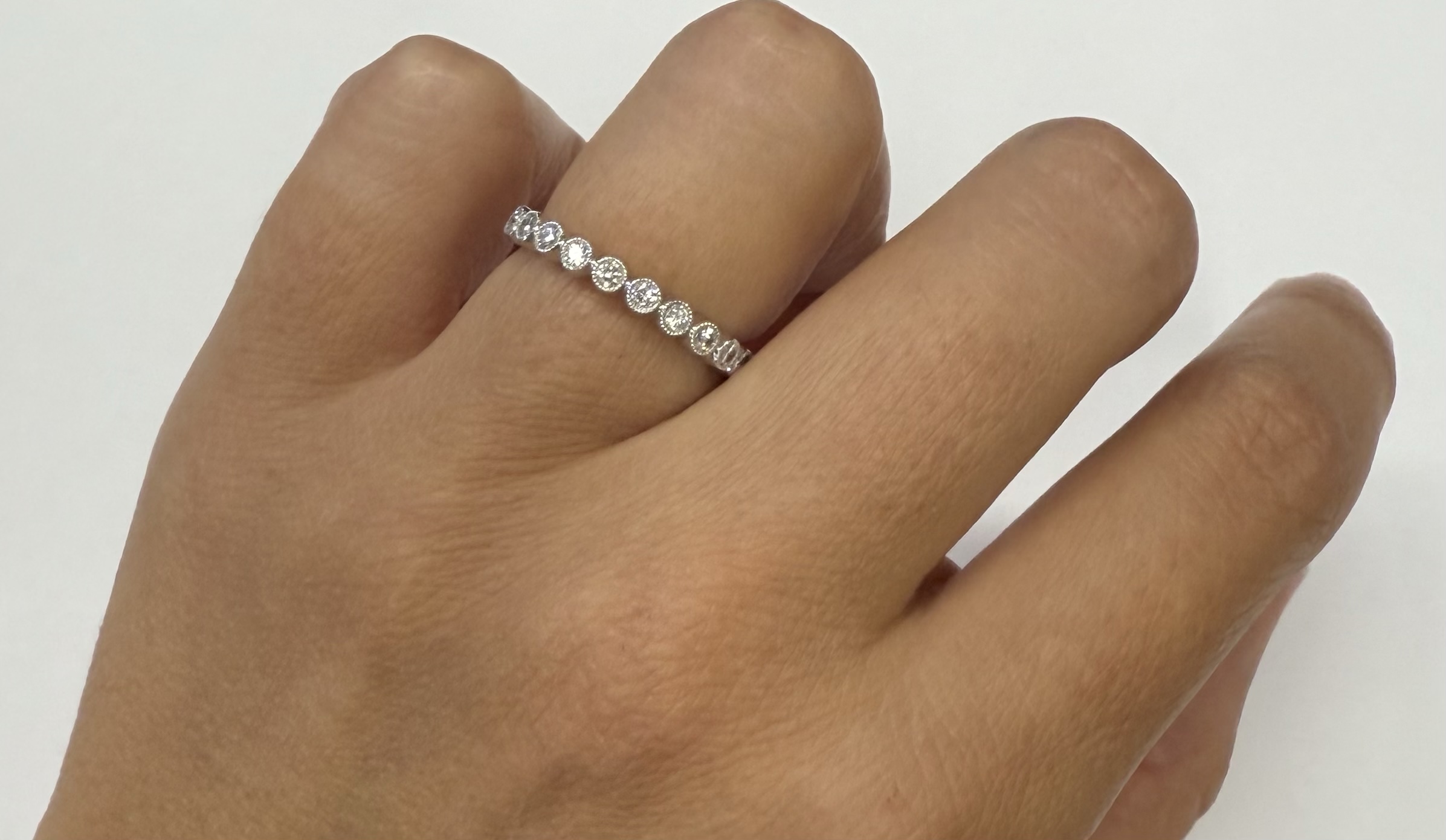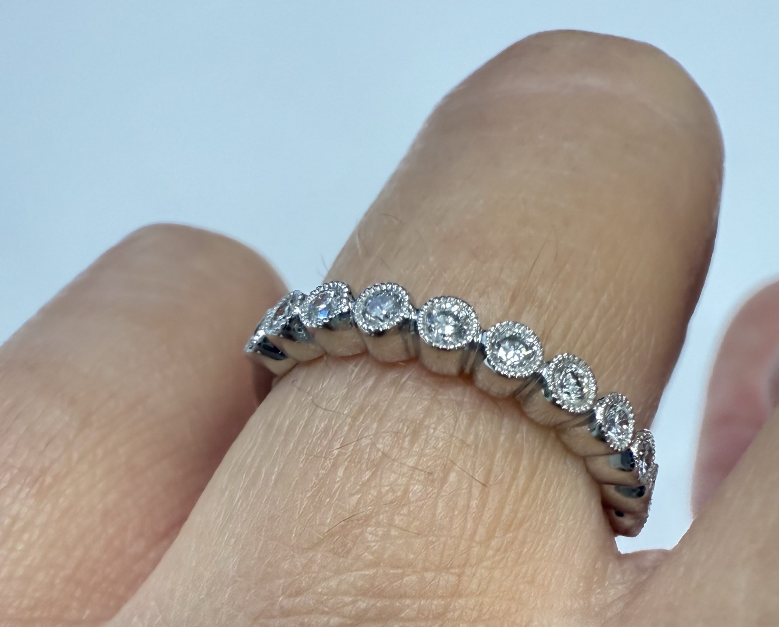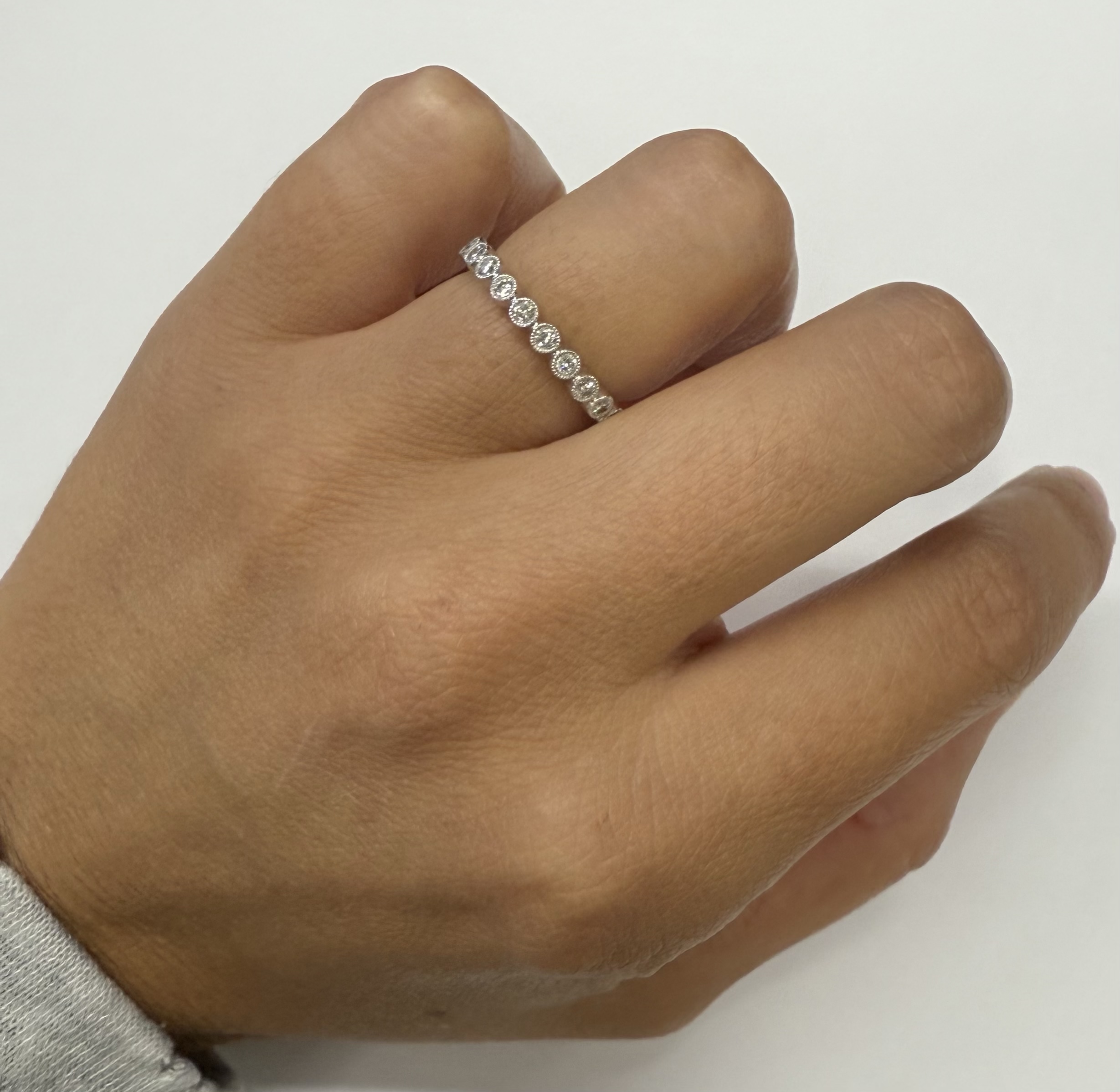 14k white gold 11 stone genuine .28 cttw Round Brilliant Cut diamond band with mill grain borders. These dja