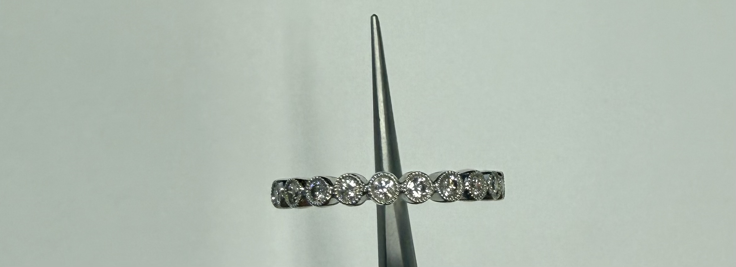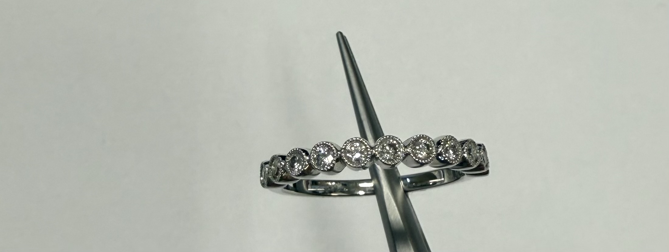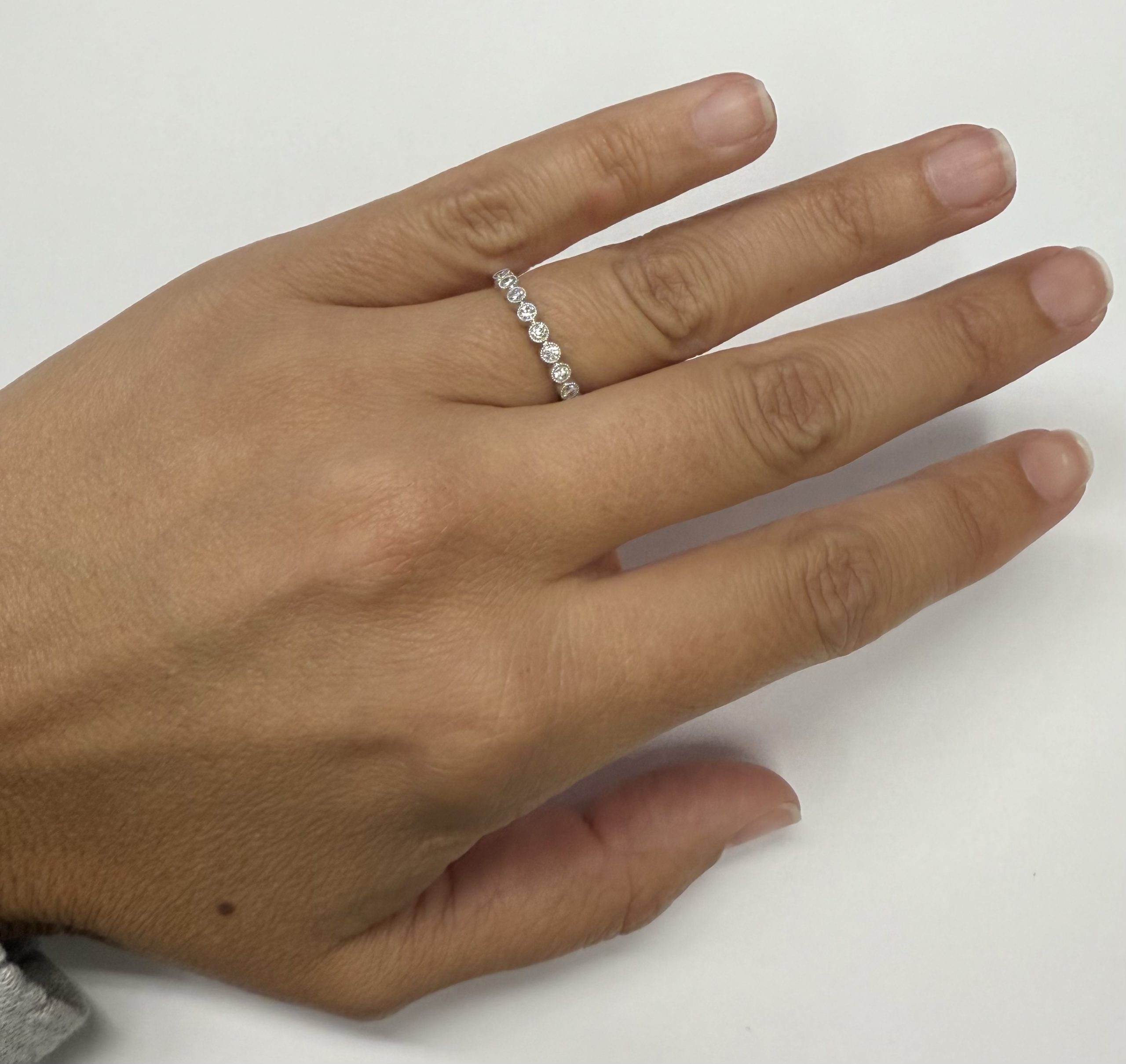 14k white gold 11 stone genuine .28 cttw Round Brilliant Cut diamond band with mill grain borders. These dja