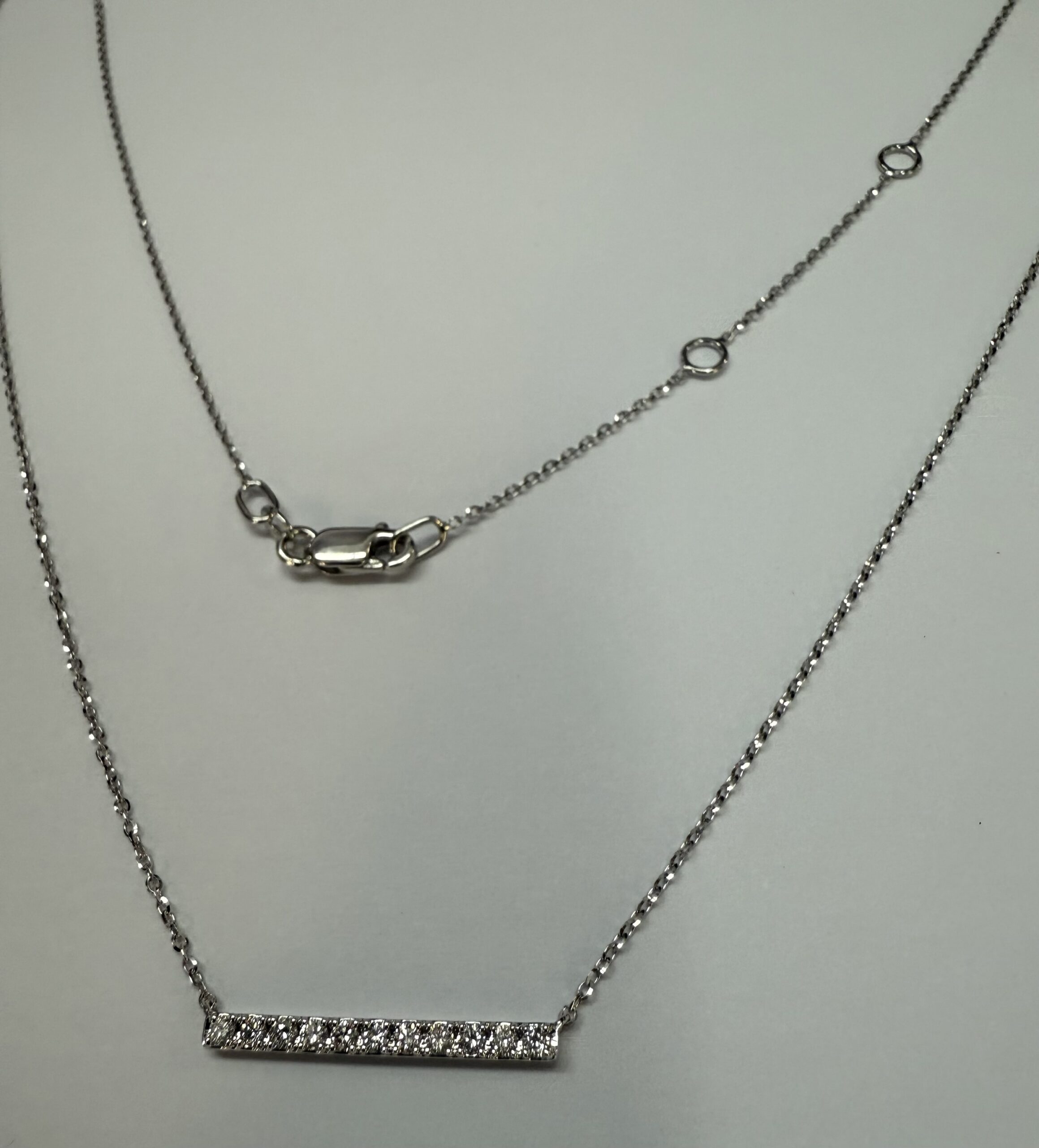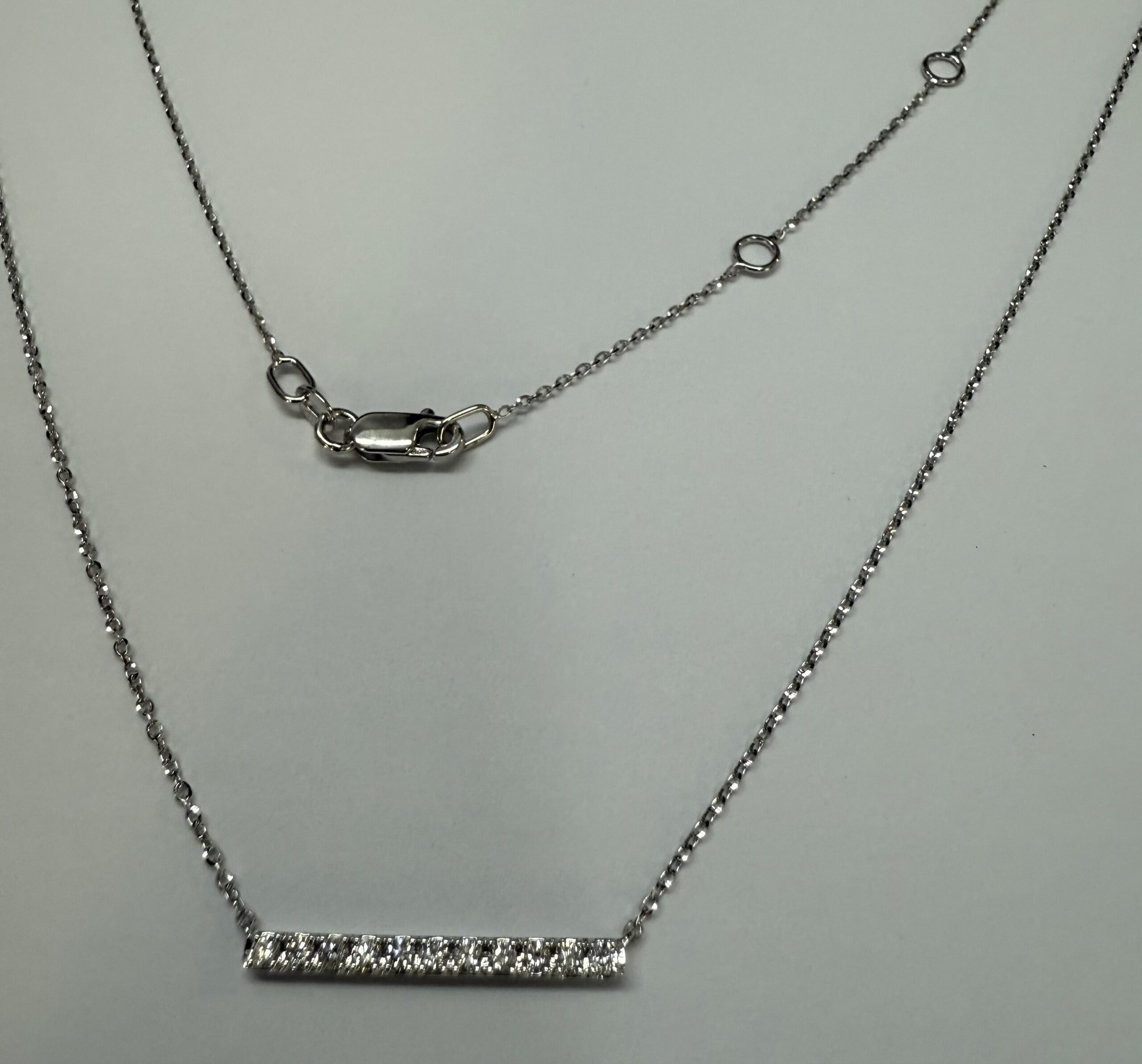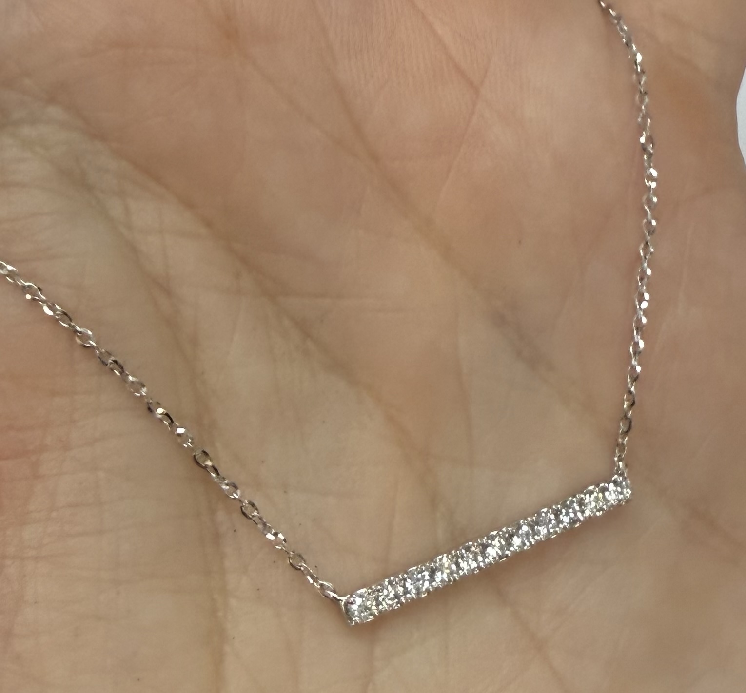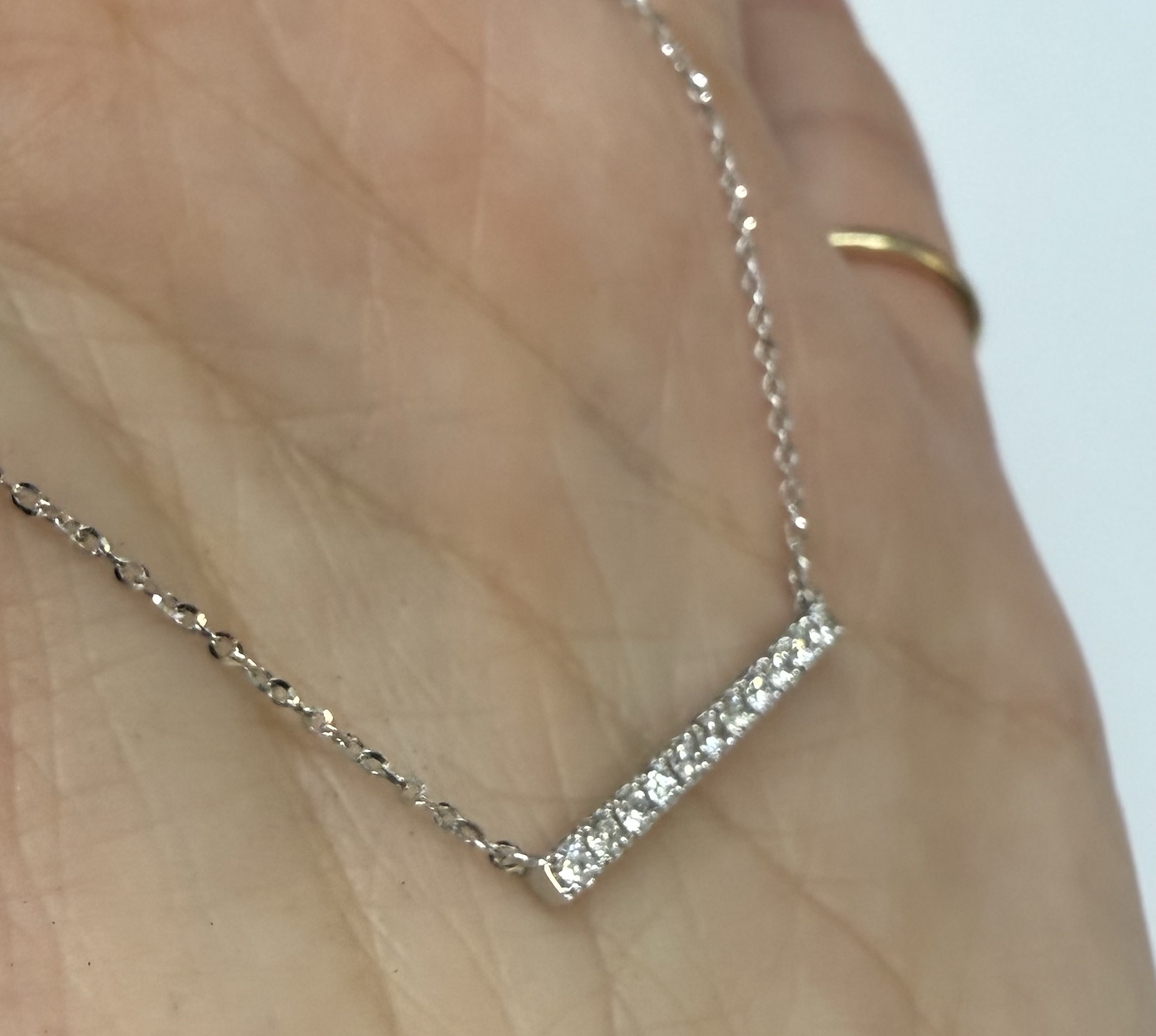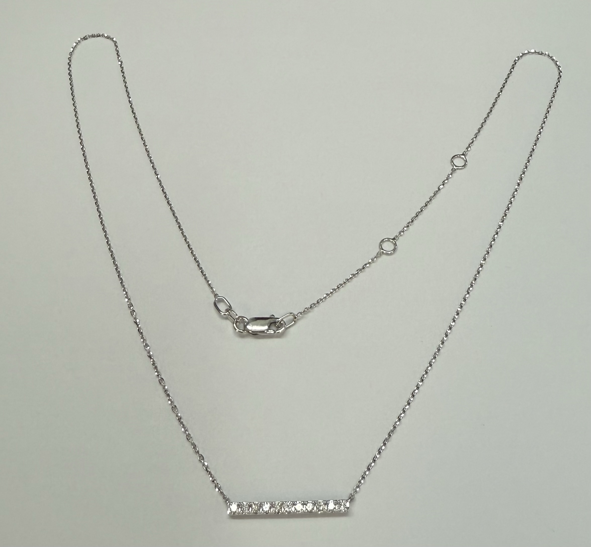 14k white gold delicate diamond bar necklace, with 8 genuine Round Brilliant Cut diamonds, which have a total combined weight of .20 cttw. These diamonds average G-H in color, and SI1 in clarity. The bar measures just over 3/4” in length. The necklace is adjustable 16-17-18″ in length, and it has an entire weight of 1.9 grams.