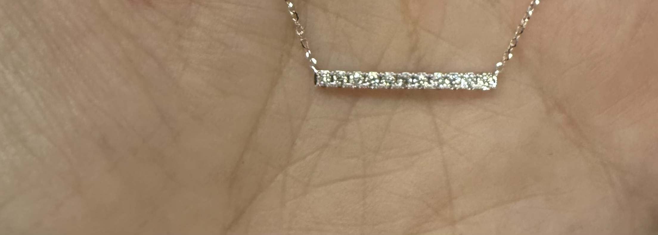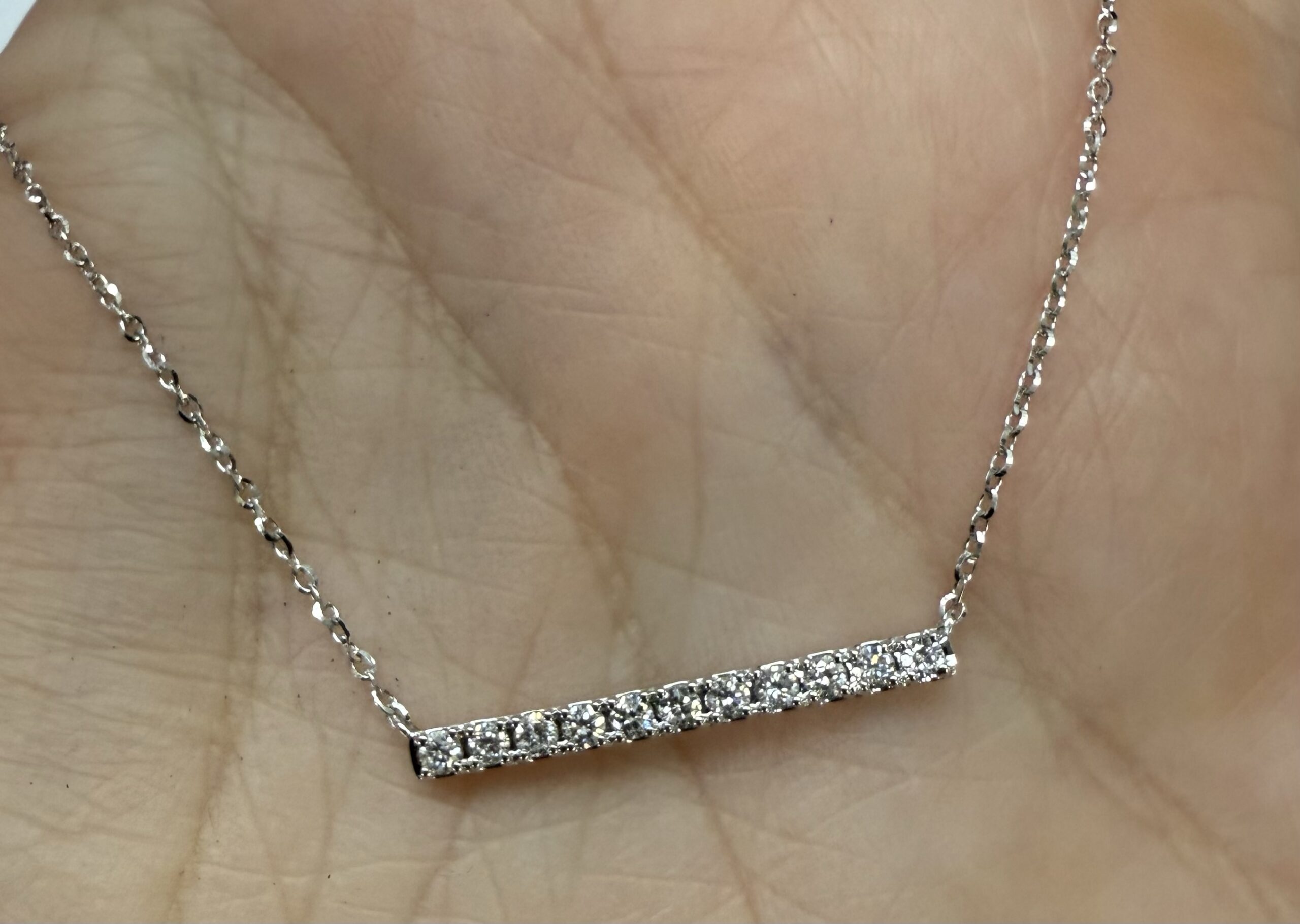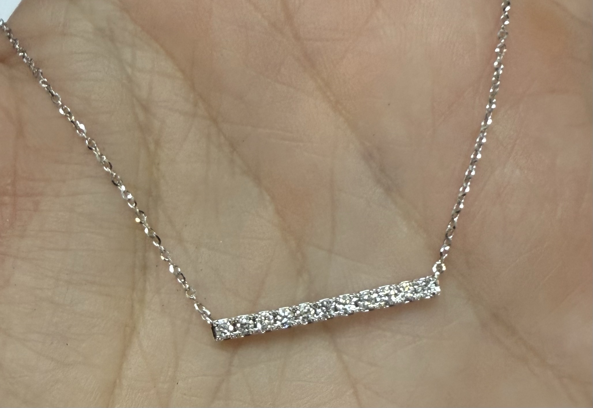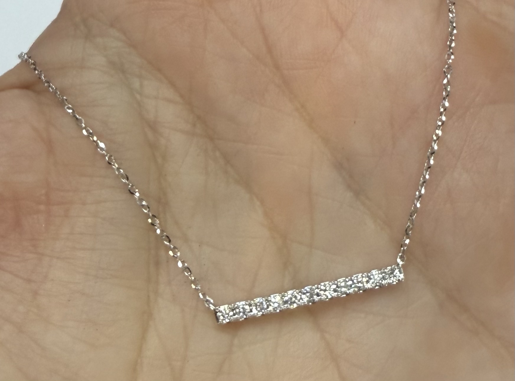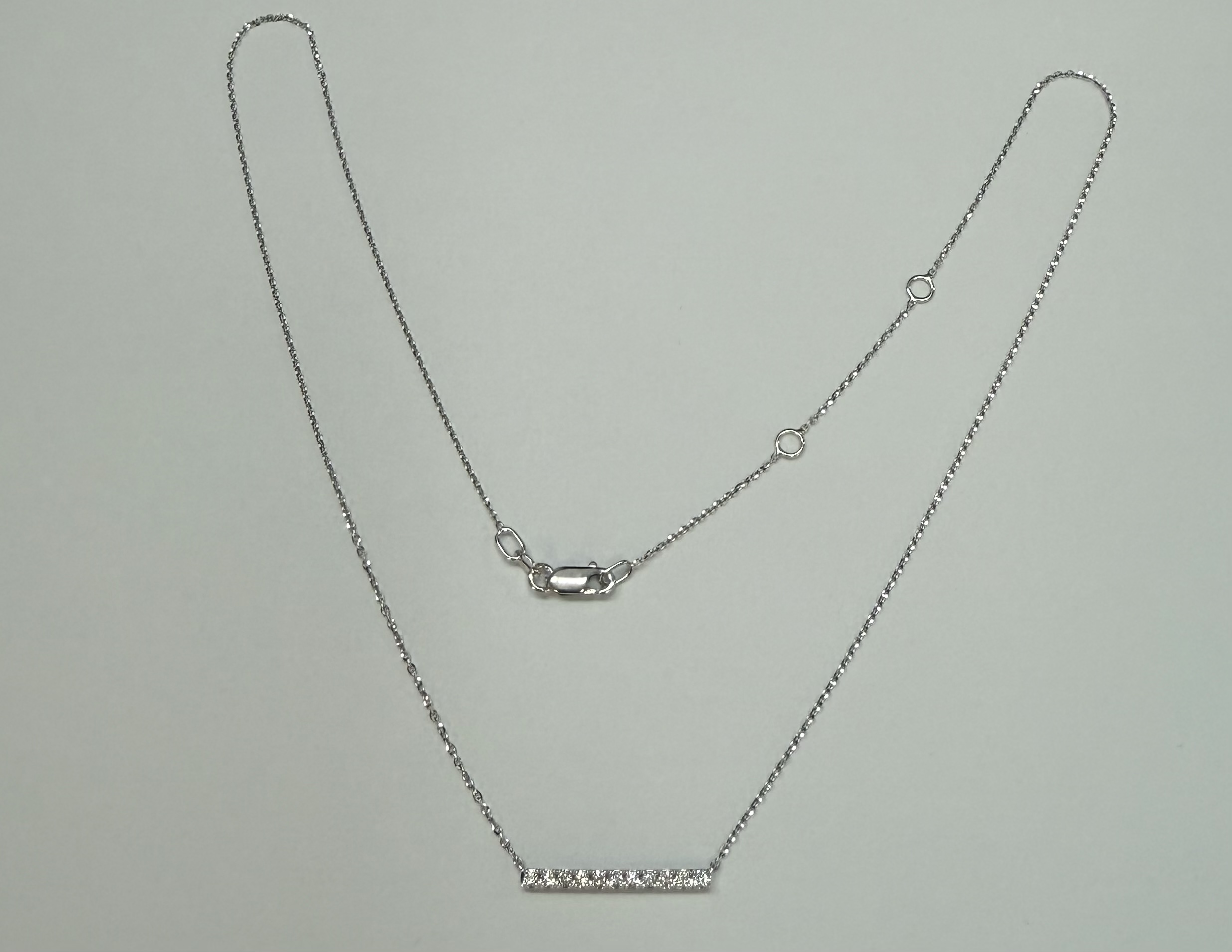 14k white gold delicate diamond bar necklace, with 8 genuine Round Brilliant Cut diamonds, which have a total combined weight of .20 cttw. These diamonds average G-H in color, and SI1 in clarity. The bar measures just over 3/4” in length. The necklace is adjustable 16-17-18″ in length, and it has an entire weight of 1.9 grams.