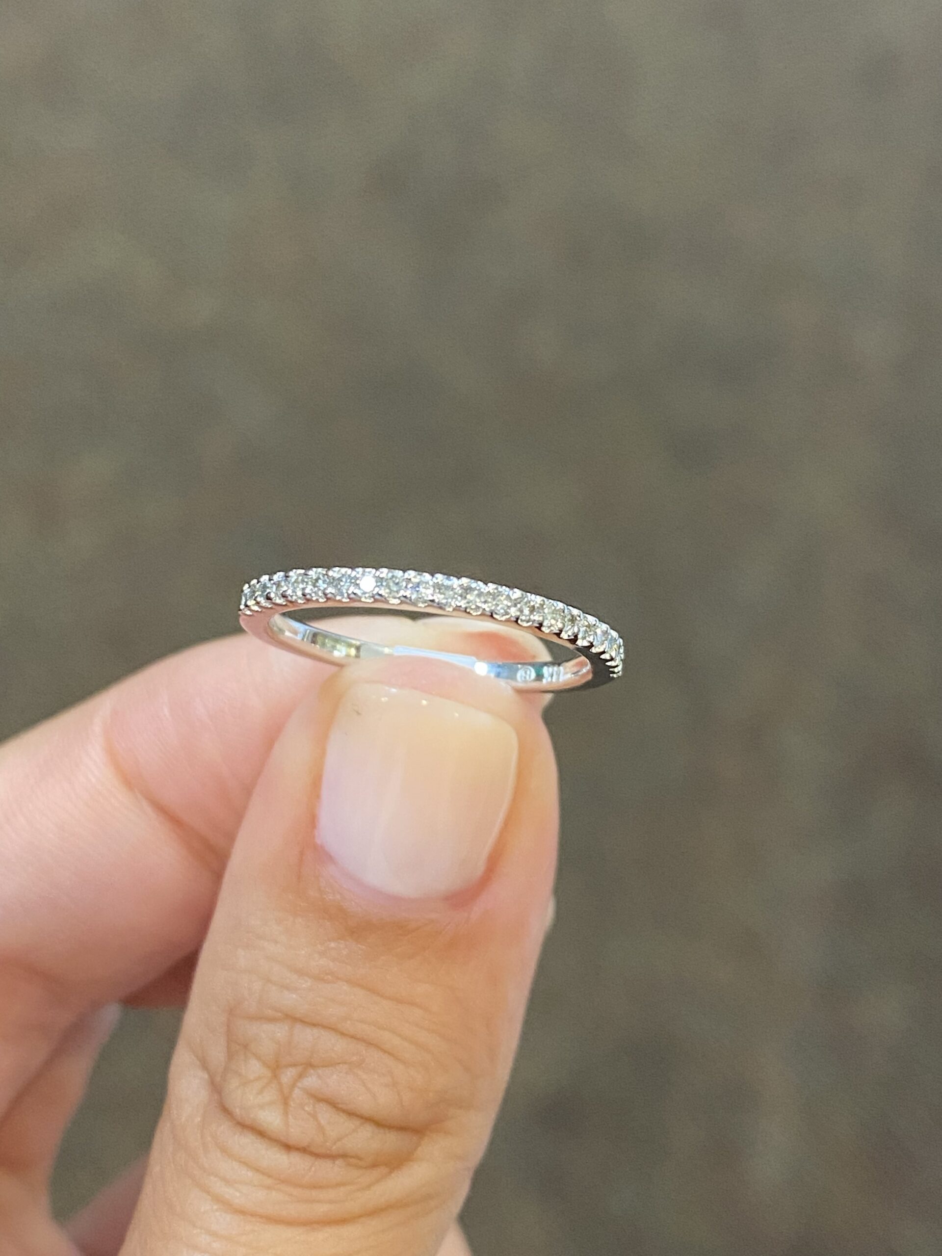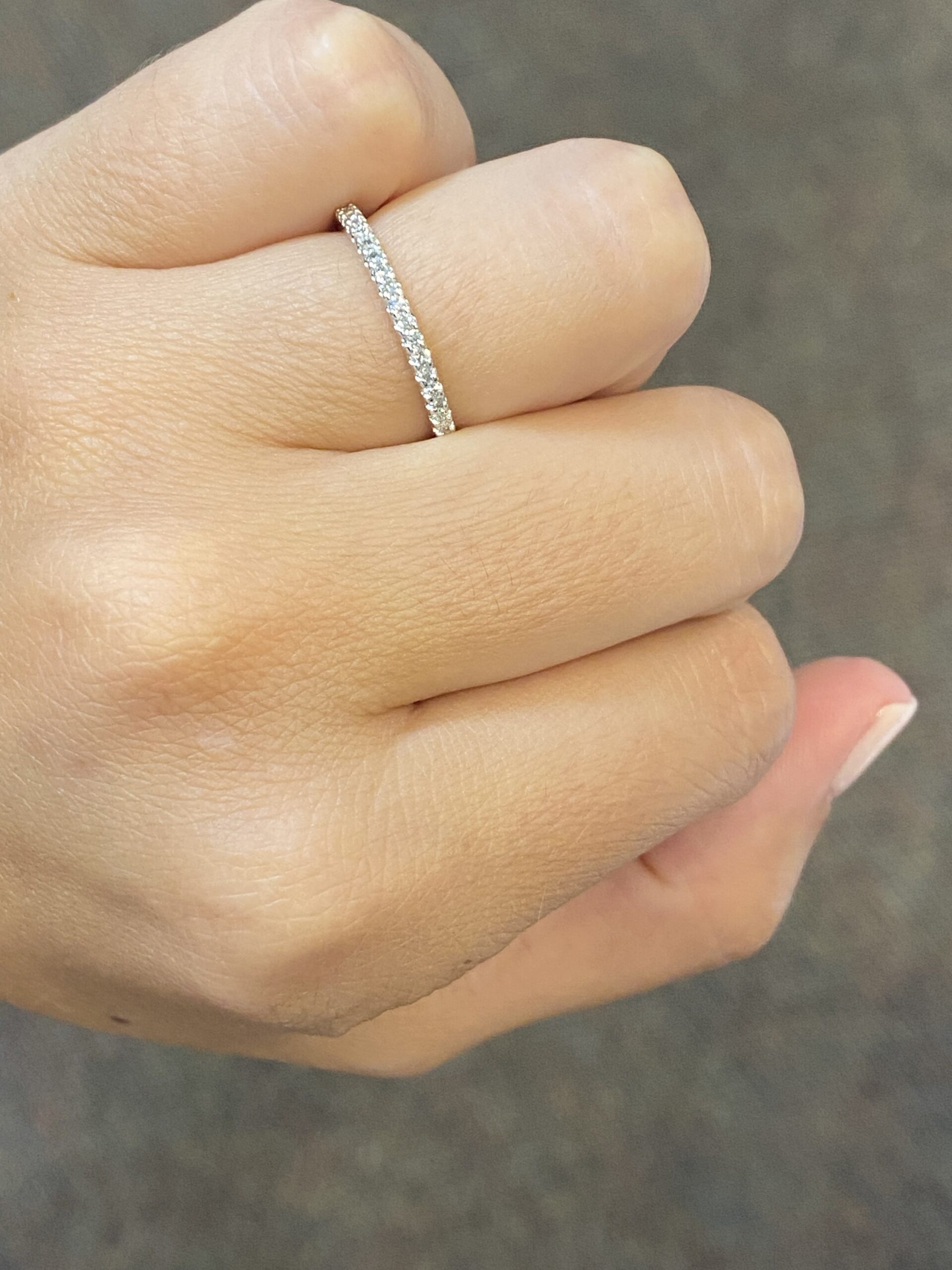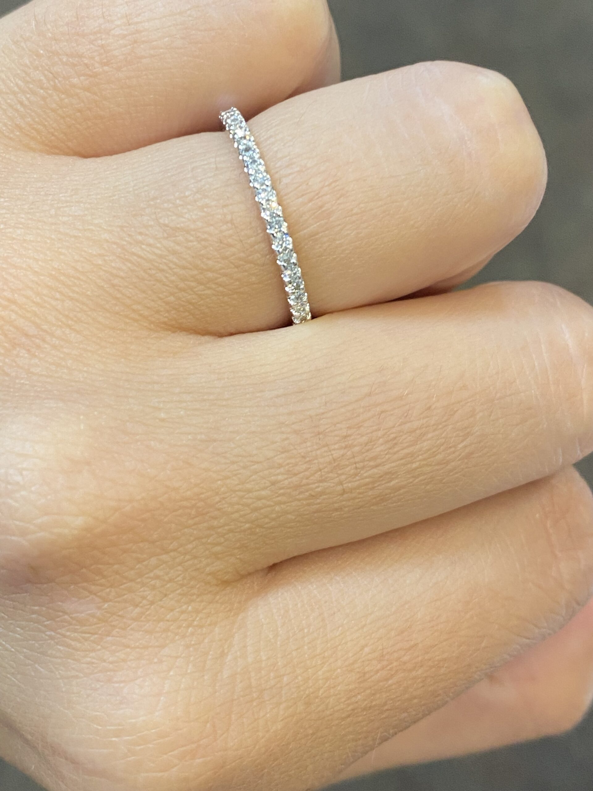 14k white gold 22 stone genuine .18 cttw Round Brilliant Cut diamond shared prong wedding band. These diamonds average G-H in color, and SI in clarity. These diamonds are nicely proportioned and finished. This ring has an entire weight of 1.9 grams. This ring is a finger size 6 1/2, but it can be reasonably altered at no additional charge. If you require a specific size please make note in the comments section at checkout.