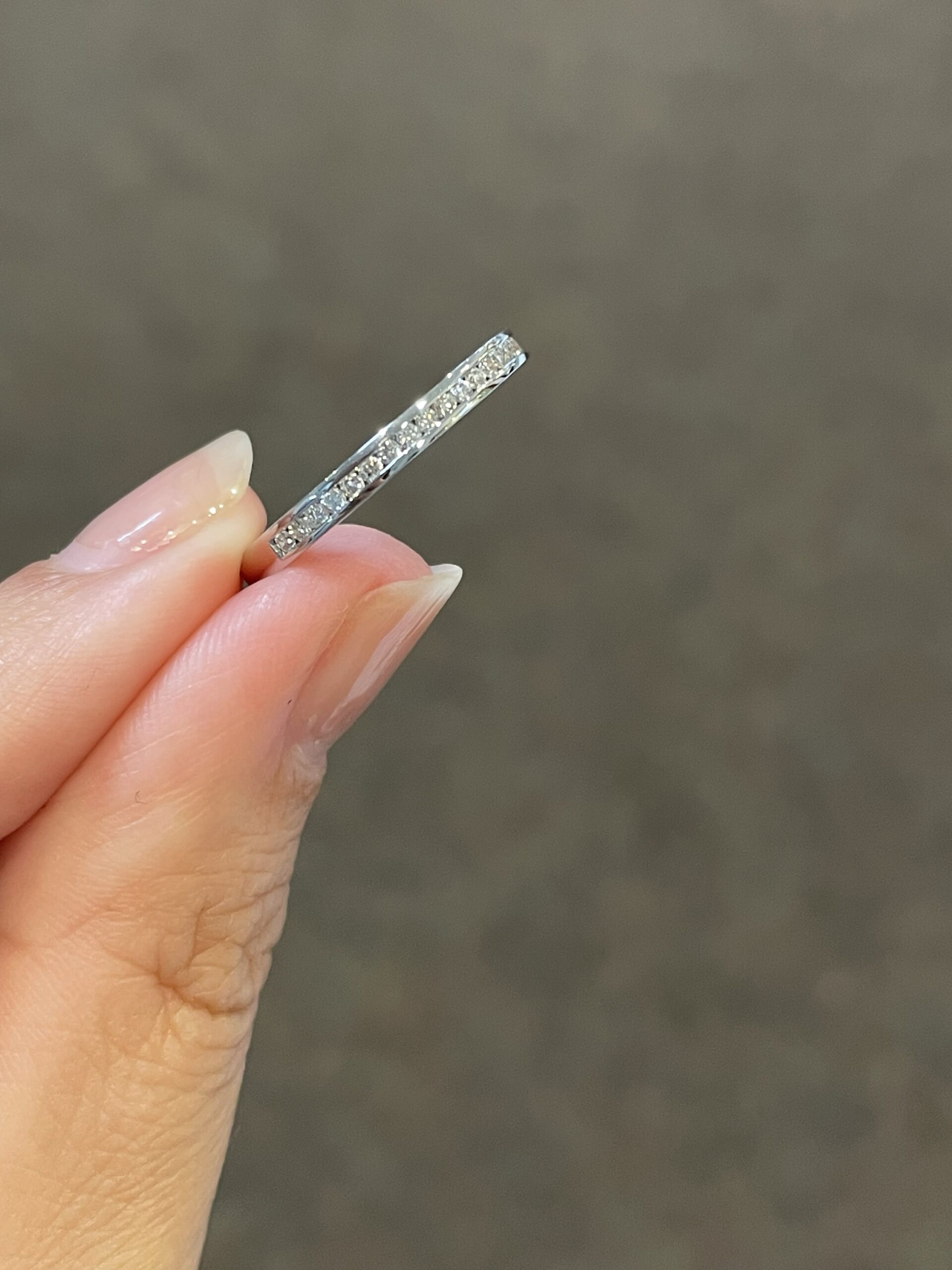 14k white gold delicate 23 stone genuine Round Brilliant Cut Diamond channel set band totaling .22 Cttw. These diamonds average G-H in color, and SI1 in clarity. These diamonds are nicely proportioned and well finished. This ring measures 2.5 mm in width, and it has an entire weight of 3.0 grams. This ring is a finger size 6 1/4, but it can be reasonably sized at no charge. If you require a specific size please make note in the comments section at checkout.
