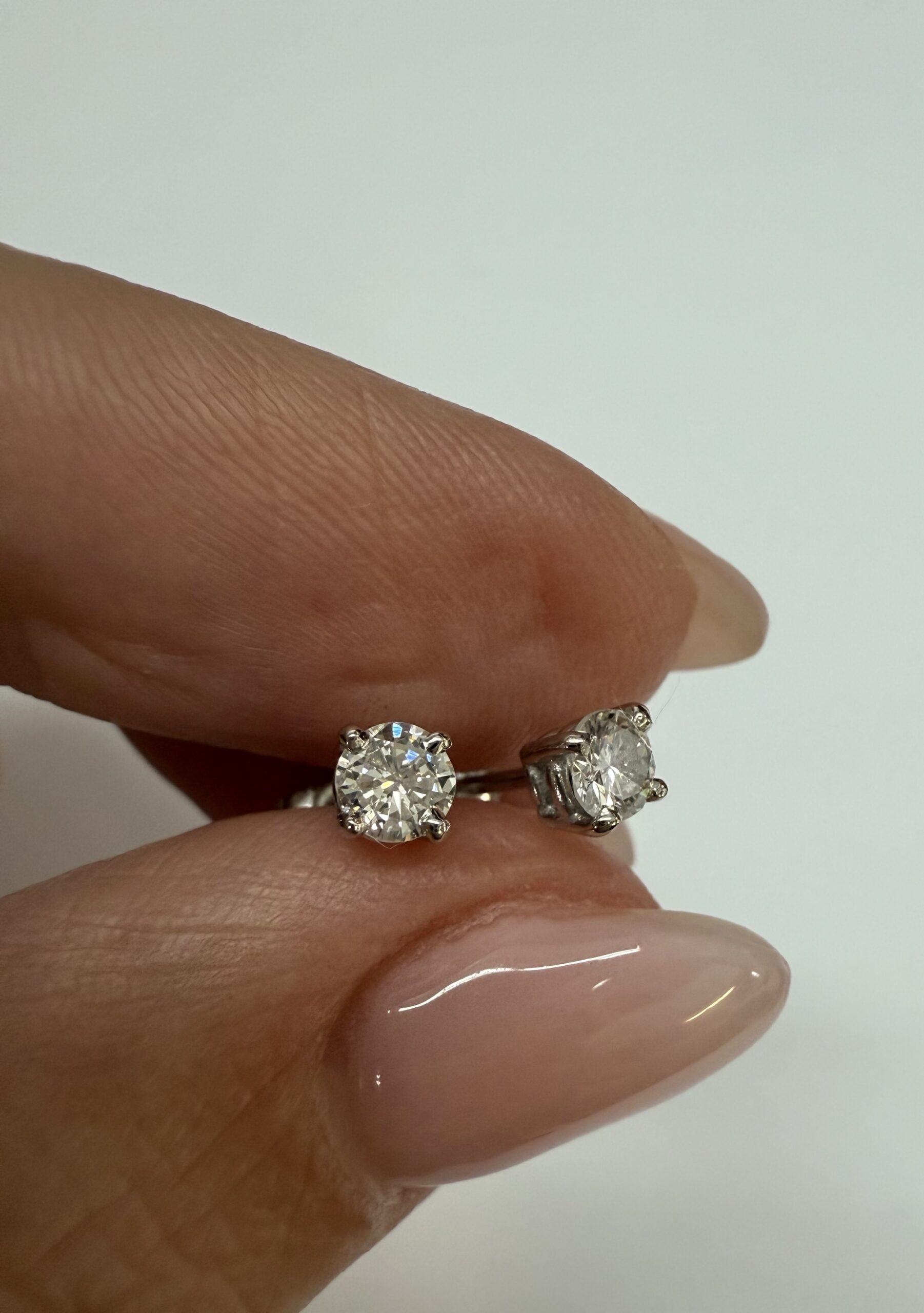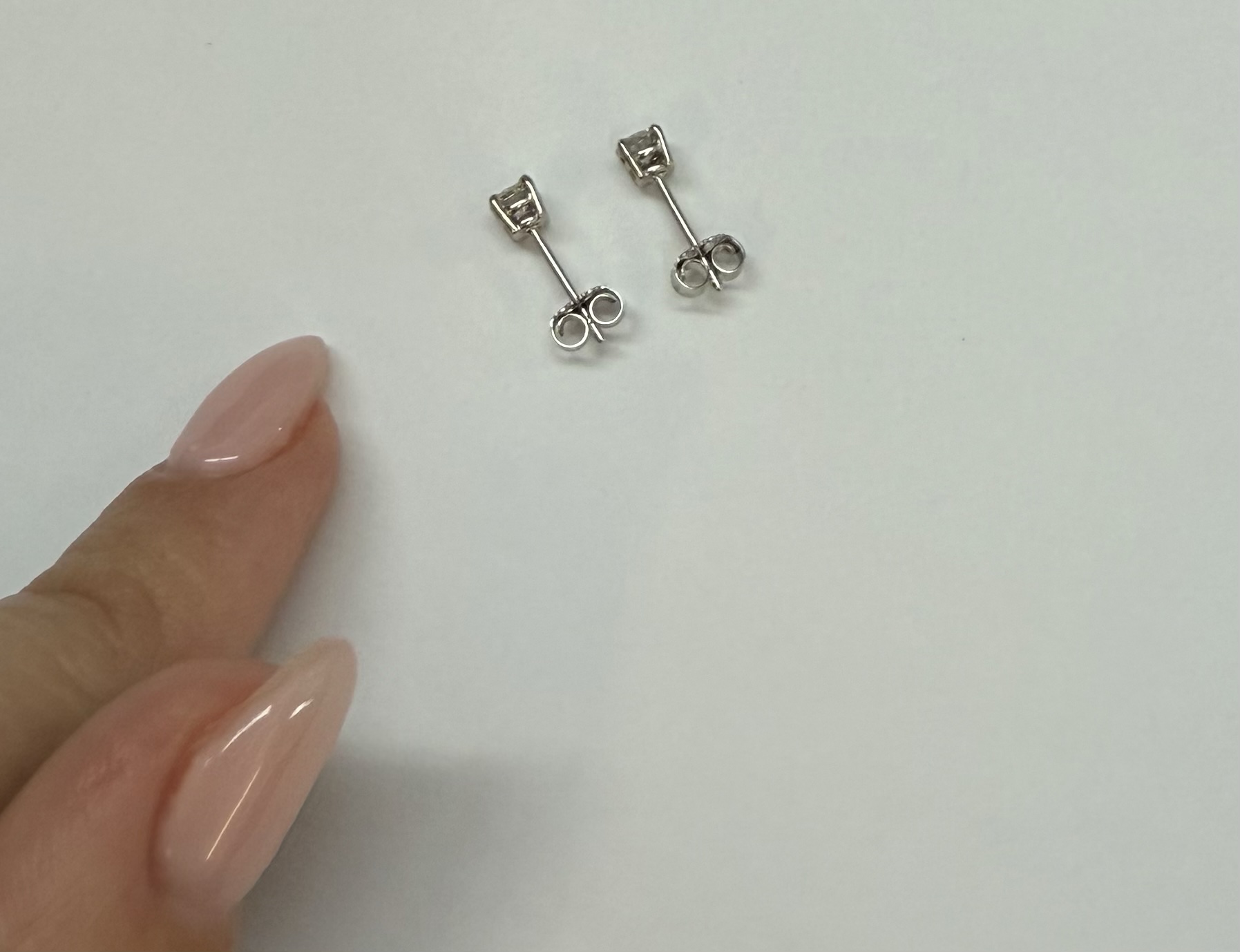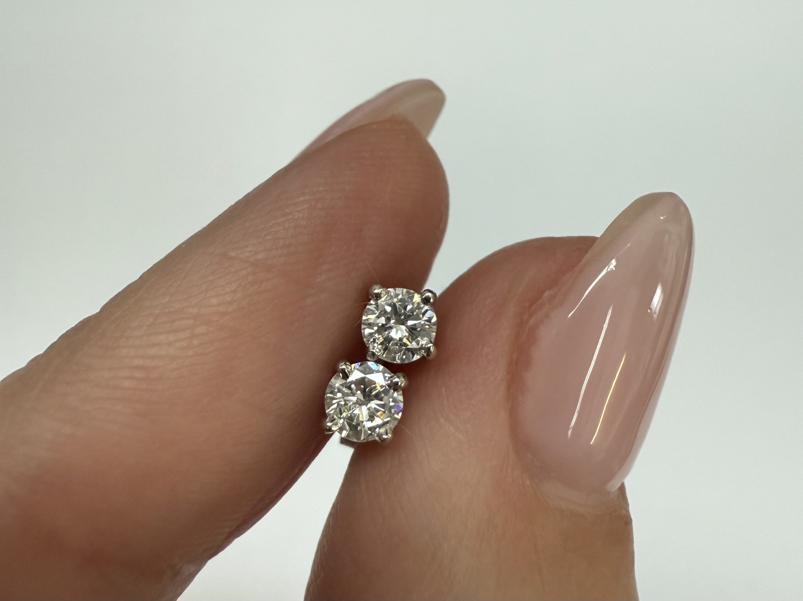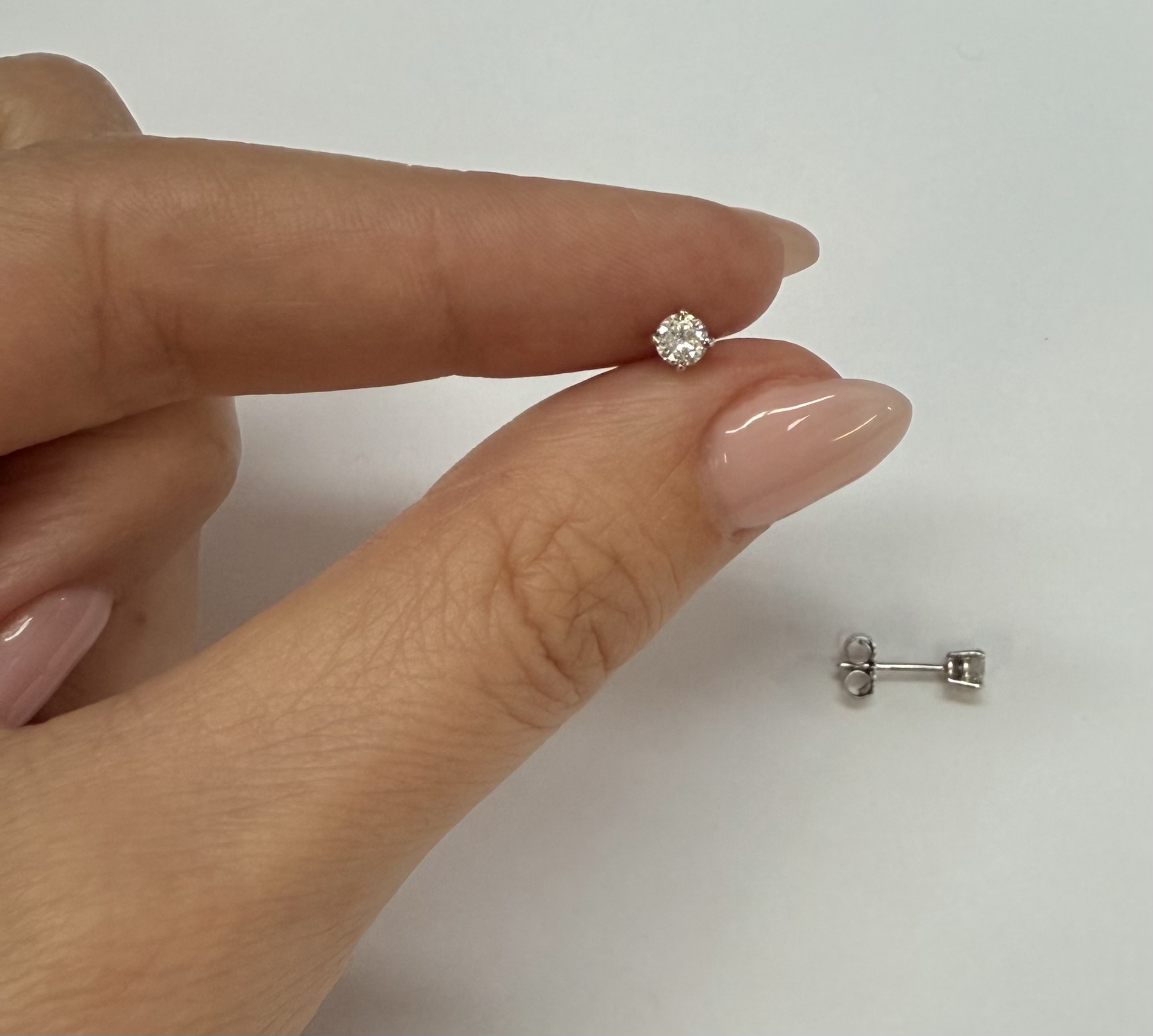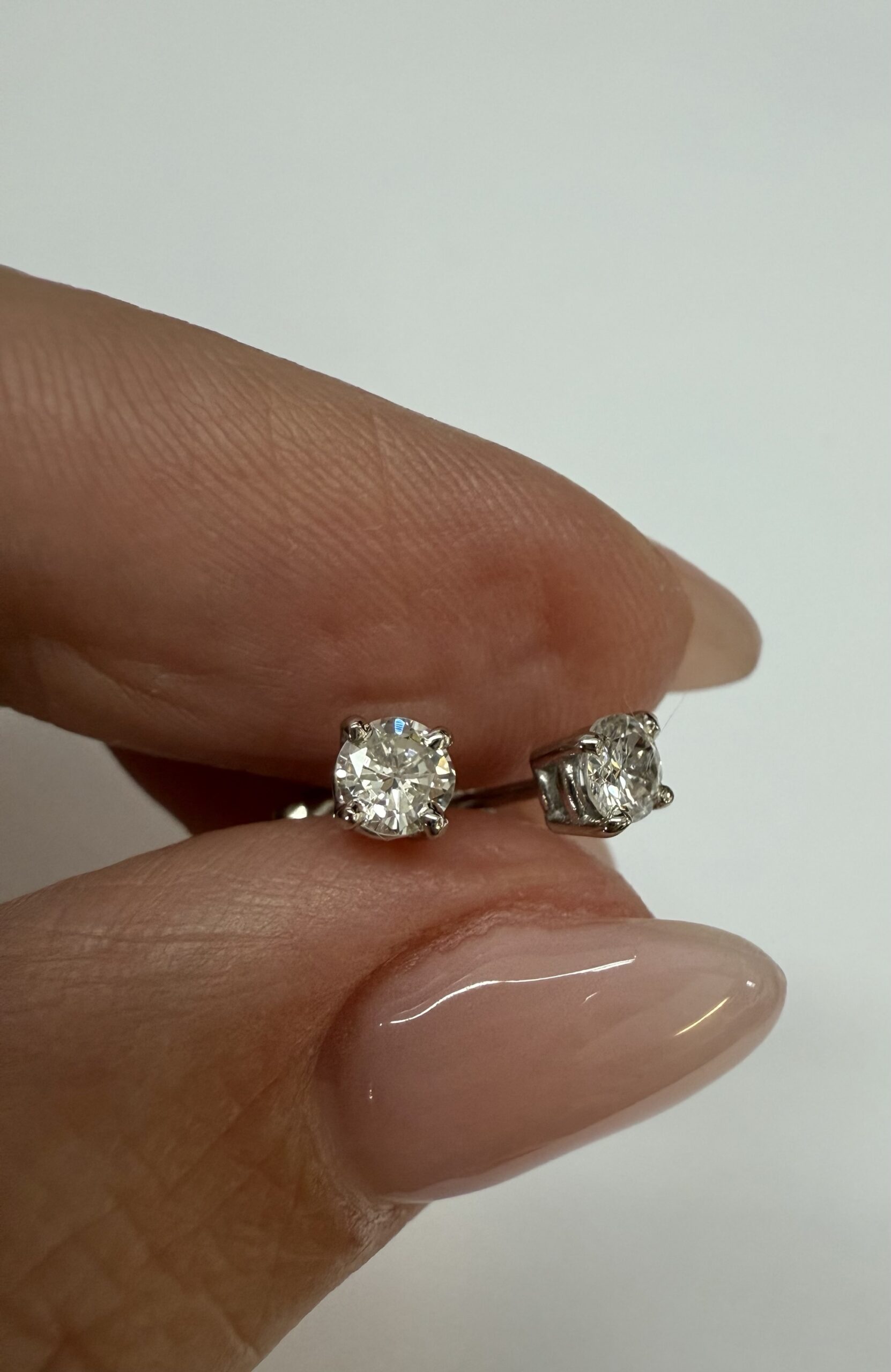 14k white gold four prong basket set genuine .35 cttw Round Brilliant Cut diamond stud earrings. These diamonds have a color grade of H, and a clarity grade of SI1. These earrings have an entire weight of 0.7 grams.