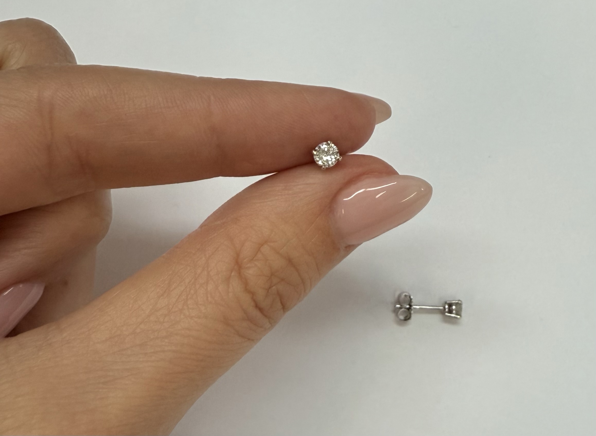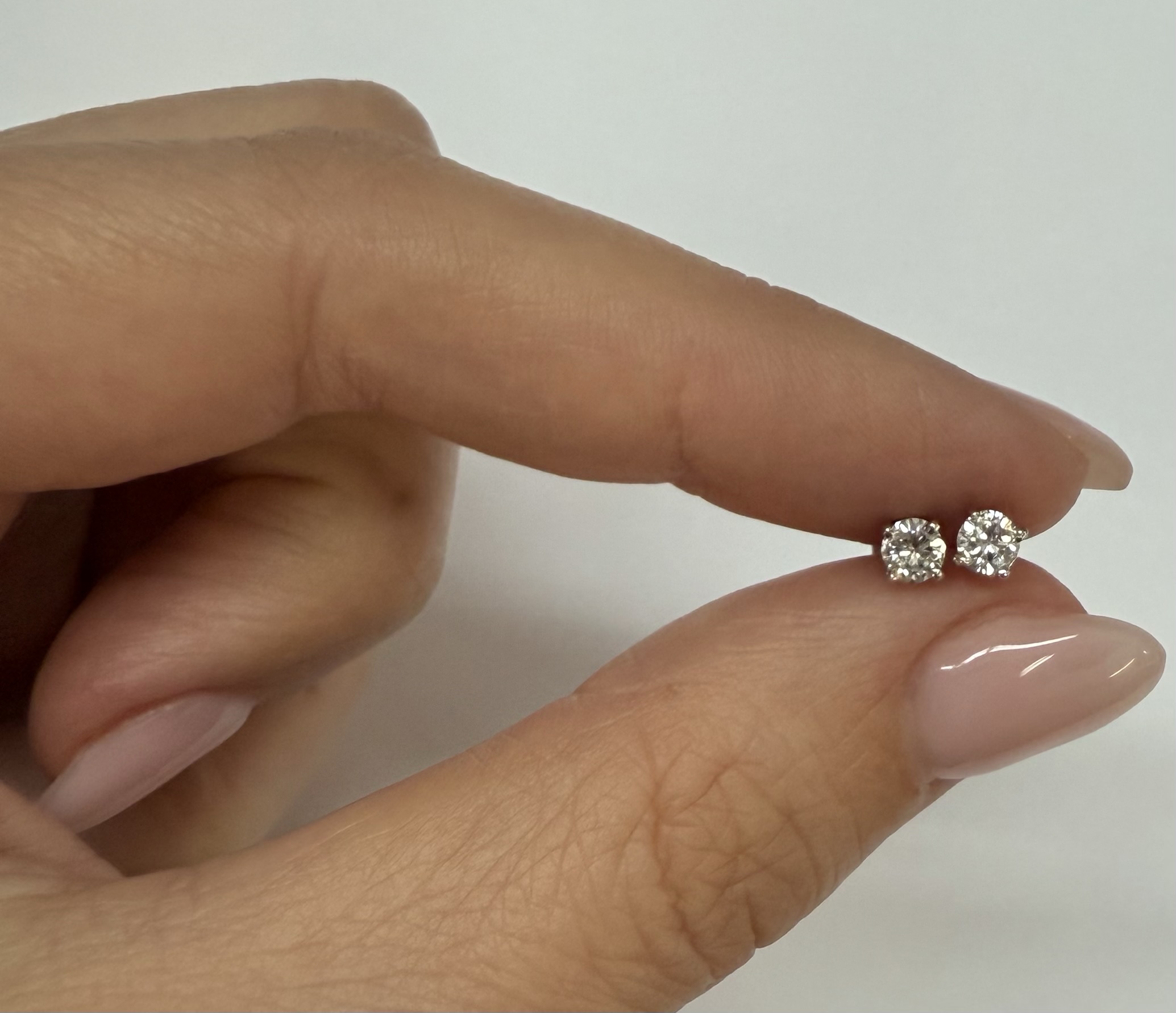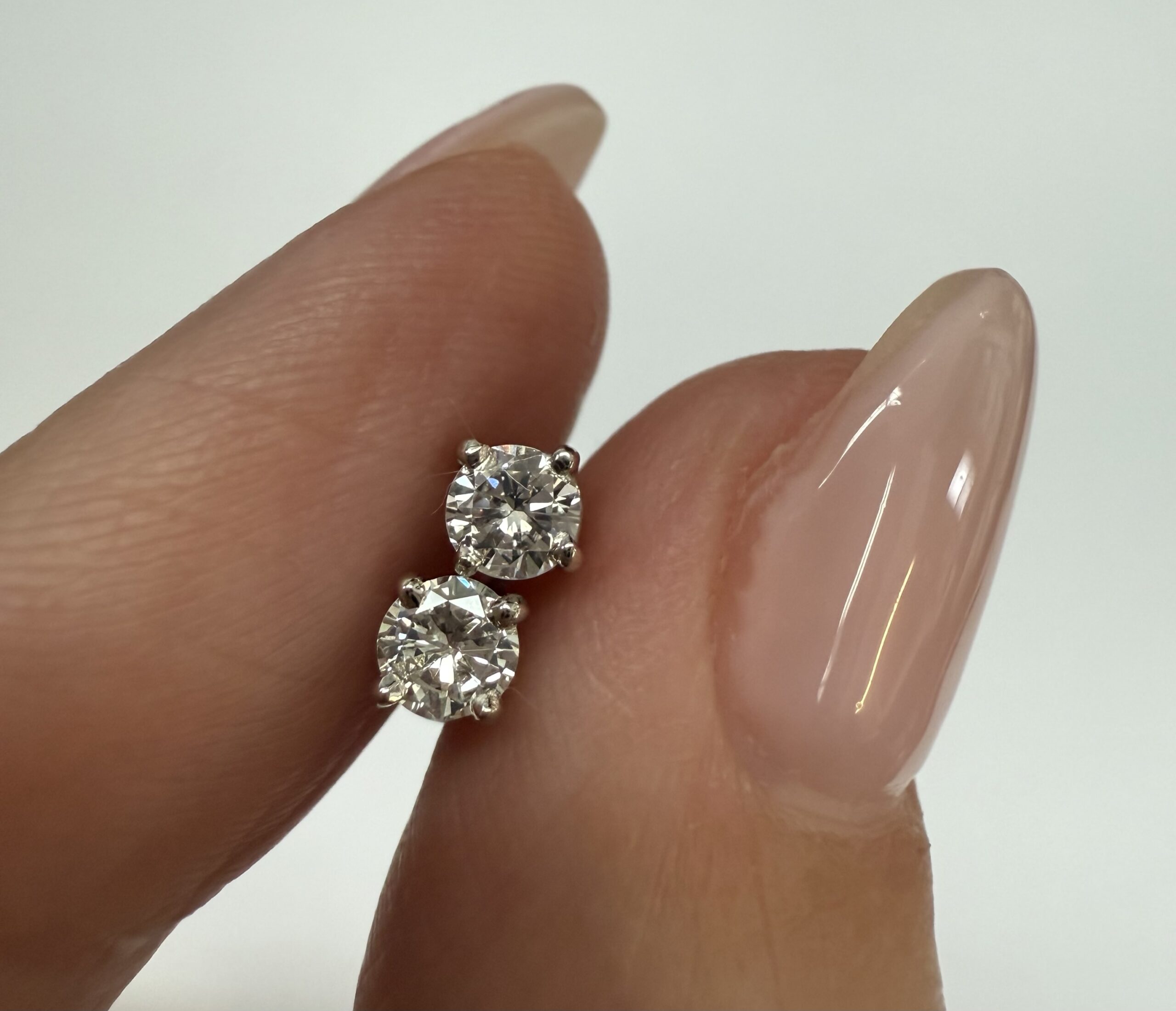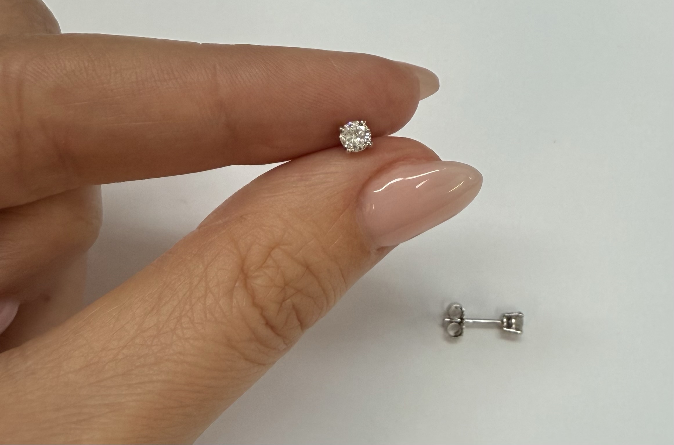 14k white gold four prong basket set genuine .35 cttw Round Brilliant Cut diamond stud earrings. These diamonds have a color grade of H, and a clarity grade of SI1. These earrings have an entire weight of 0.7 grams.
