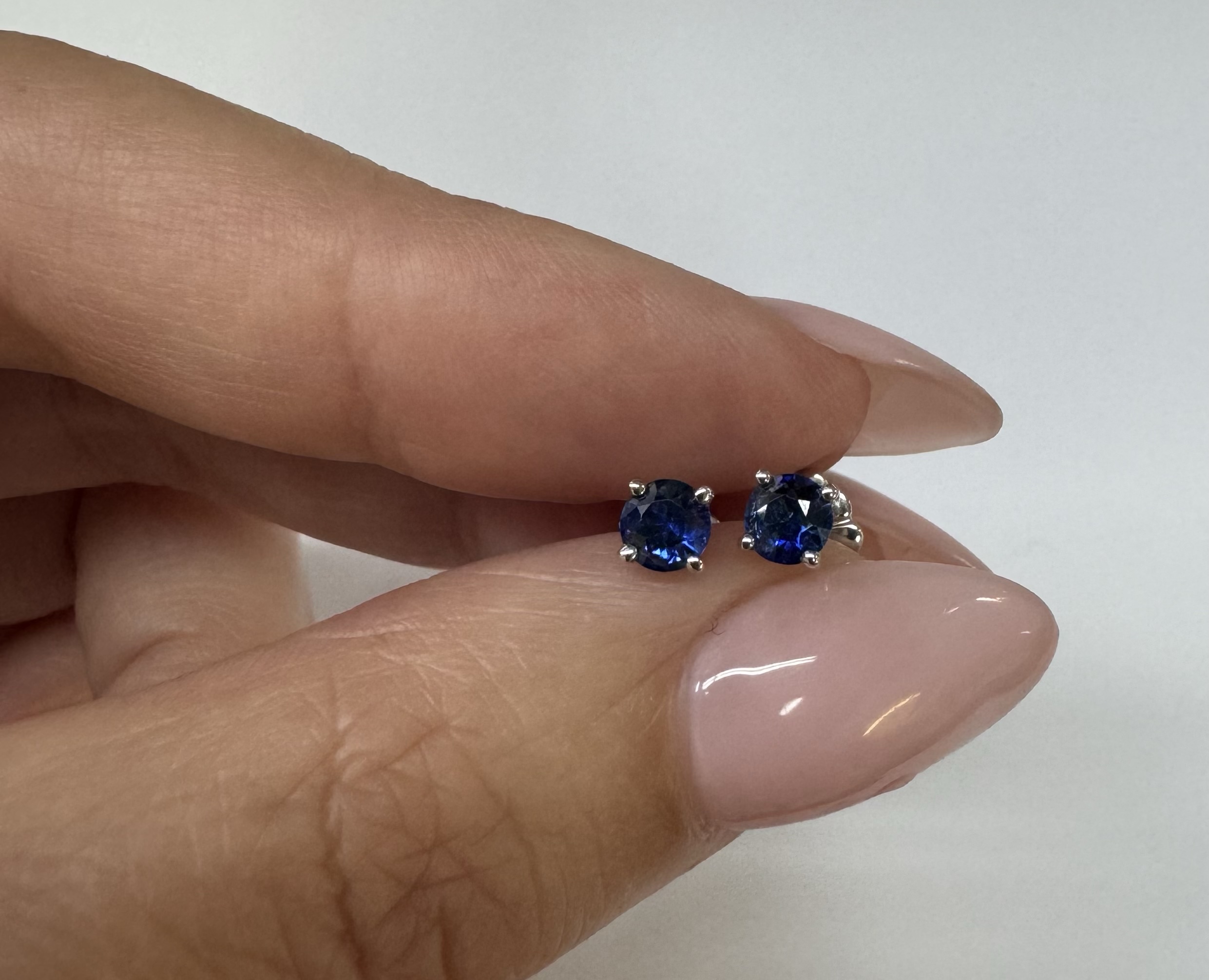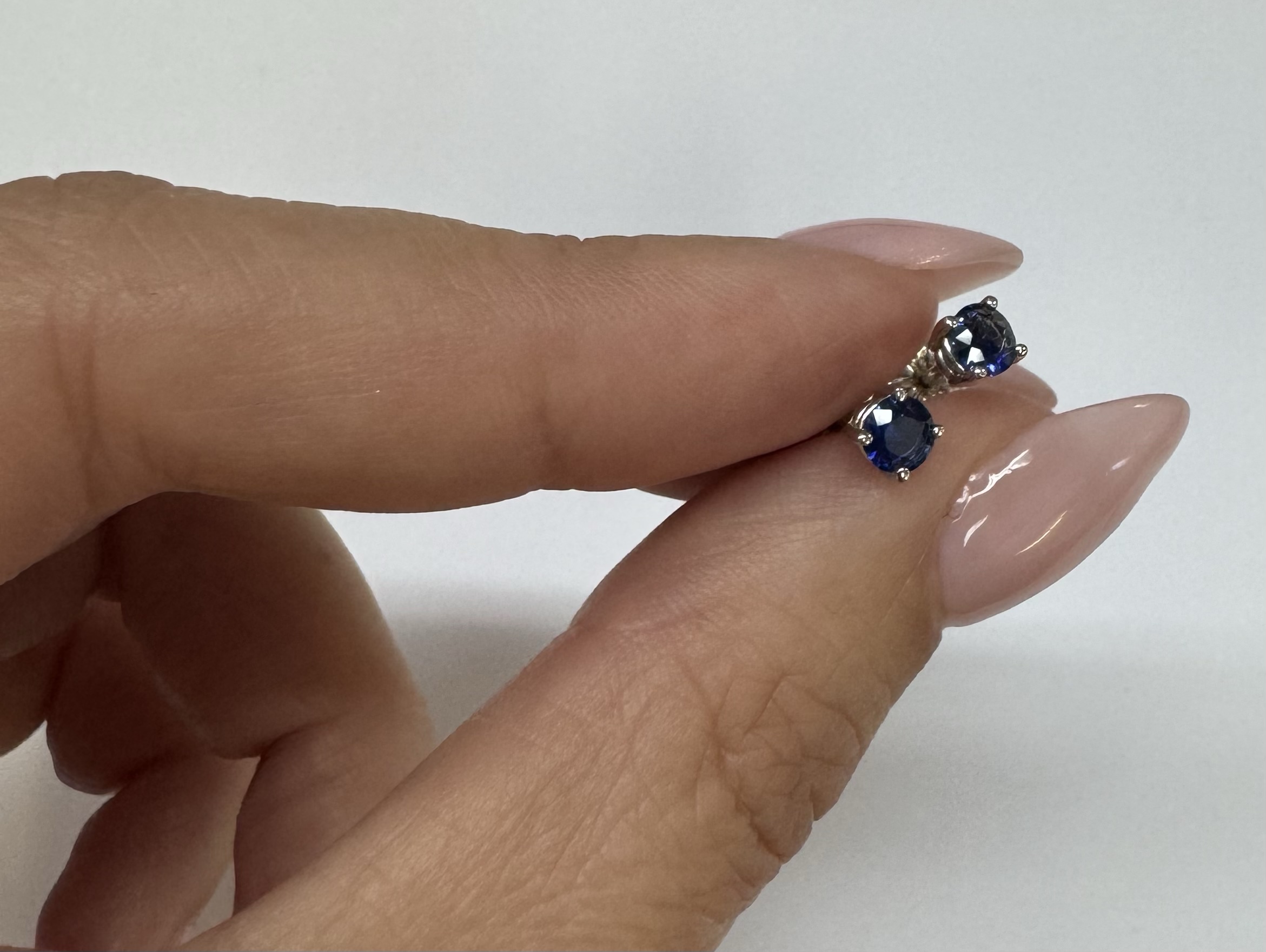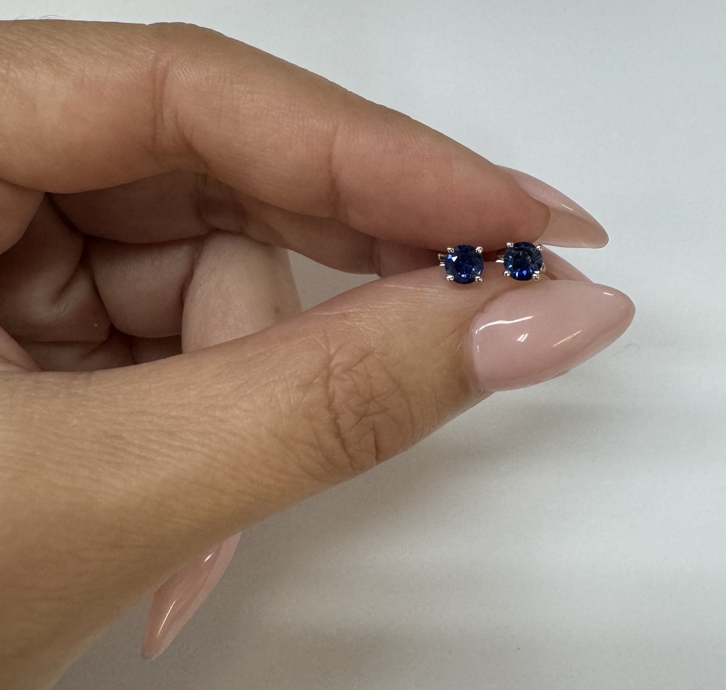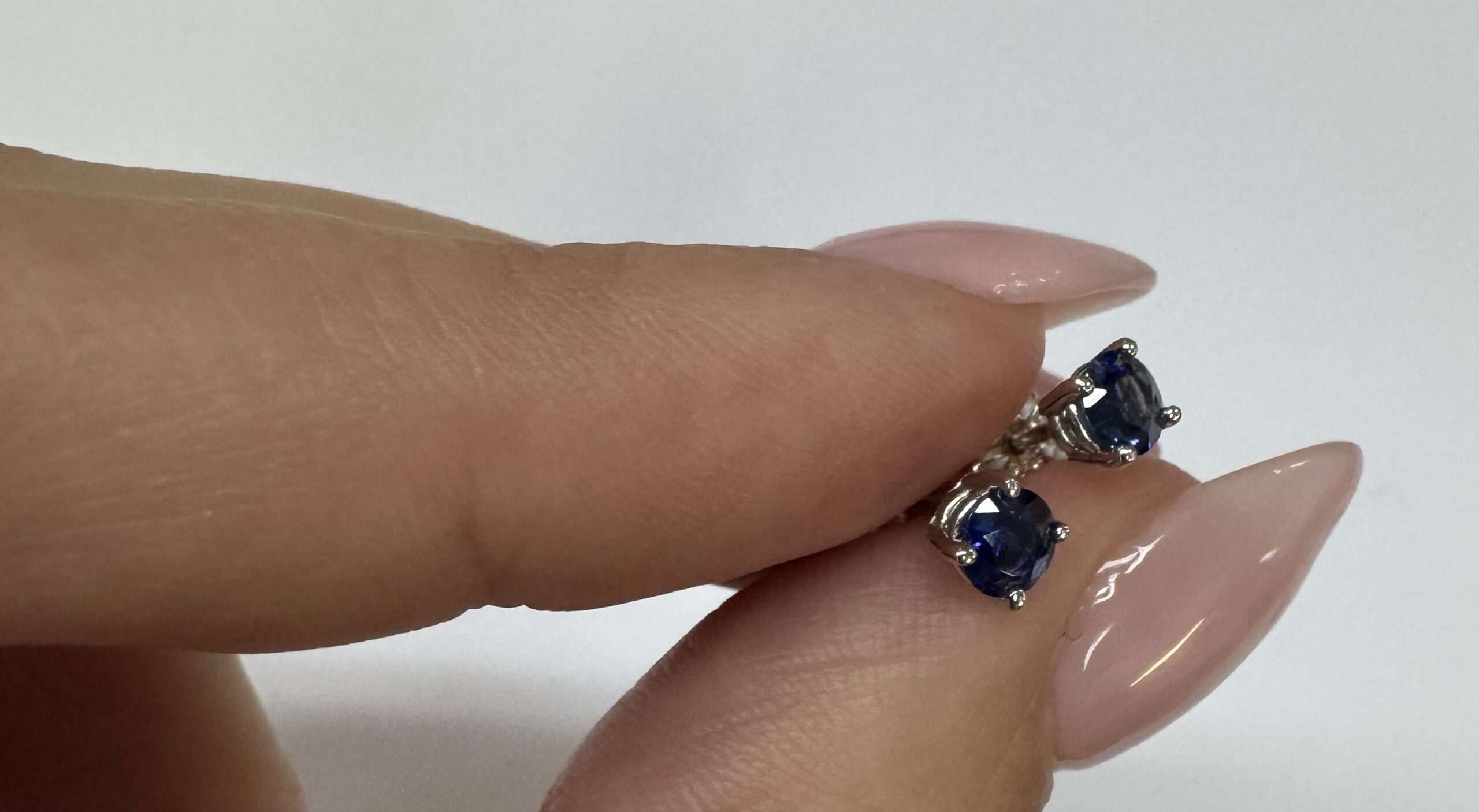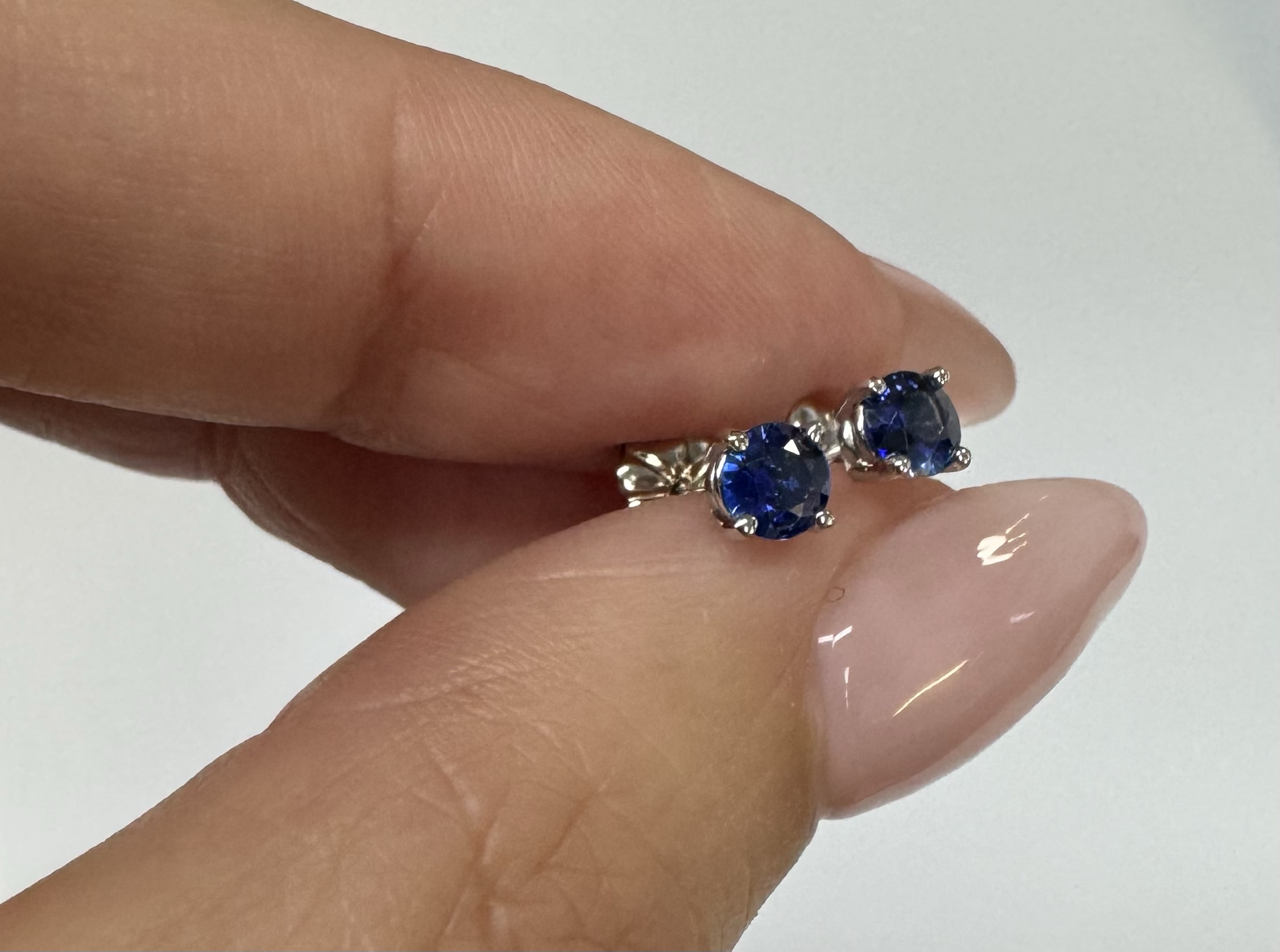 14k white gold genuine round, faceted .54 cttw Ceylon Sapphire stud earrings with four prong basket style mountings. These earrings have an entire weight of 0.8 grams.