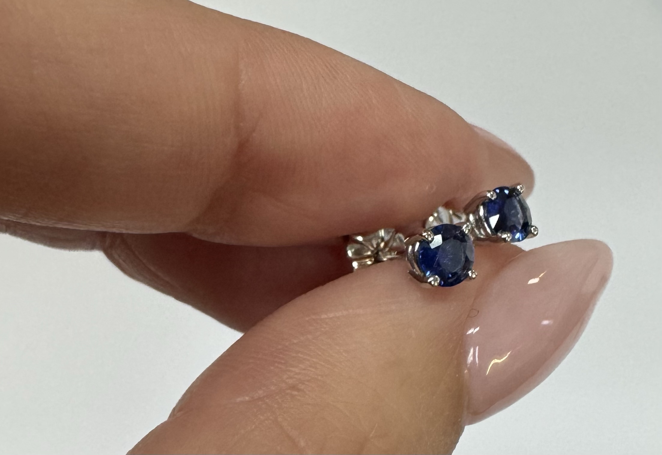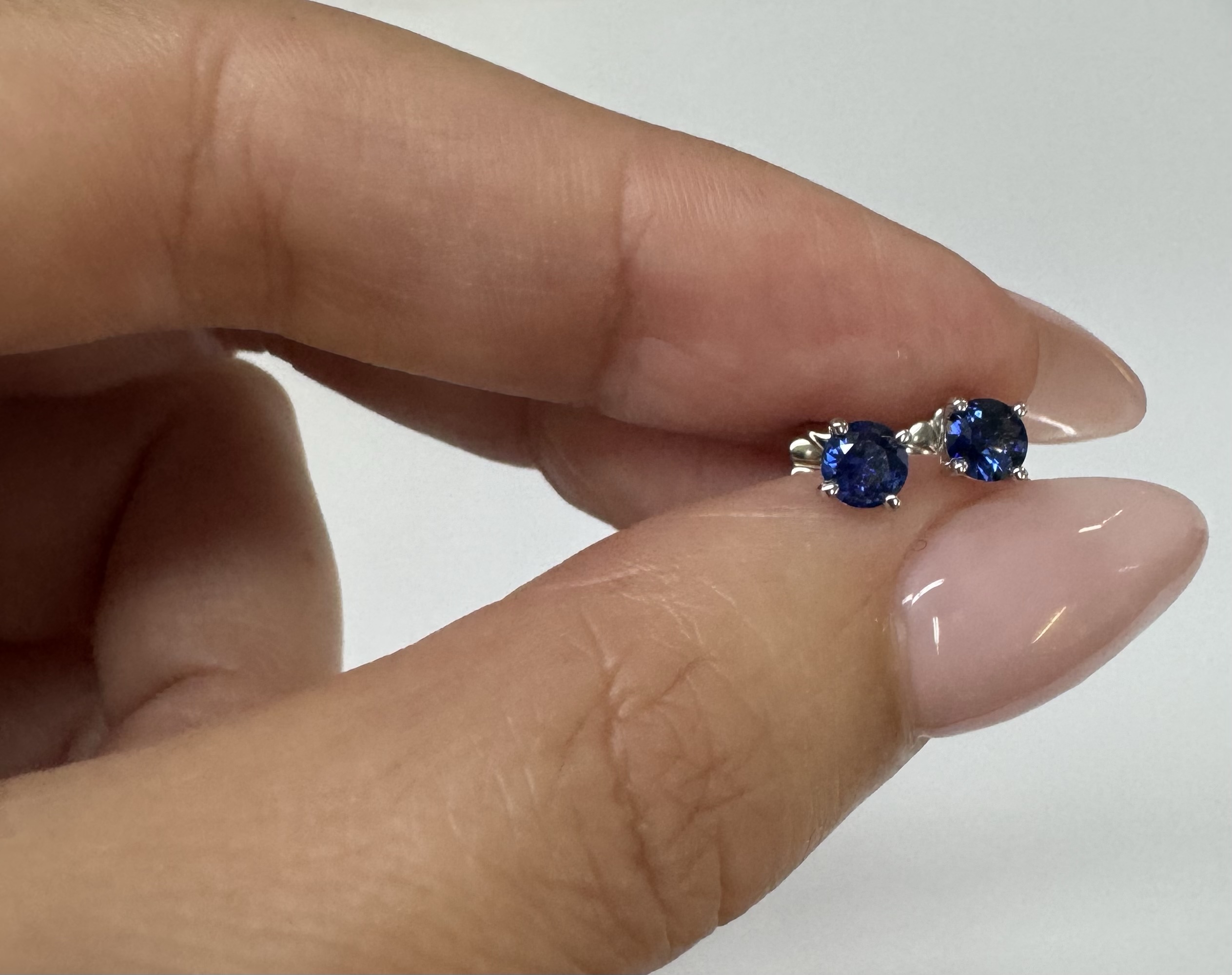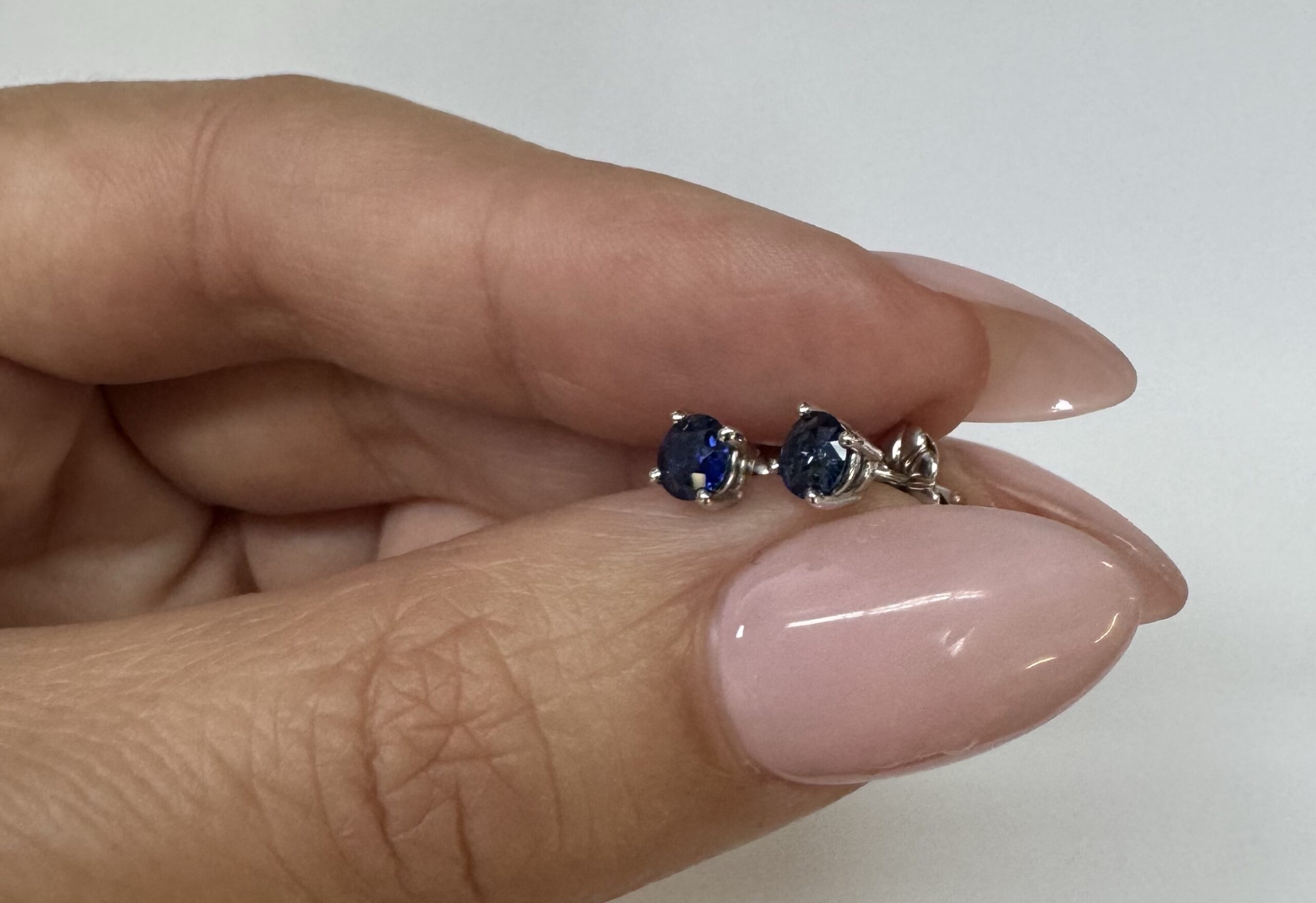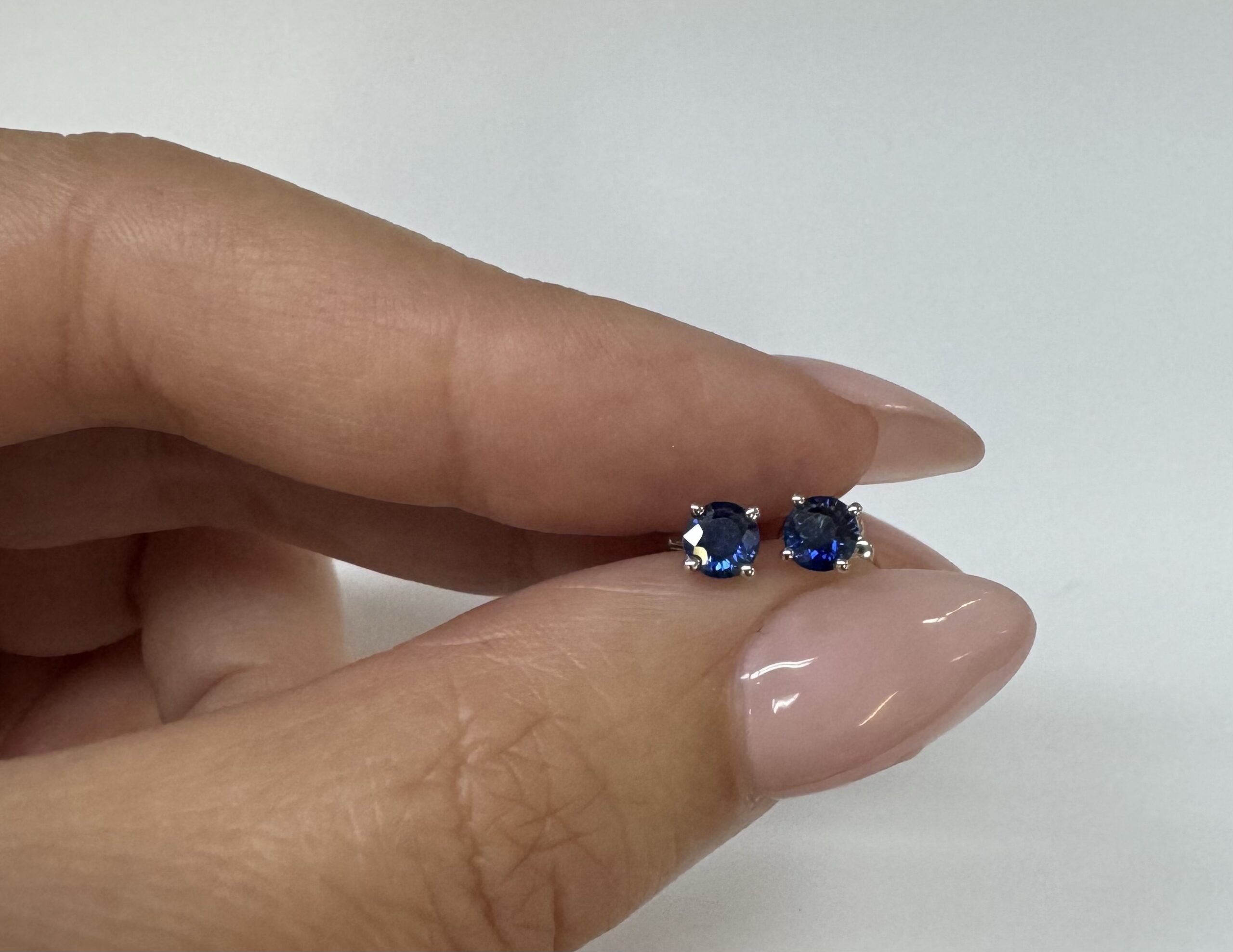 14k white gold genuine round, faceted .54 cttw Ceylon Sapphire stud earrings with four prong basket style mountings. These earrings have an entire weight of 0.8 grams.