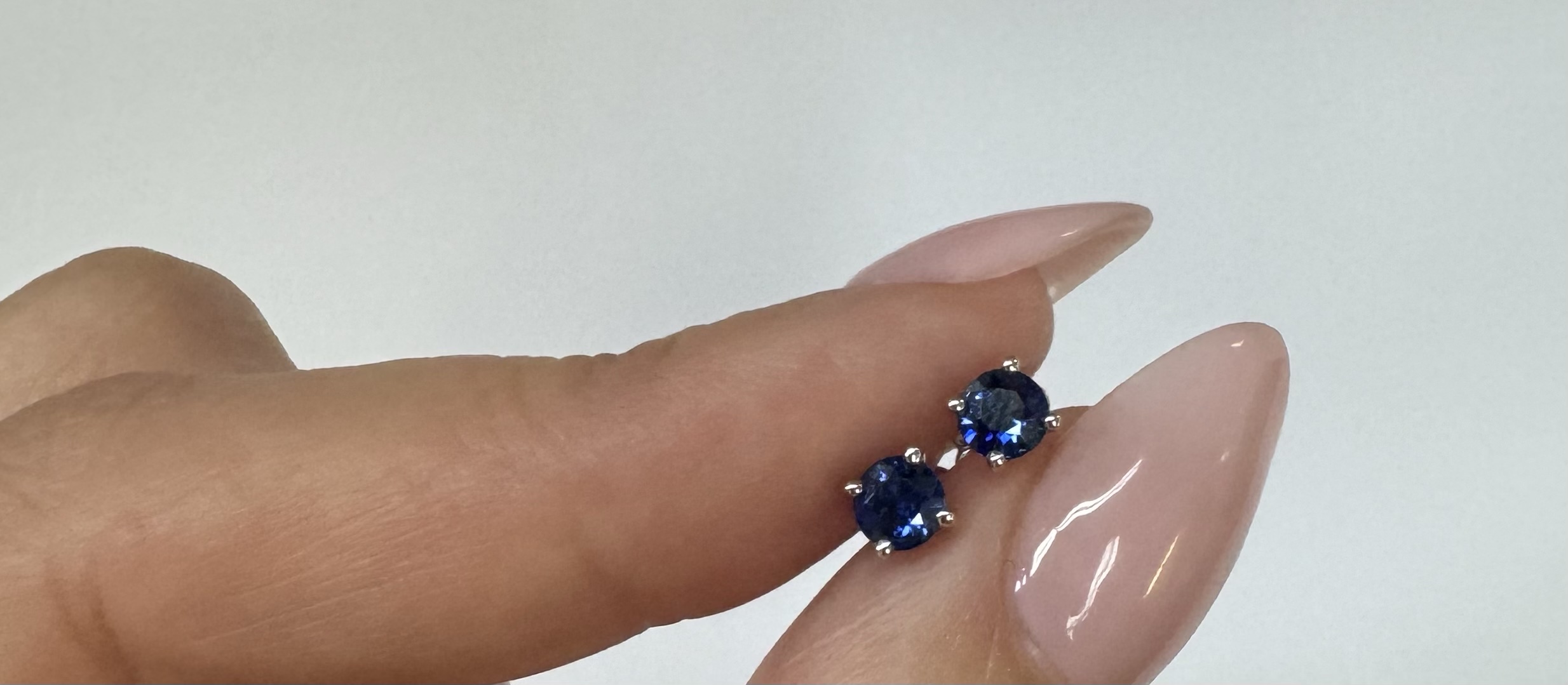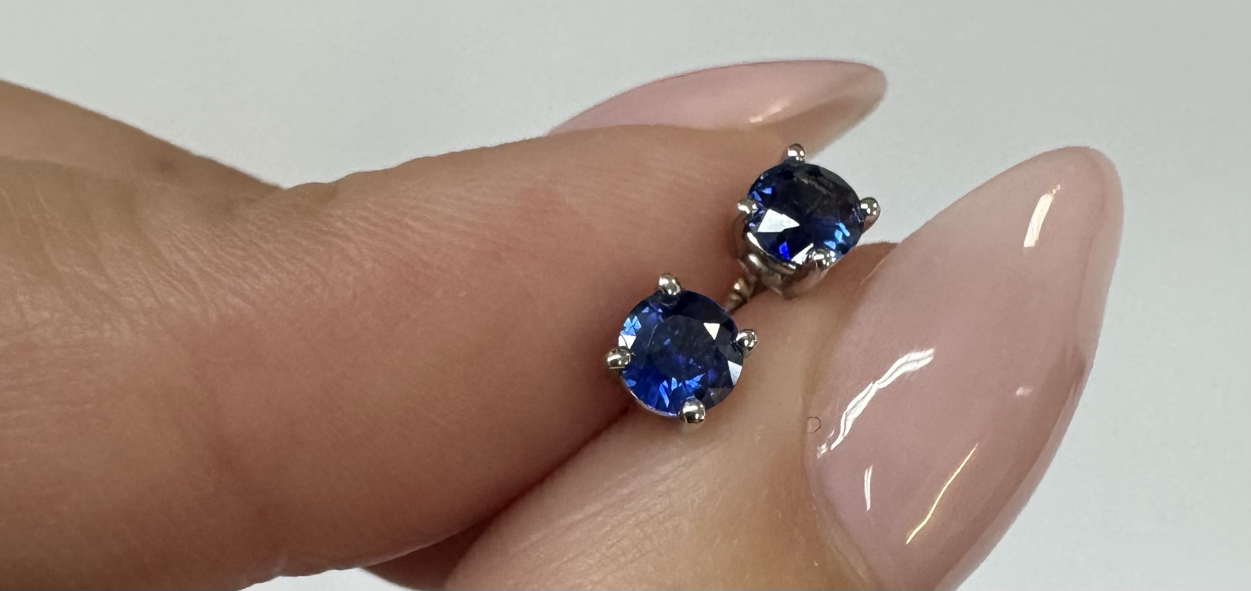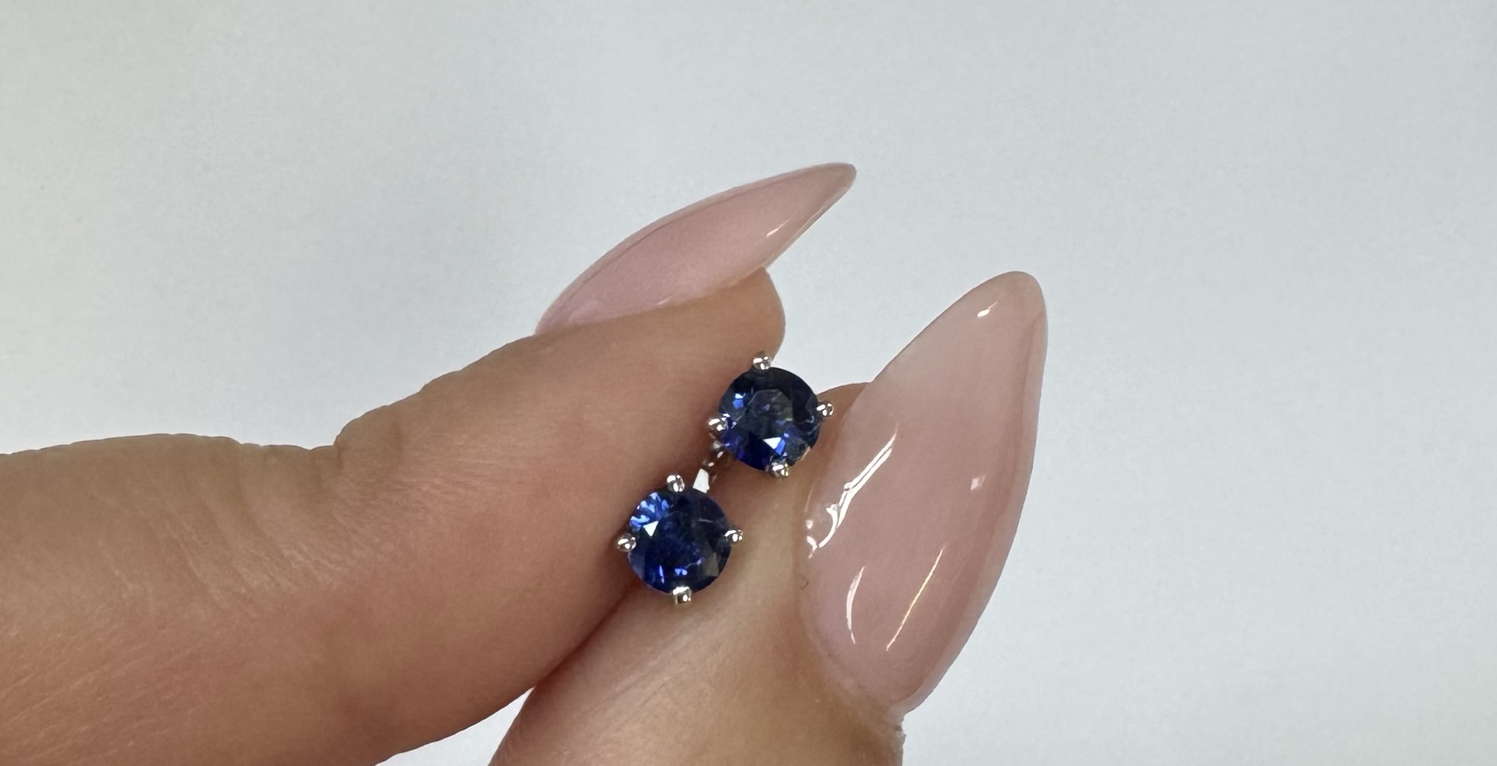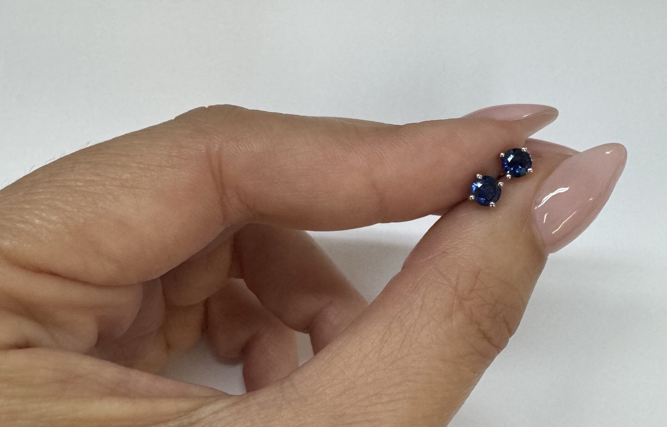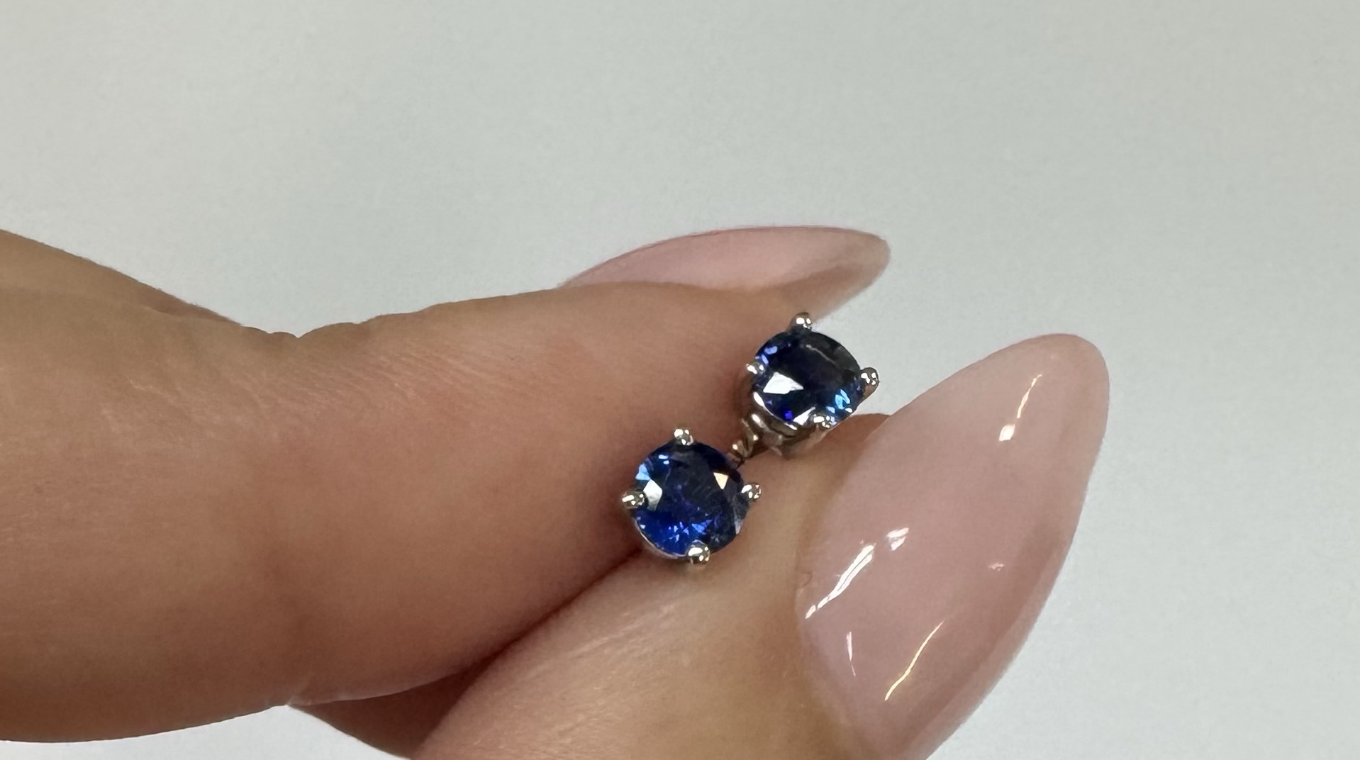 14k white gold genuine round, faceted .54 cttw Ceylon Sapphire stud earrings with four prong basket style mountings. These earrings have an entire weight of 0.8 grams.