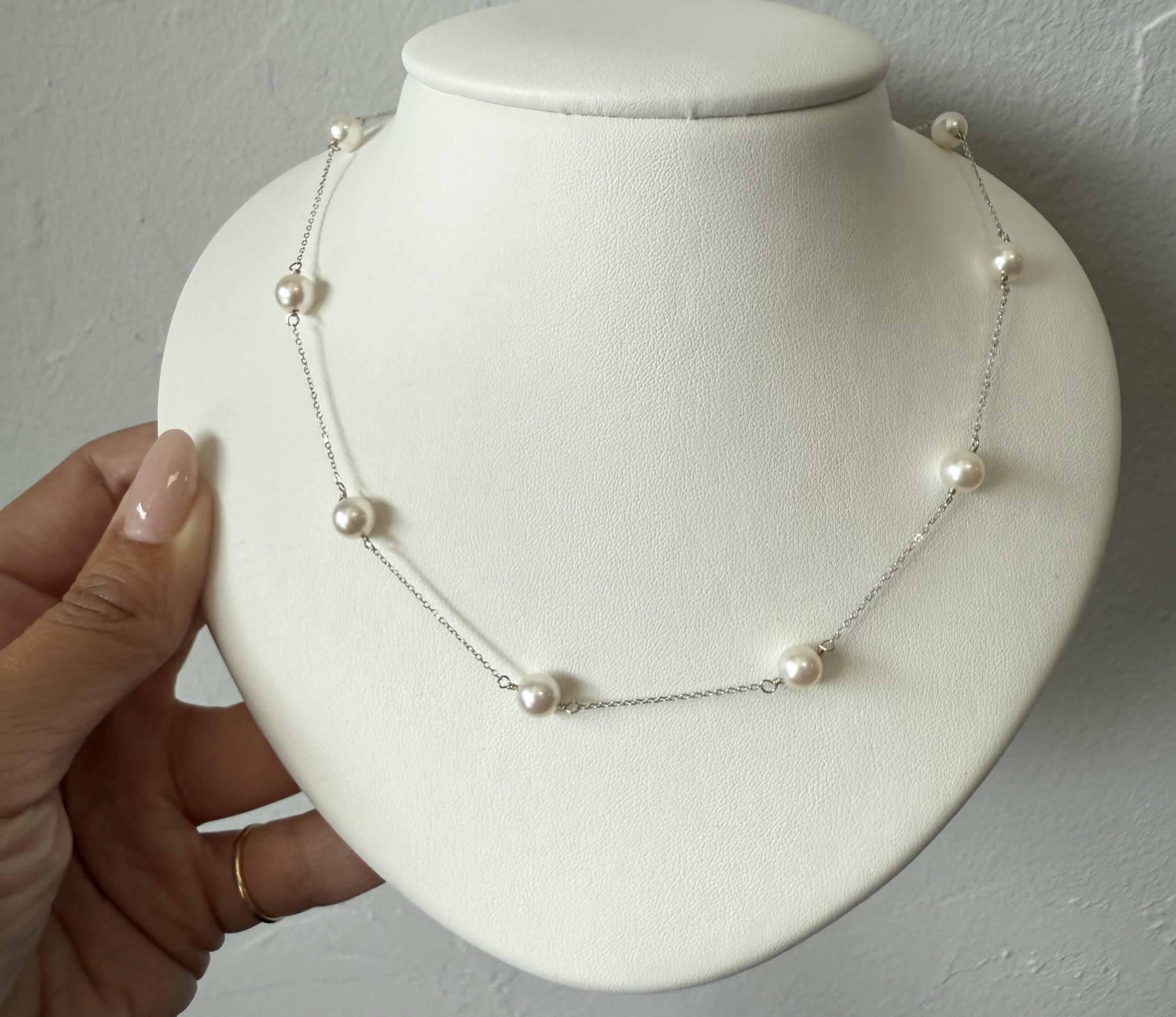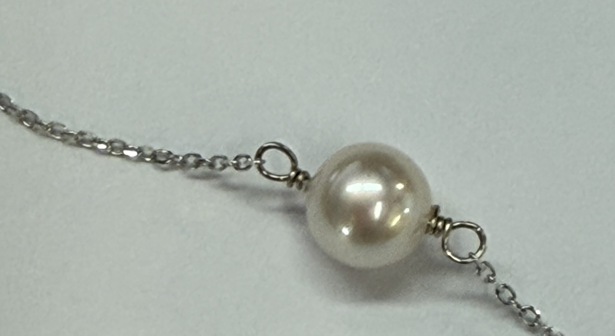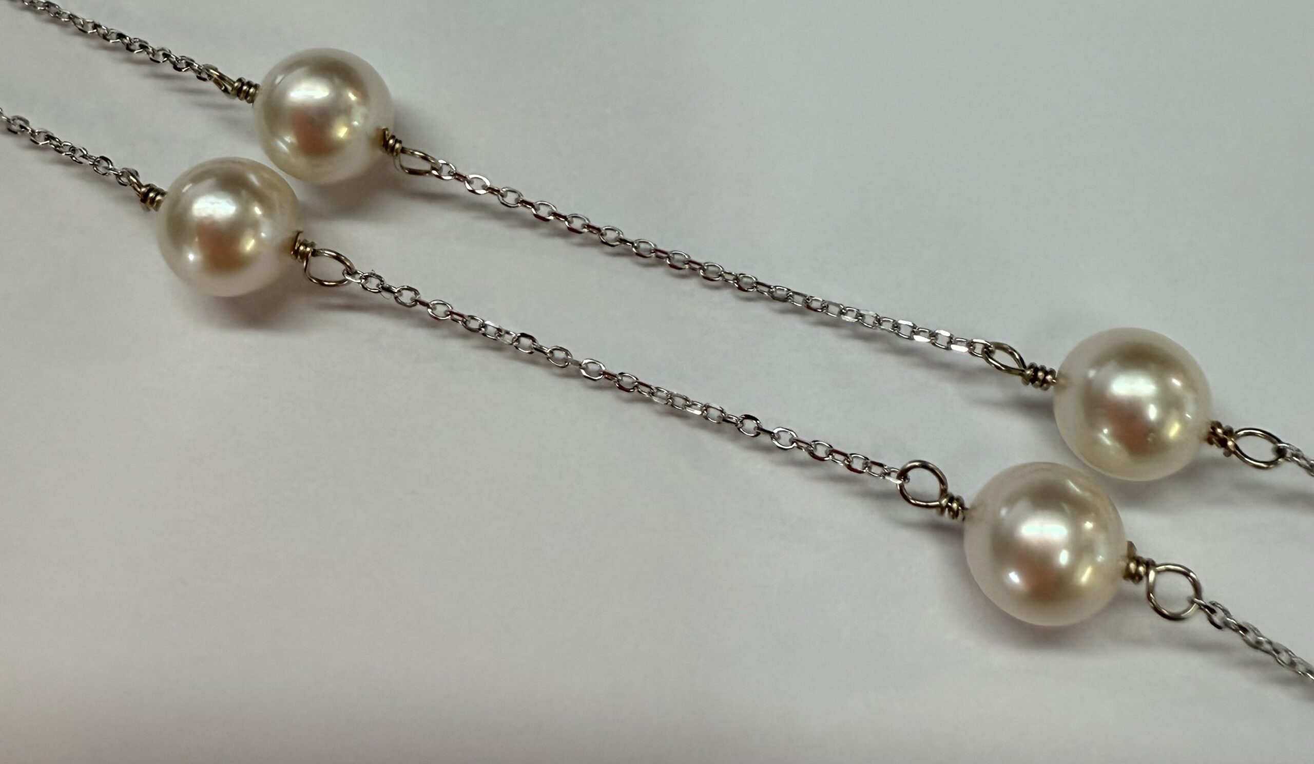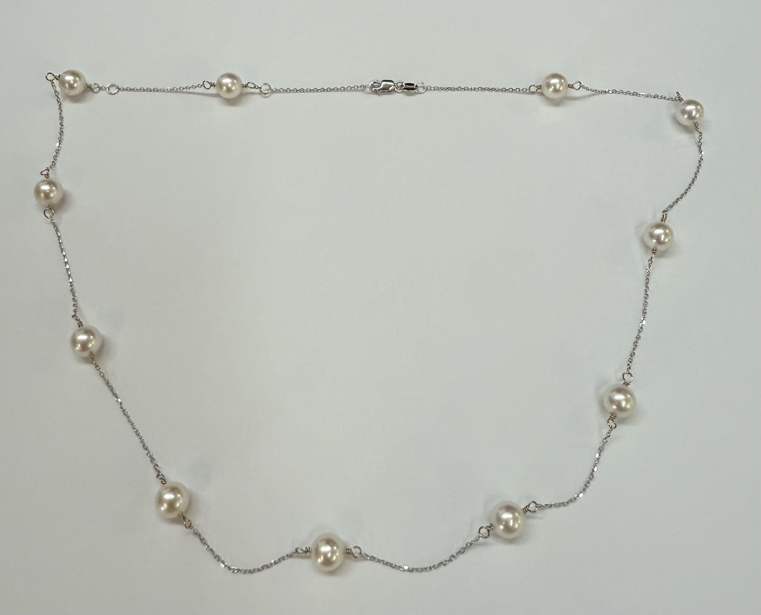 14k white gold cultured Saltwater Akoya 6-6.4 mm Pearl 18″ “Tin Cup” necklace. This necklace has an entire weight of 5.5 grams.