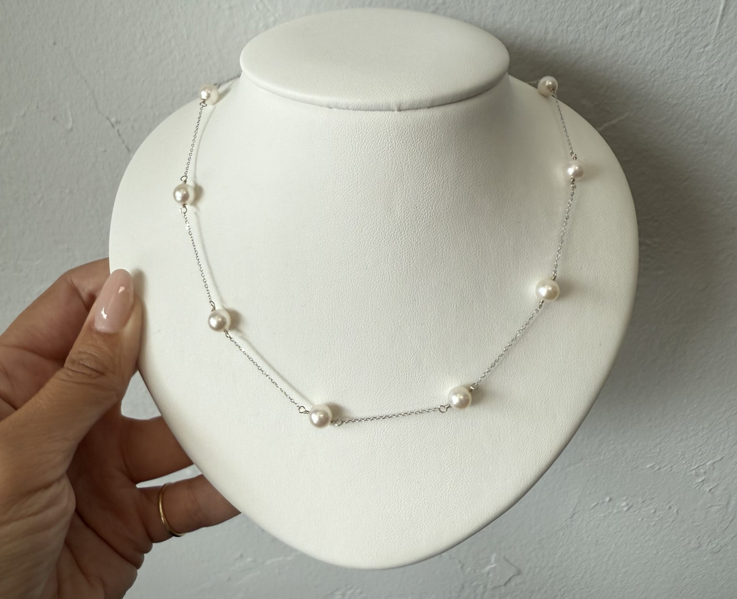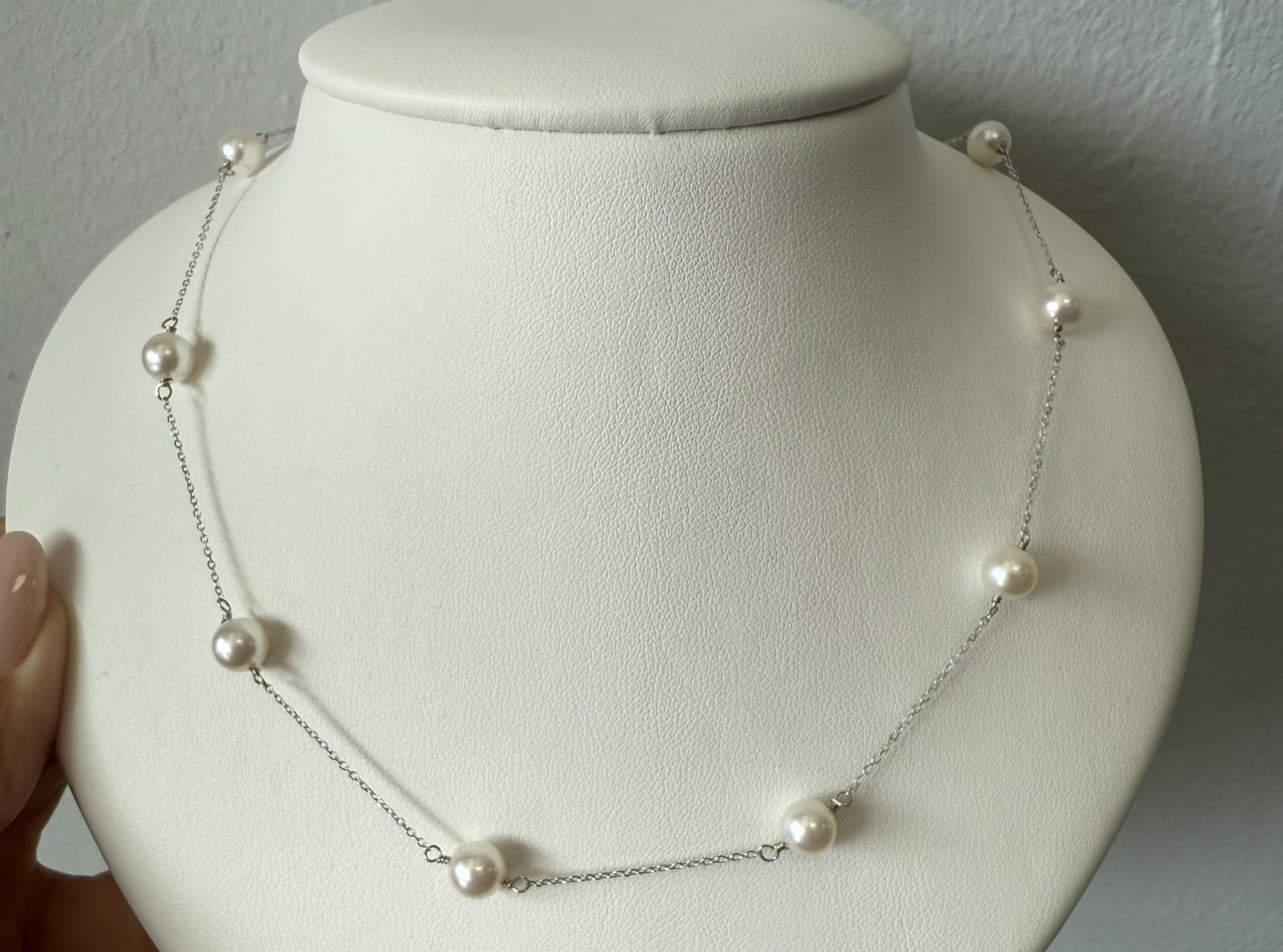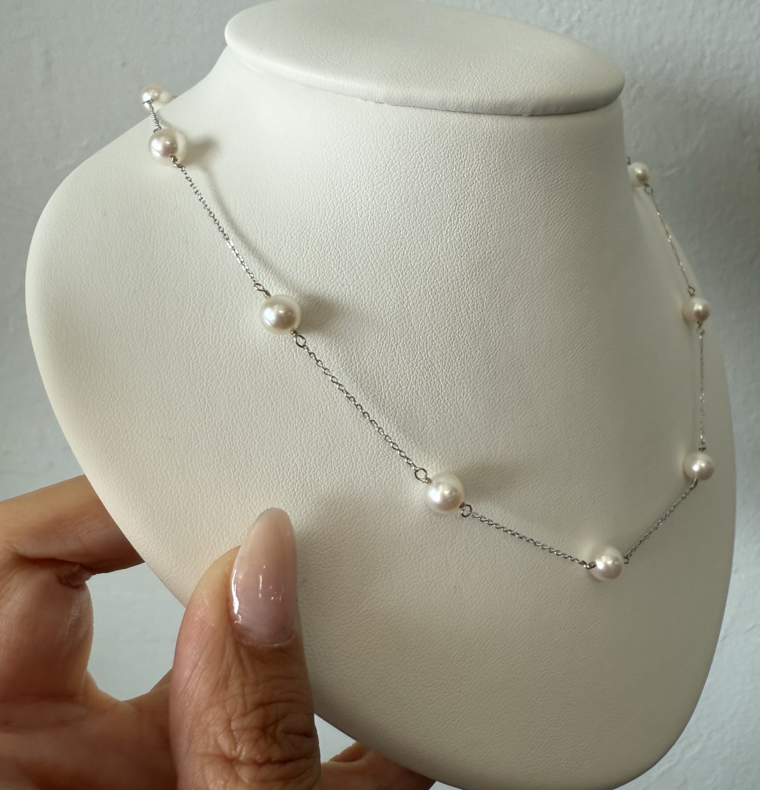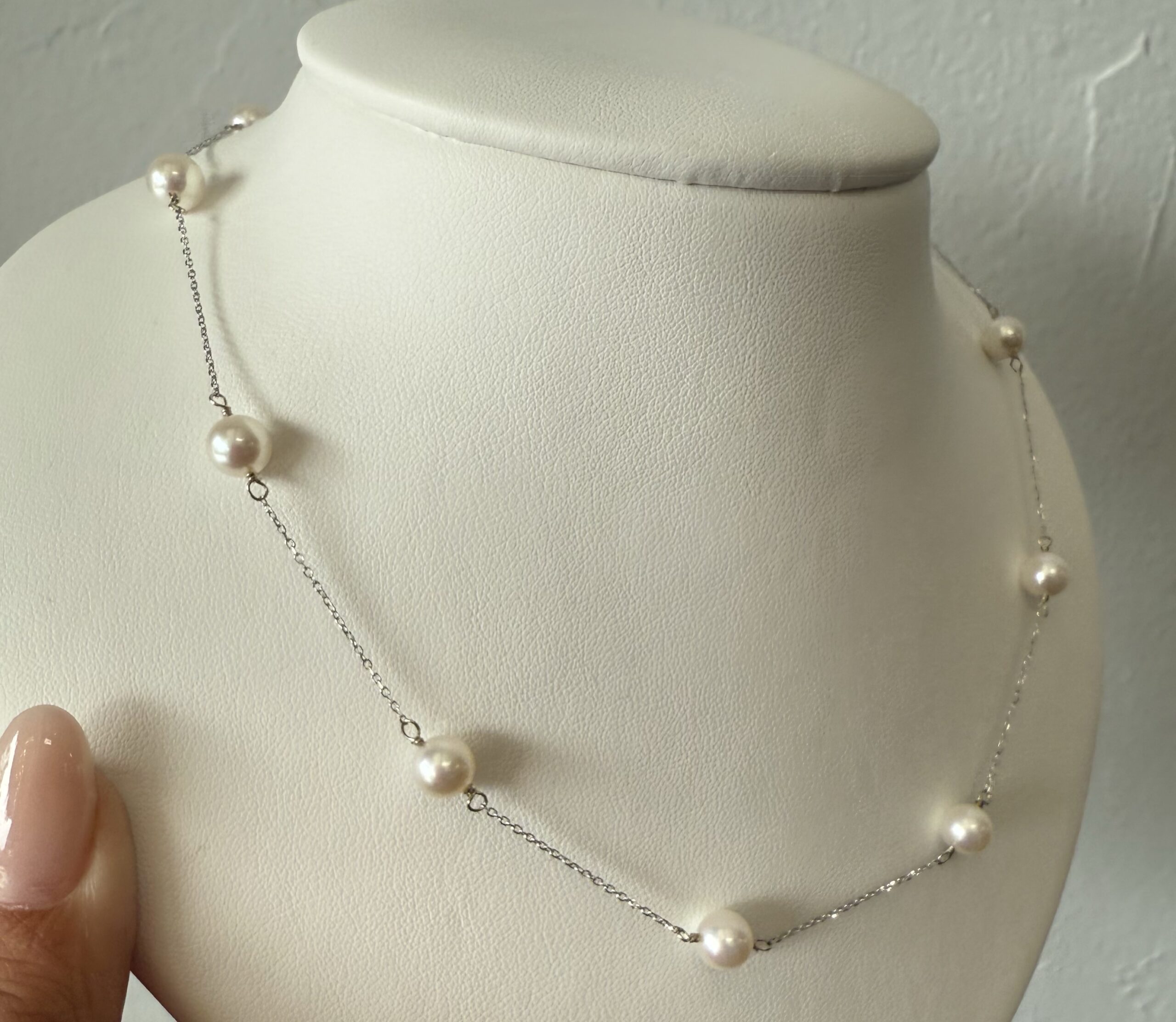 14k white gold cultured Saltwater Akoya 6-6.4 mm Pearl 18″ “Tin Cup” necklace. This necklace has an entire weight of 5.5 grams.