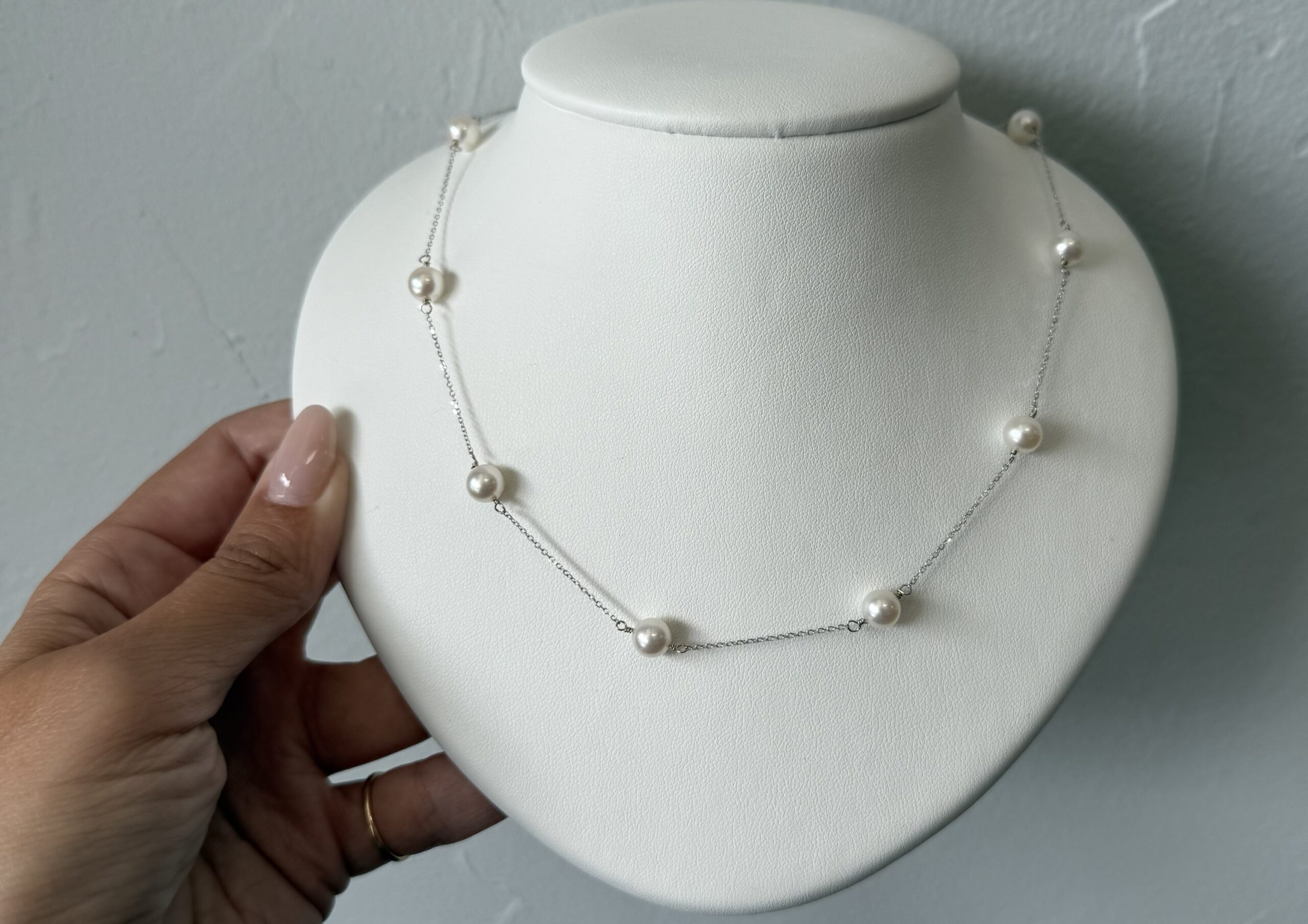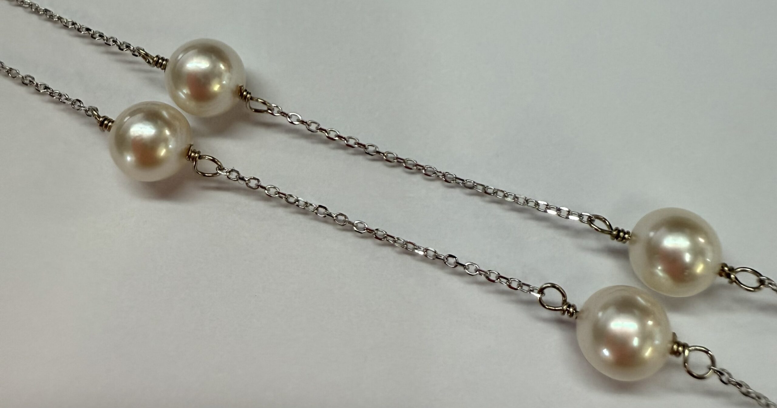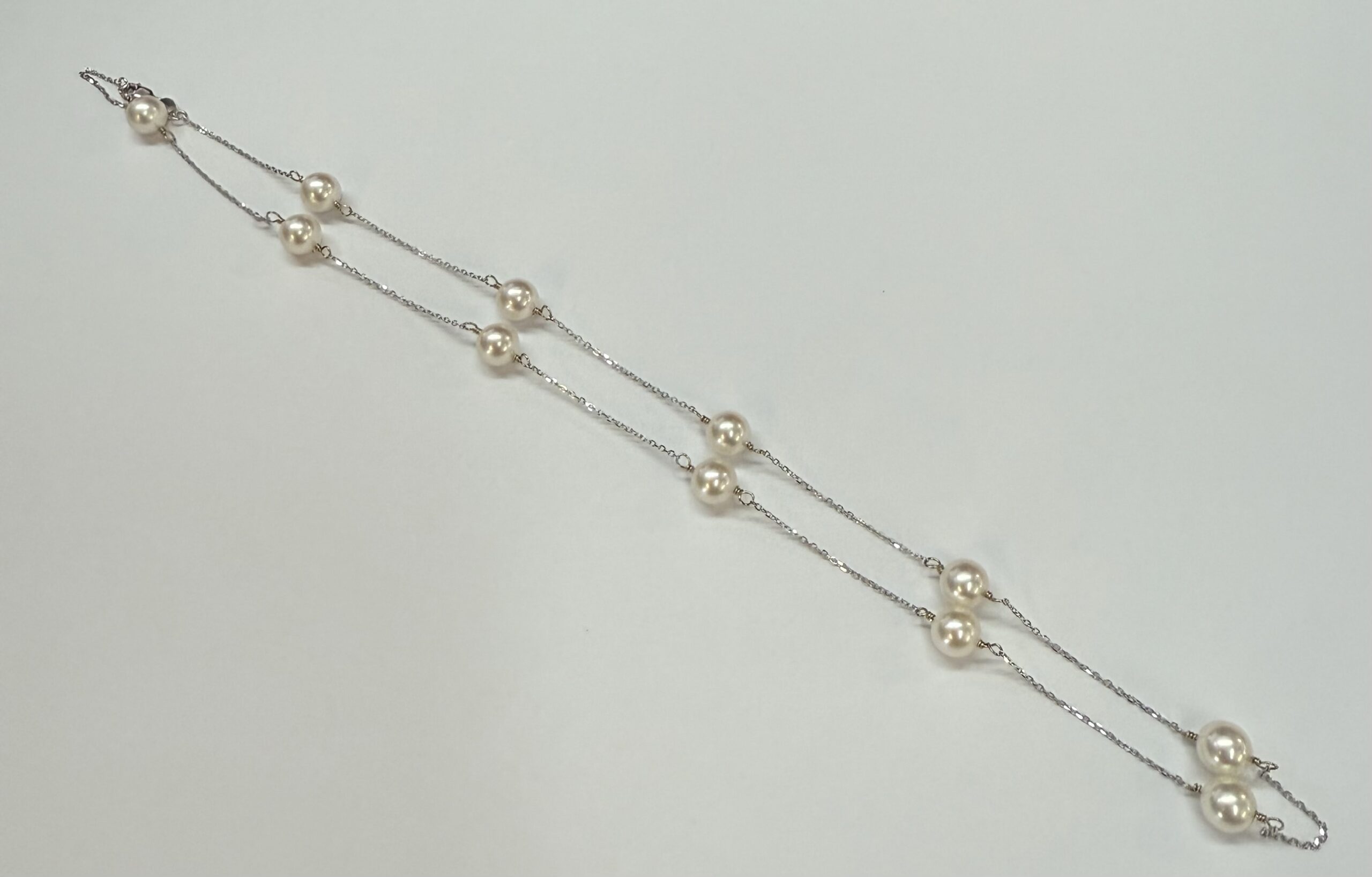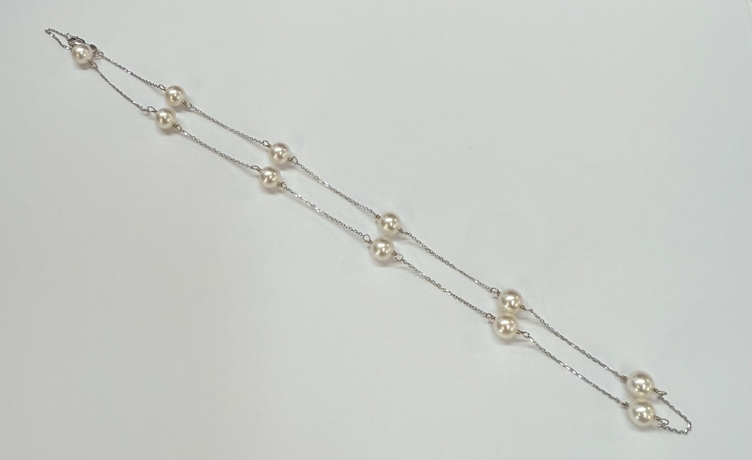 14k white gold cultured Saltwater Akoya 6-6.4 mm Pearl 18″ “Tin Cup” necklace. This necklace has an entire weight of 5.5 grams.