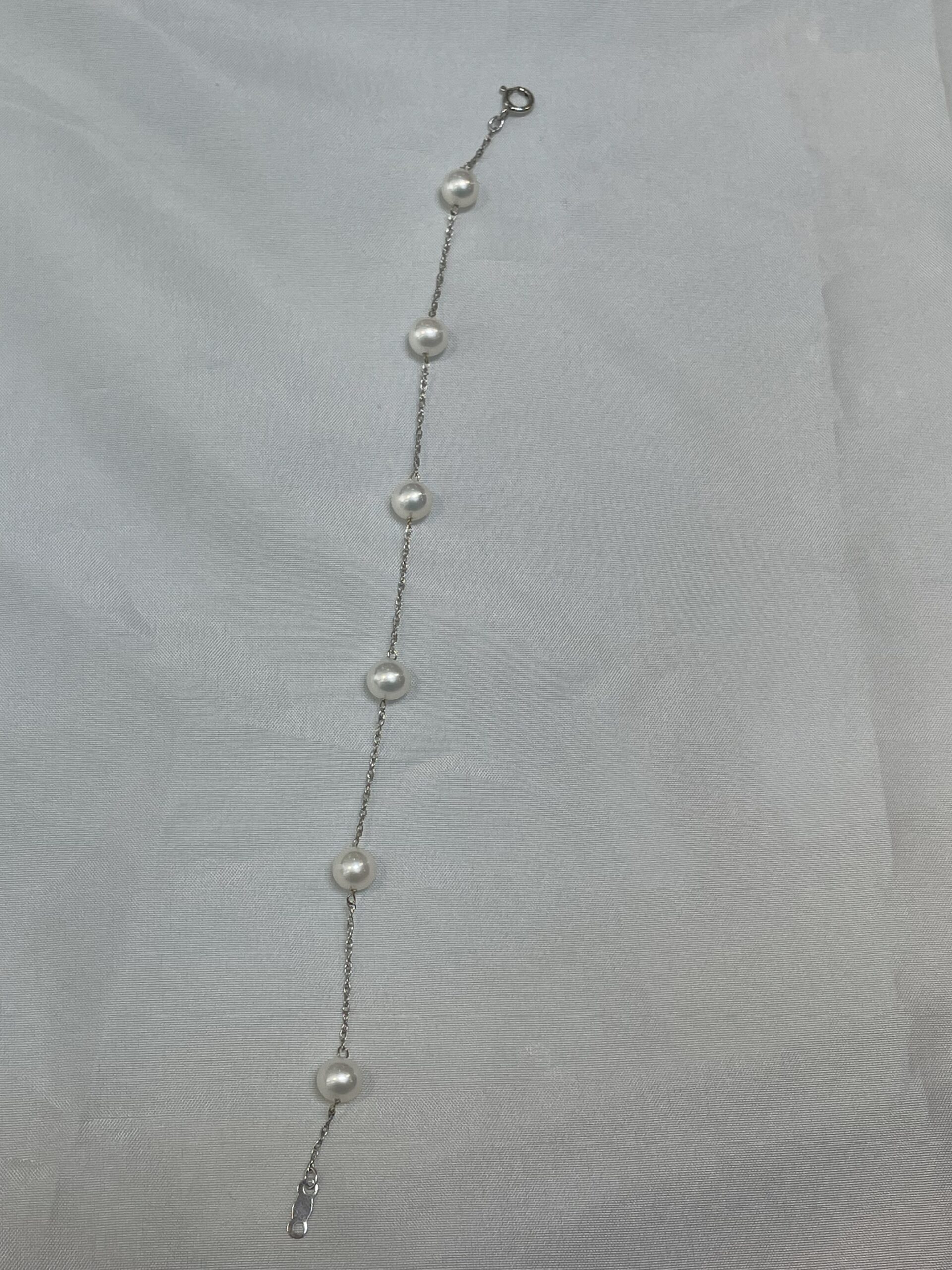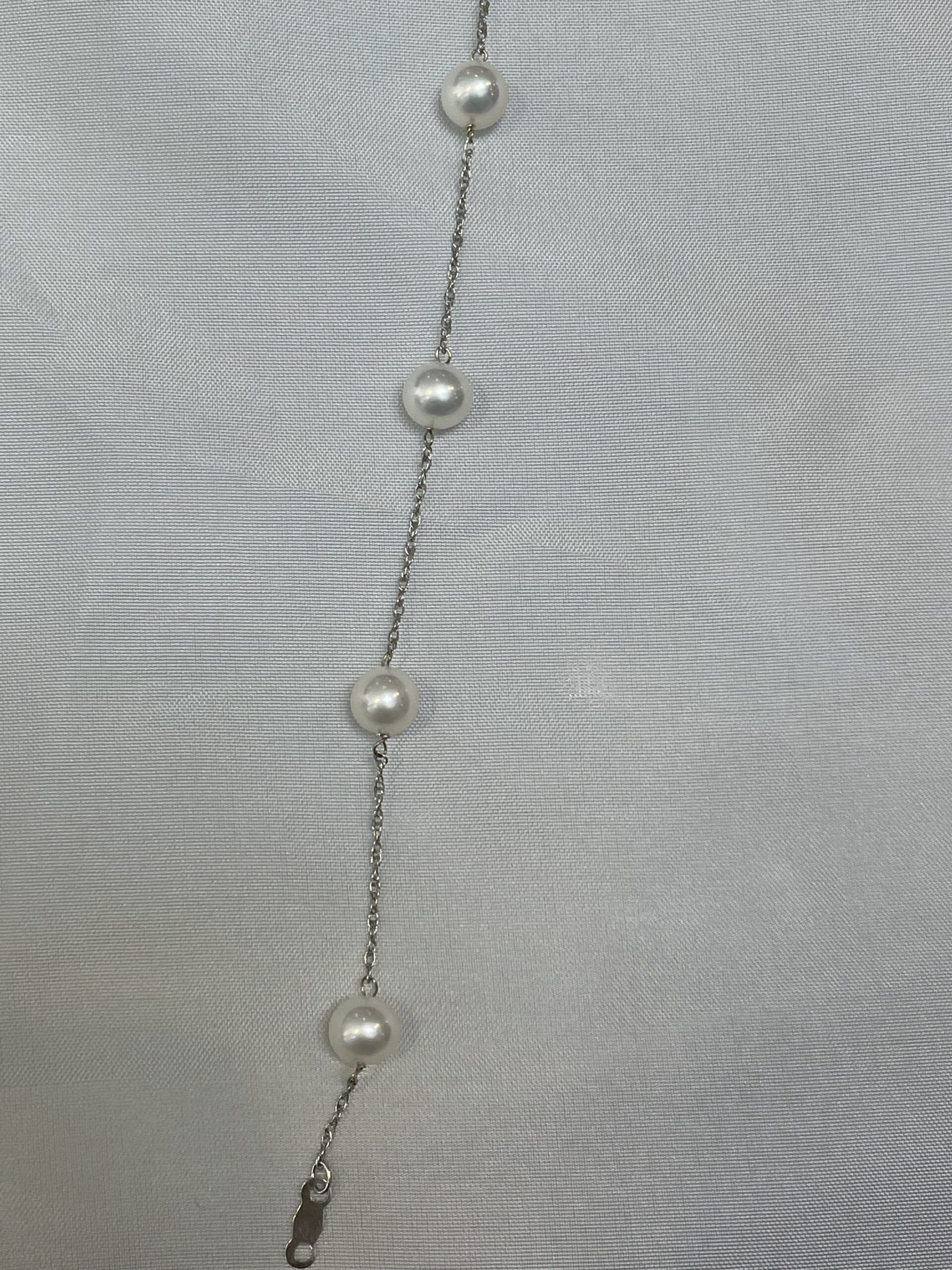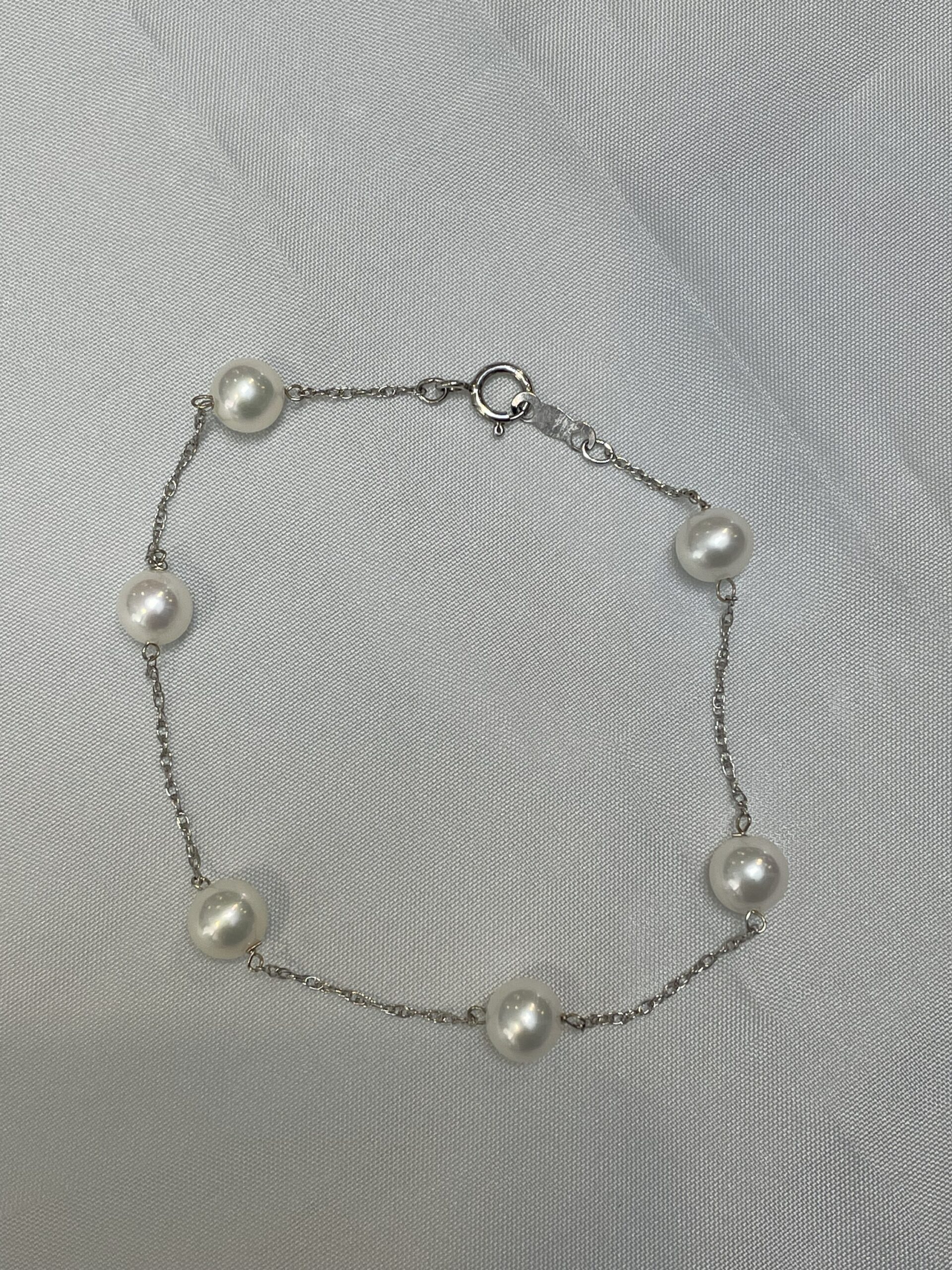 14k white gold 6 mm cultured freshwater Pearl tin cup bracelet with 6 pearls spaced equidistantly along a 14k white gold 7″