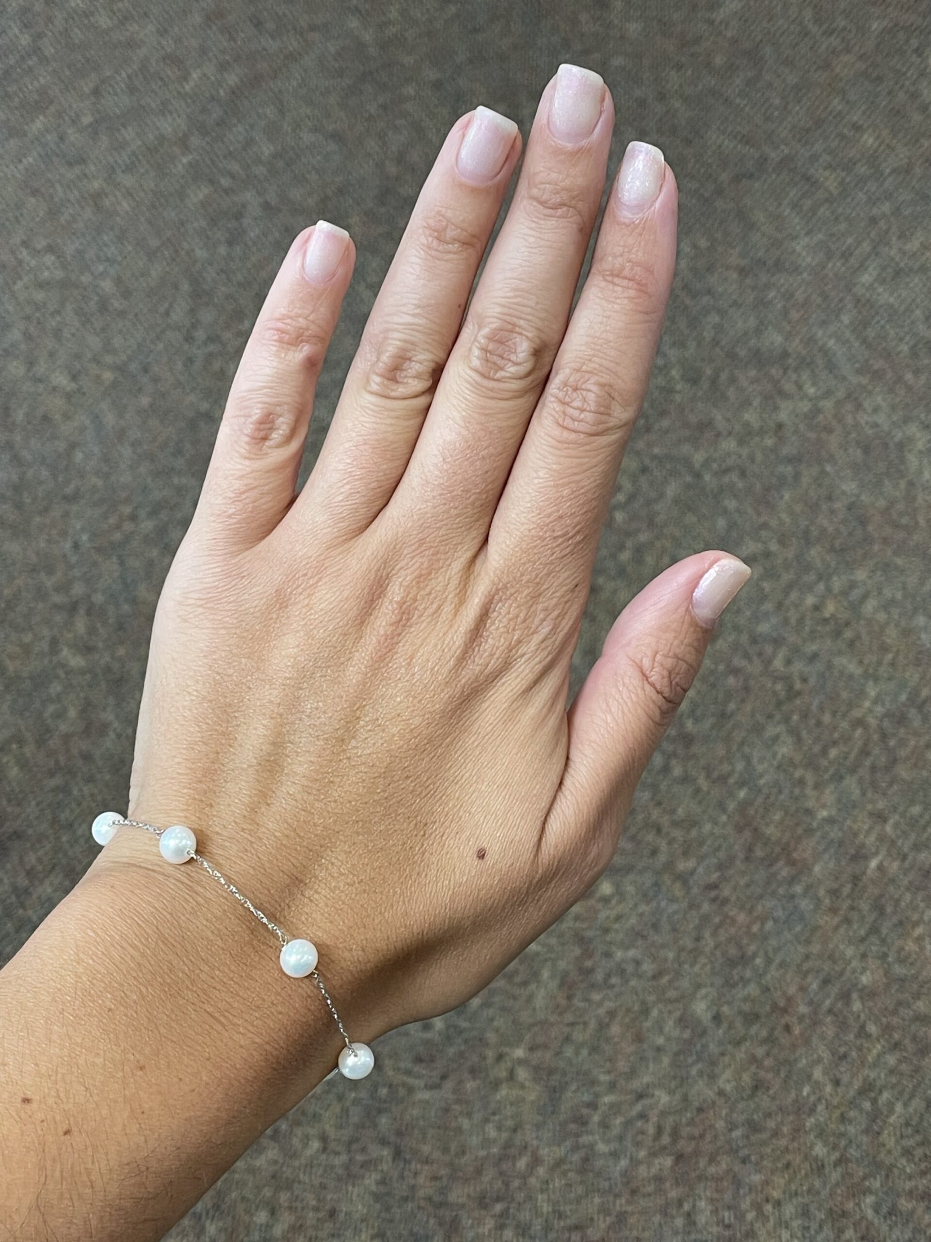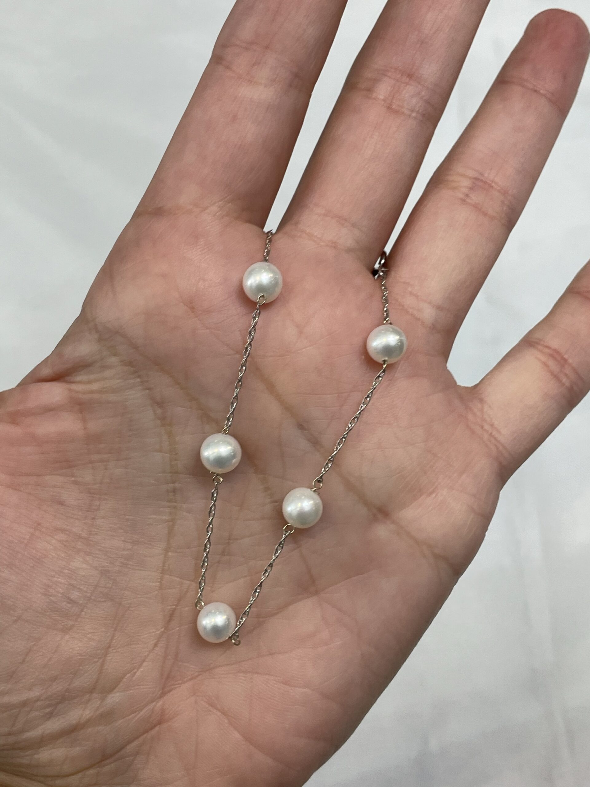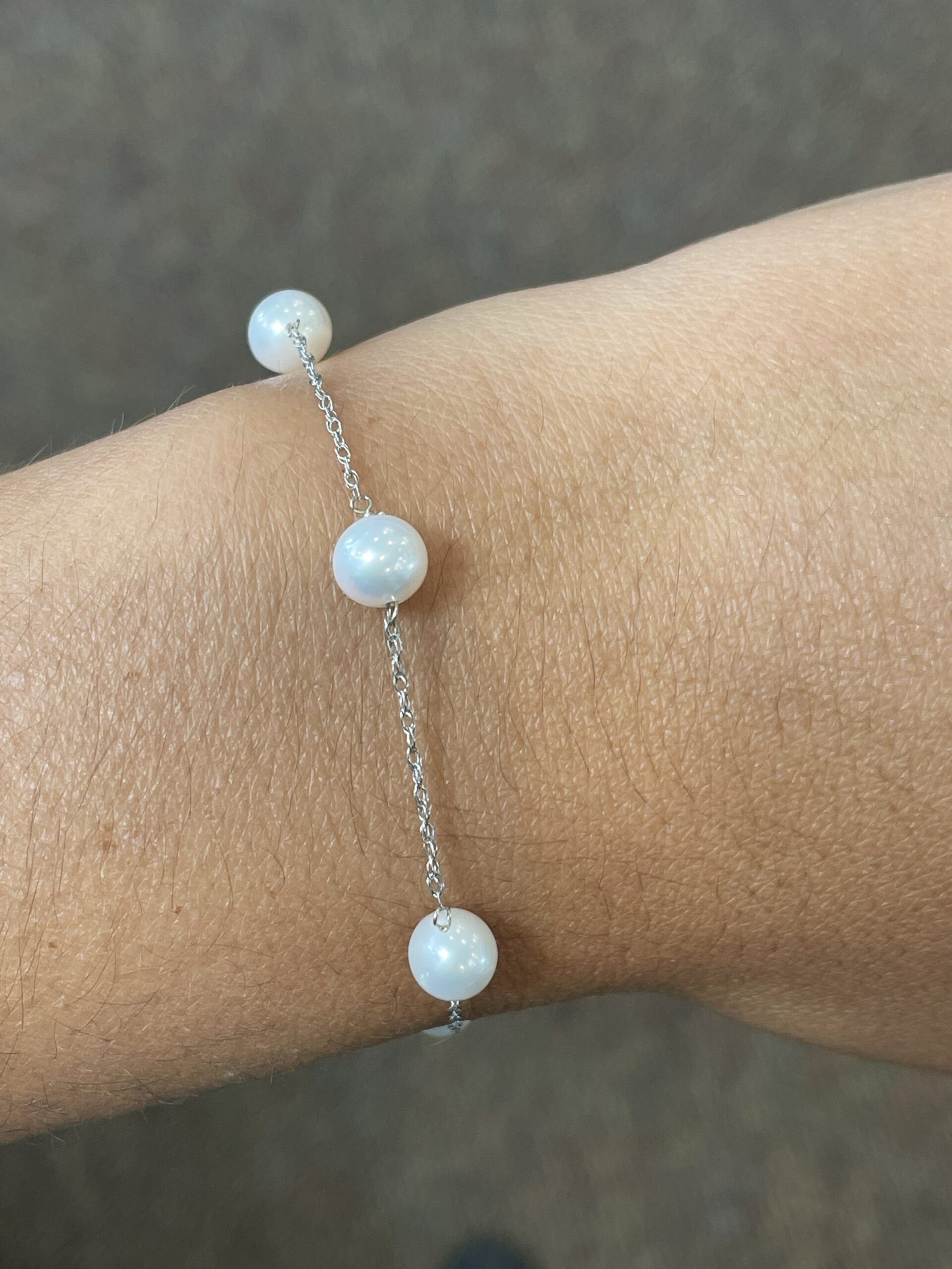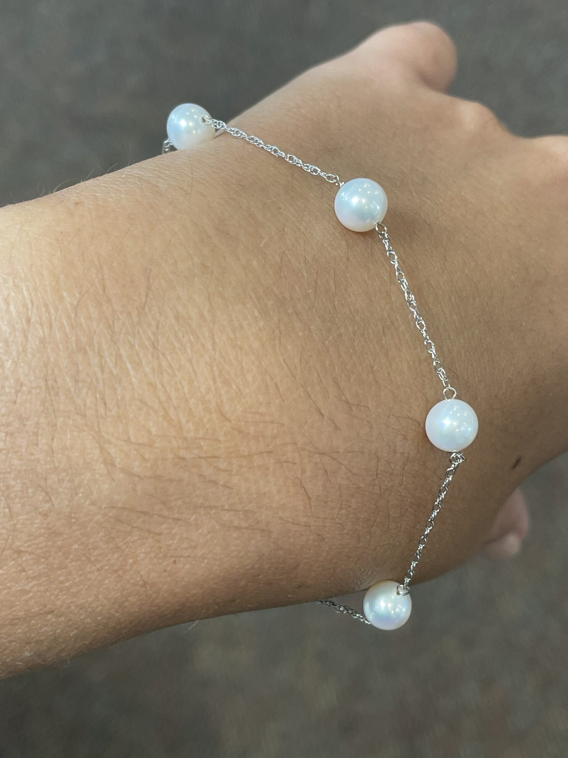 14k white gold 6 mm cultured freshwater Pearl tin cup bracelet with 6 pearls spaced equidistantly along a 14k white gold 7″