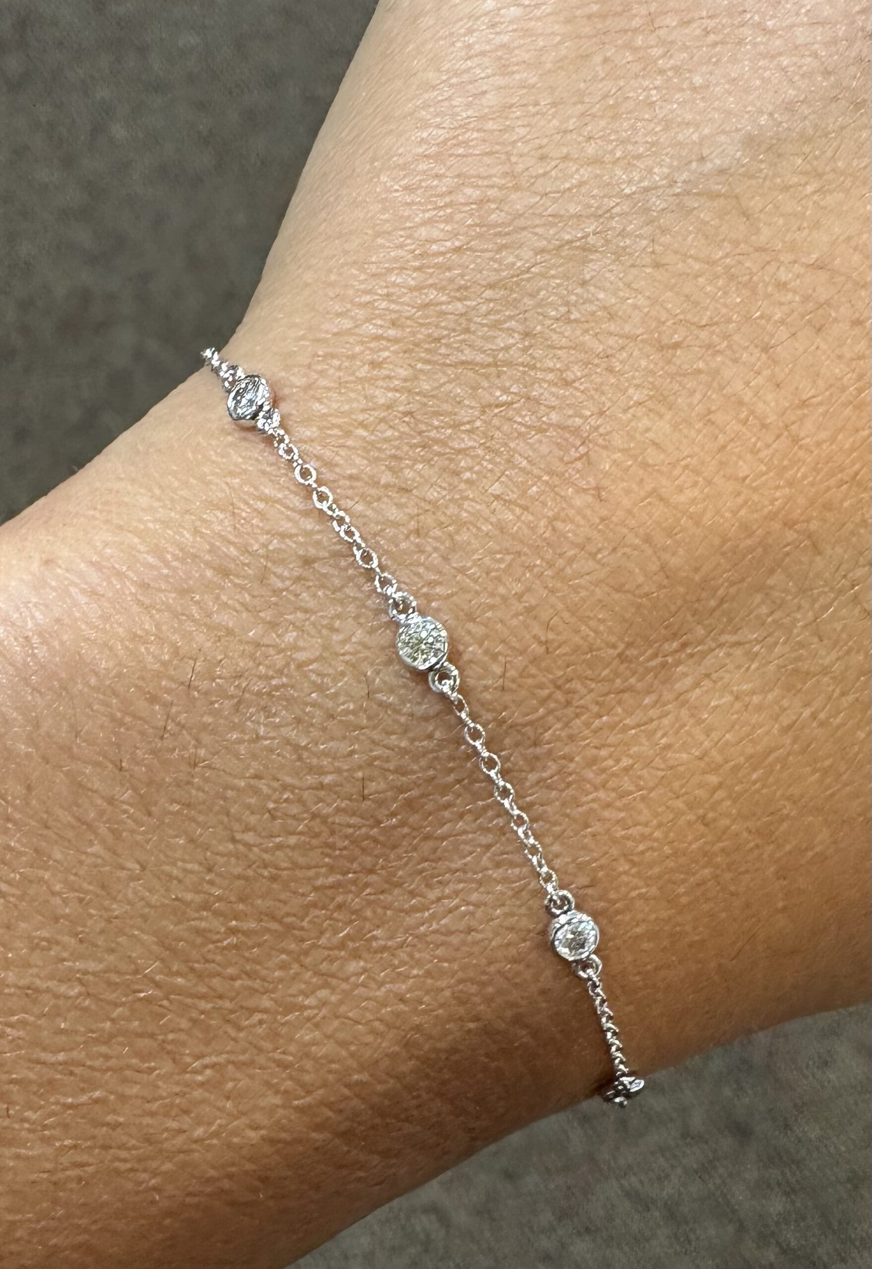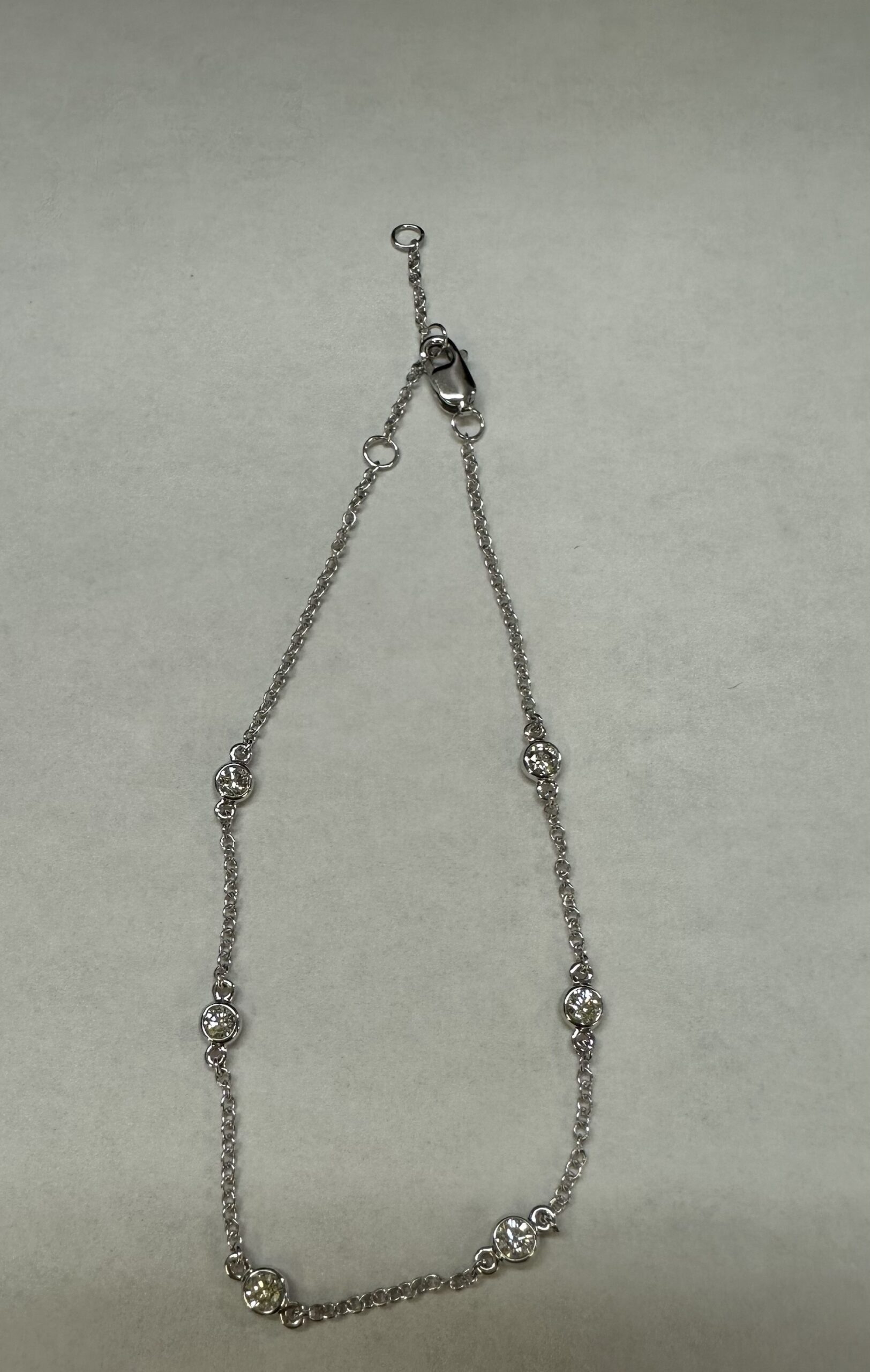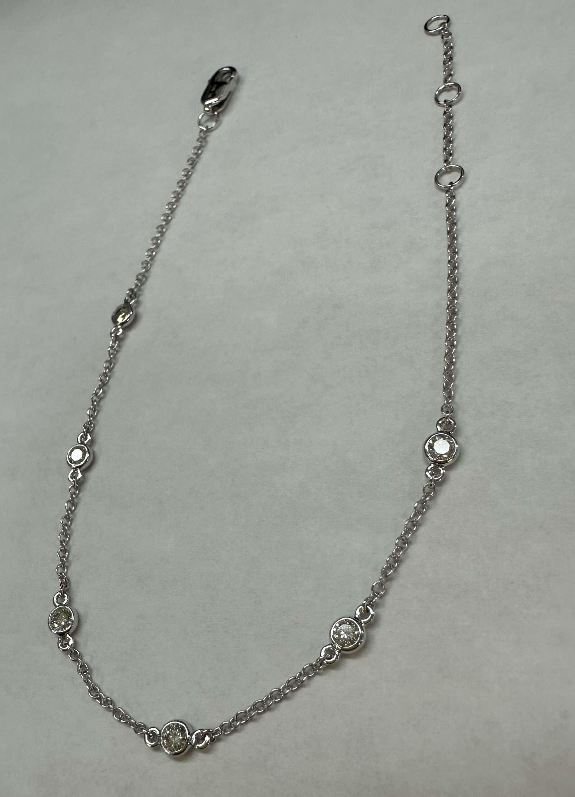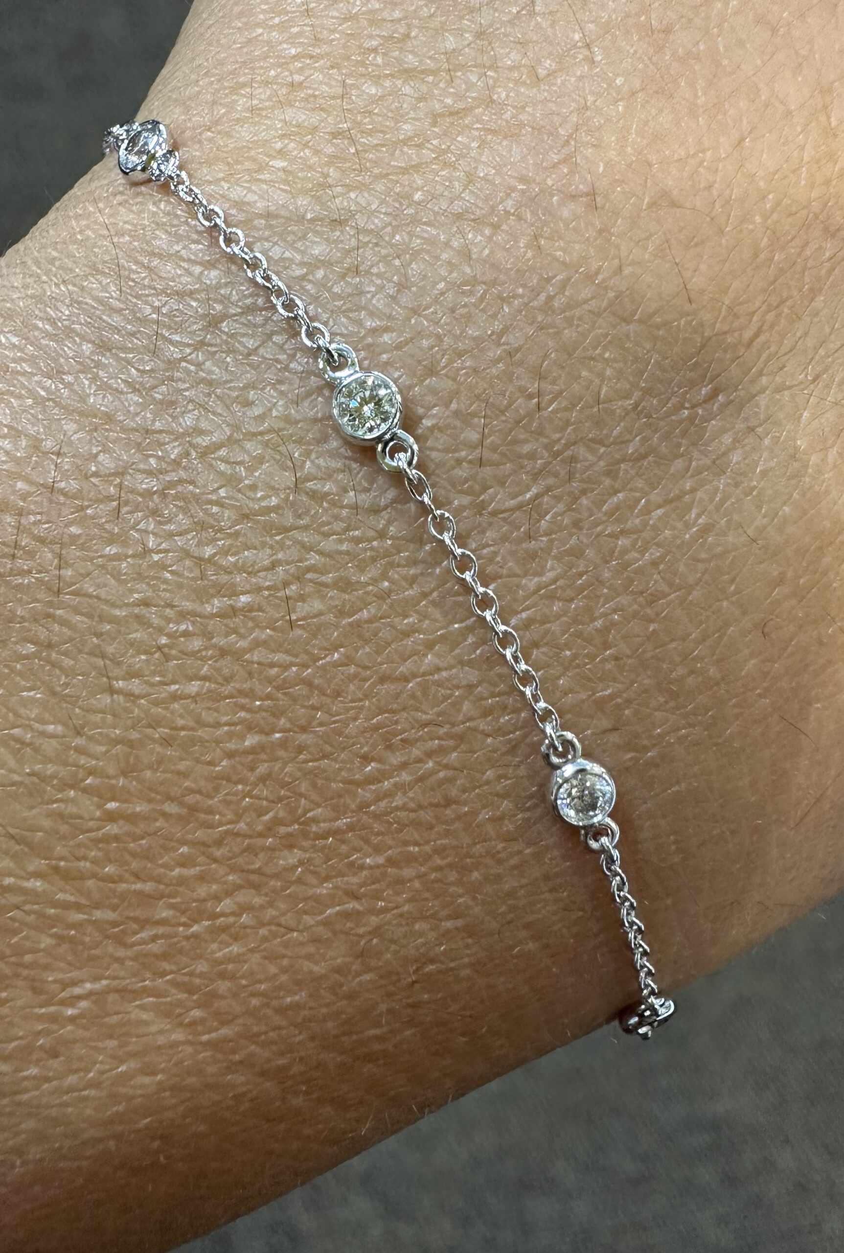 14k white gold 6 stone genuine .30 cttw Round Brilliant Cut diamond bezel “by the yard” bracelet, adjustable 6.5-7.5”, 1.3 grams. These diamonds average H in color and SI in clarity.