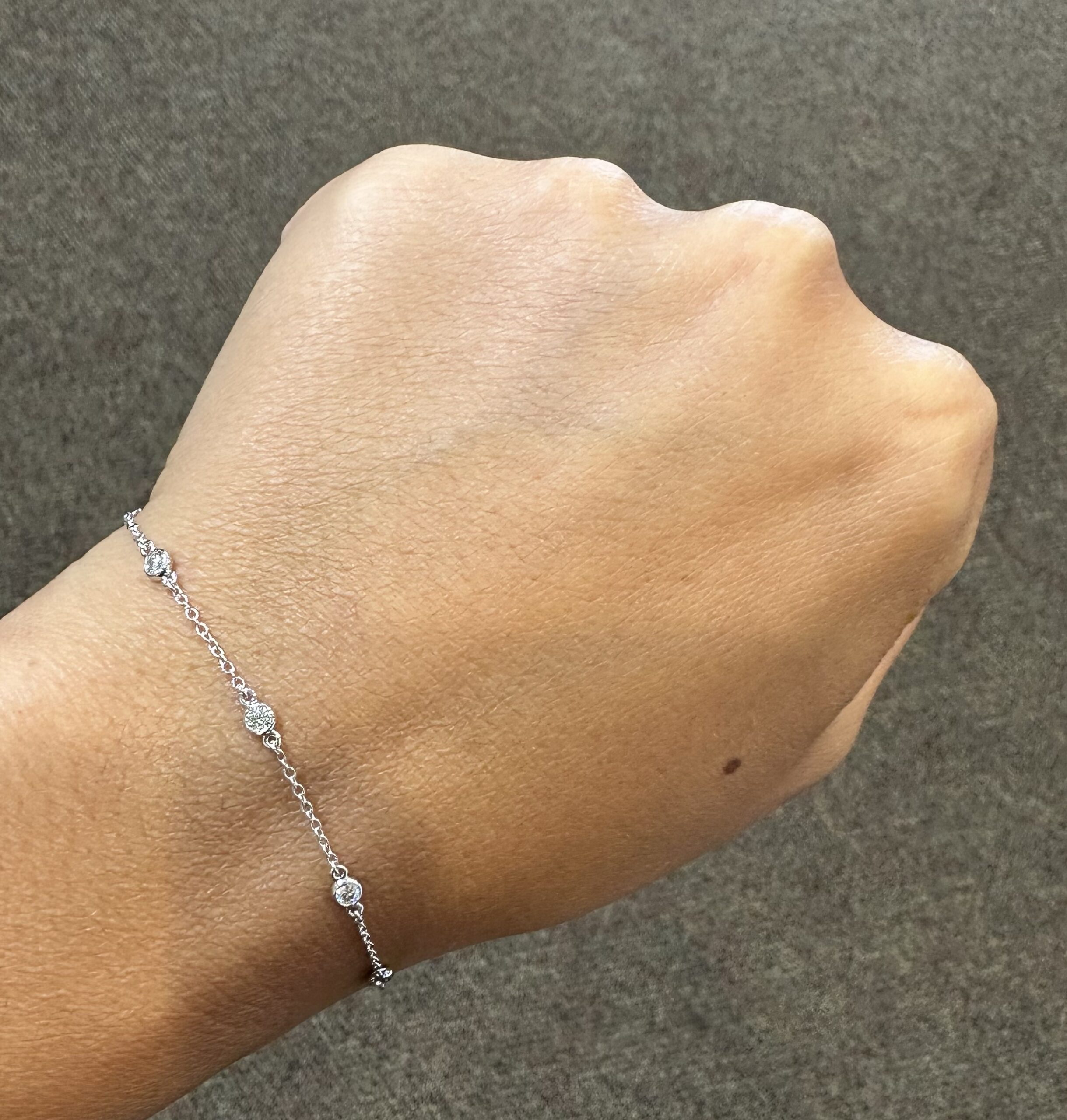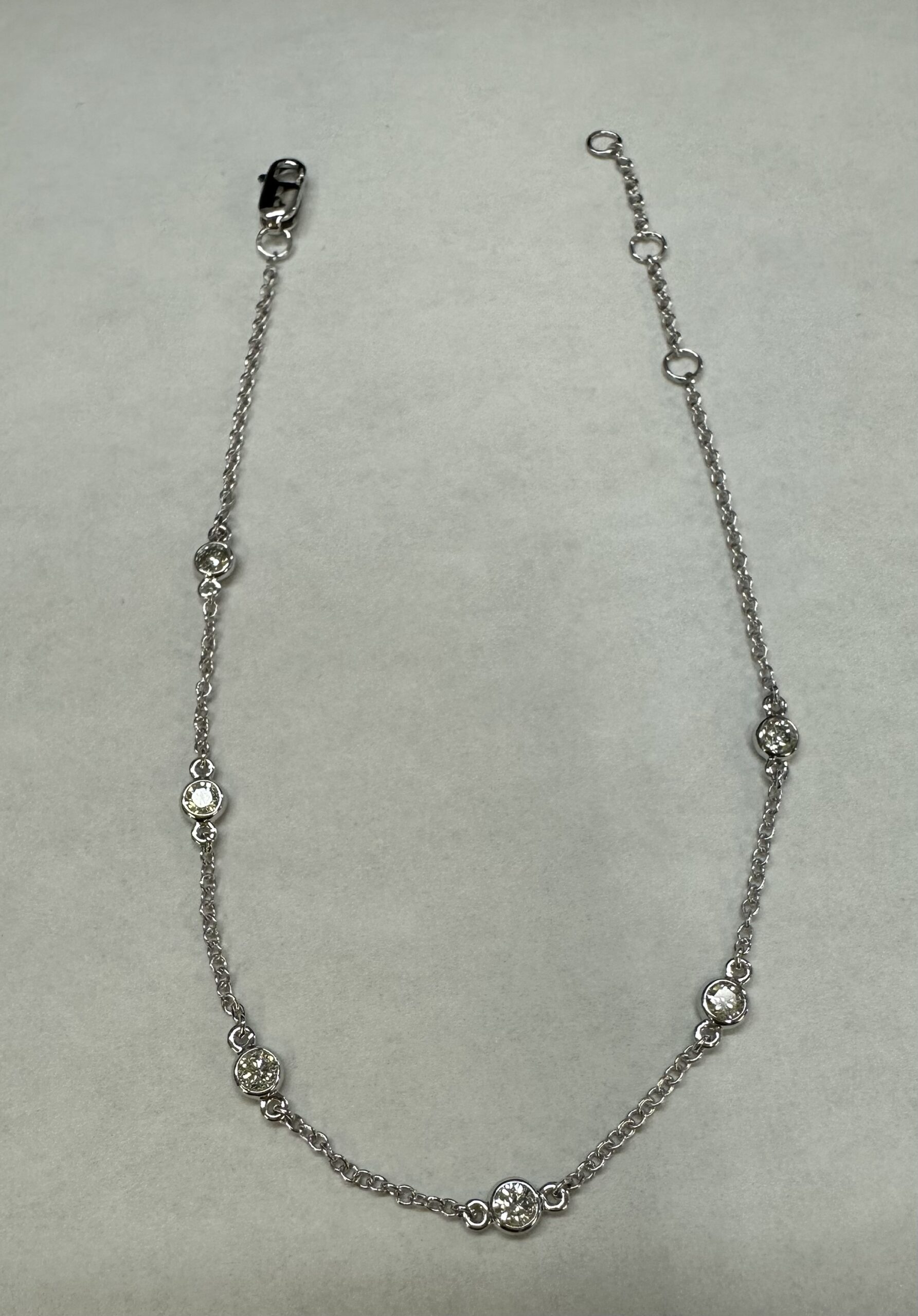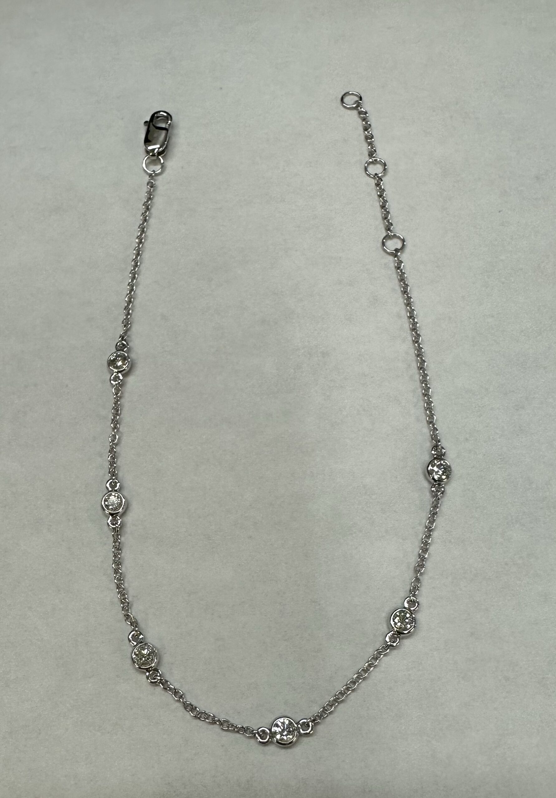 14k white gold 6 stone genuine .30 cttw Round Brilliant Cut diamond bezel “by the yard” bracelet, adjustable 6.5-7.5”, 1.3 grams. These diamonds average H in color and SI in clarity.