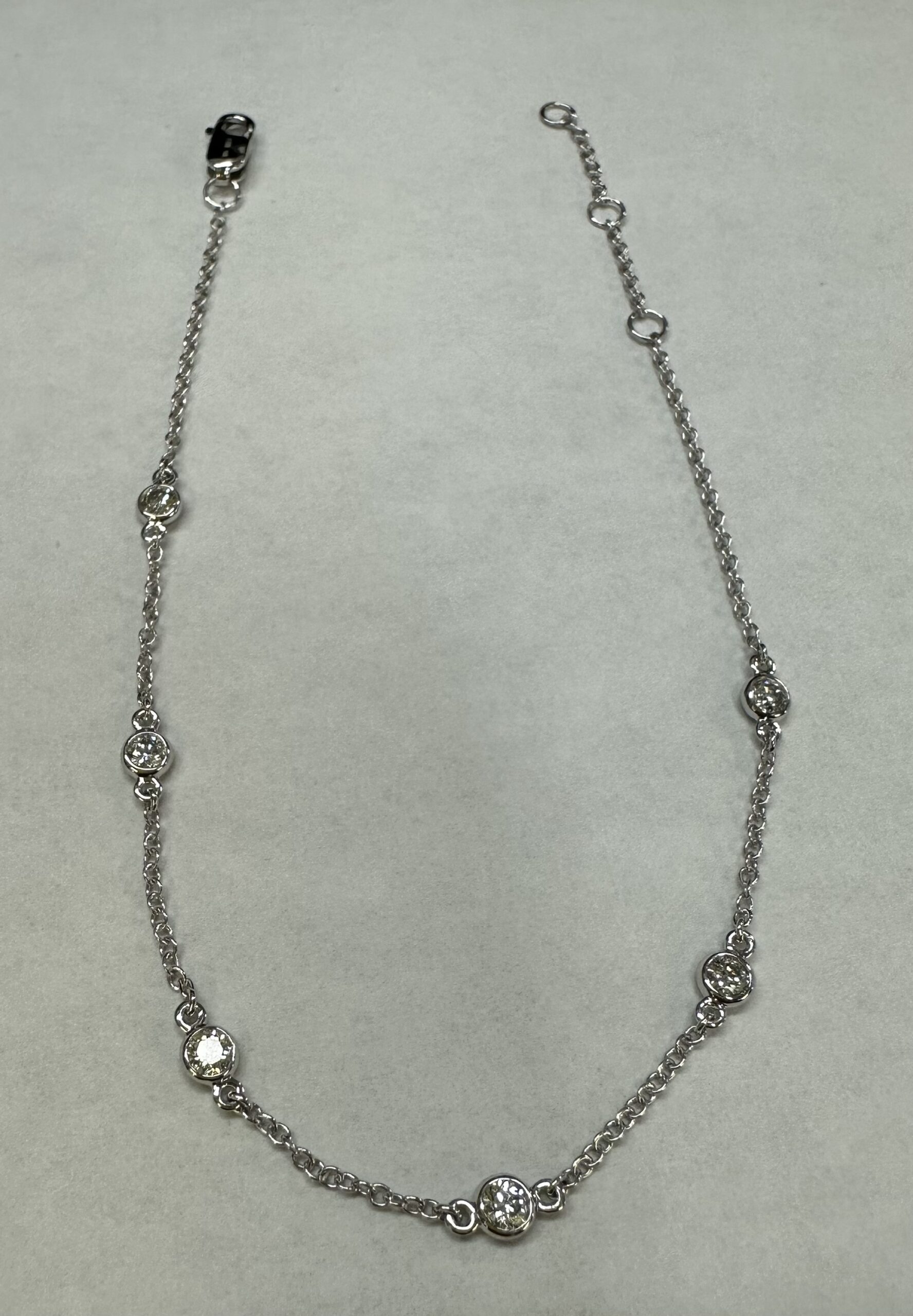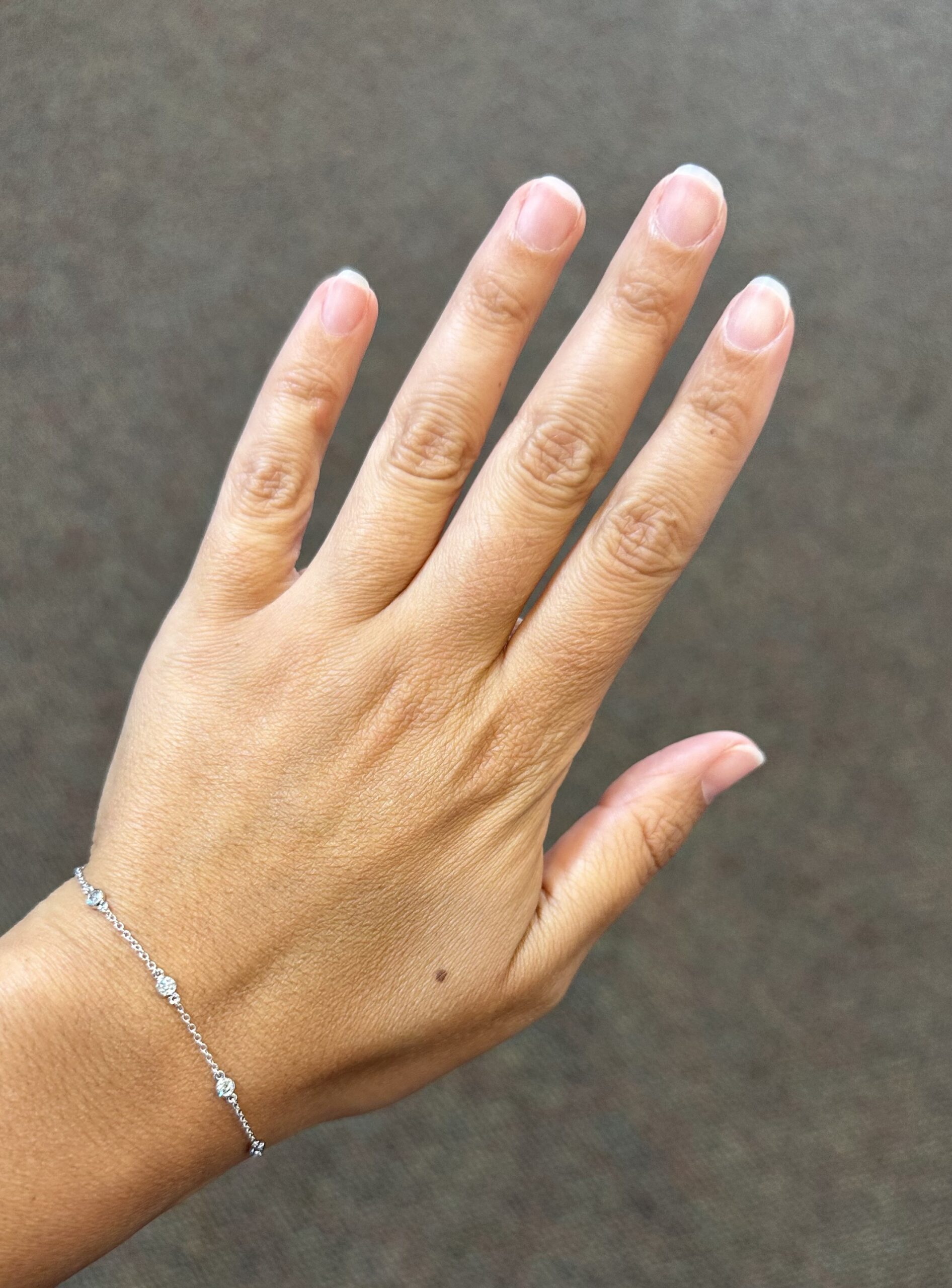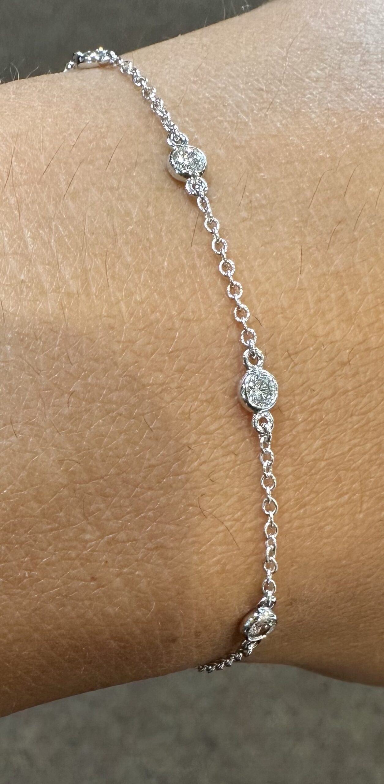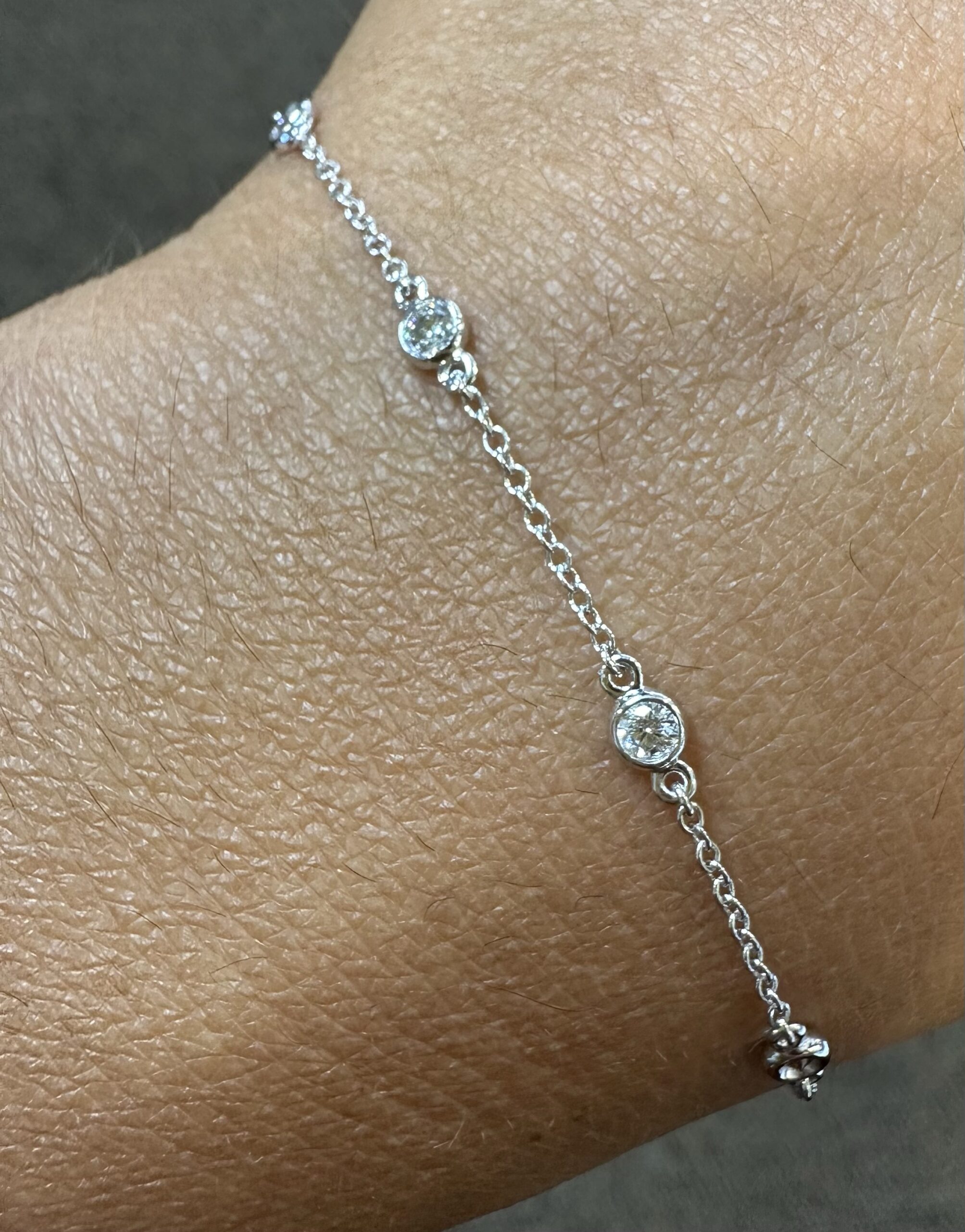 14k white gold 6 stone genuine .30 cttw Round Brilliant Cut diamond bezel “by the yard” bracelet, adjustable 6.5-7.5”, 1.3 grams. These diamonds average H in color and SI in clarity.
