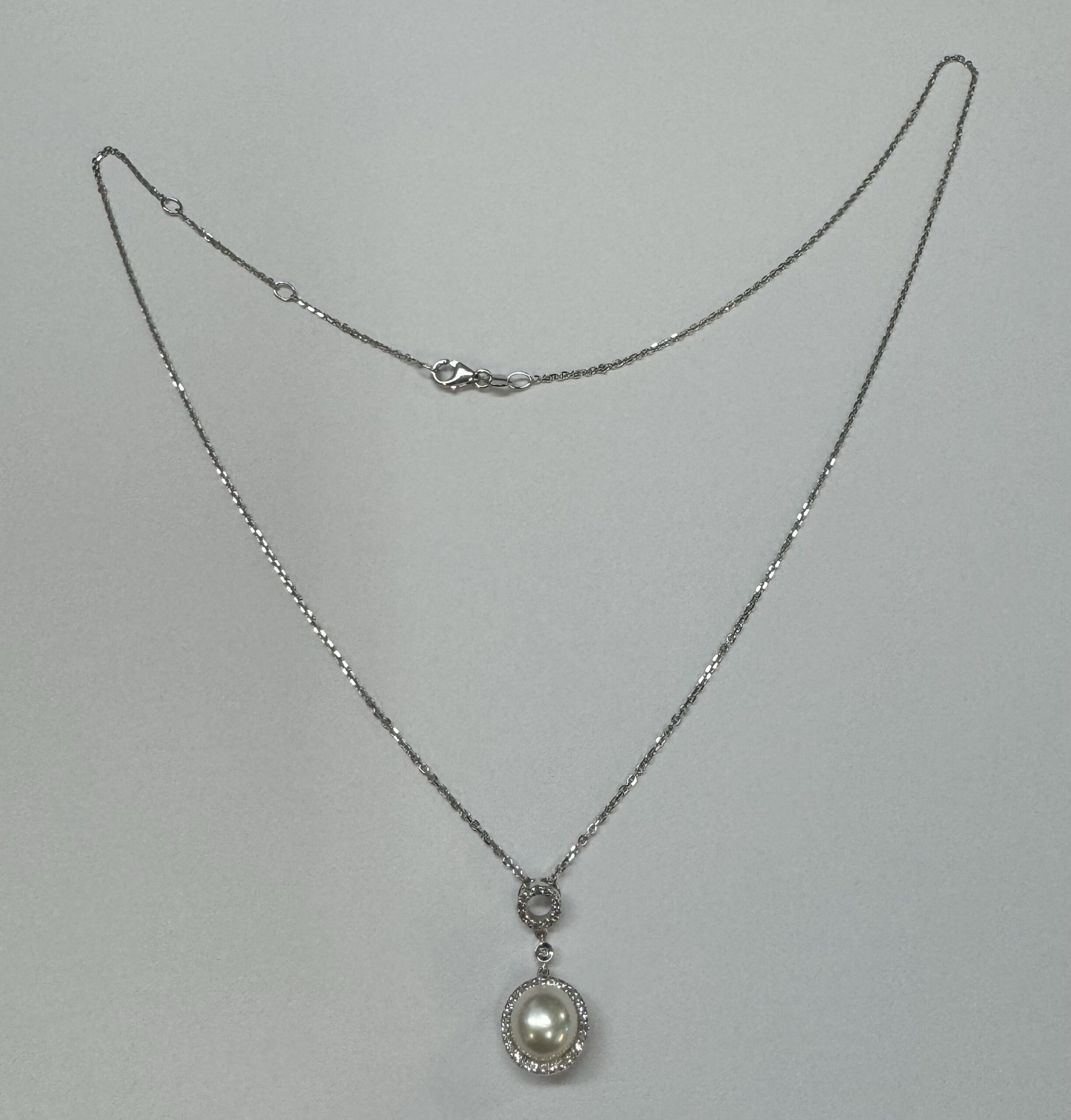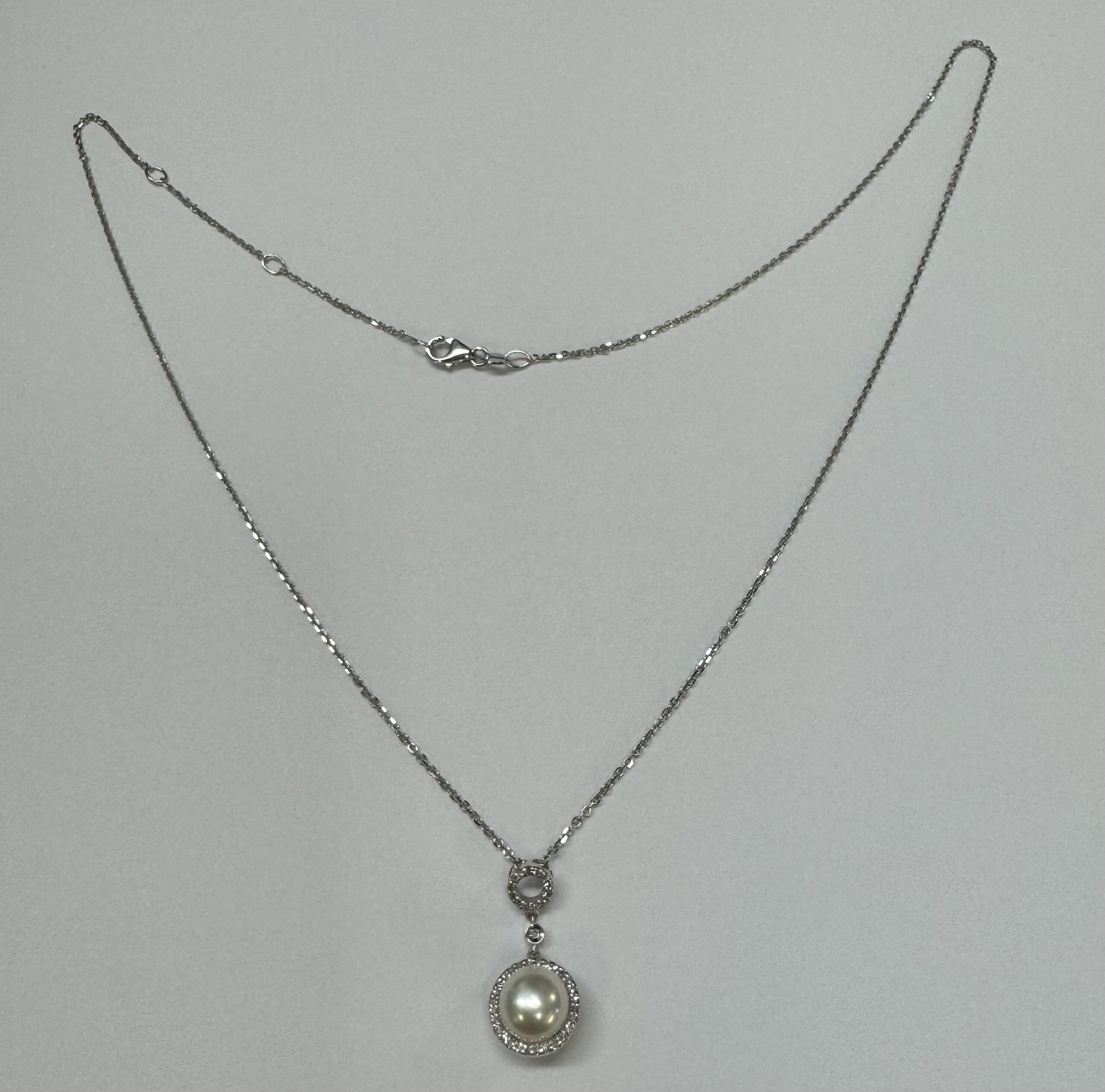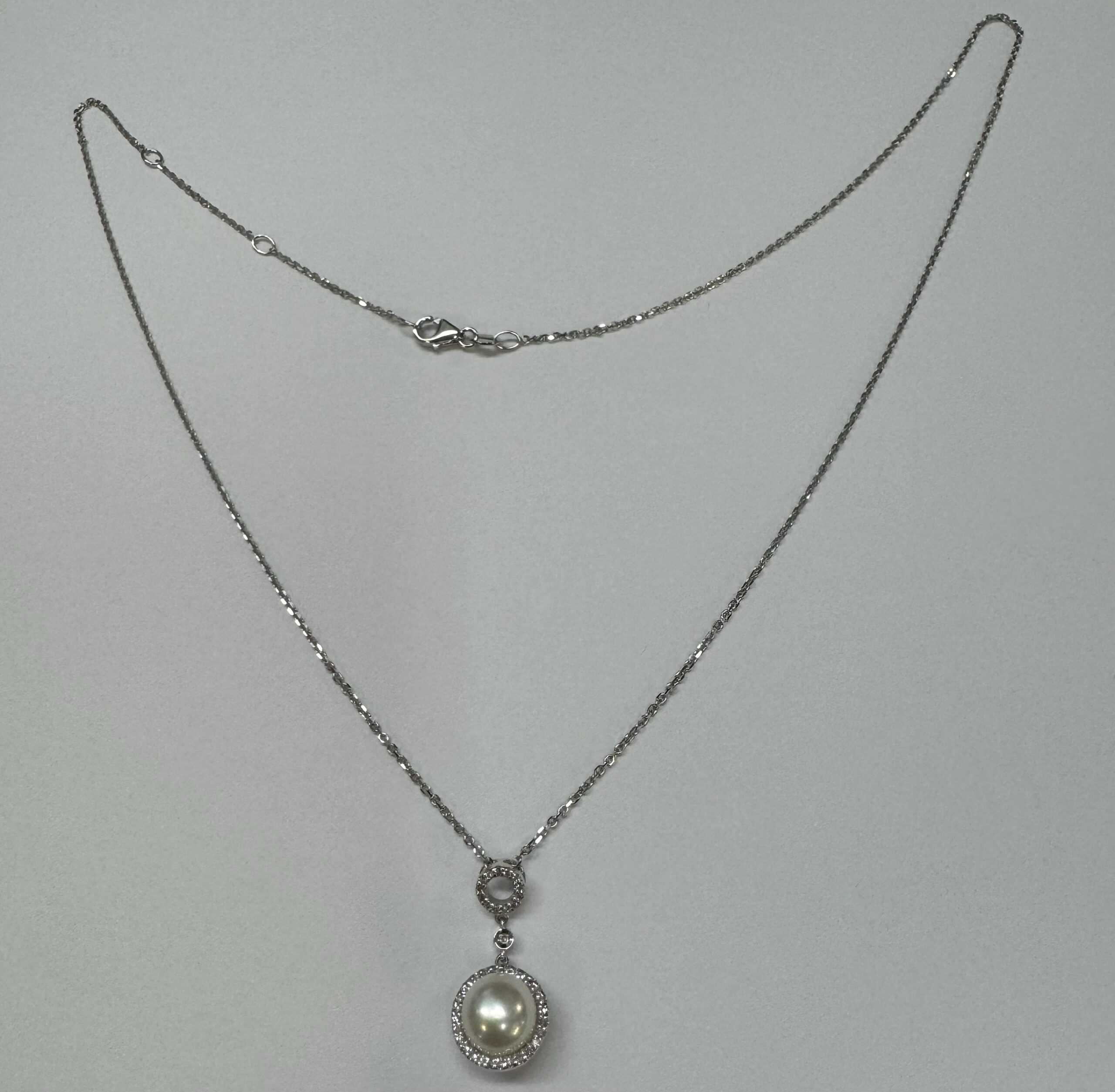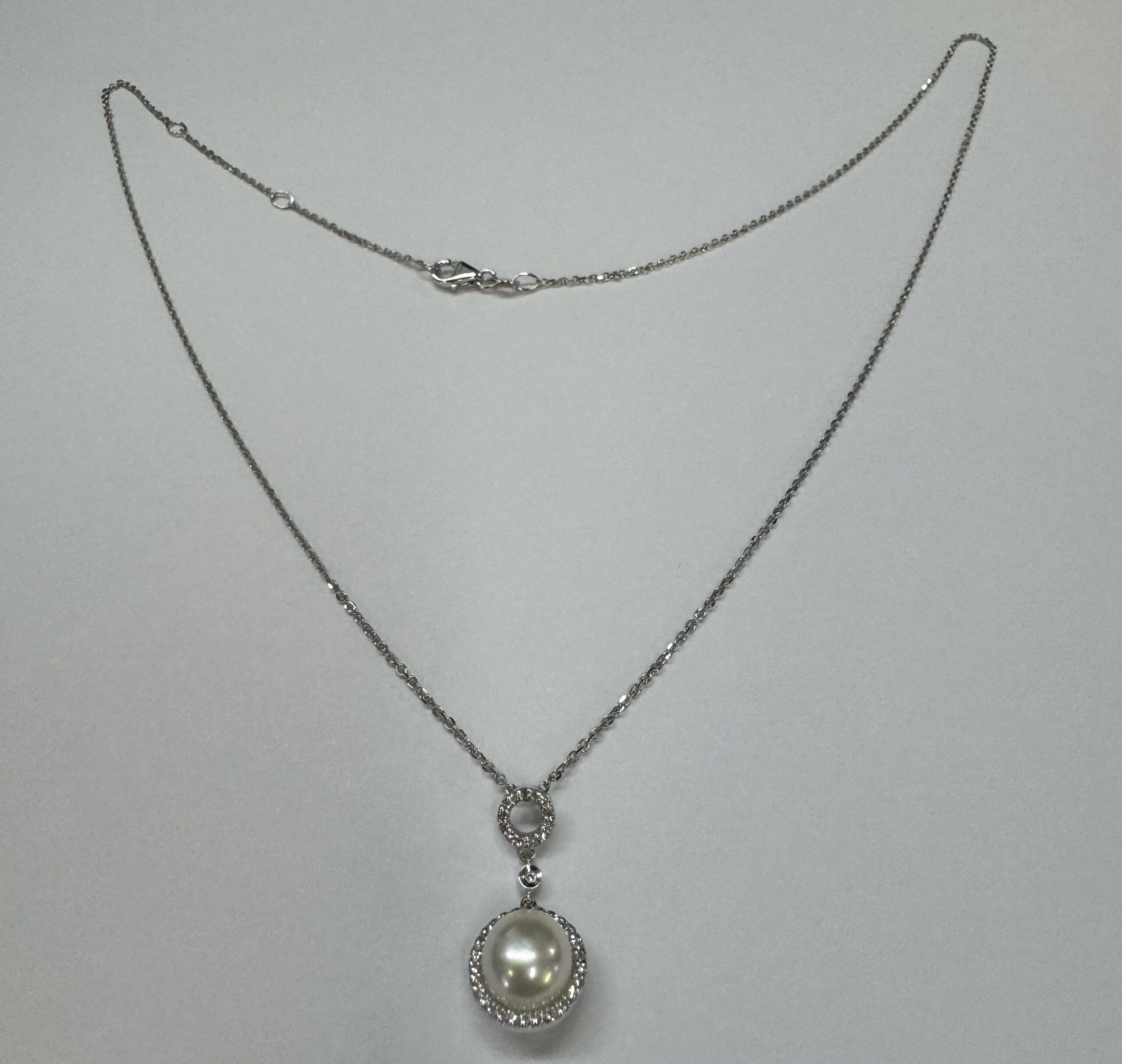 14k White Gold 7.8 MM Button Pearl & Diamond Halo Pendant quantity