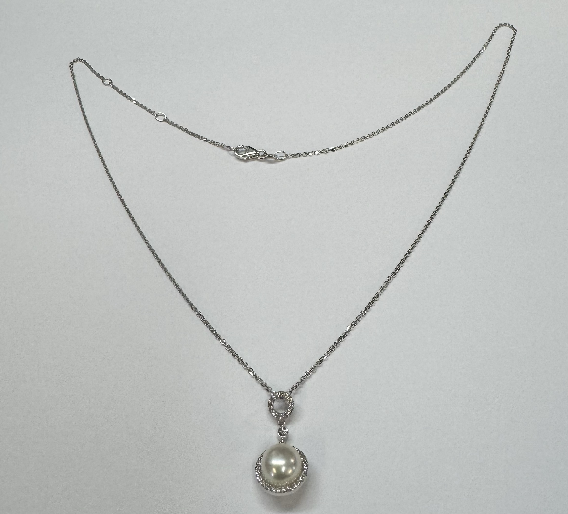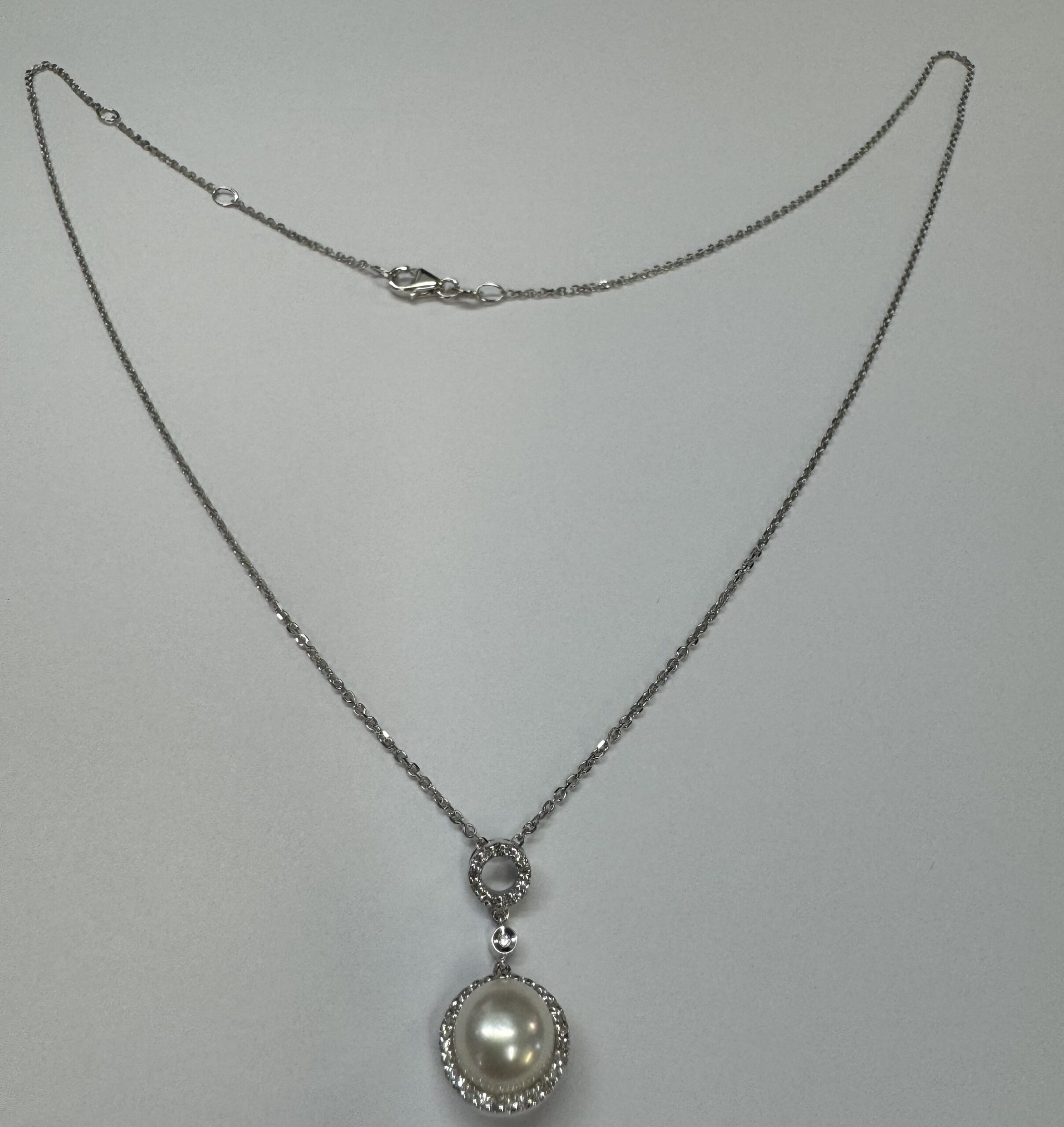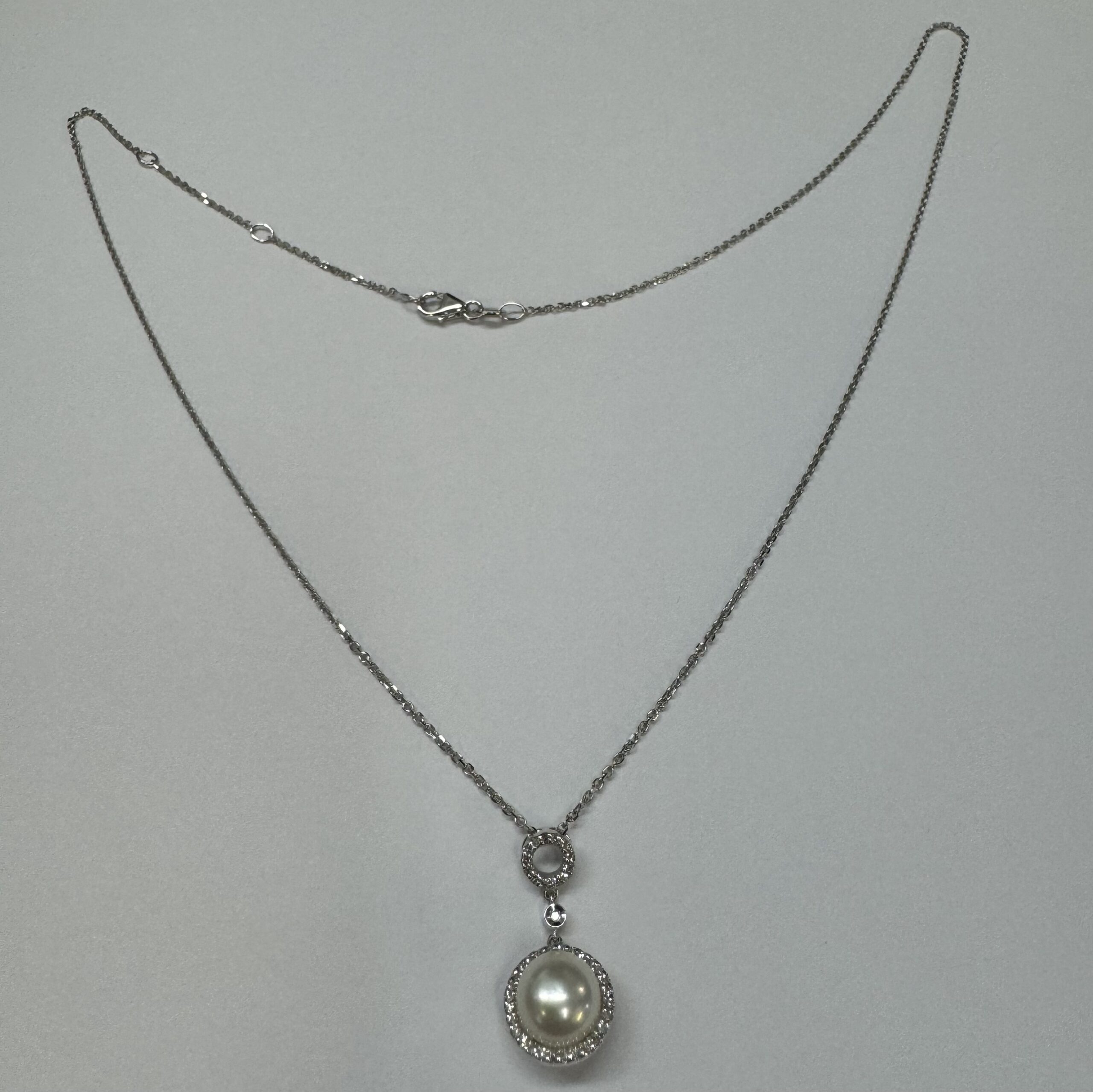 14k White Gold 7.8 MM Button Pearl & Diamond Halo Pendant quantity