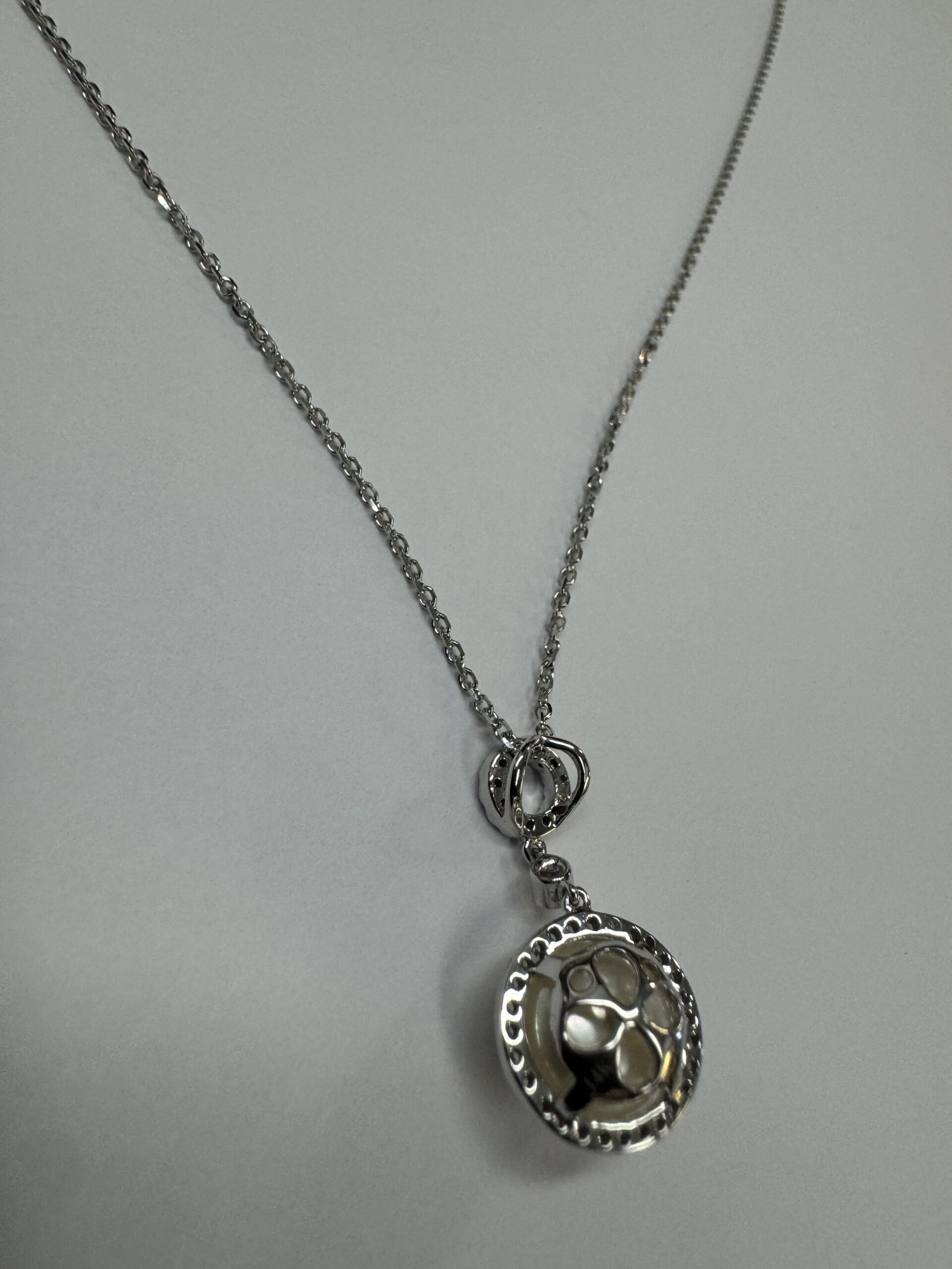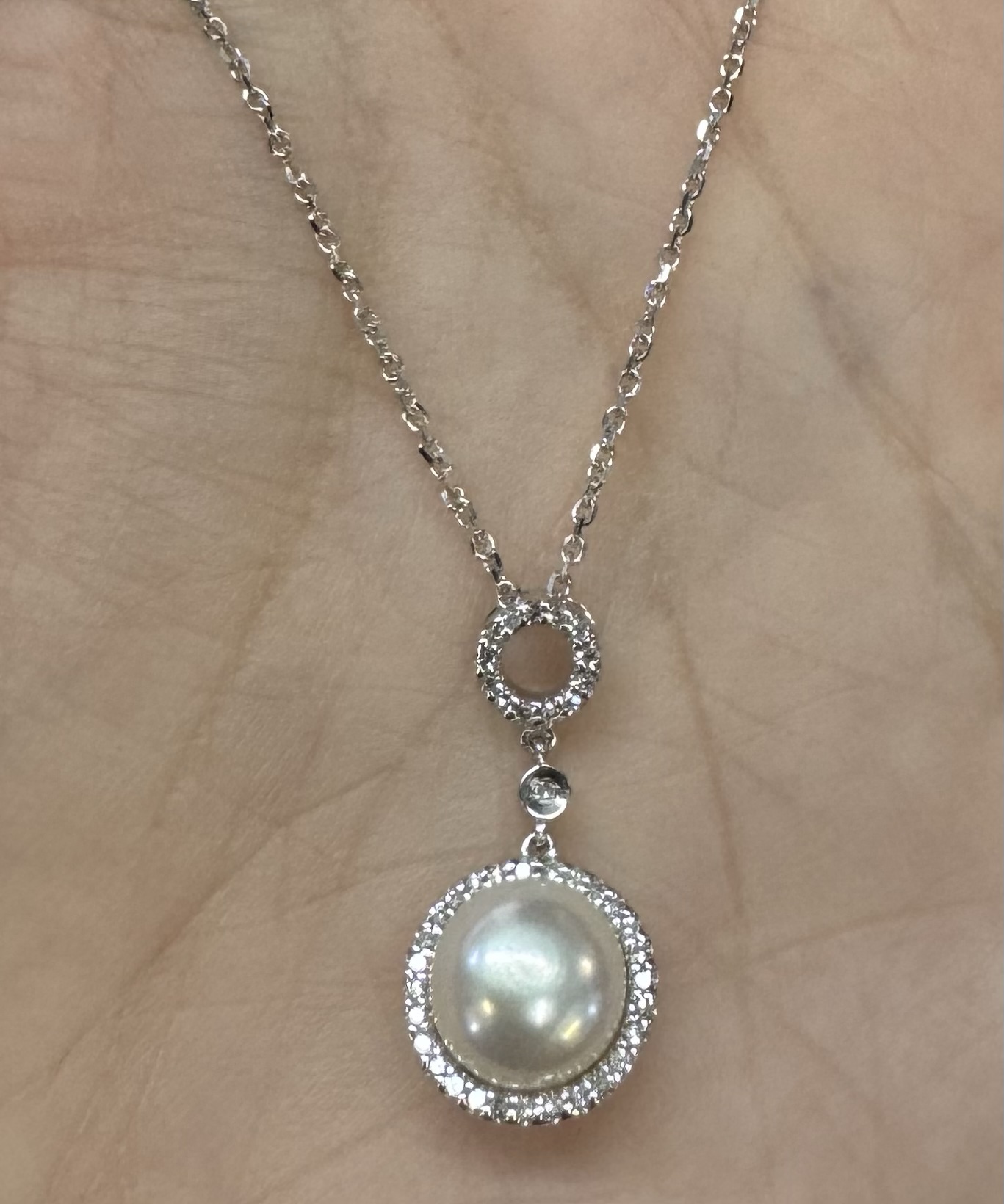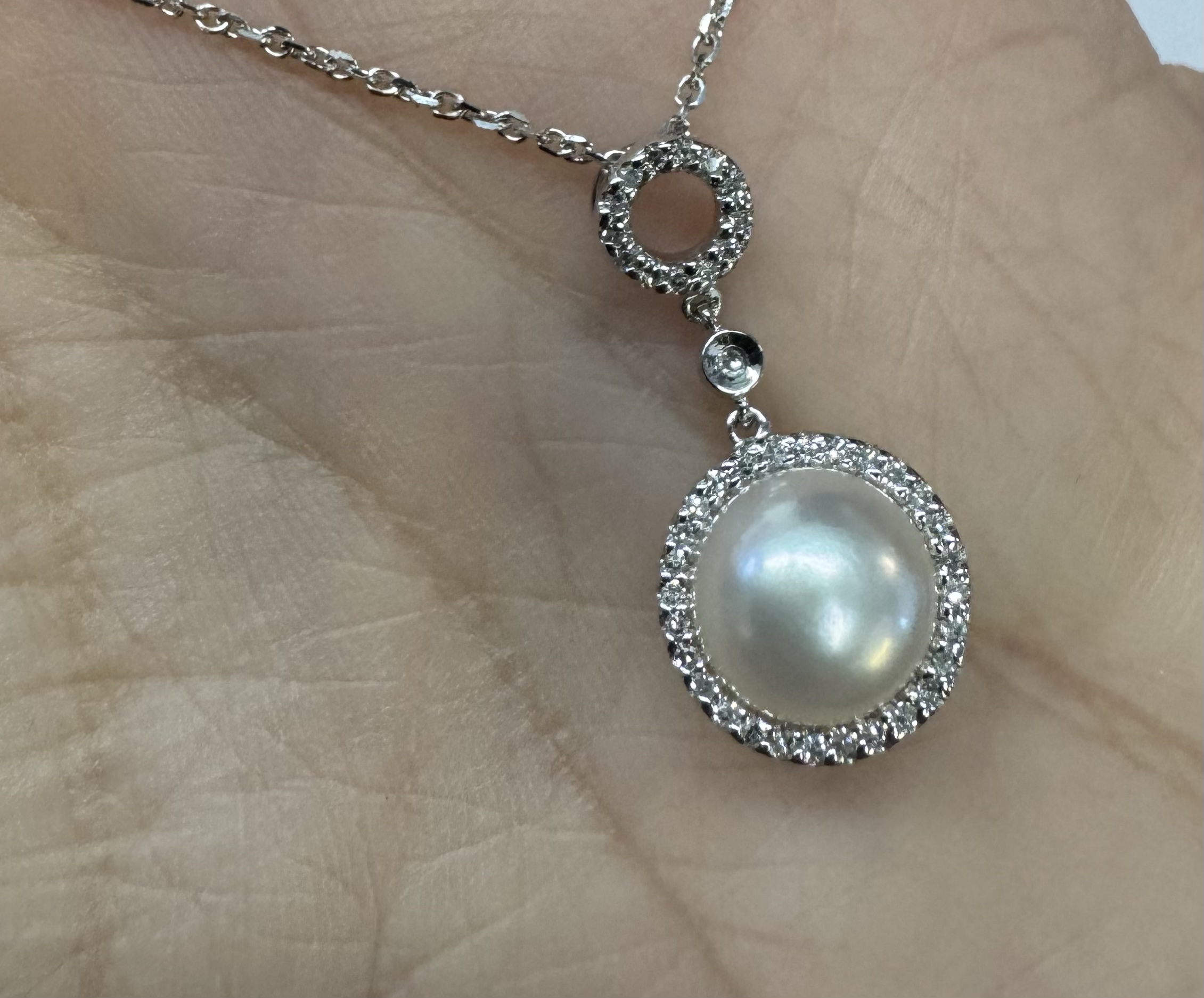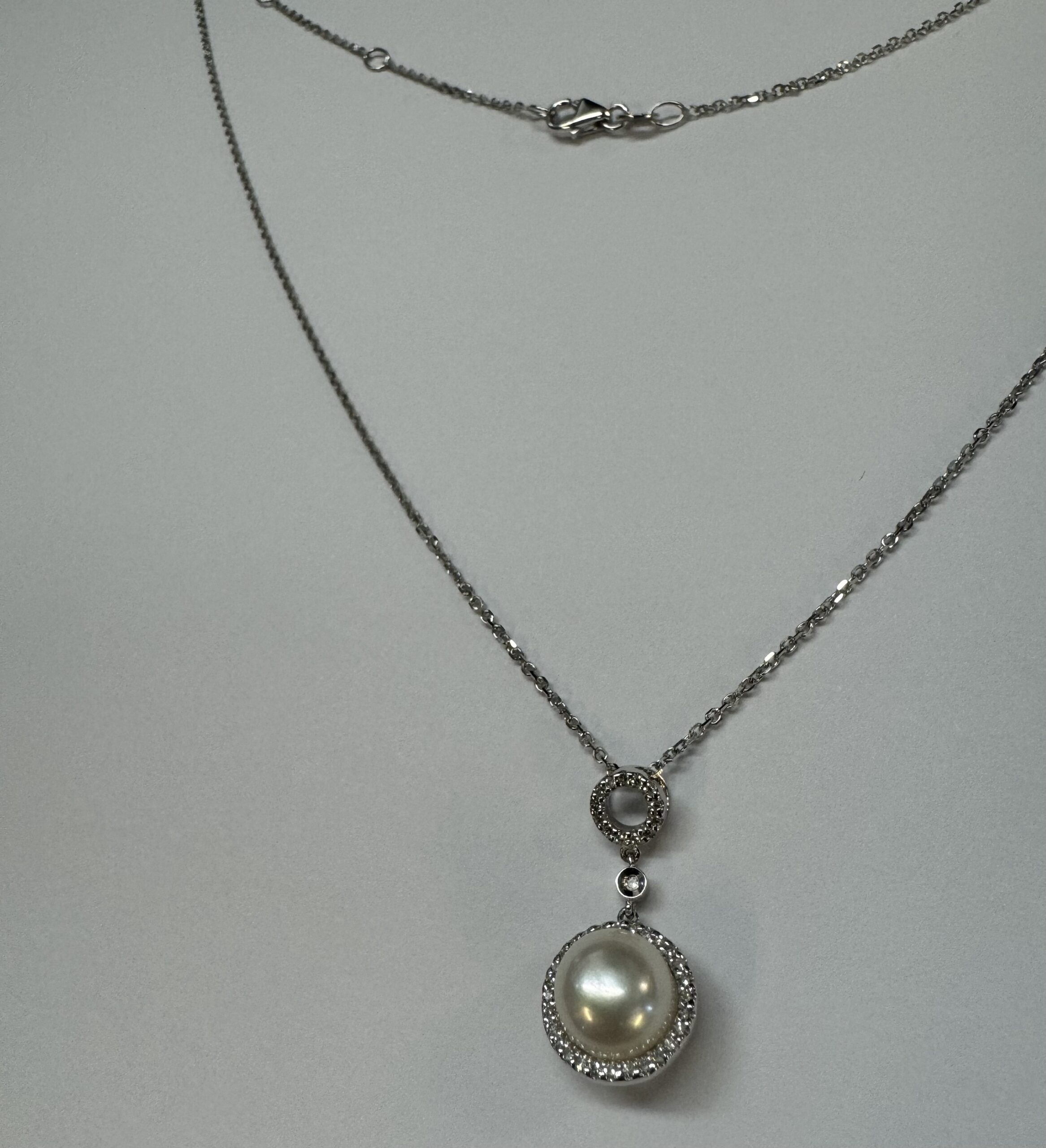 14k White Gold 7.8 MM Button Pearl & Diamond Halo Pendant quantity